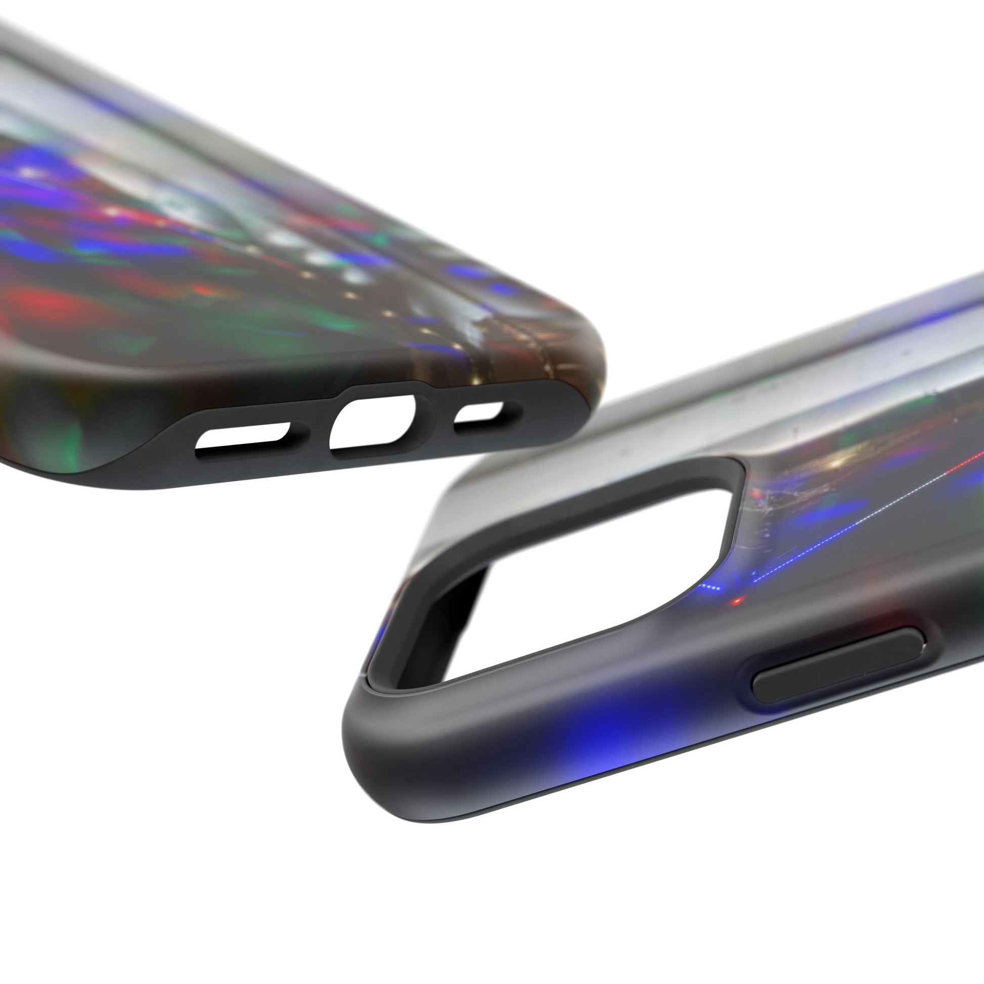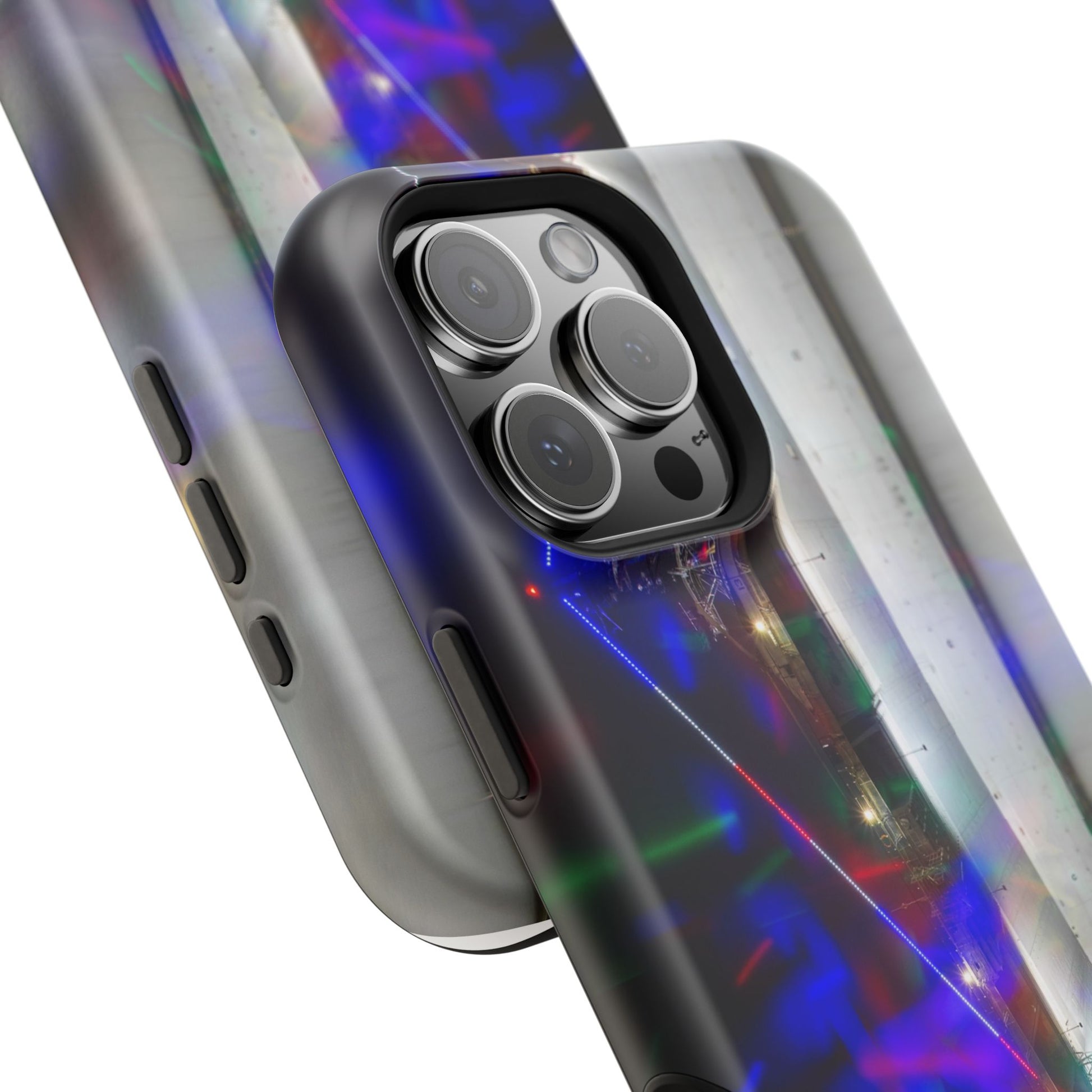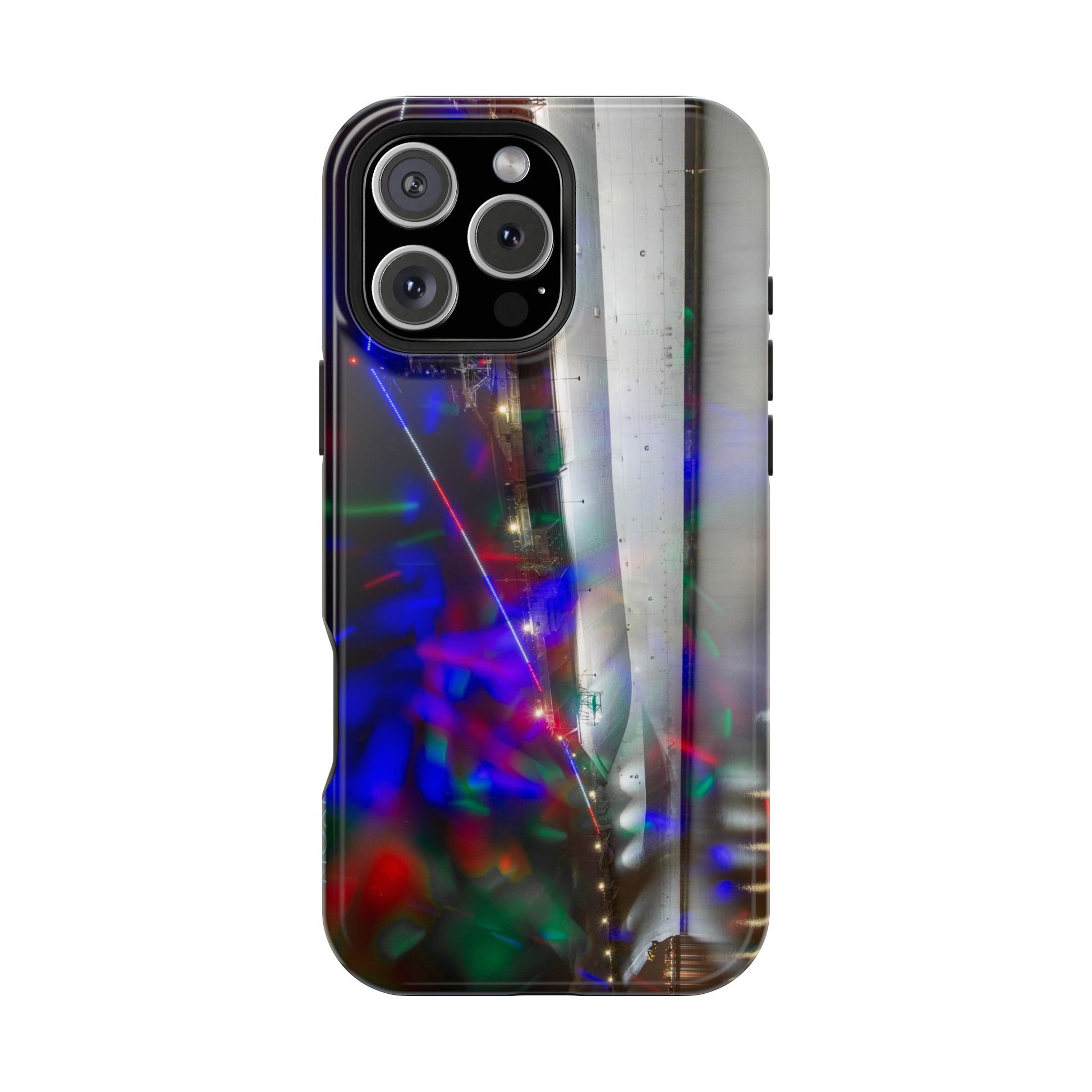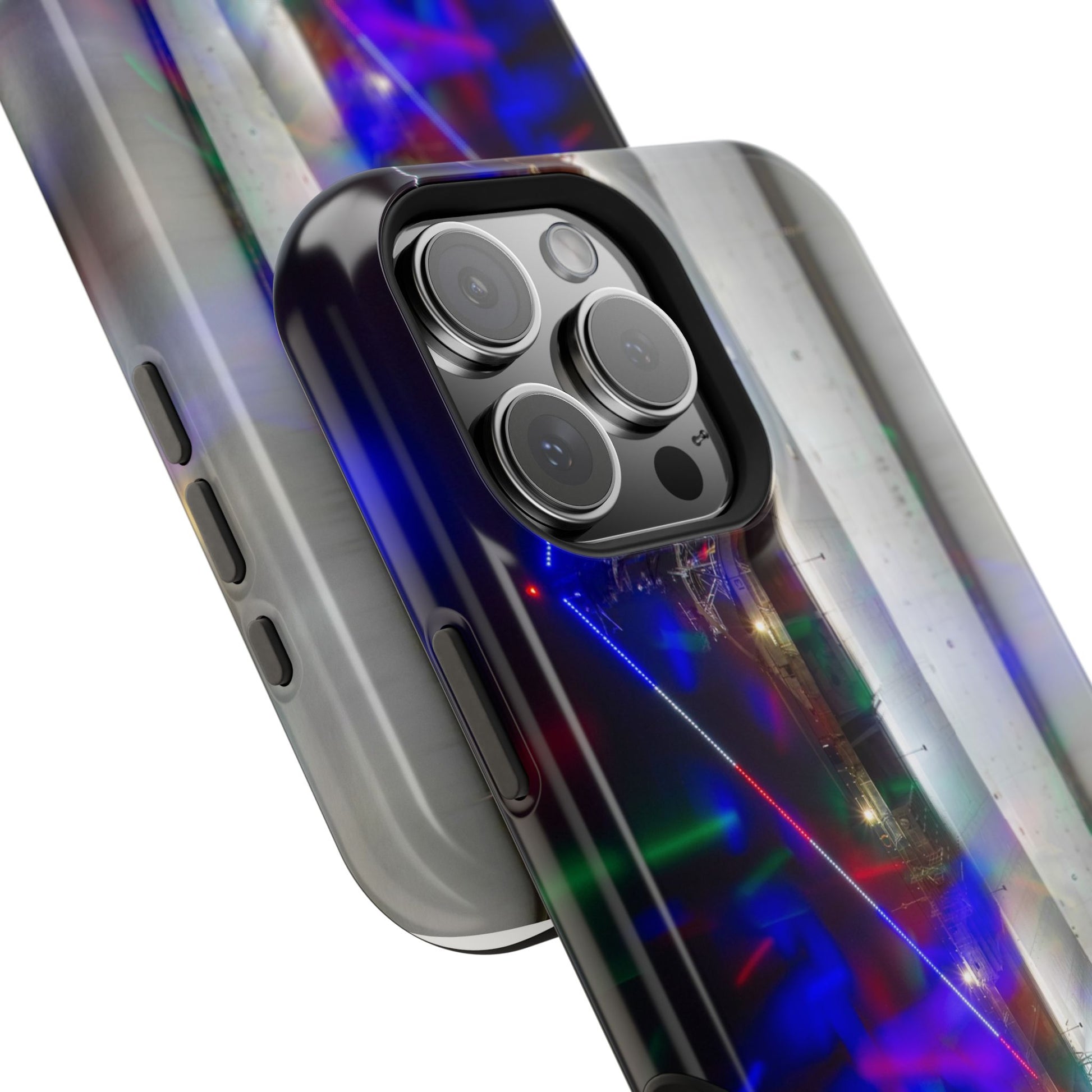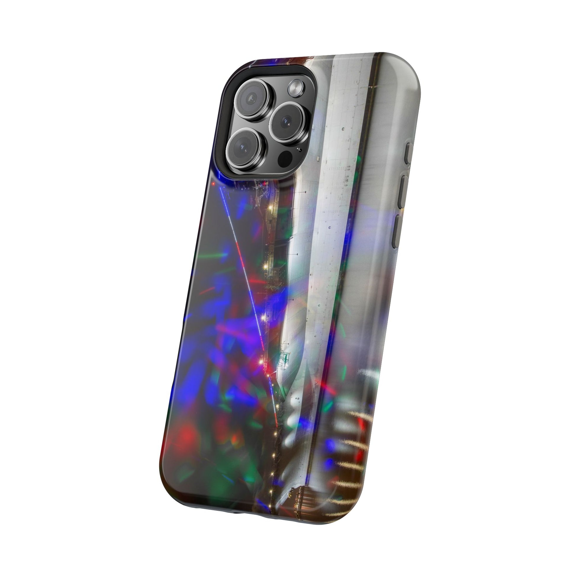 Vibrant iPhone Magnetic Tough Cases featuring a colorful light display of USS Midway photographed by Moxie-Jay. Dual-layer polycarbonate construction provides durability and protection against scratches and bumps. Perfect for tech-savvy individuals who enjoy bold and unique designs. Relevant for holidays, birthdays, and special occasions.