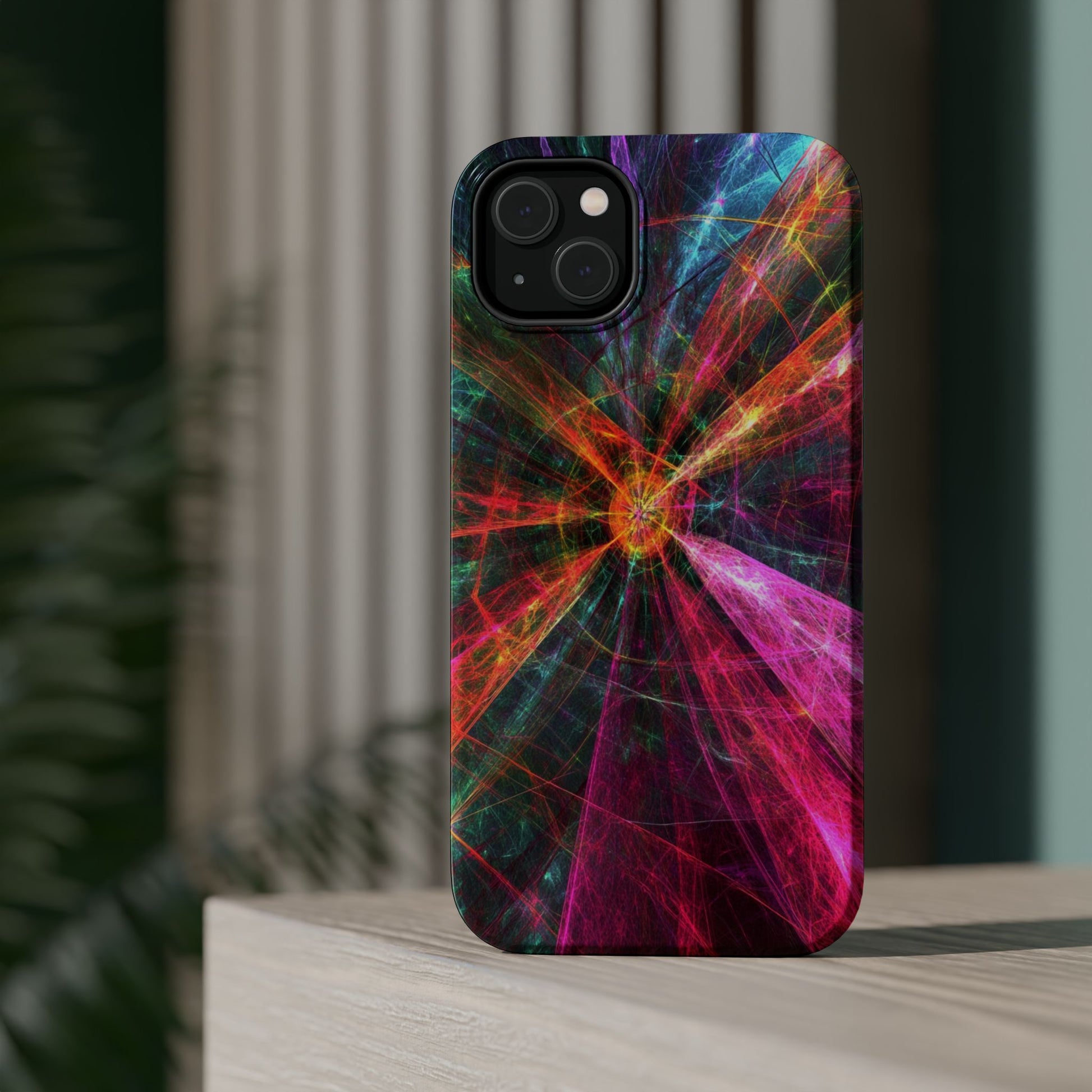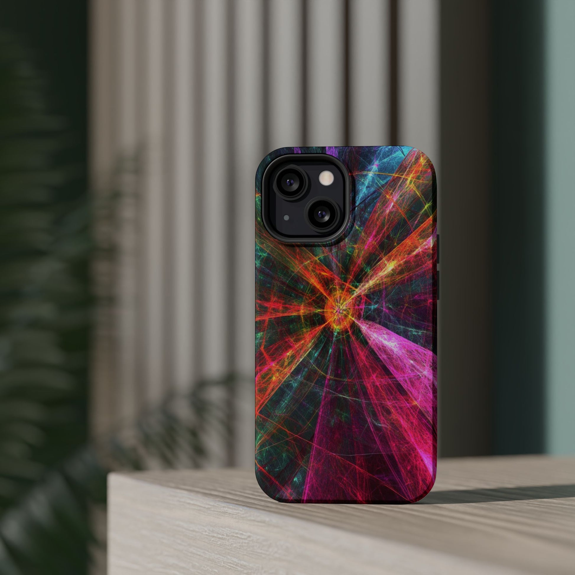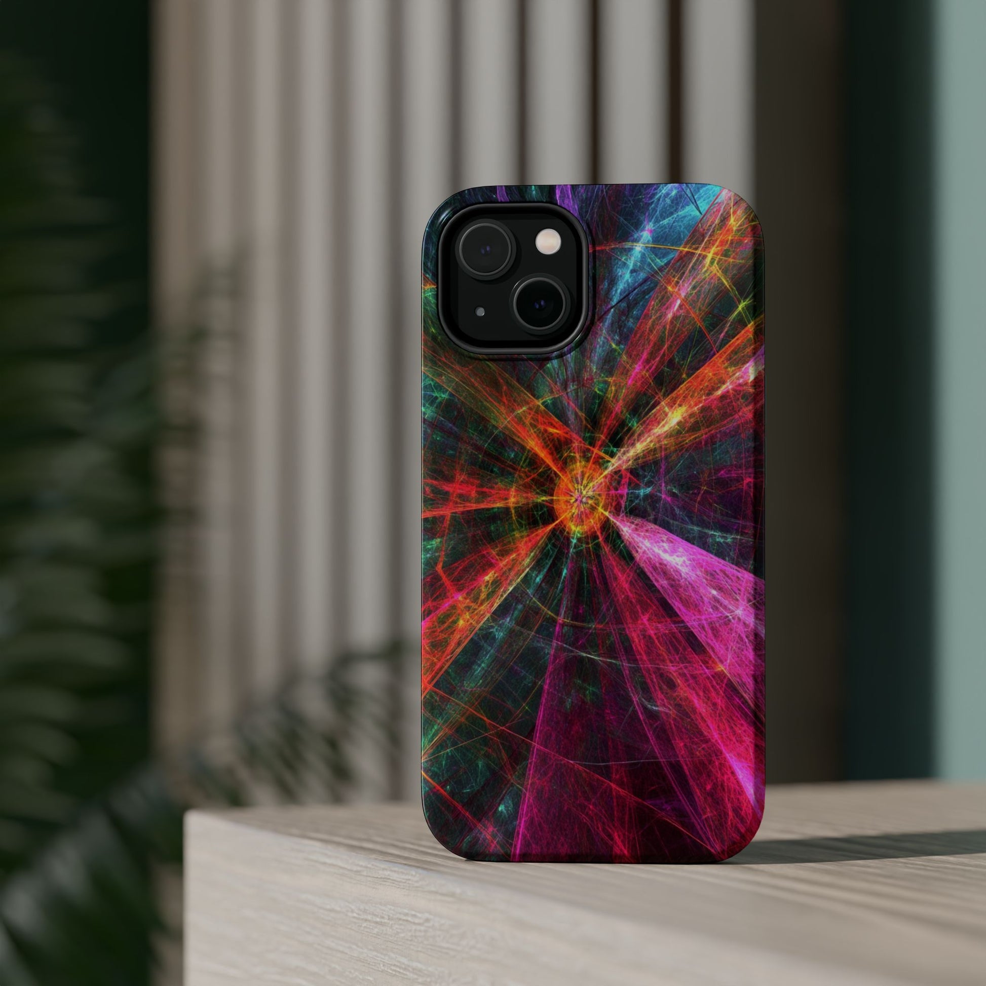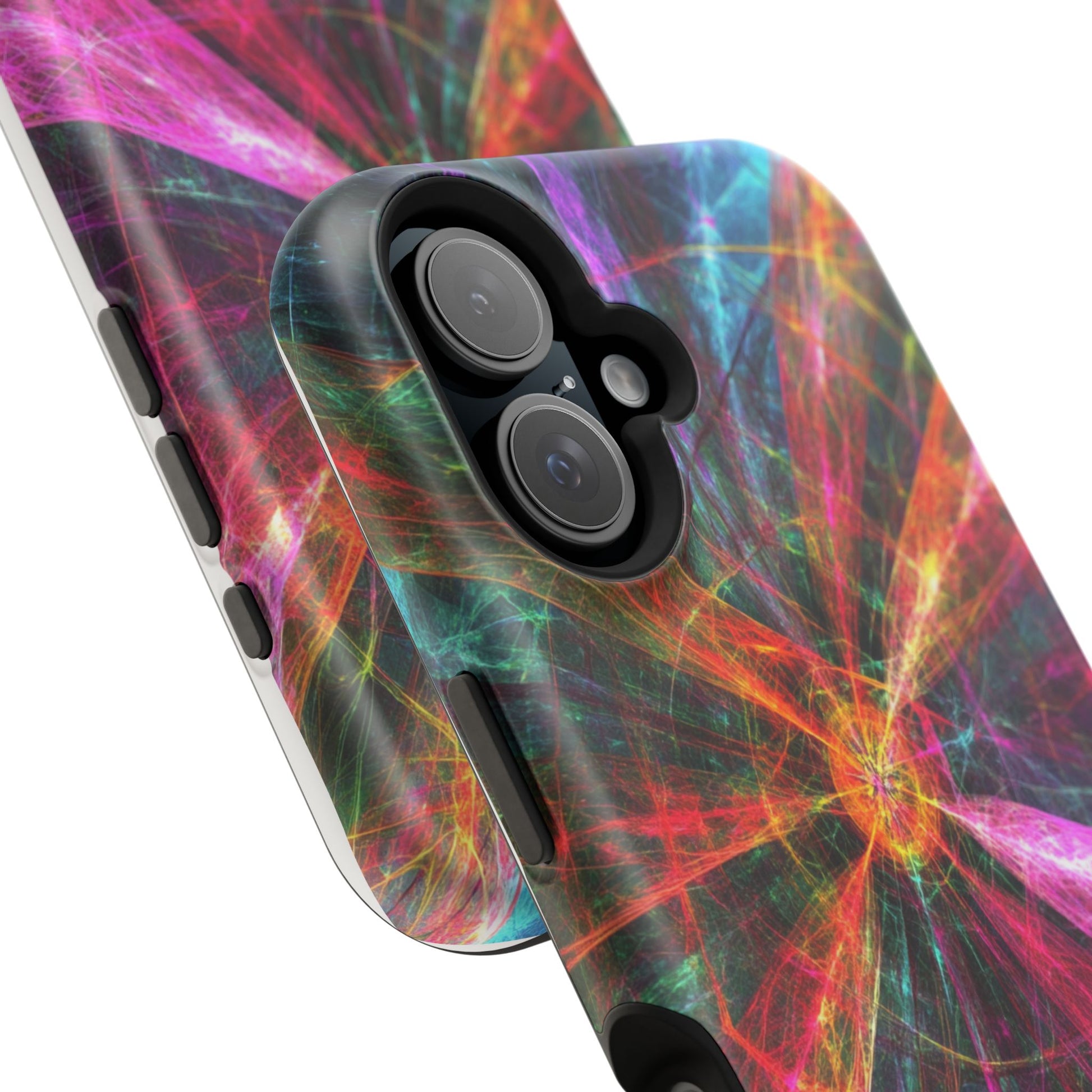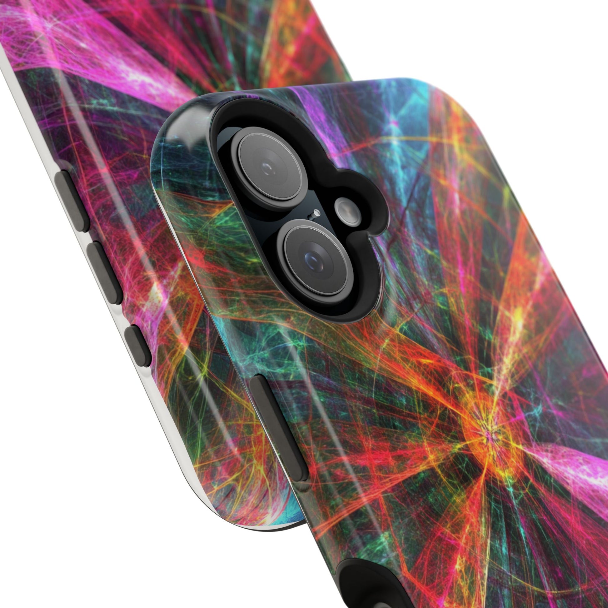 Elevate your phone protection with the Luxurious Magnetic Wireless Charging Tough iPhone Case, featuring a mesmerizing art piece by Moxie-Jay. The design showcases a vibrant starburst of trippy energy beams of light, paired with an additional artwork of a hand scratching a bright red record for a unique, artistic touch. This durable case combines style and functionality, offering: