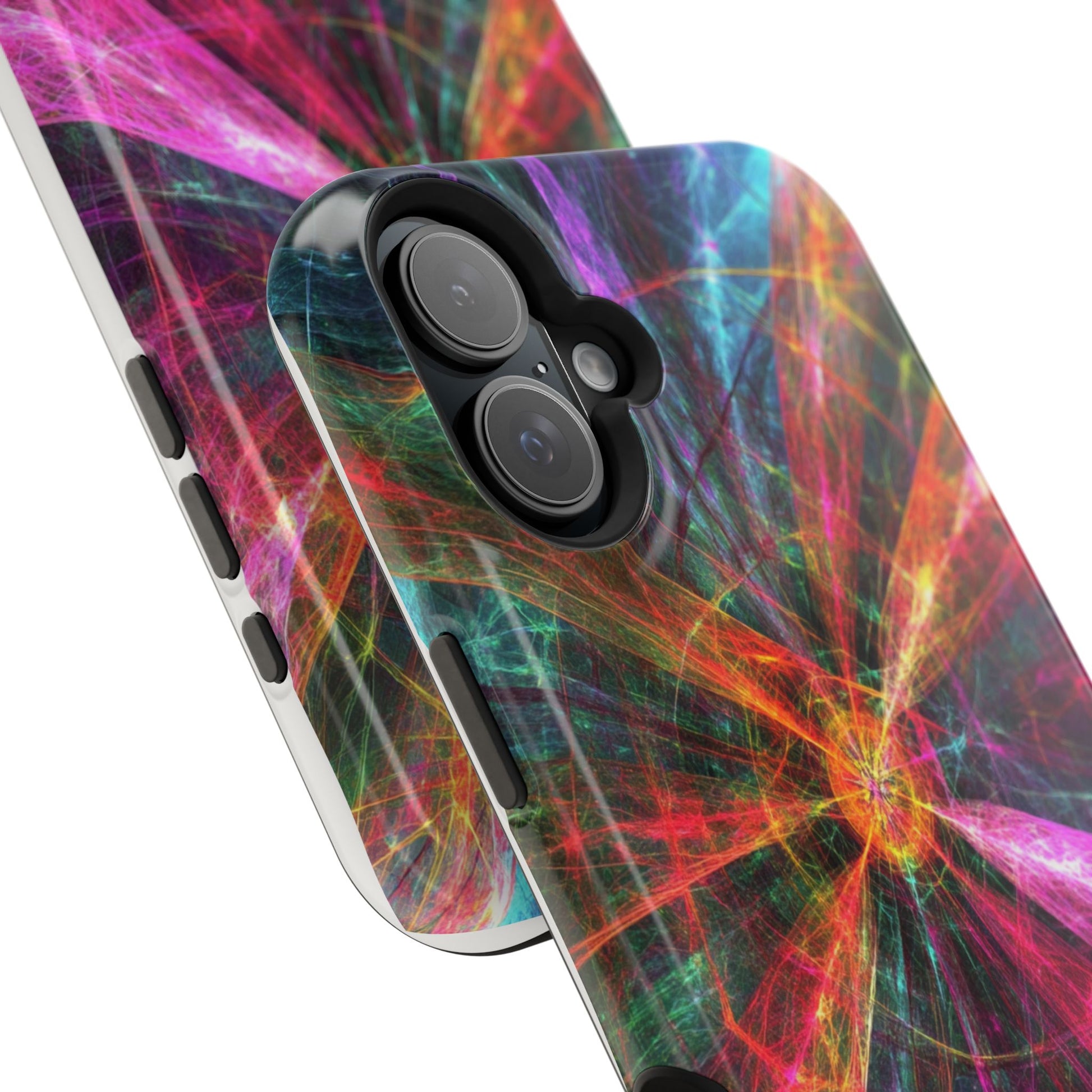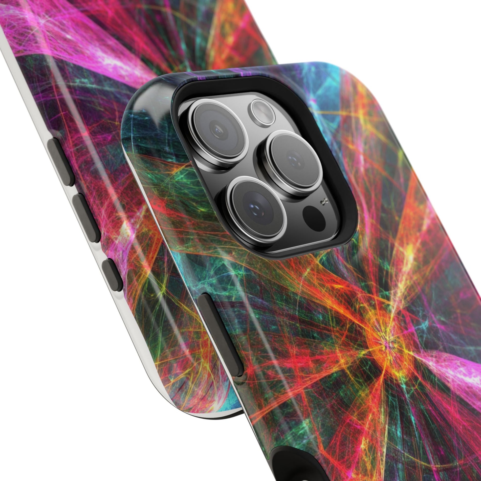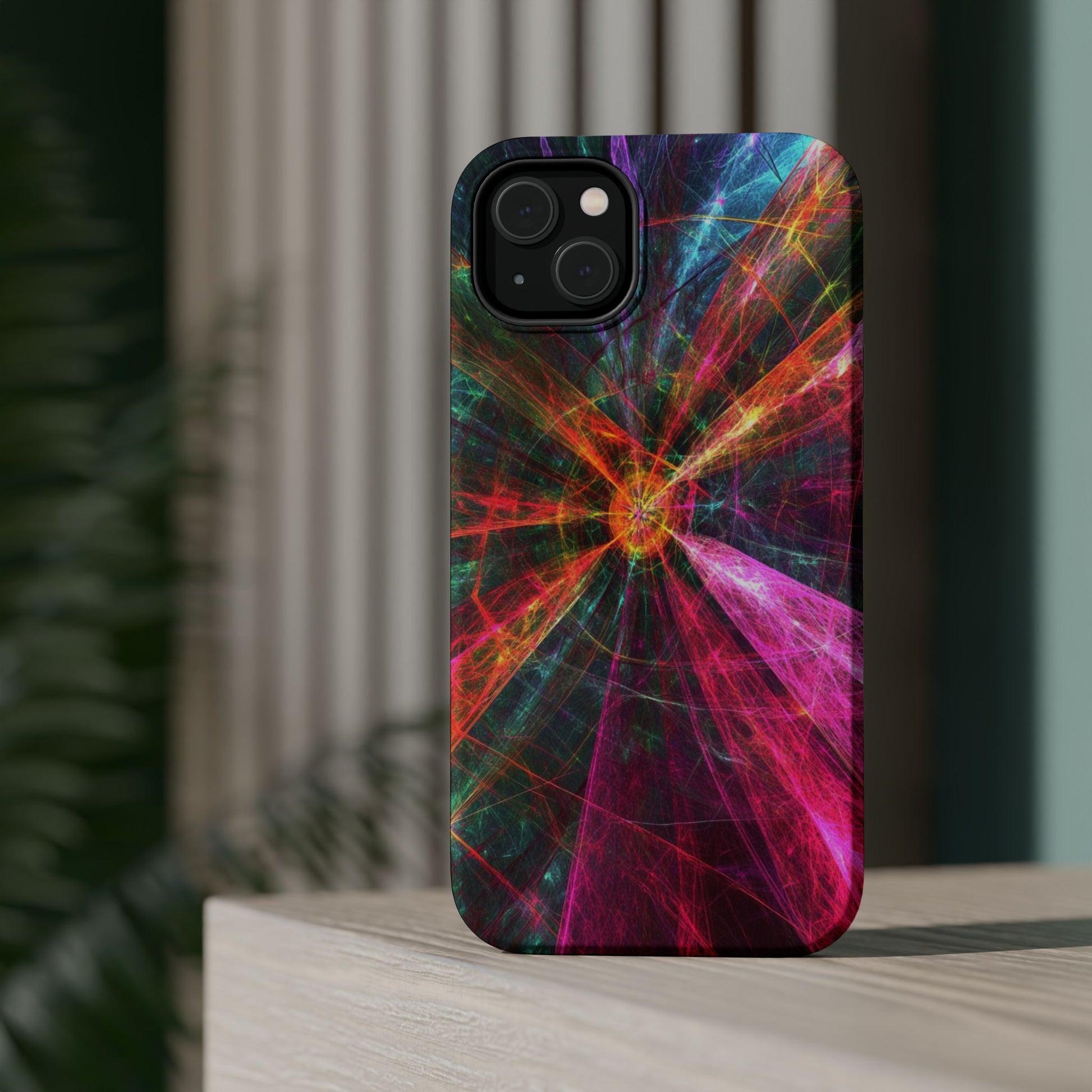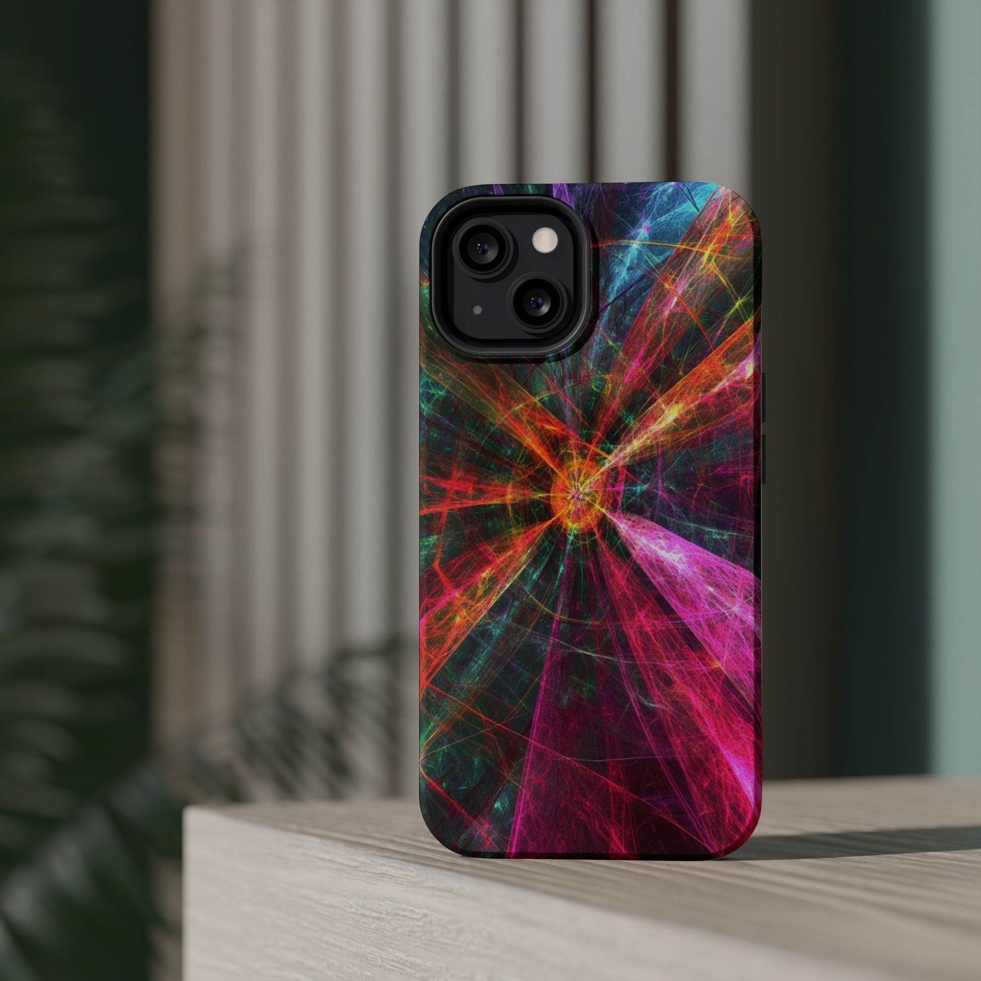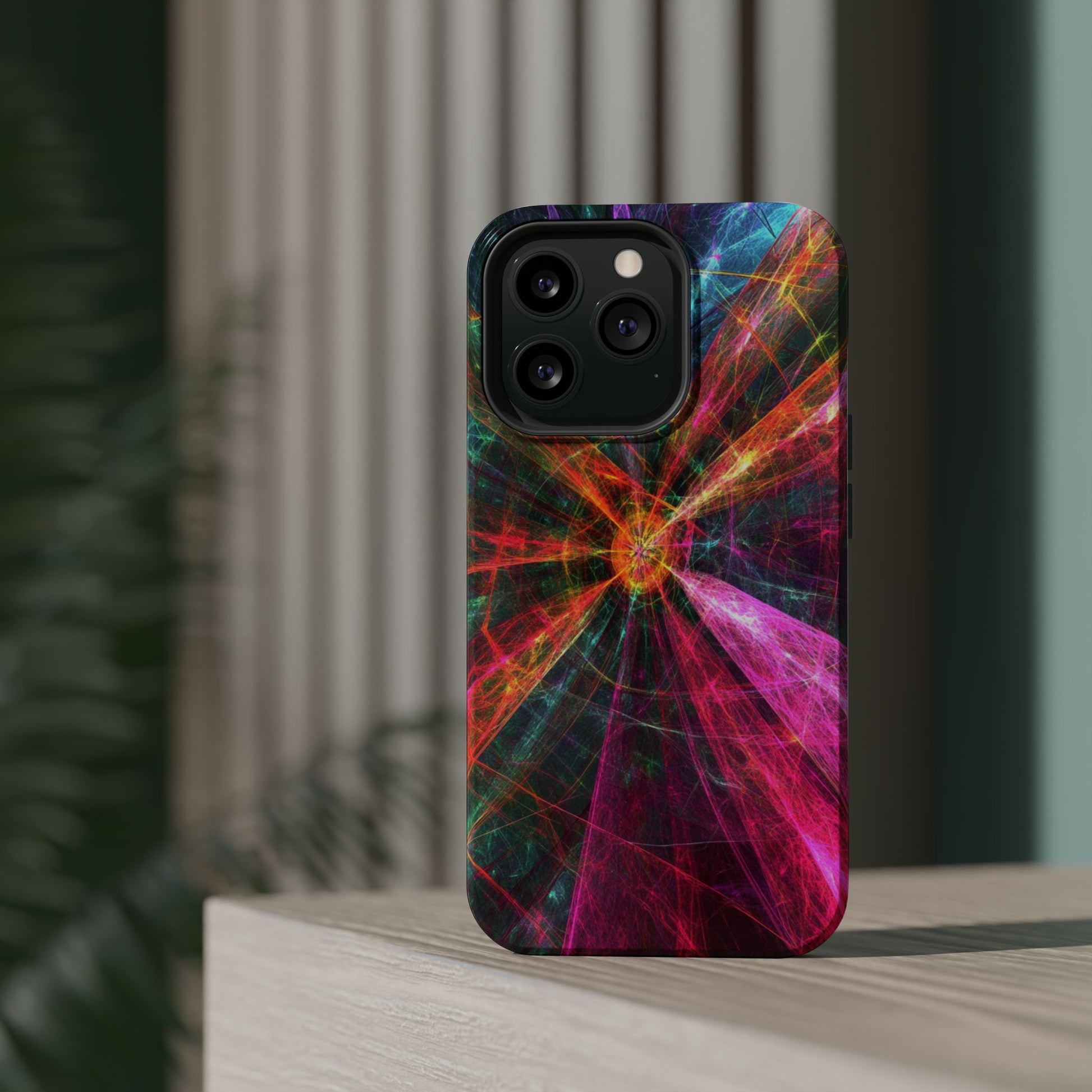 Elevate your phone protection with the Luxurious Magnetic Wireless Charging Tough iPhone Case, featuring a mesmerizing art piece by Moxie-Jay. The design showcases a vibrant starburst of trippy energy beams of light, paired with an additional artwork of a hand scratching a bright red record for a unique, artistic touch. This durable case combines style and functionality, offering: