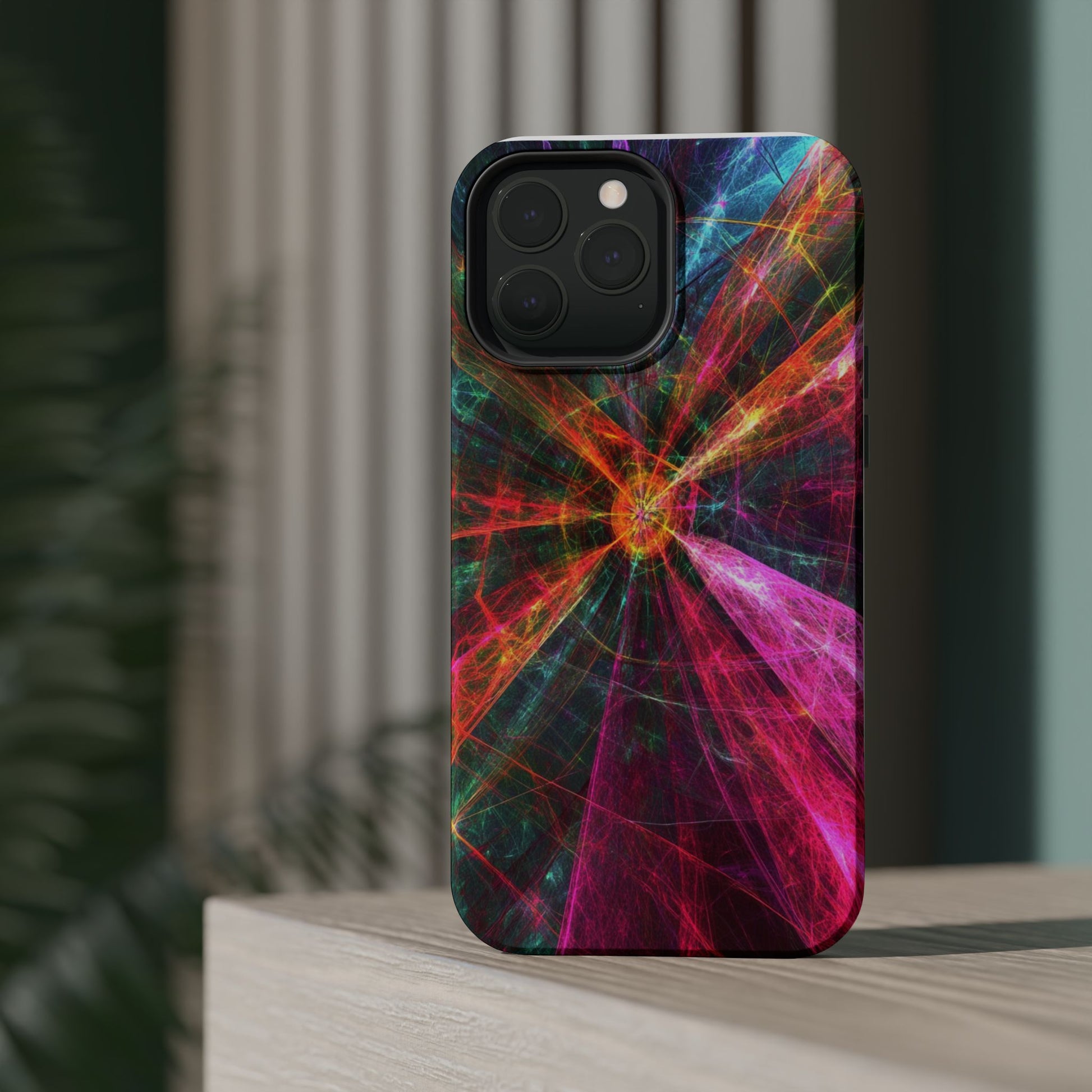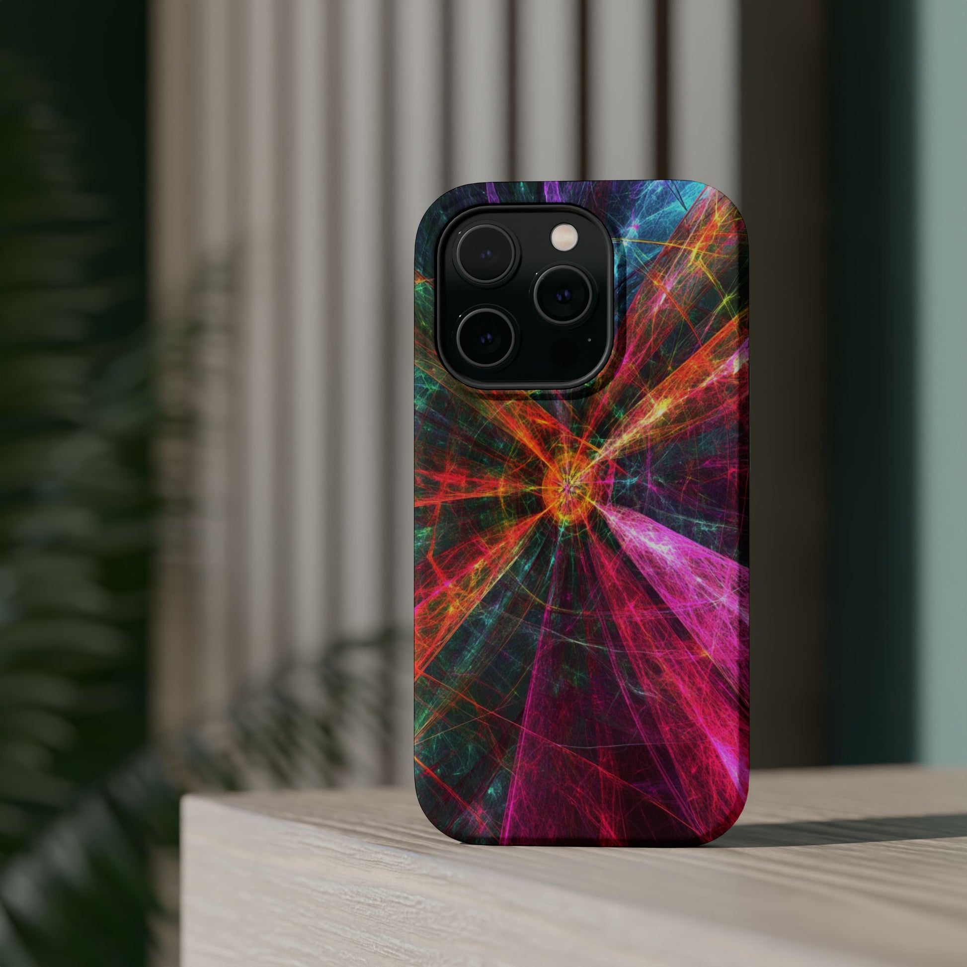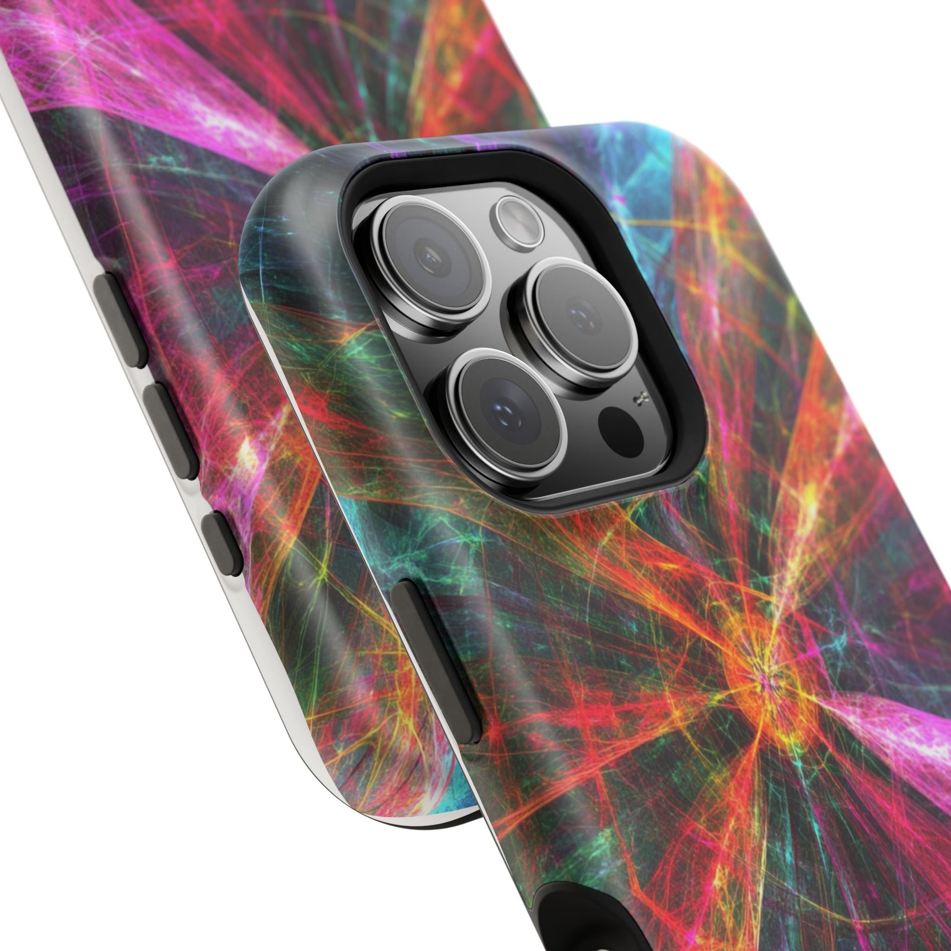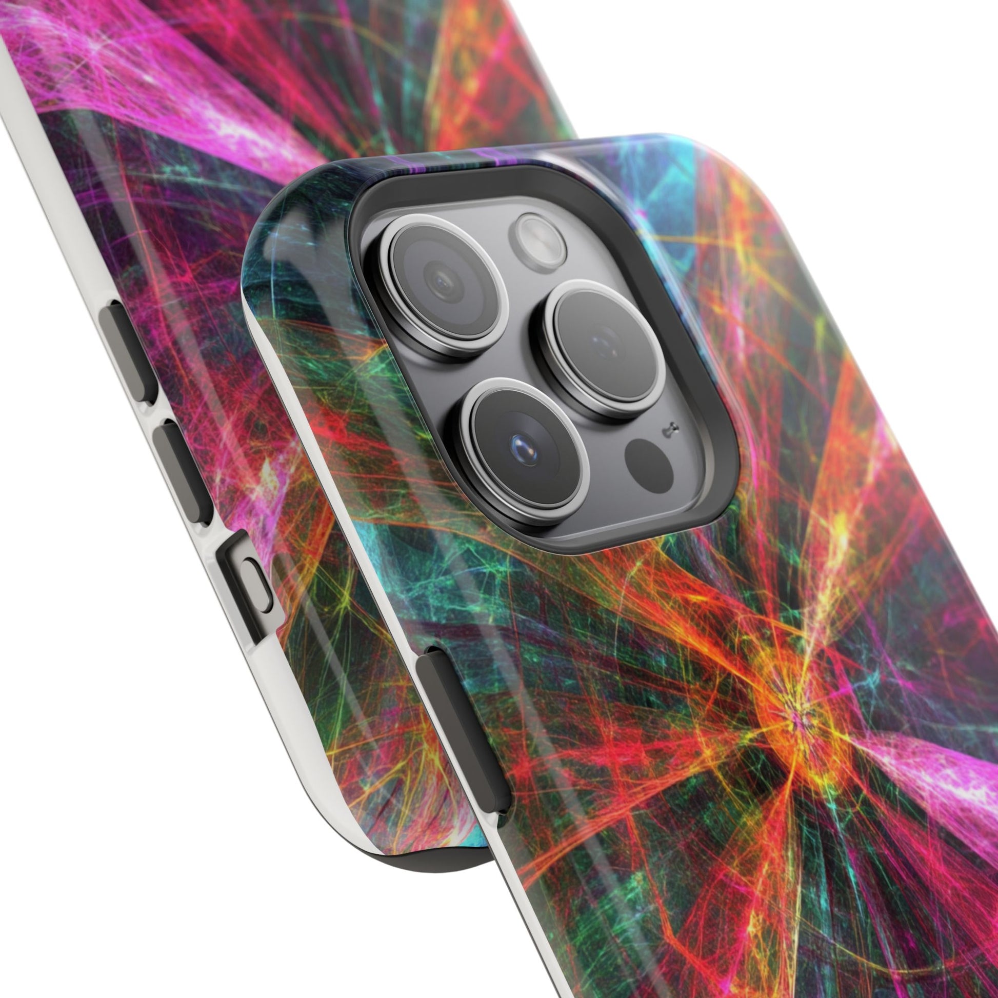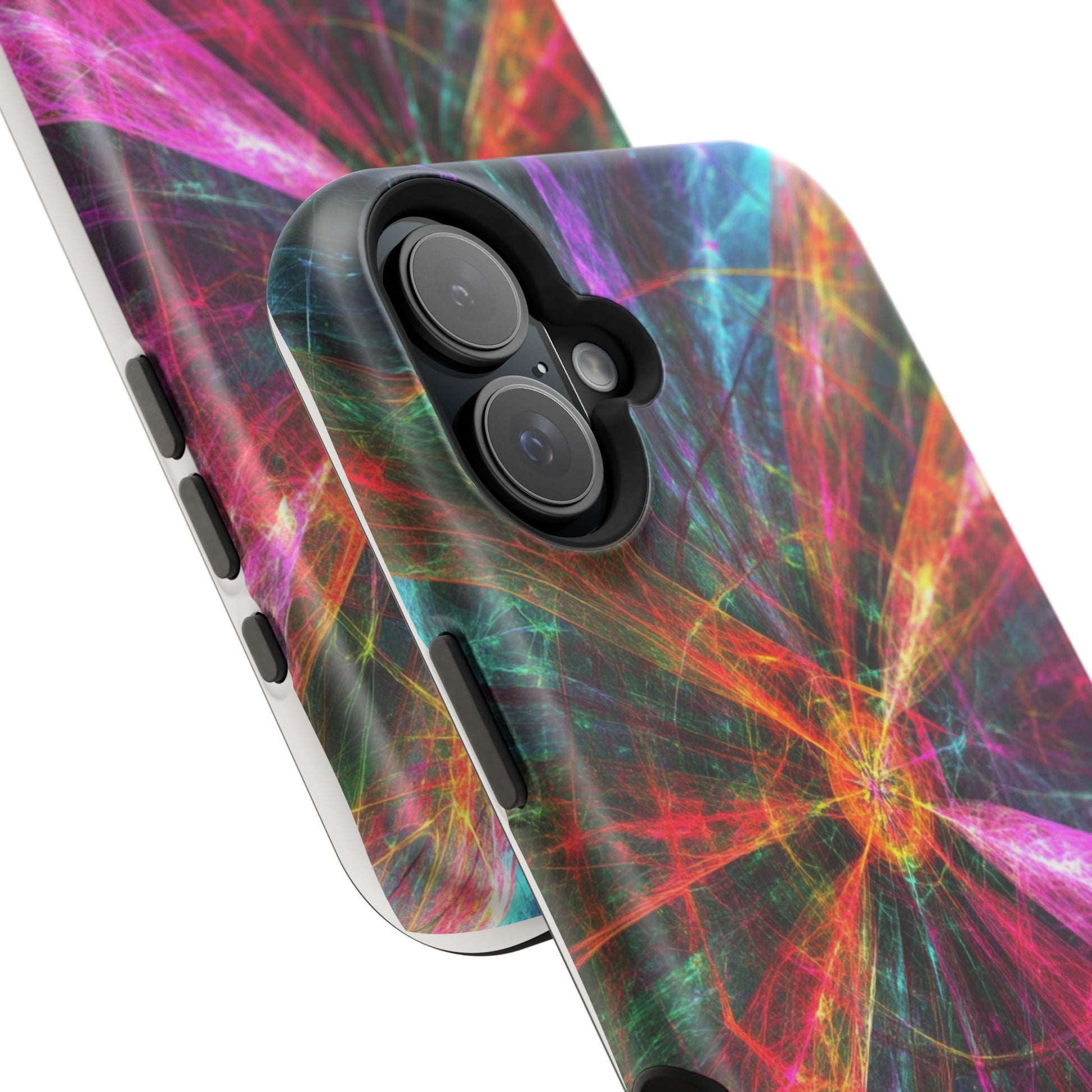 Elevate your phone protection with the Luxurious Magnetic Wireless Charging Tough iPhone Case, featuring a mesmerizing art piece by Moxie-Jay. The design showcases a vibrant starburst of trippy energy beams of light, paired with an additional artwork of a hand scratching a bright red record for a unique, artistic touch. This durable case combines style and functionality, offering: