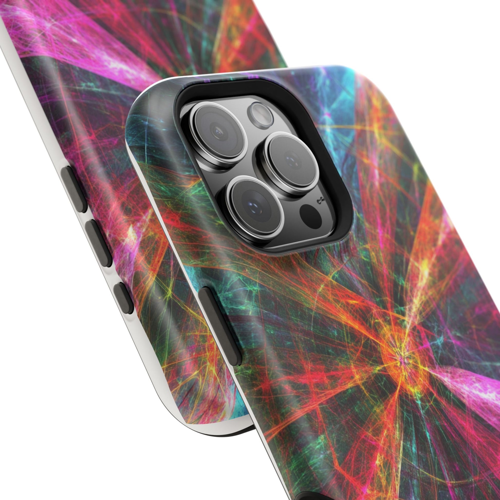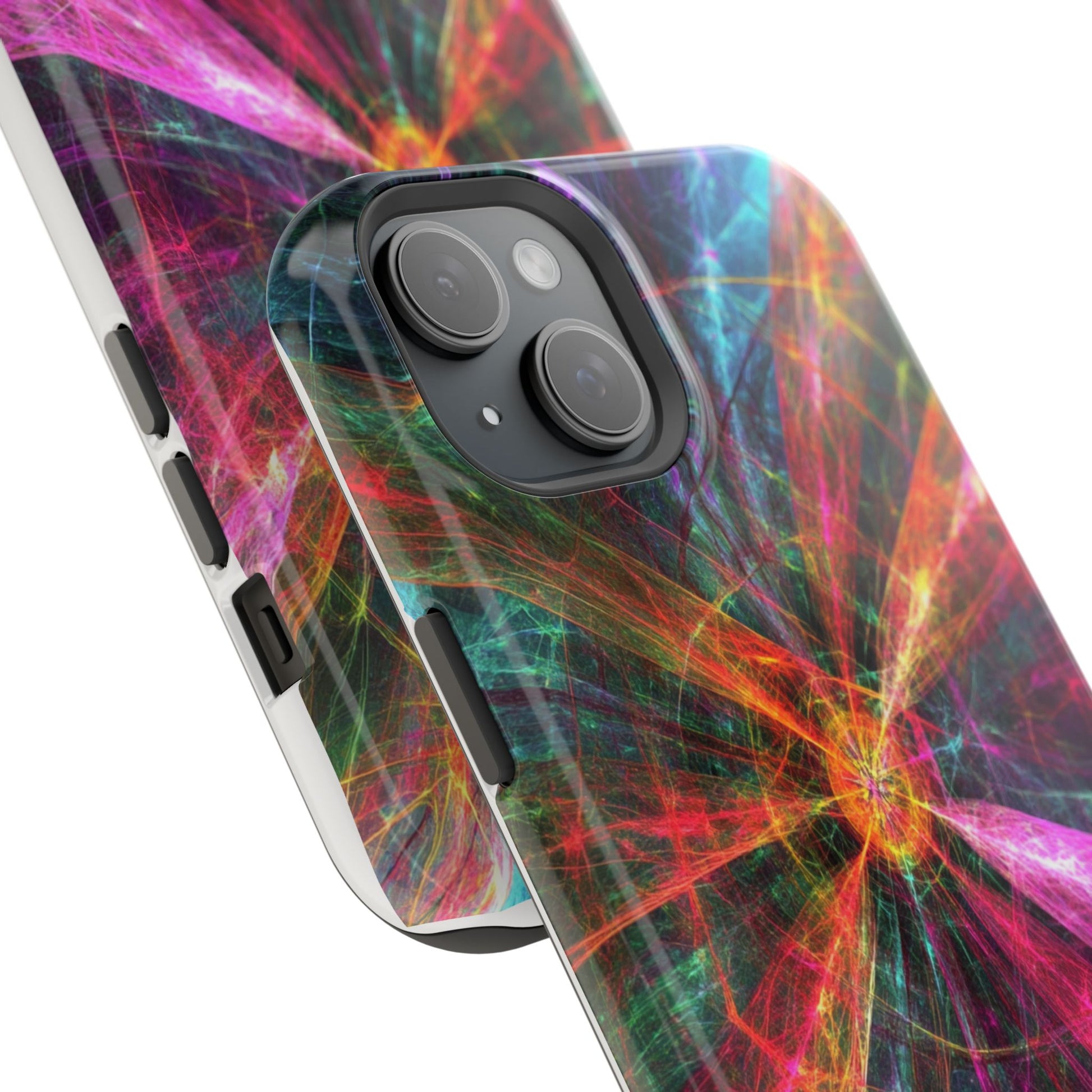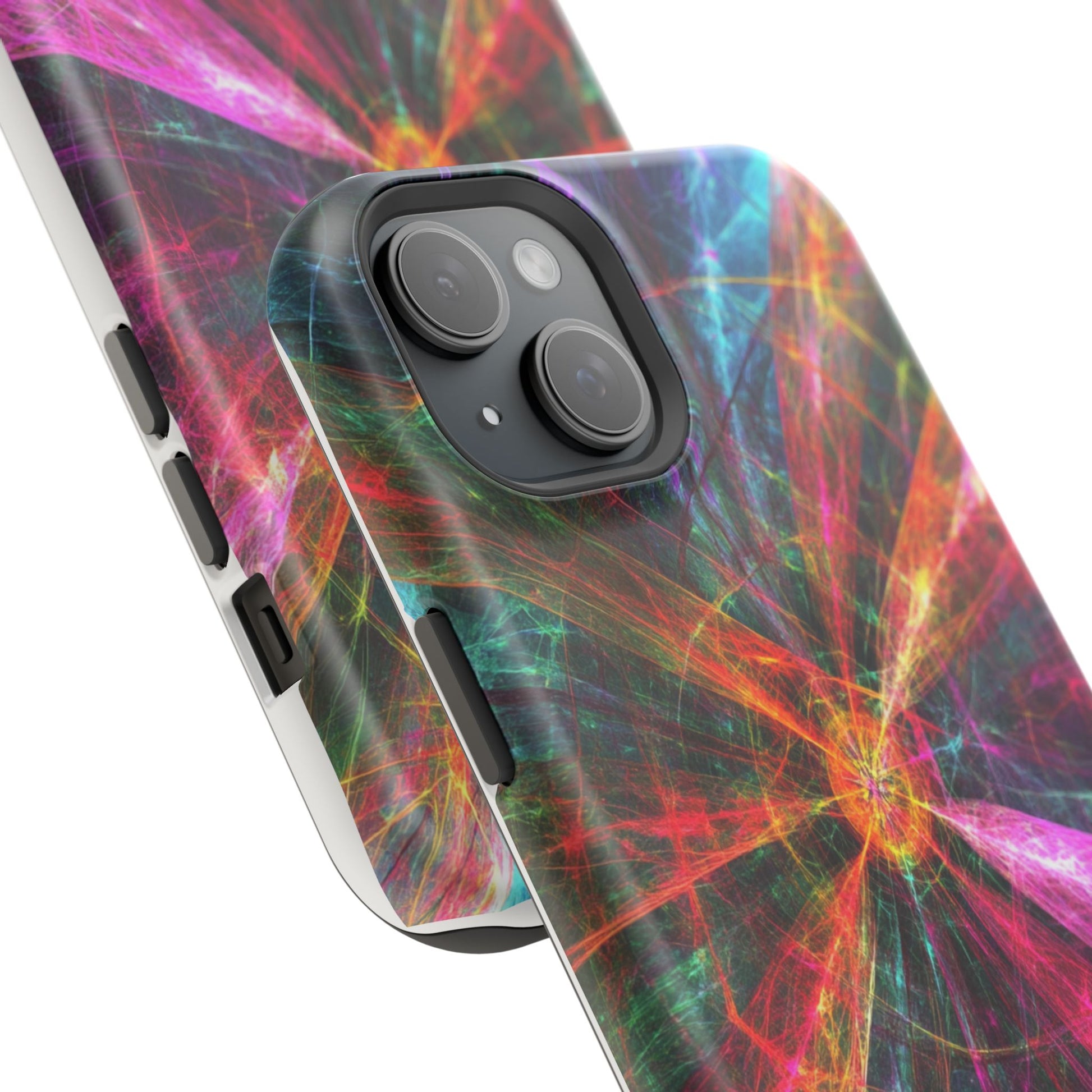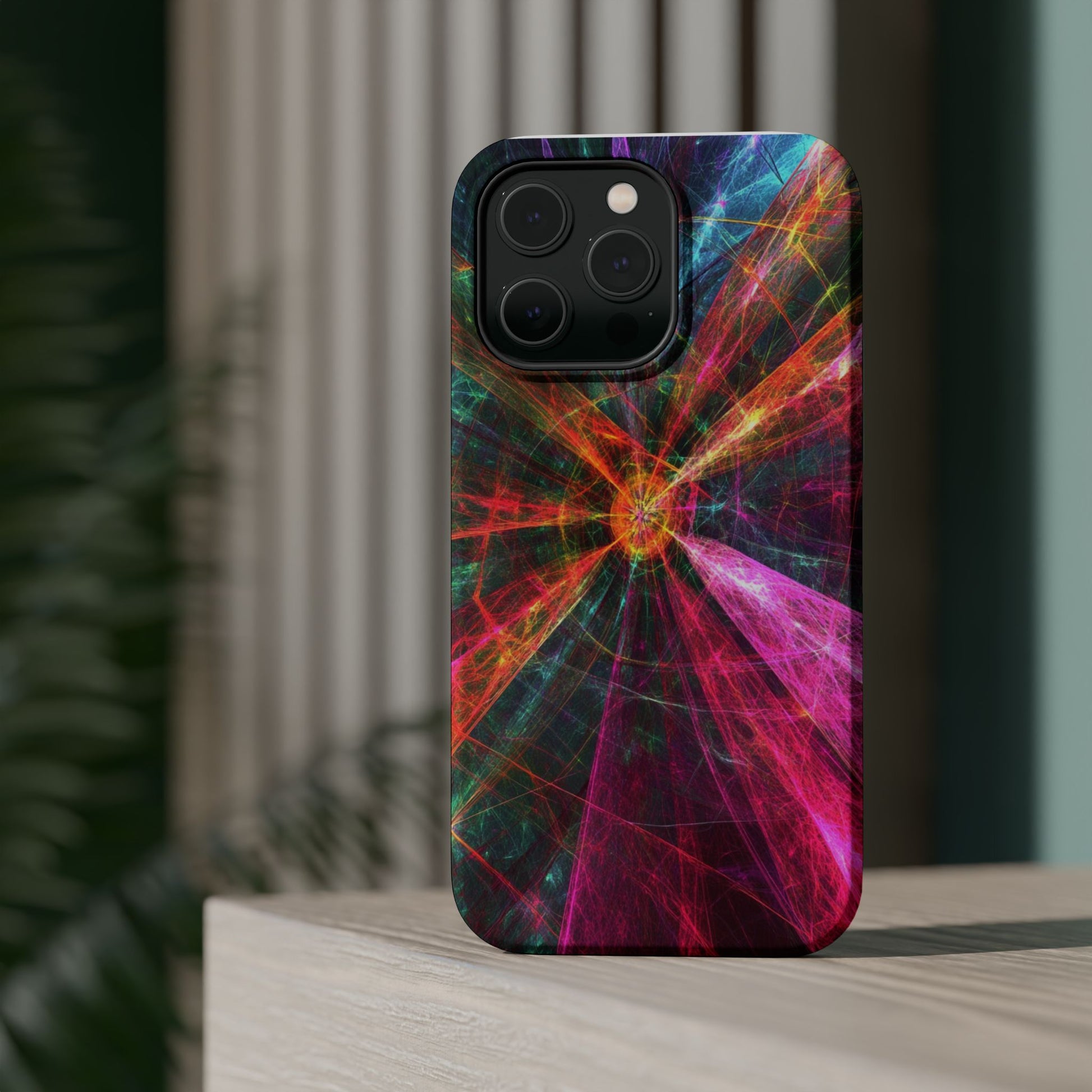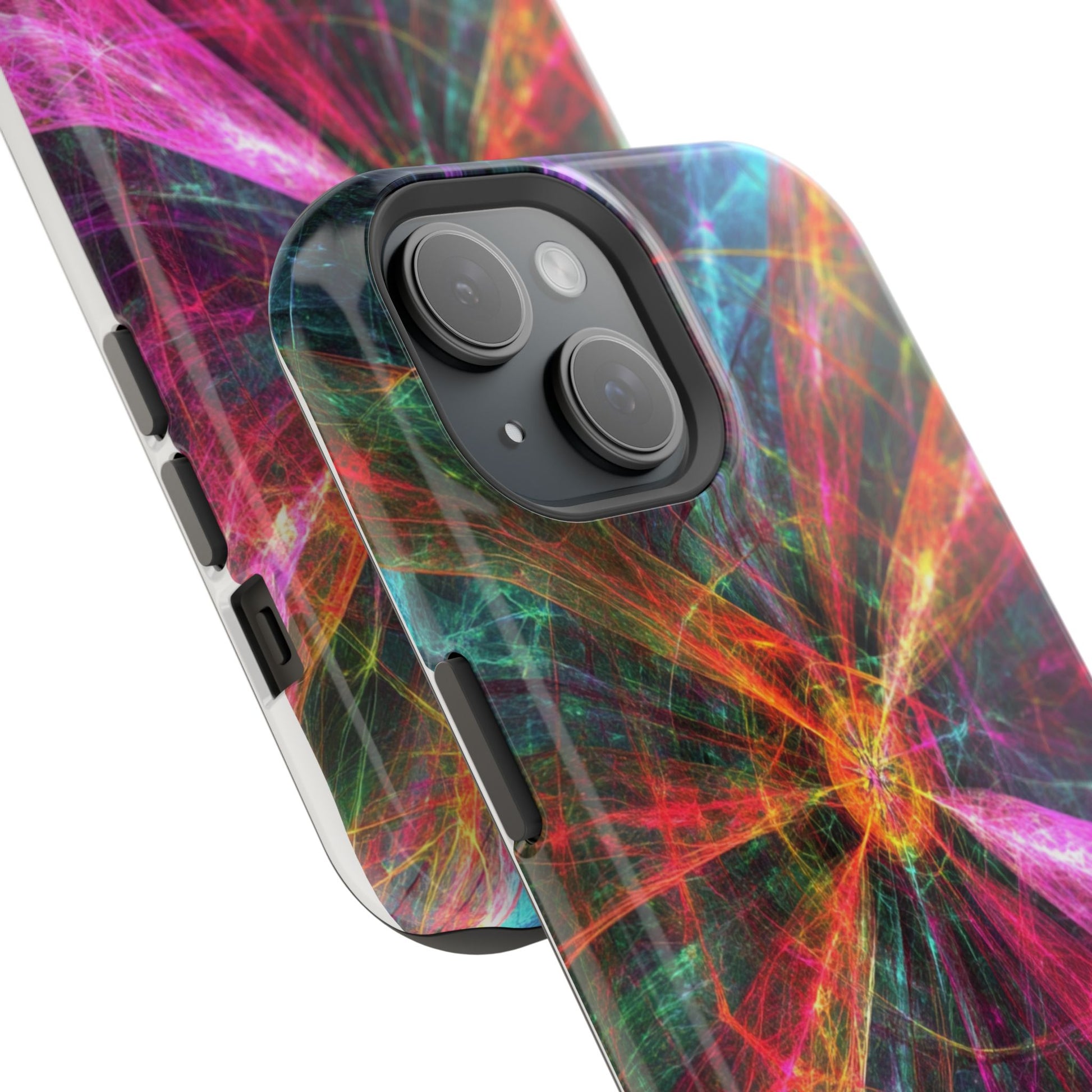 Elevate your phone protection with the Luxurious Magnetic Wireless Charging Tough iPhone Case, featuring a mesmerizing art piece by Moxie-Jay. The design showcases a vibrant starburst of trippy energy beams of light, paired with an additional artwork of a hand scratching a bright red record for a unique, artistic touch. This durable case combines style and functionality, offering: