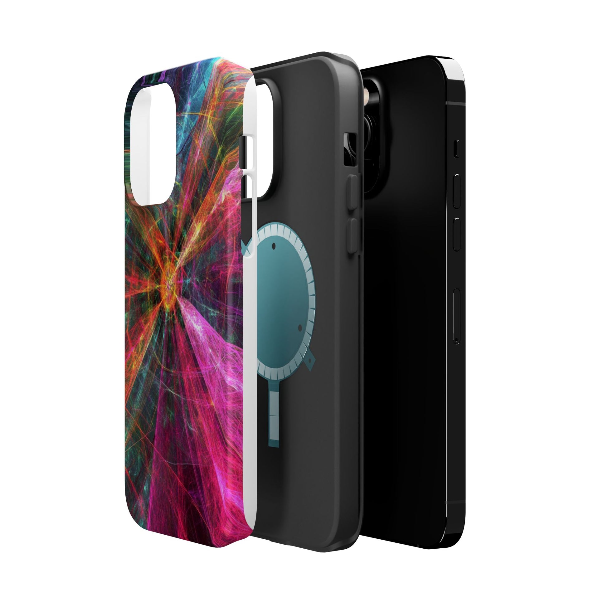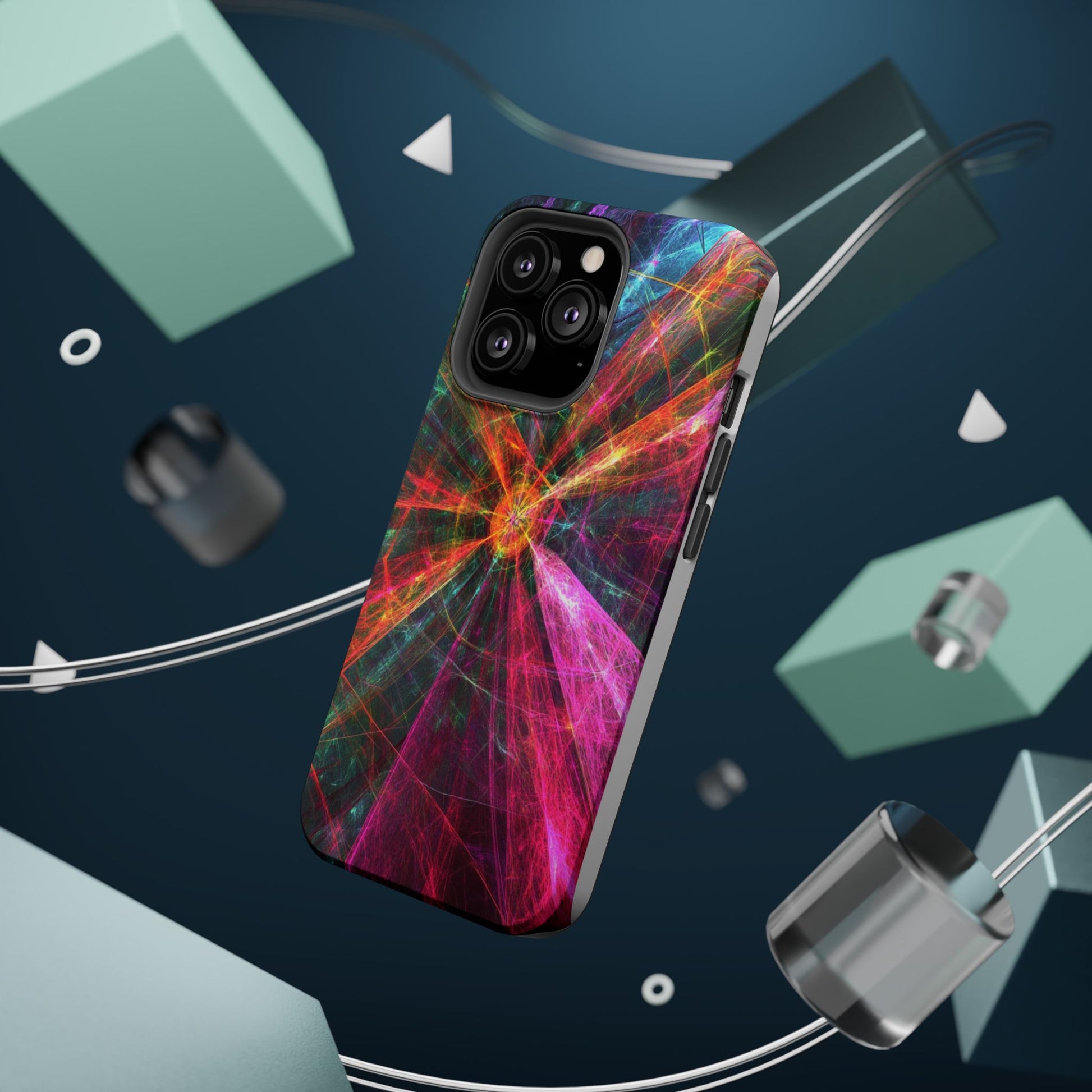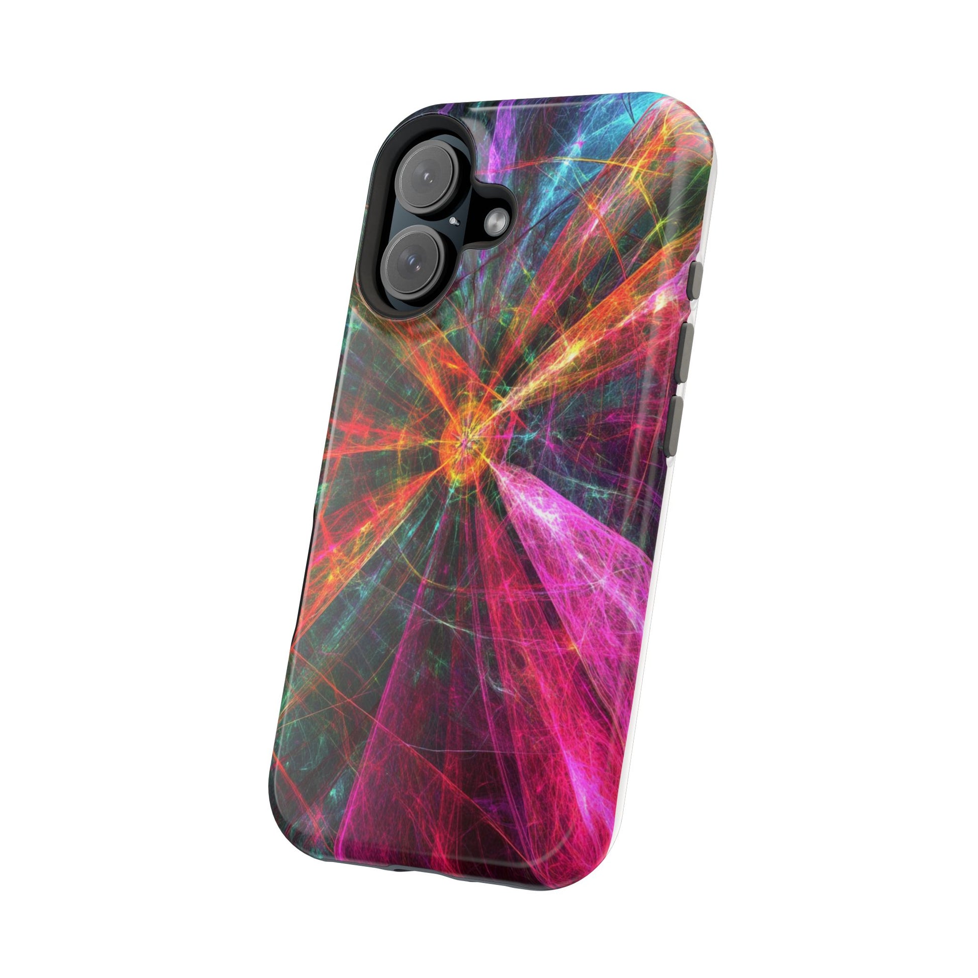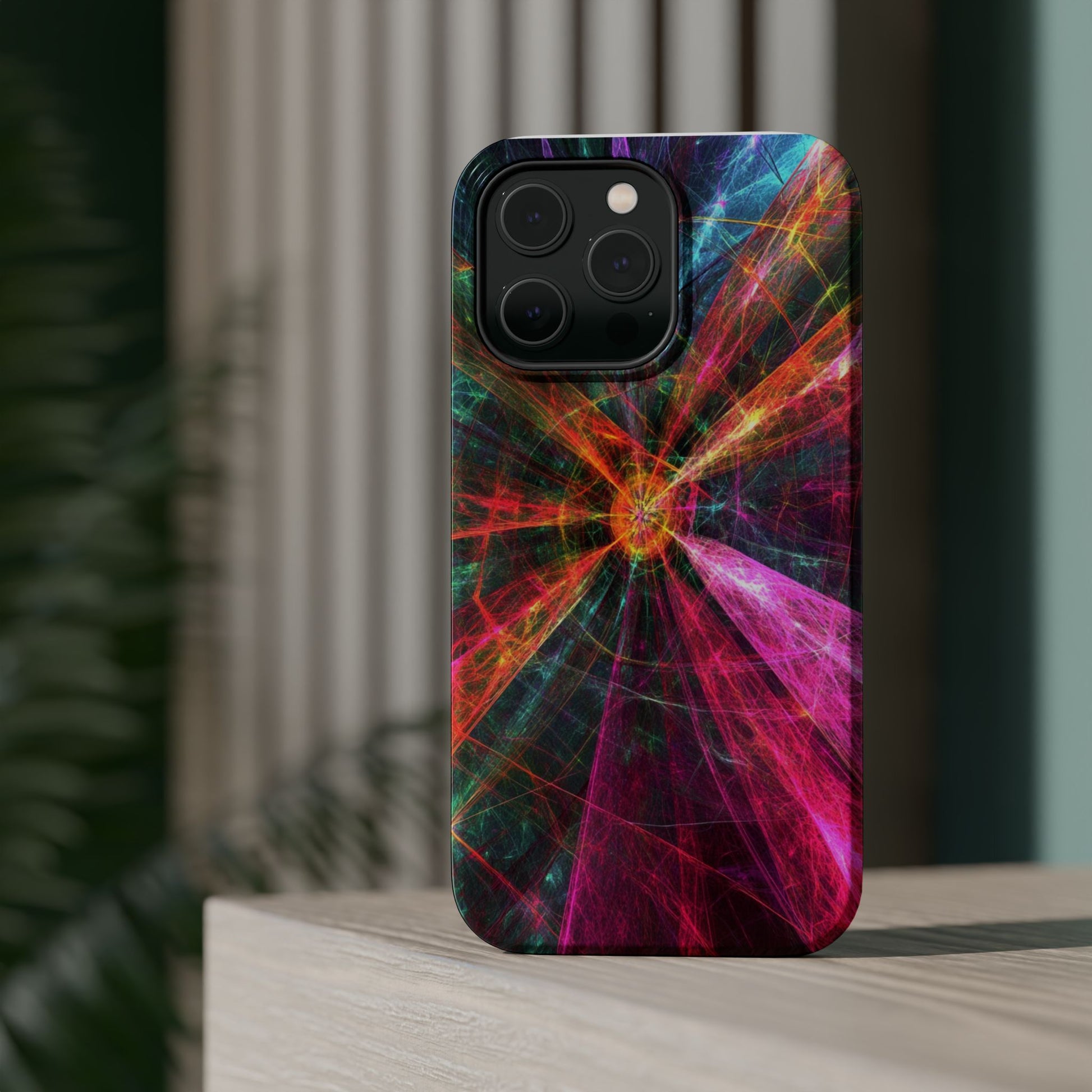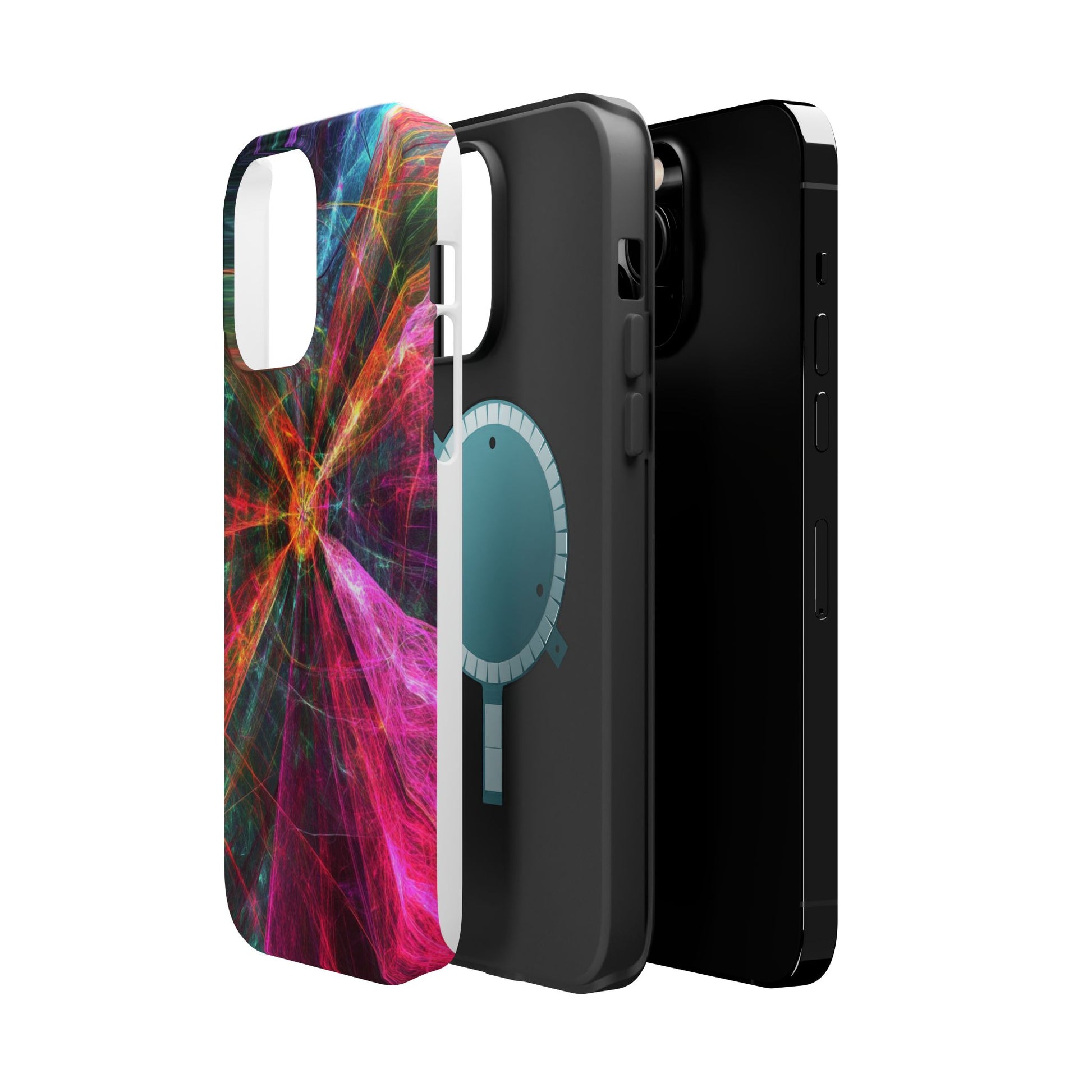Elevate your phone protection with the Luxurious Magnetic Wireless Charging Tough iPhone Case, featuring a mesmerizing art piece by Moxie-Jay. The design showcases a vibrant starburst of trippy energy beams of light, paired with an additional artwork of a hand scratching a bright red record for a unique, artistic touch. This durable case combines style and functionality, offering: