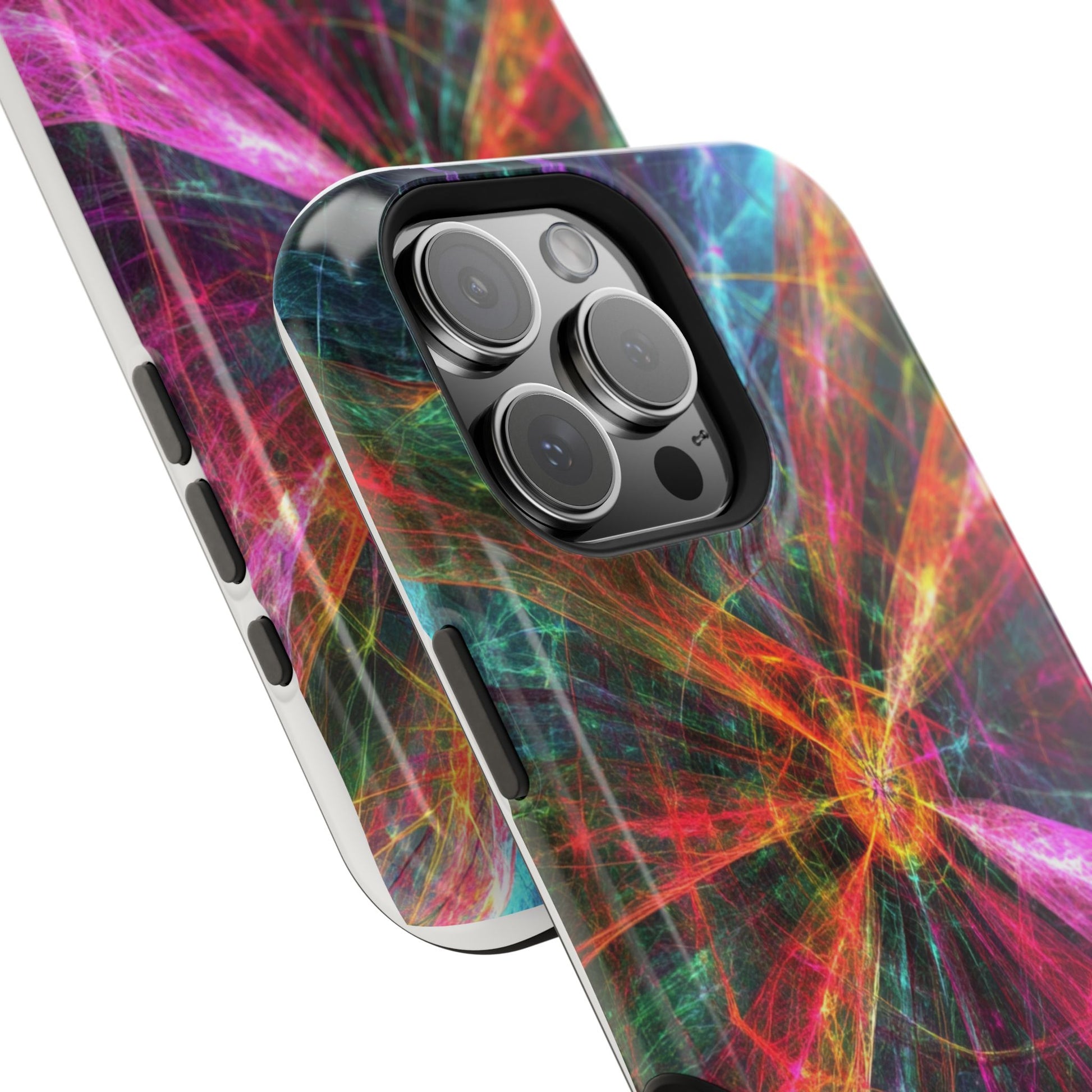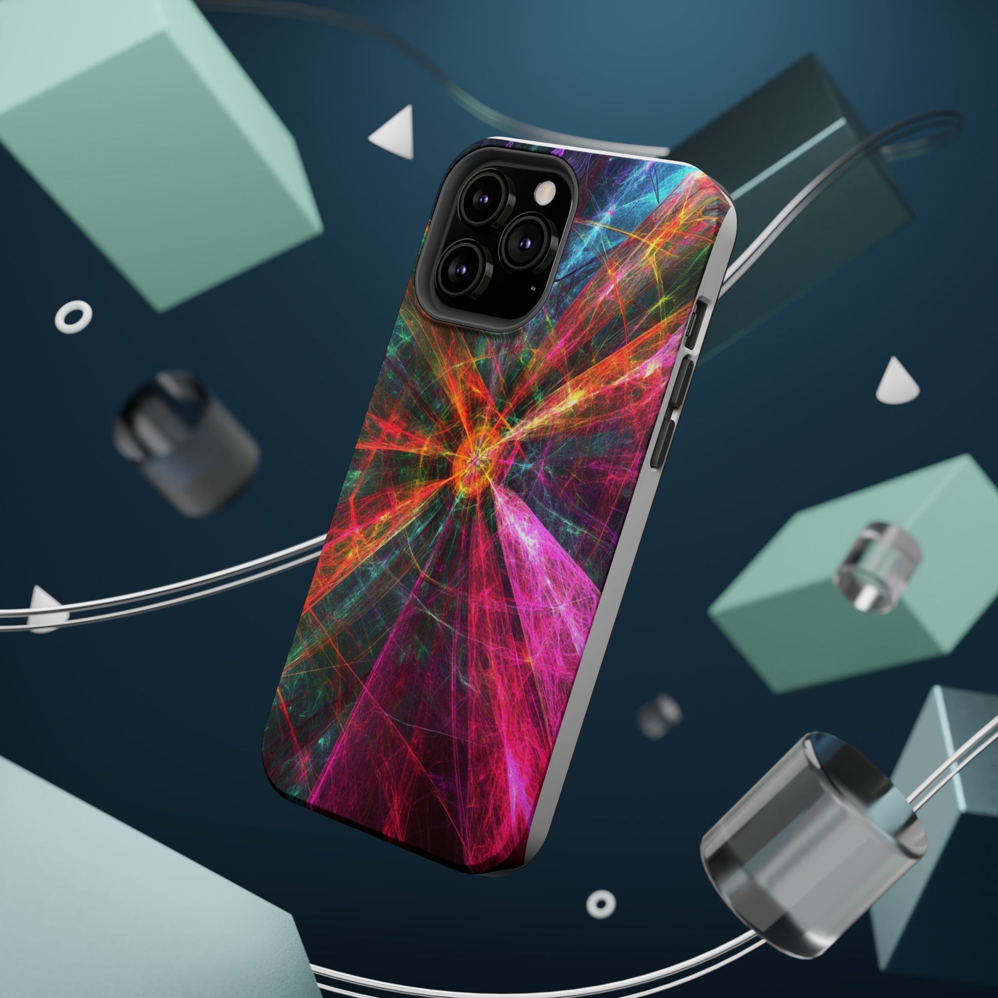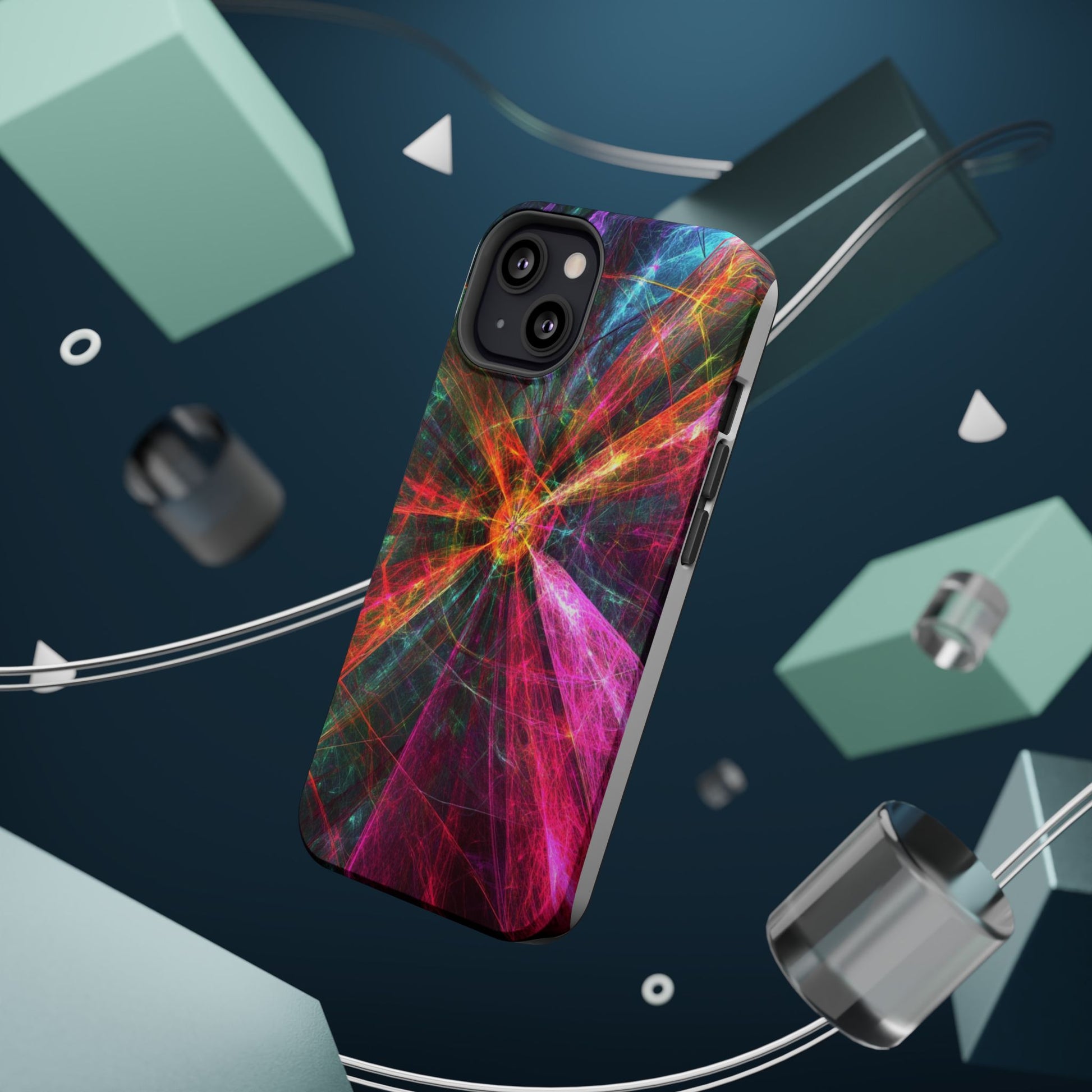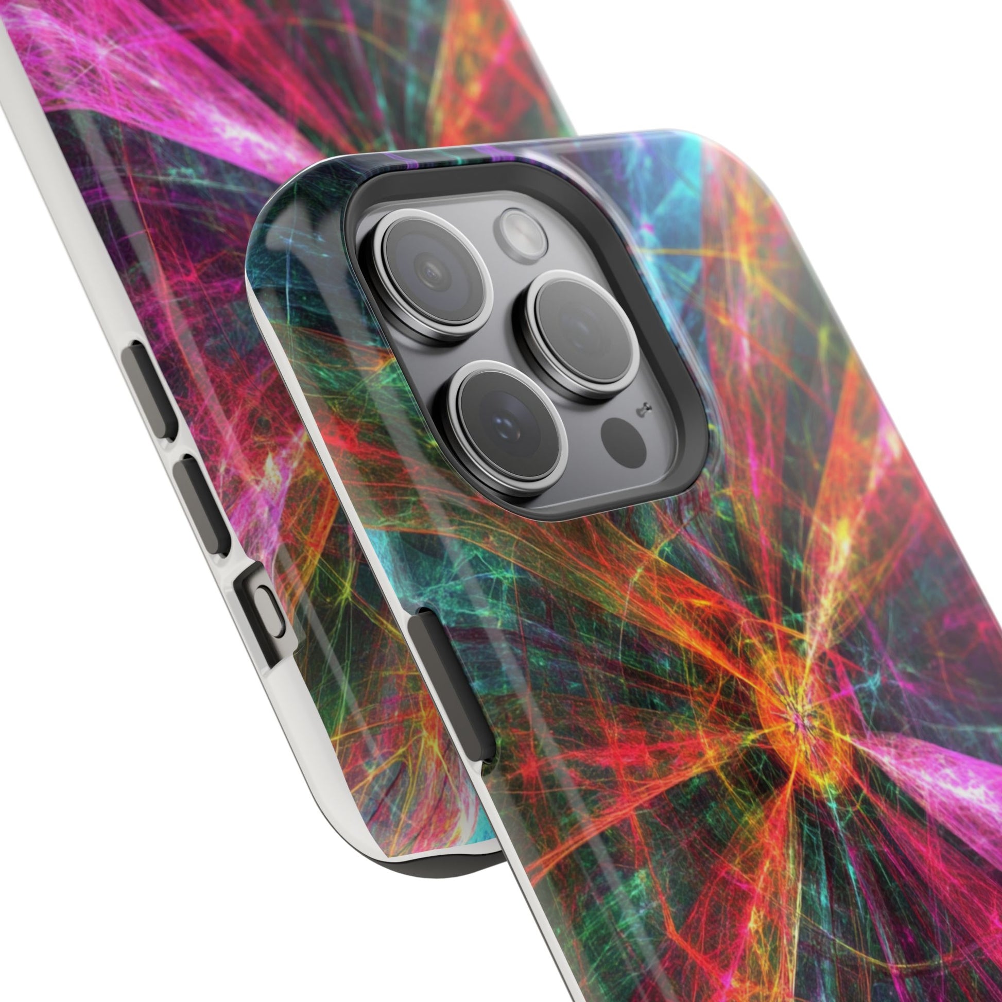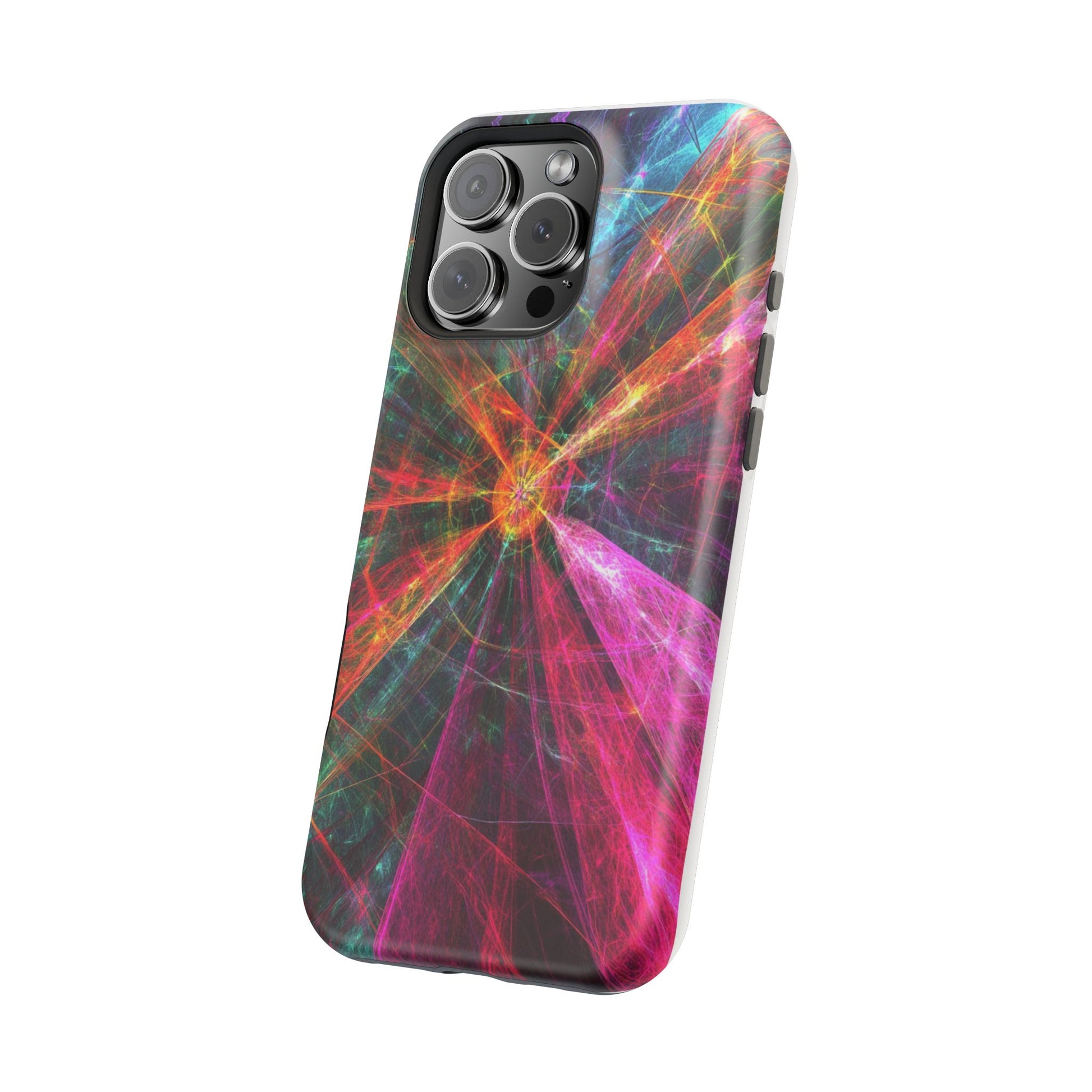 Elevate your phone protection with the Luxurious Magnetic Wireless Charging Tough iPhone Case, featuring a mesmerizing art piece by Moxie-Jay. The design showcases a vibrant starburst of trippy energy beams of light, paired with an additional artwork of a hand scratching a bright red record for a unique, artistic touch. This durable case combines style and functionality, offering: