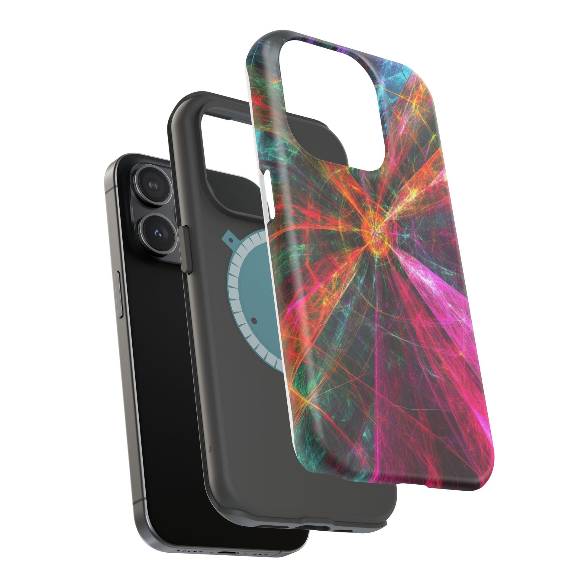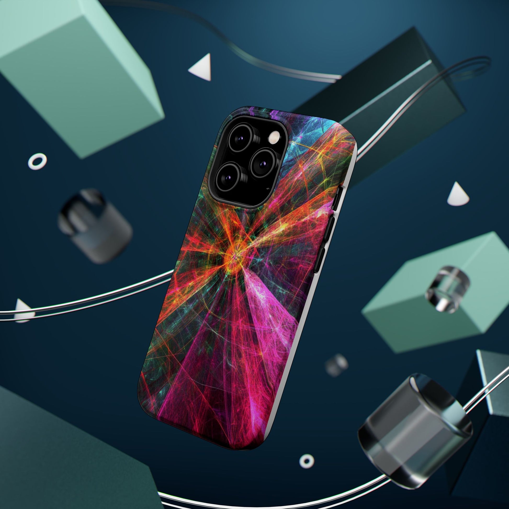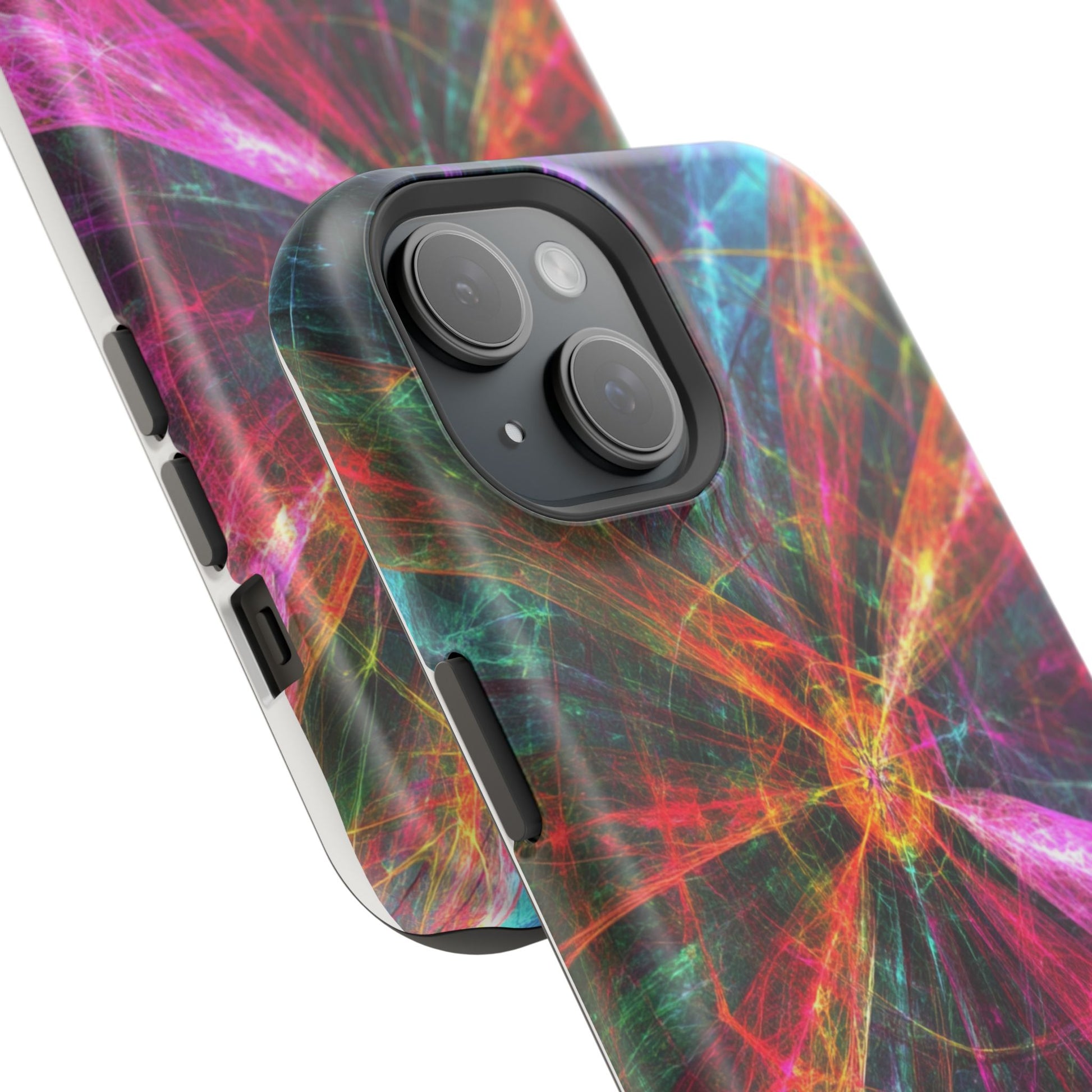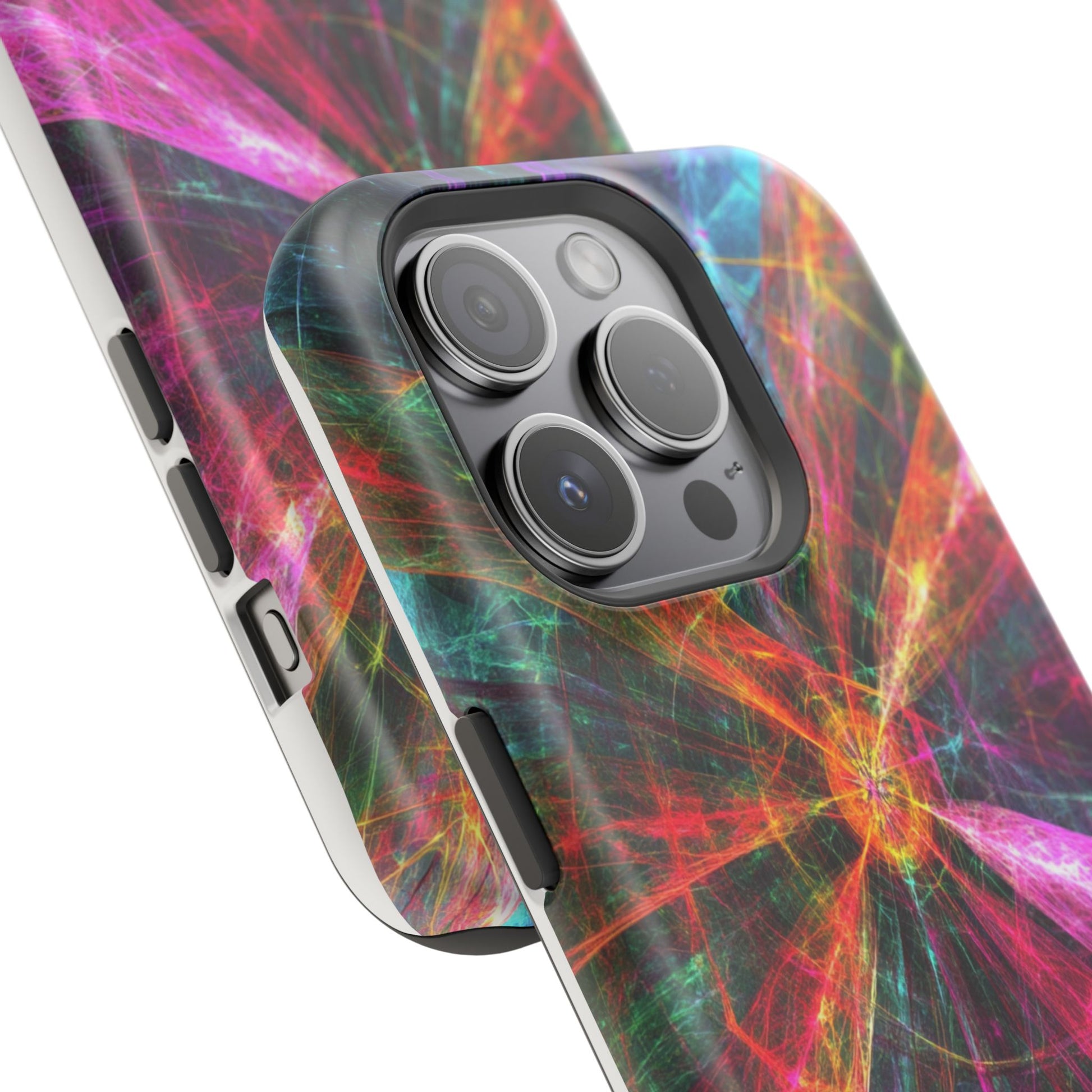 Elevate your phone protection with the Luxurious Magnetic Wireless Charging Tough iPhone Case, featuring a mesmerizing art piece by Moxie-Jay. The design showcases a vibrant starburst of trippy energy beams of light, paired with an additional artwork of a hand scratching a bright red record for a unique, artistic touch. This durable case combines style and functionality, offering: