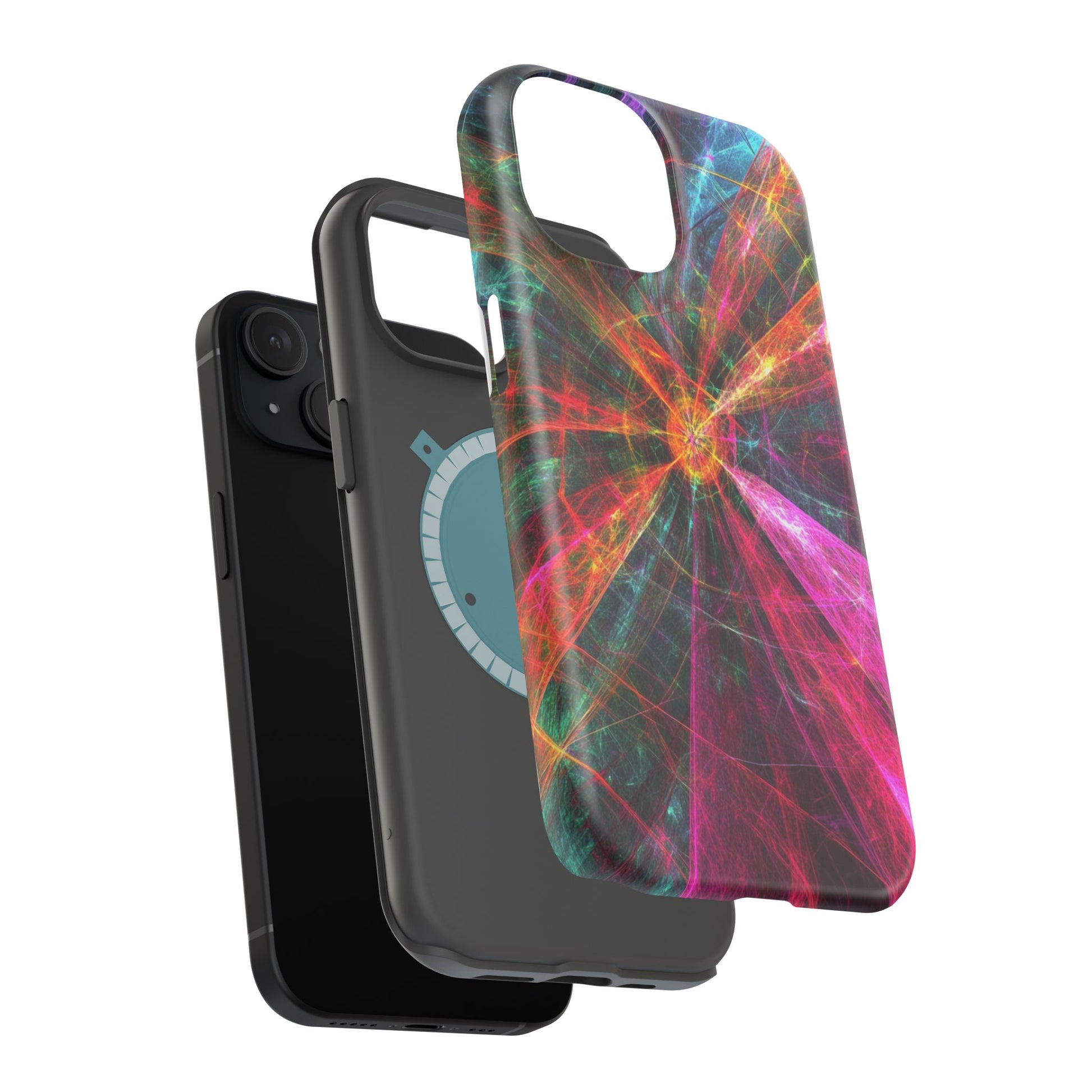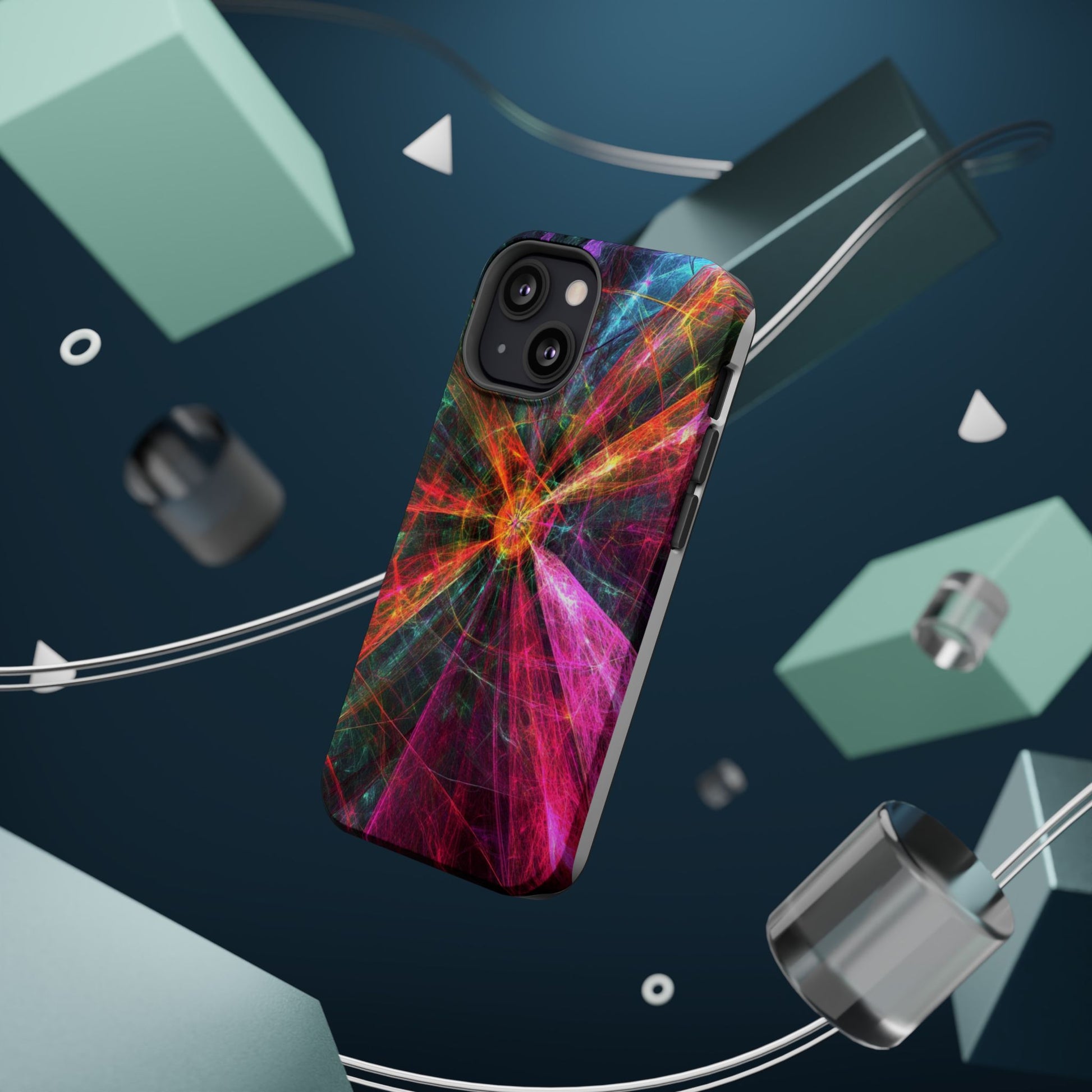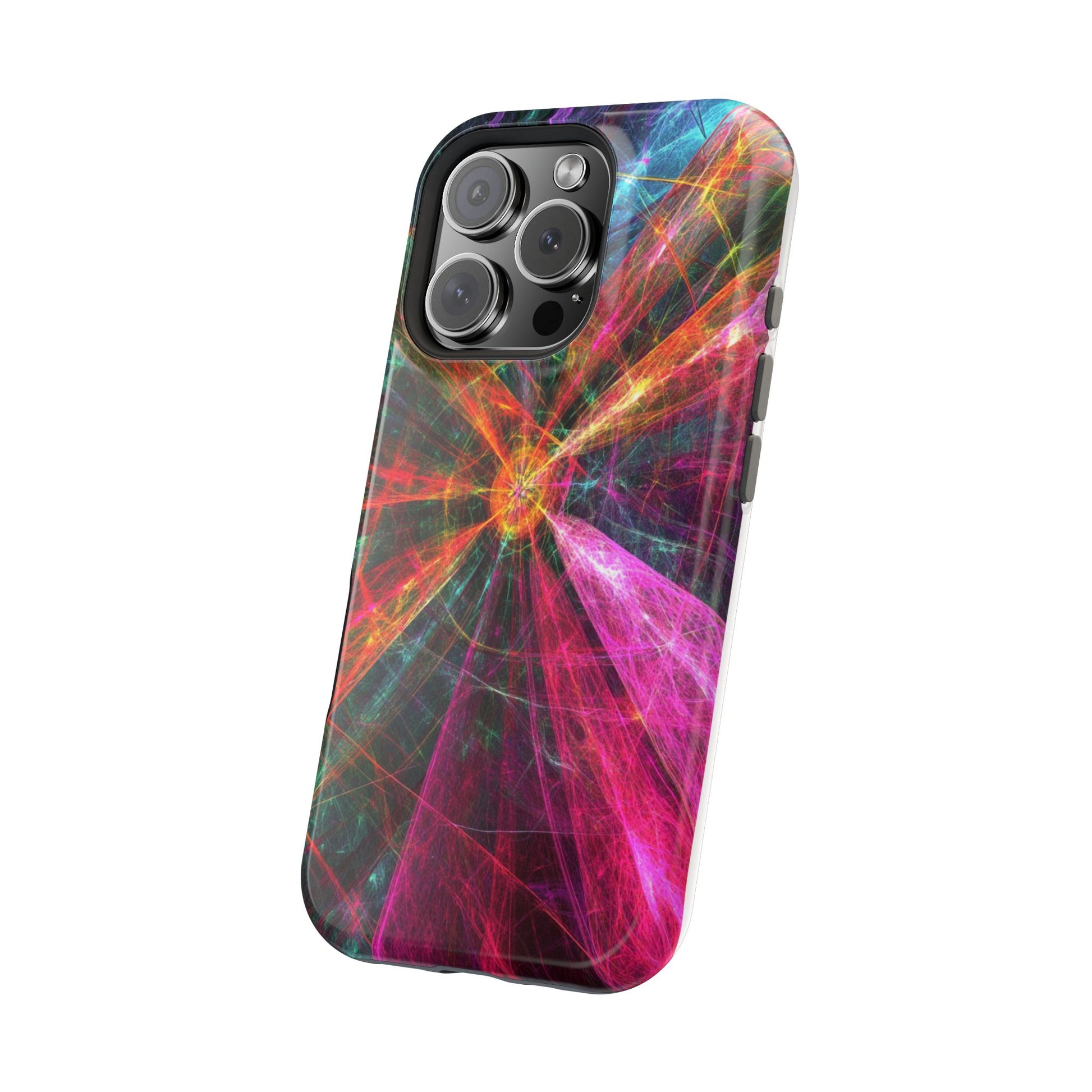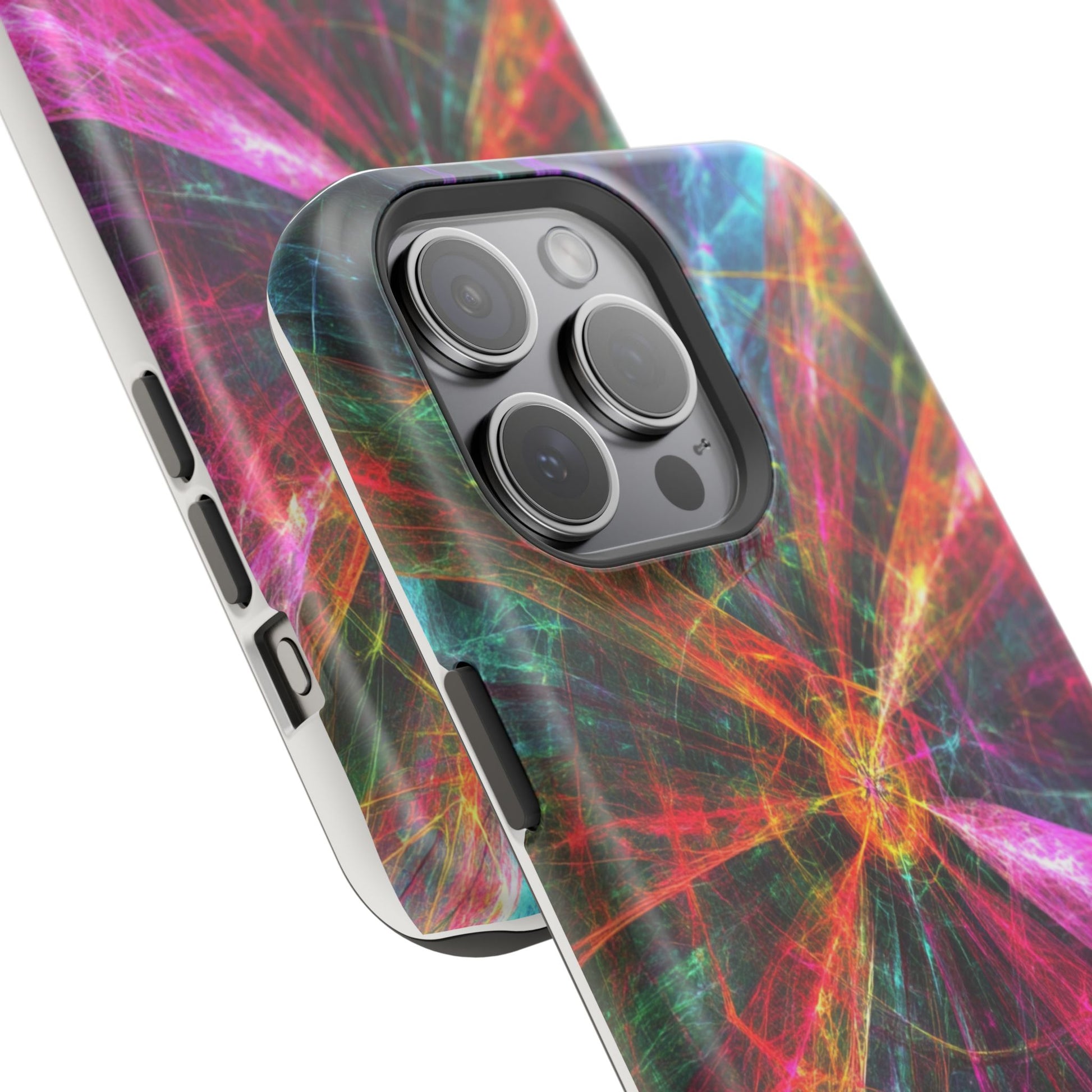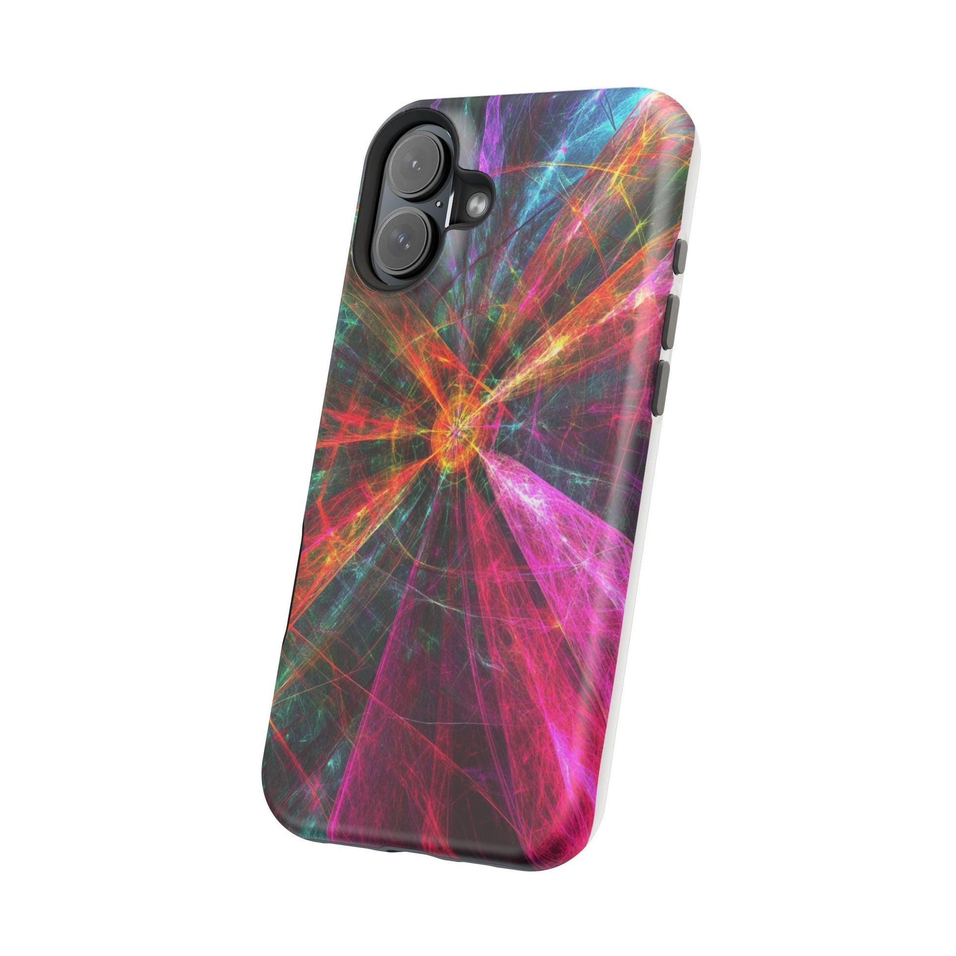 Elevate your phone protection with the Luxurious Magnetic Wireless Charging Tough iPhone Case, featuring a mesmerizing art piece by Moxie-Jay. The design showcases a vibrant starburst of trippy energy beams of light, paired with an additional artwork of a hand scratching a bright red record for a unique, artistic touch. This durable case combines style and functionality, offering: