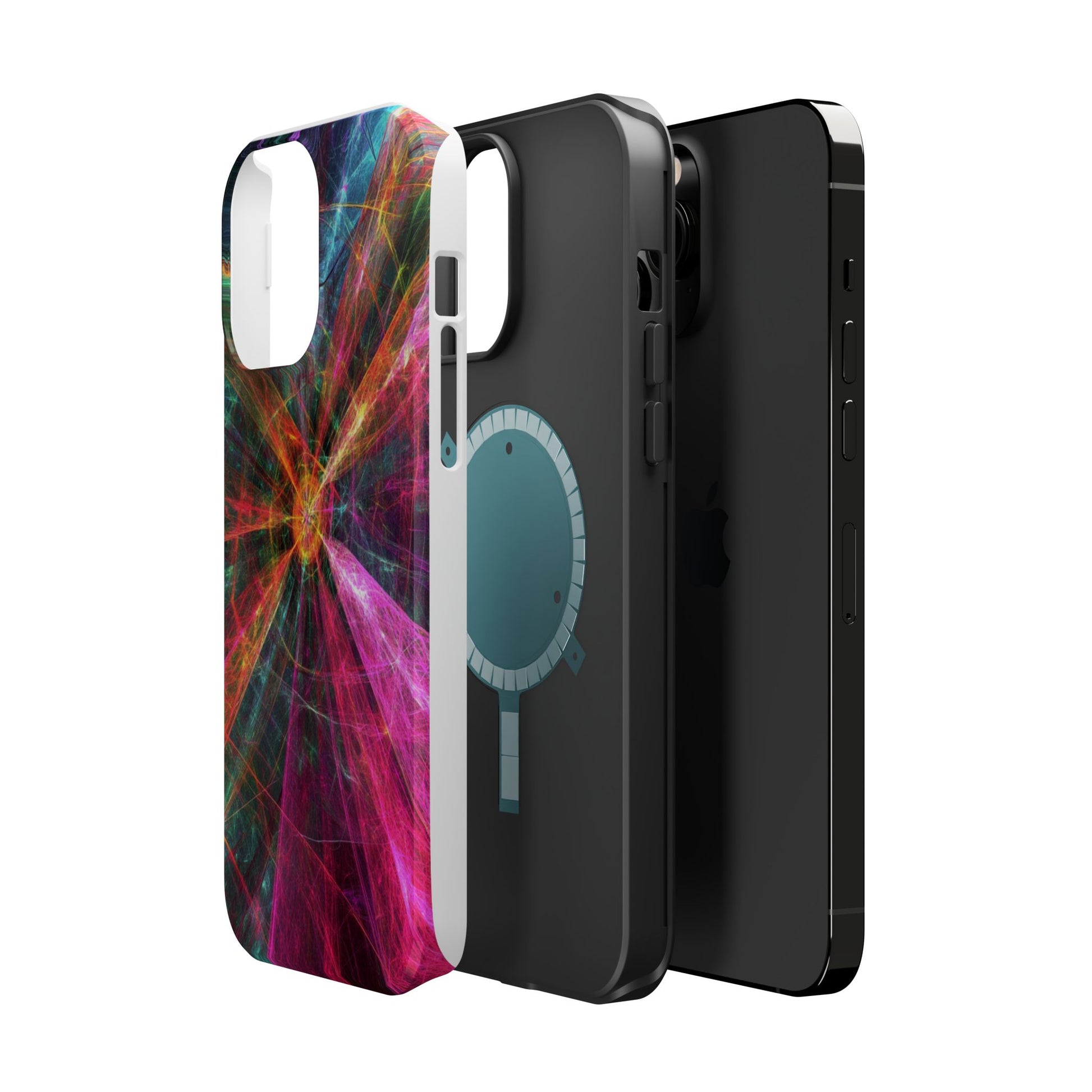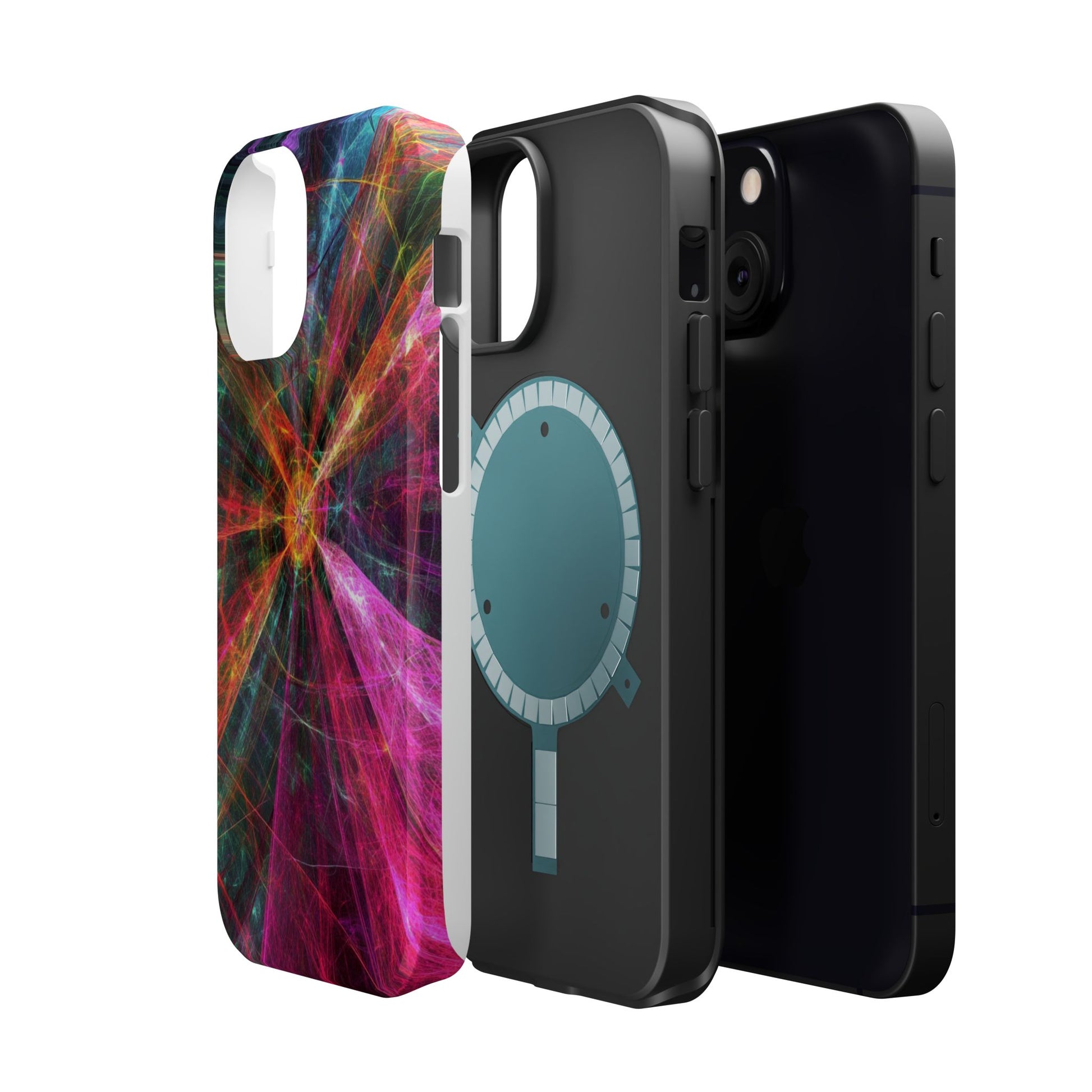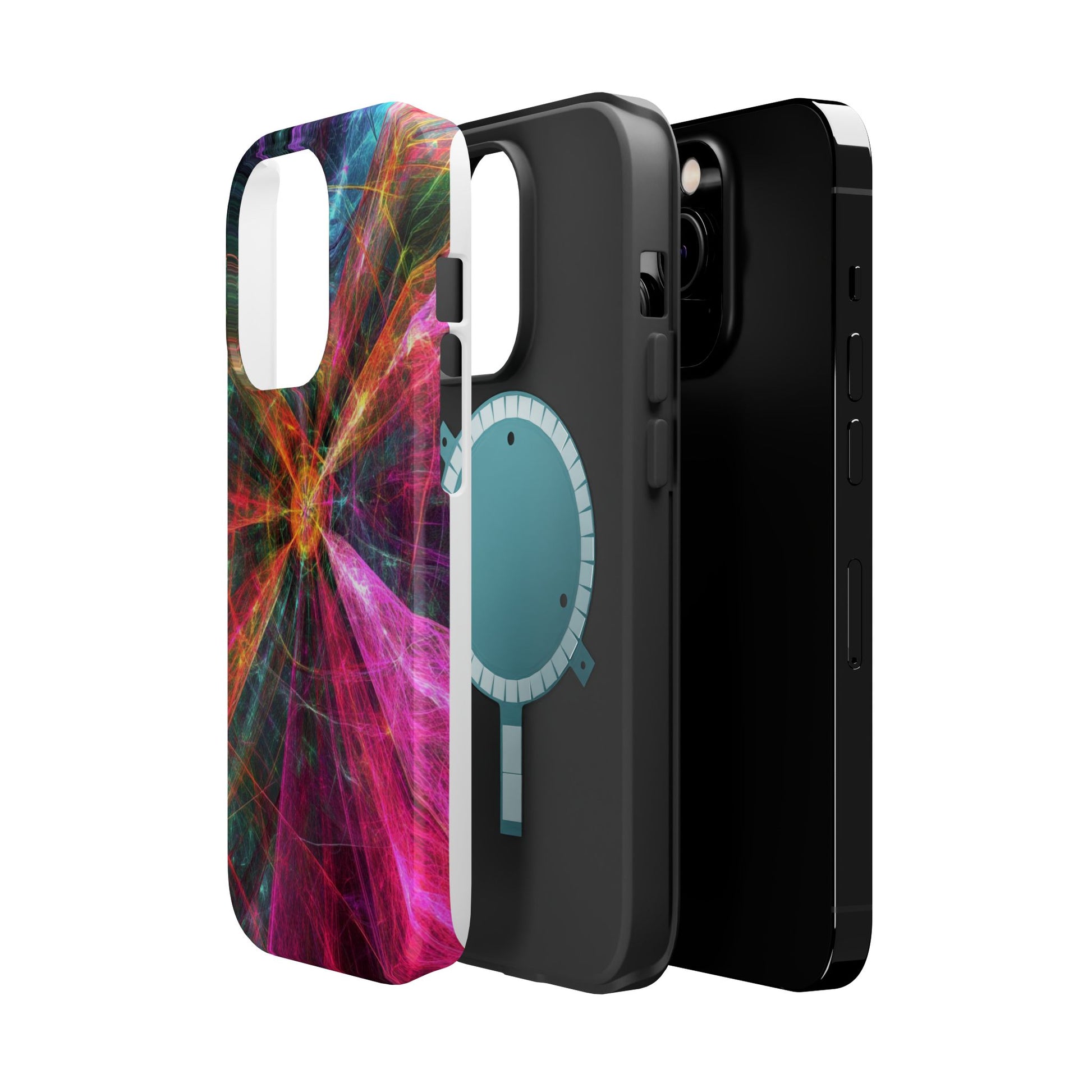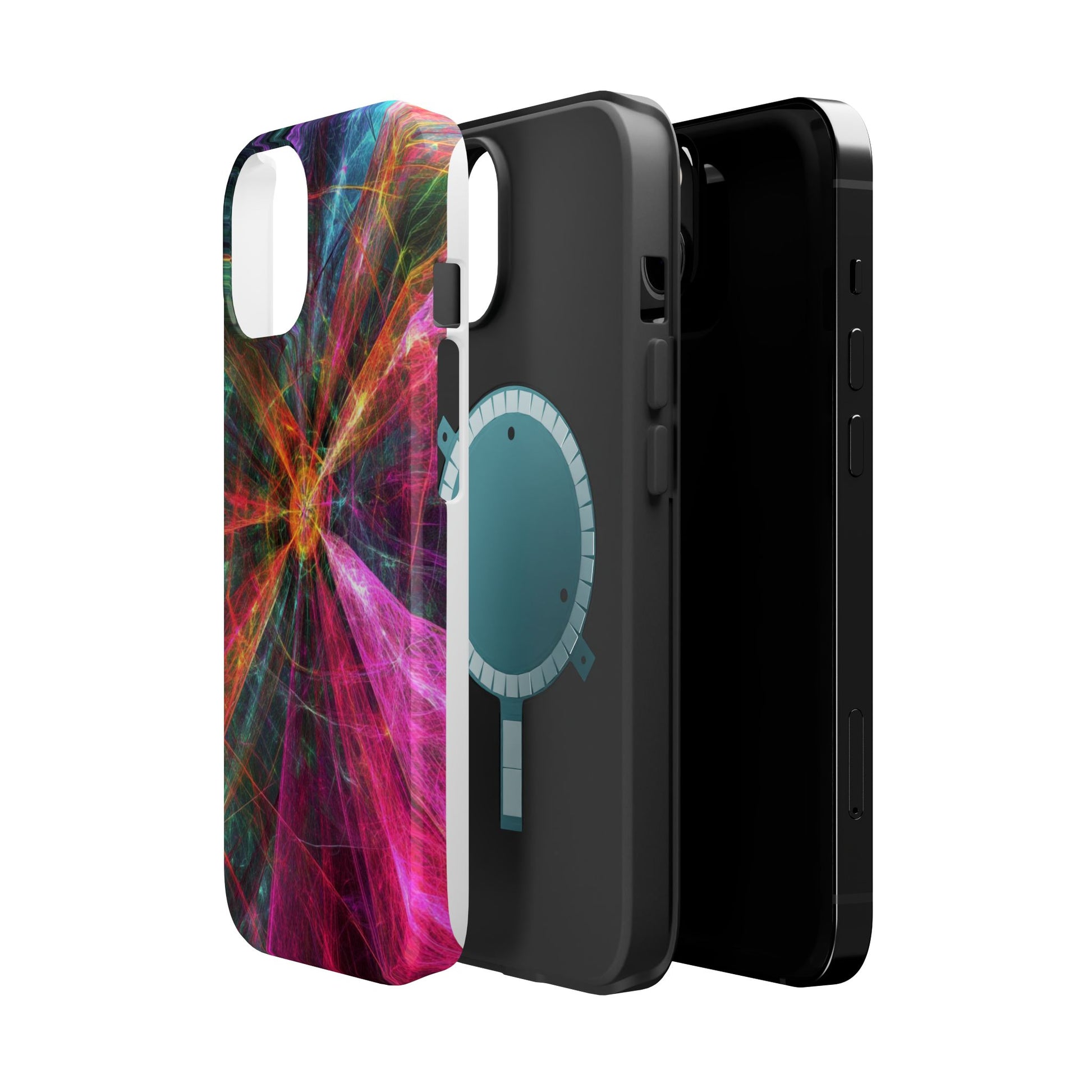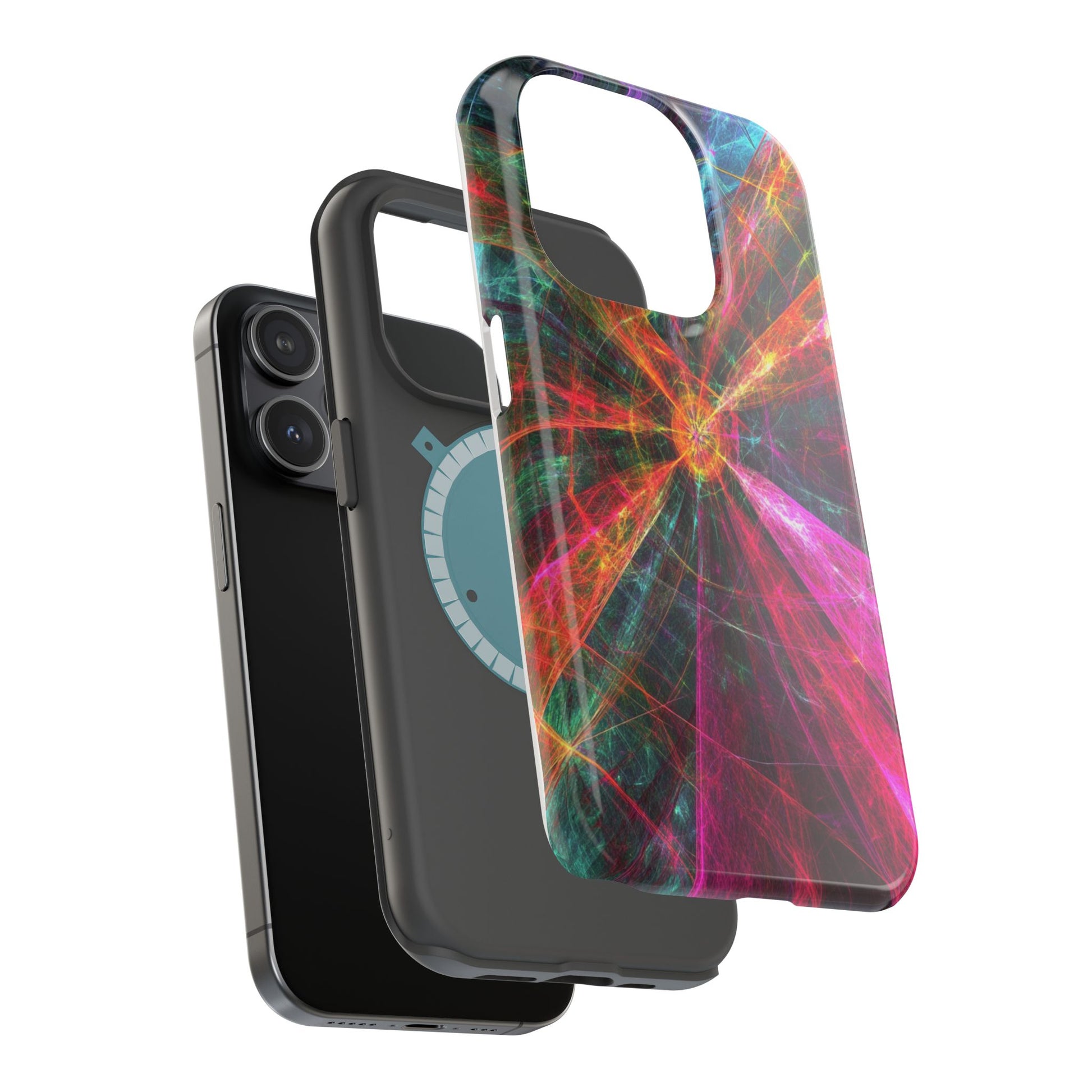 Elevate your phone protection with the Luxurious Magnetic Wireless Charging Tough iPhone Case, featuring a mesmerizing art piece by Moxie-Jay. The design showcases a vibrant starburst of trippy energy beams of light, paired with an additional artwork of a hand scratching a bright red record for a unique, artistic touch. This durable case combines style and functionality, offering: