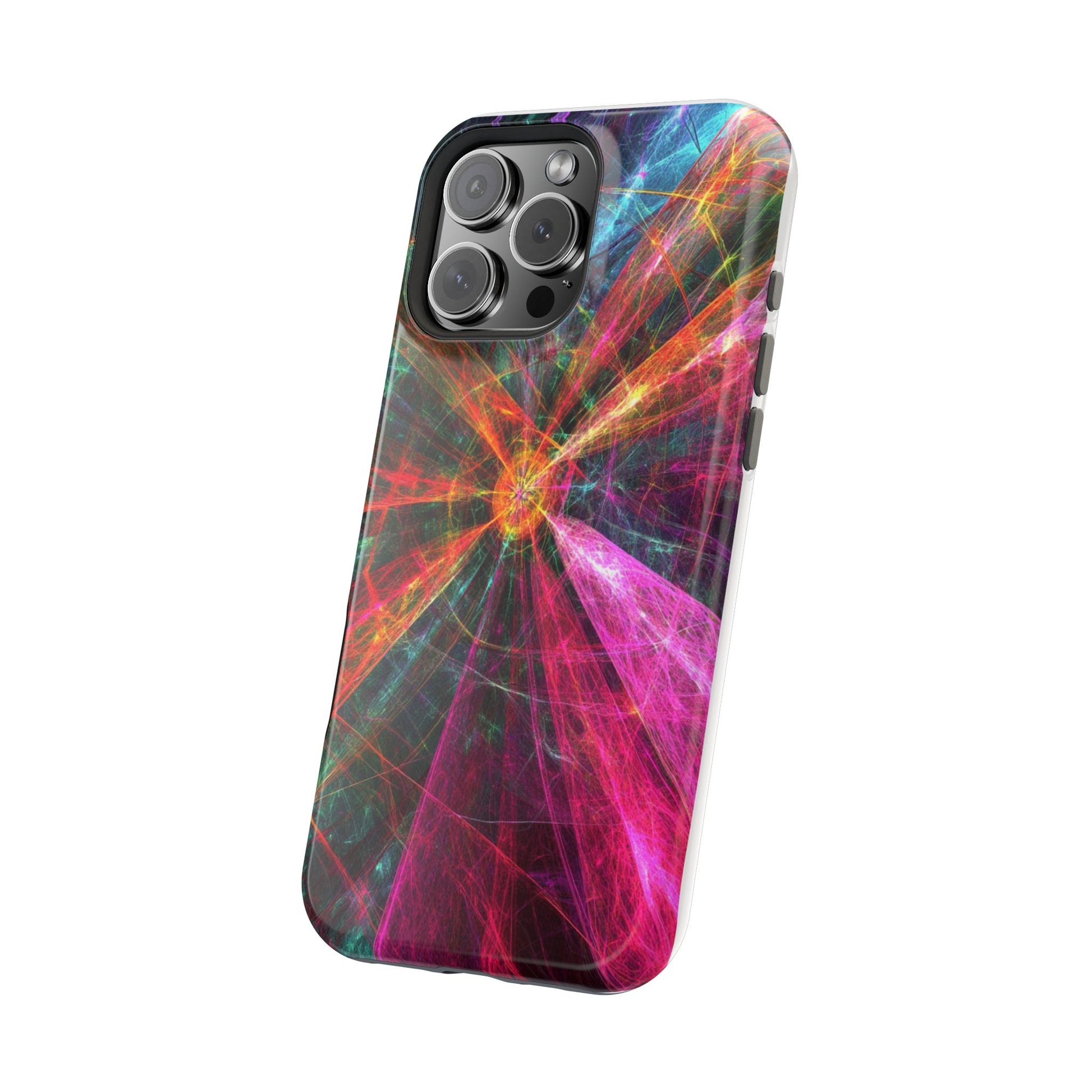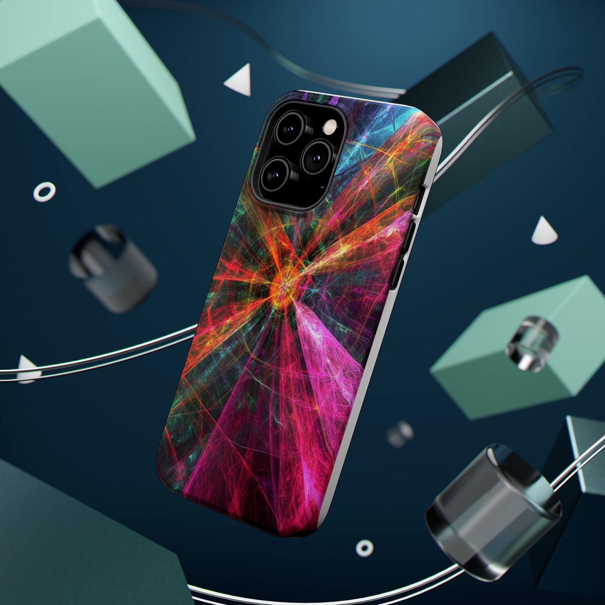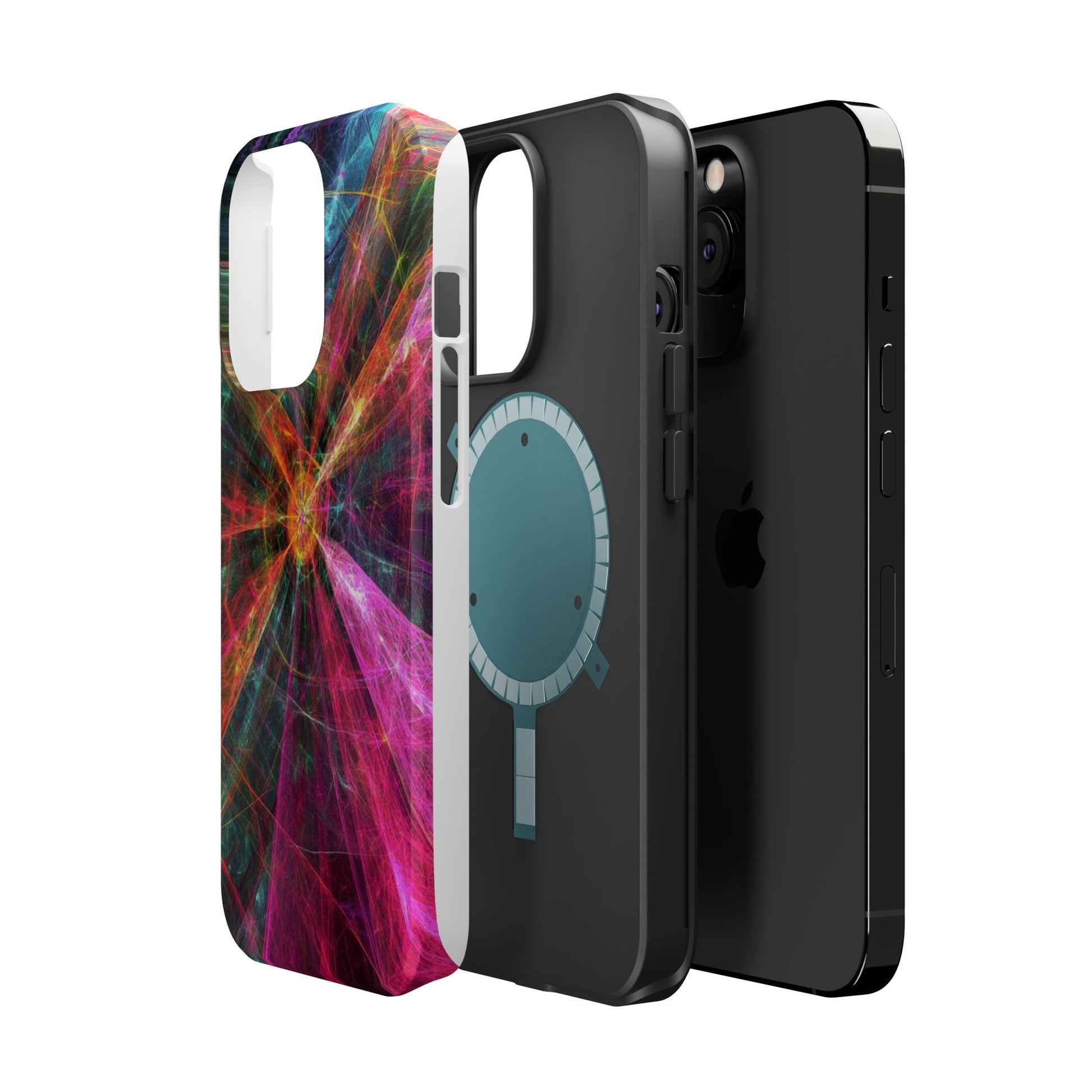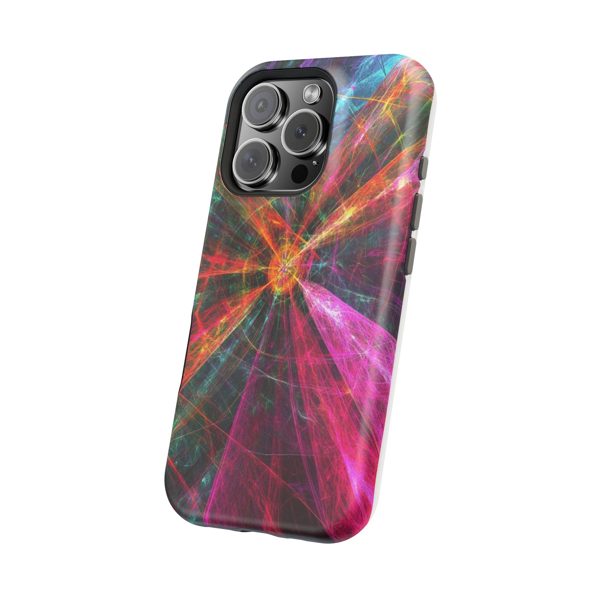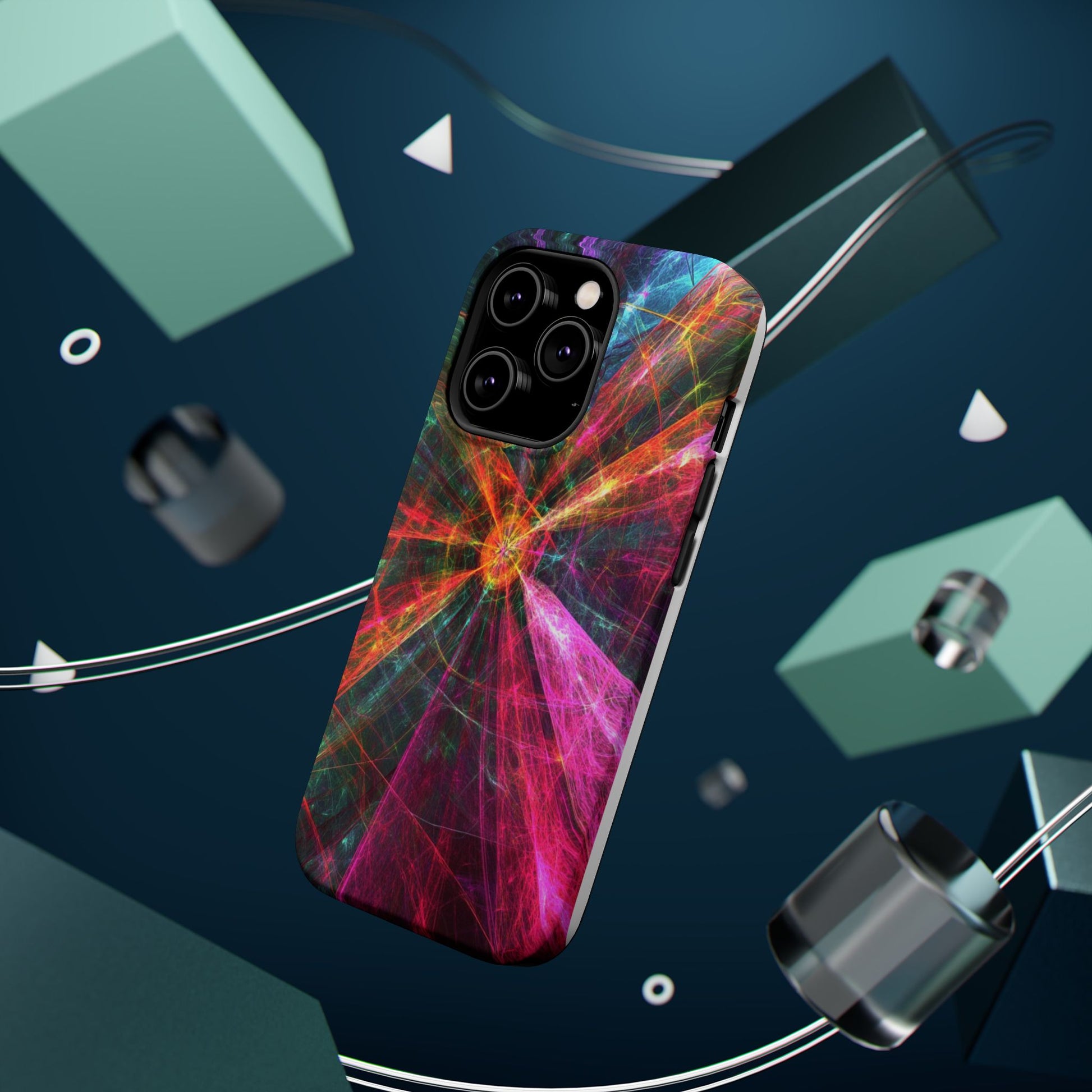 Elevate your phone protection with the Luxurious Magnetic Wireless Charging Tough iPhone Case, featuring a mesmerizing art piece by Moxie-Jay. The design showcases a vibrant starburst of trippy energy beams of light, paired with an additional artwork of a hand scratching a bright red record for a unique, artistic touch. This durable case combines style and functionality, offering: