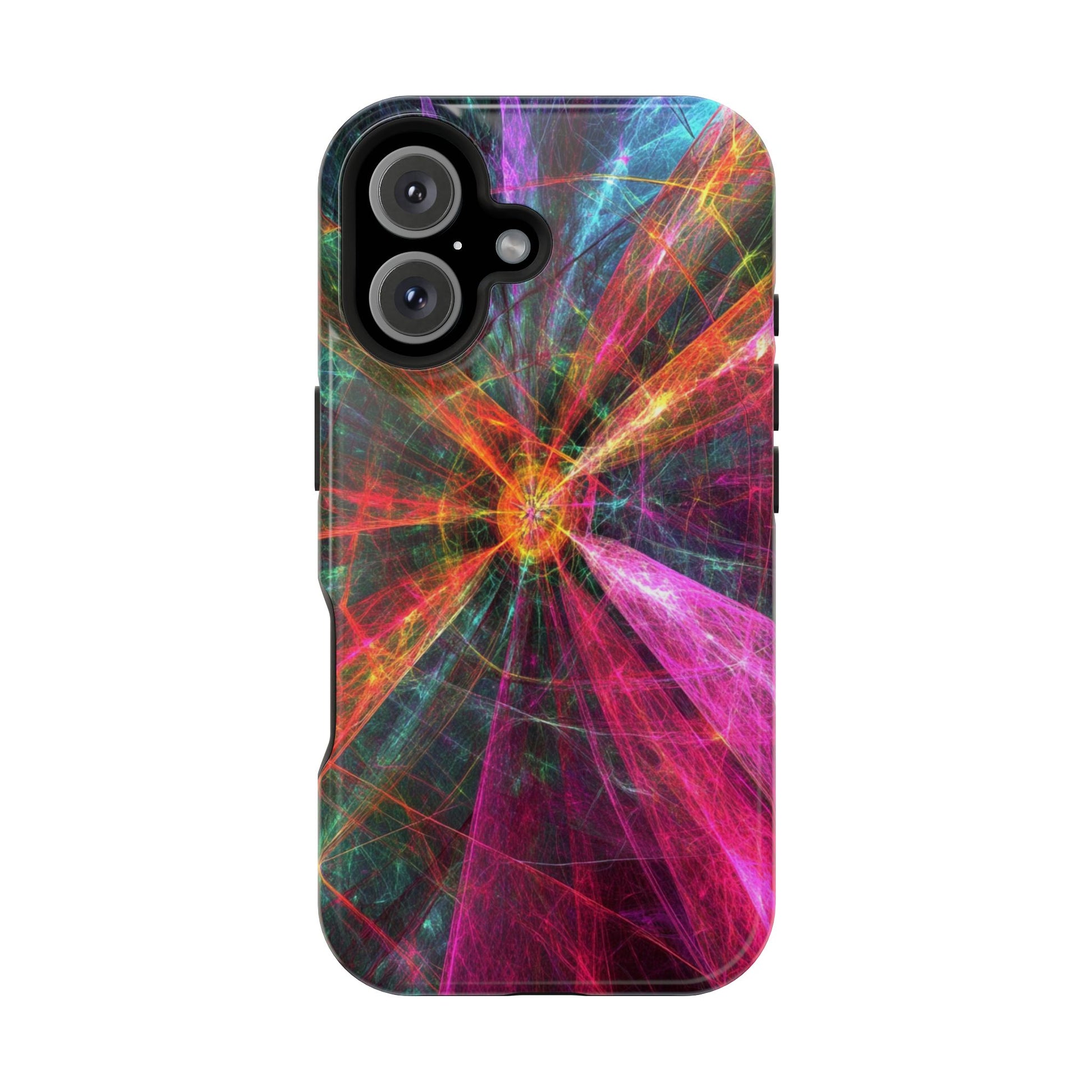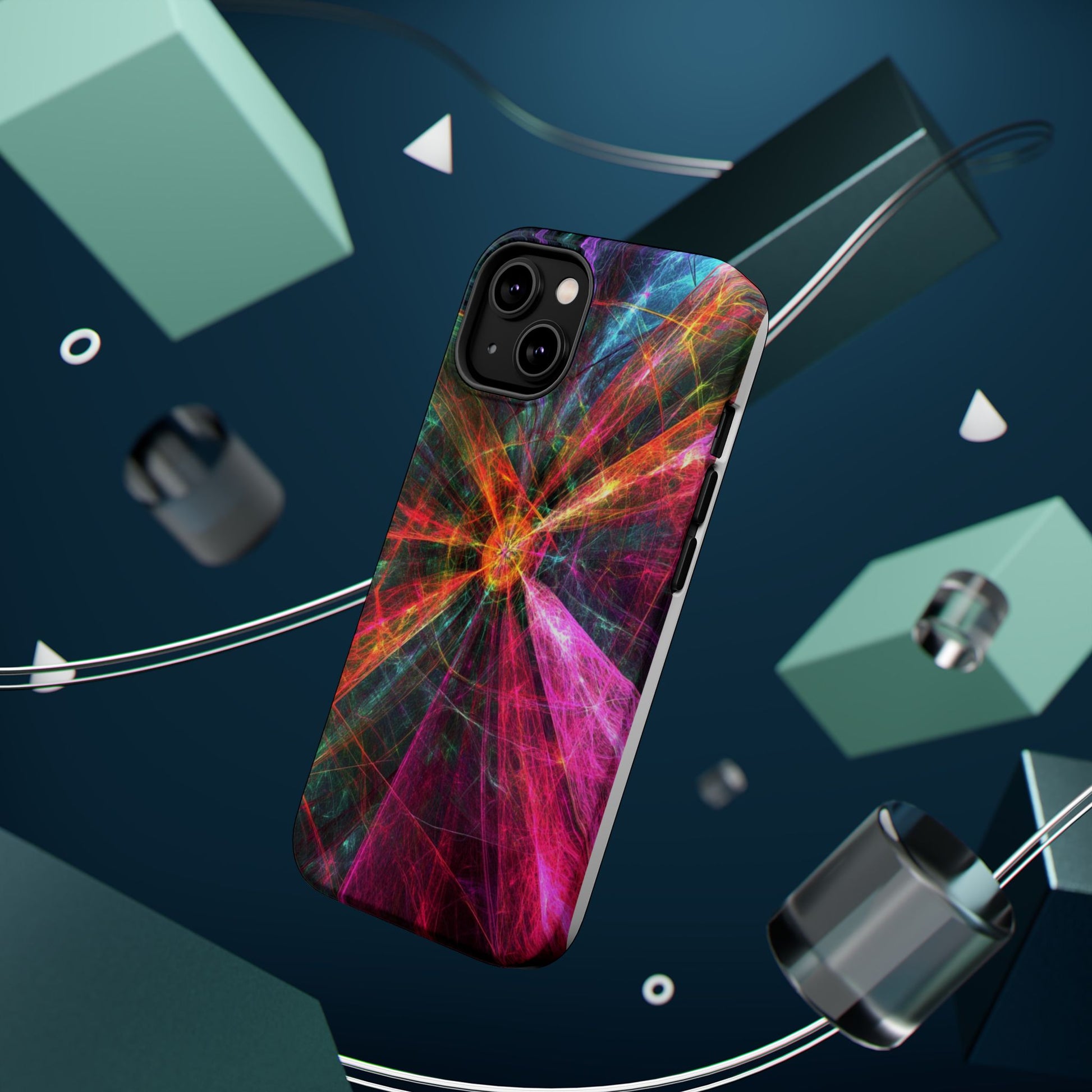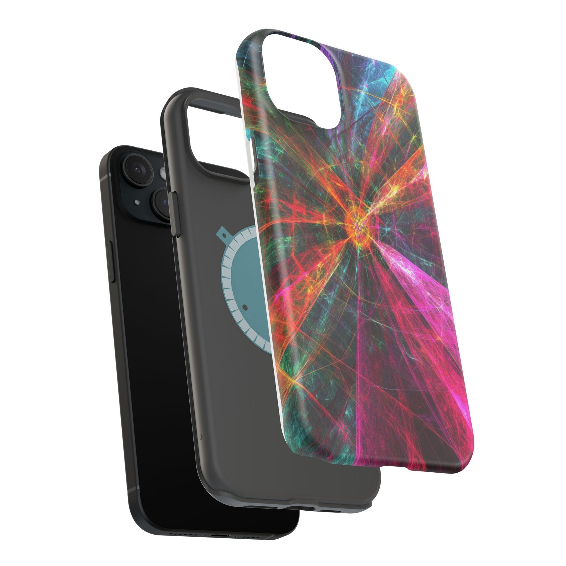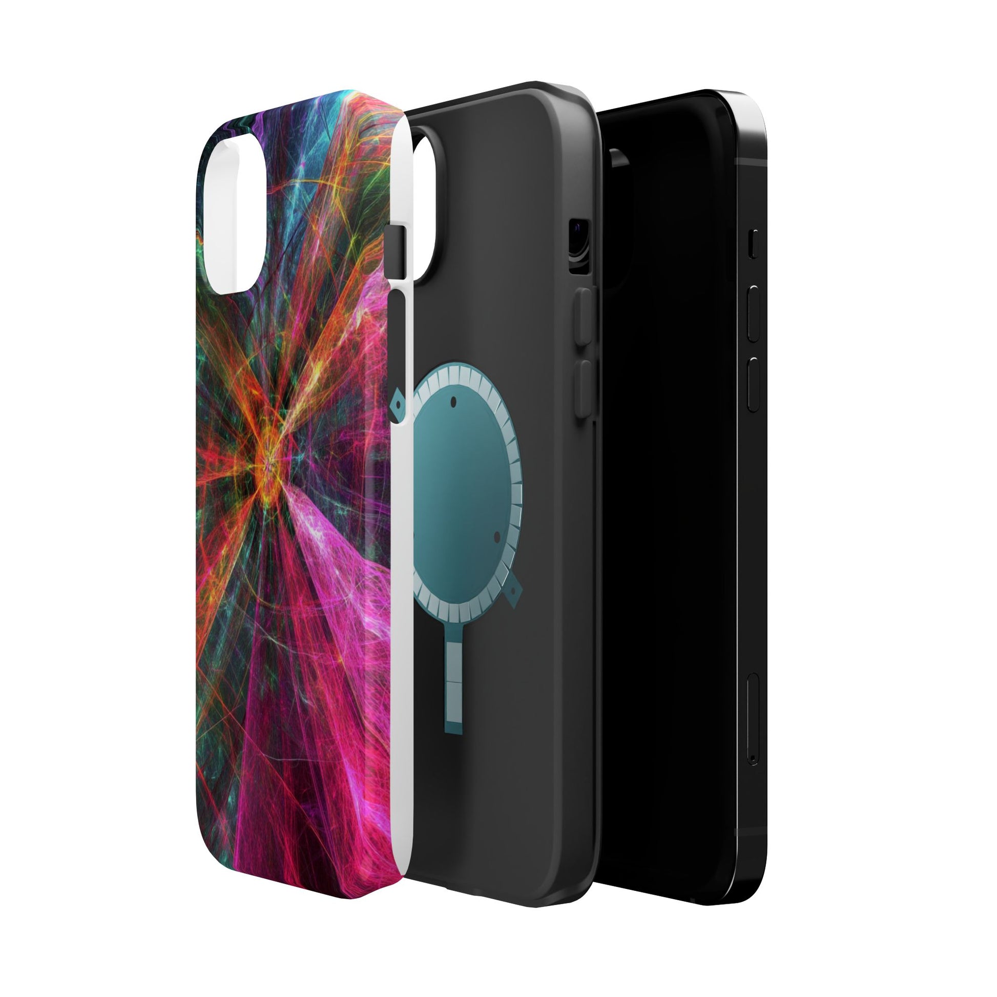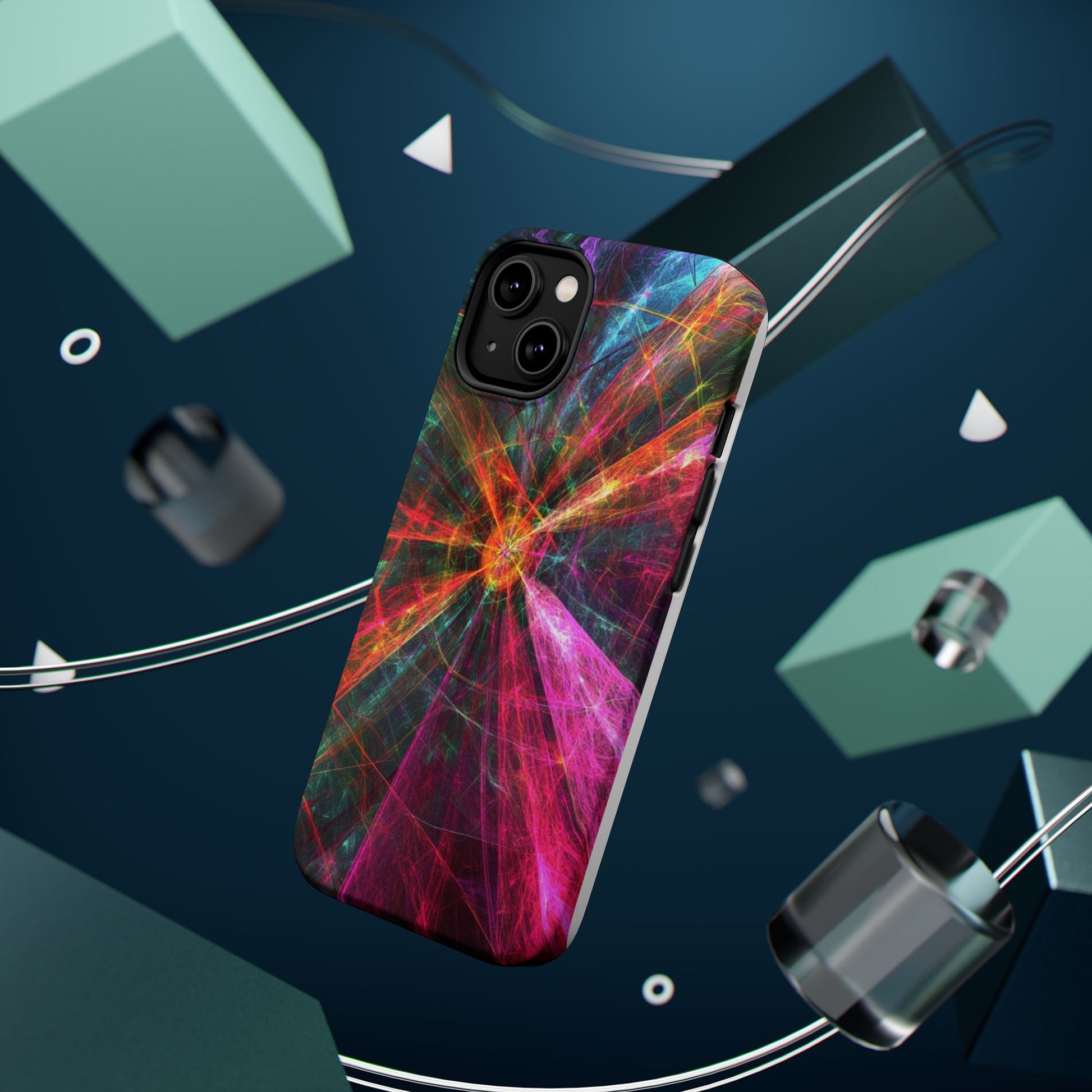 Elevate your phone protection with the Luxurious Magnetic Wireless Charging Tough iPhone Case, featuring a mesmerizing art piece by Moxie-Jay. The design showcases a vibrant starburst of trippy energy beams of light, paired with an additional artwork of a hand scratching a bright red record for a unique, artistic touch. This durable case combines style and functionality, offering:
