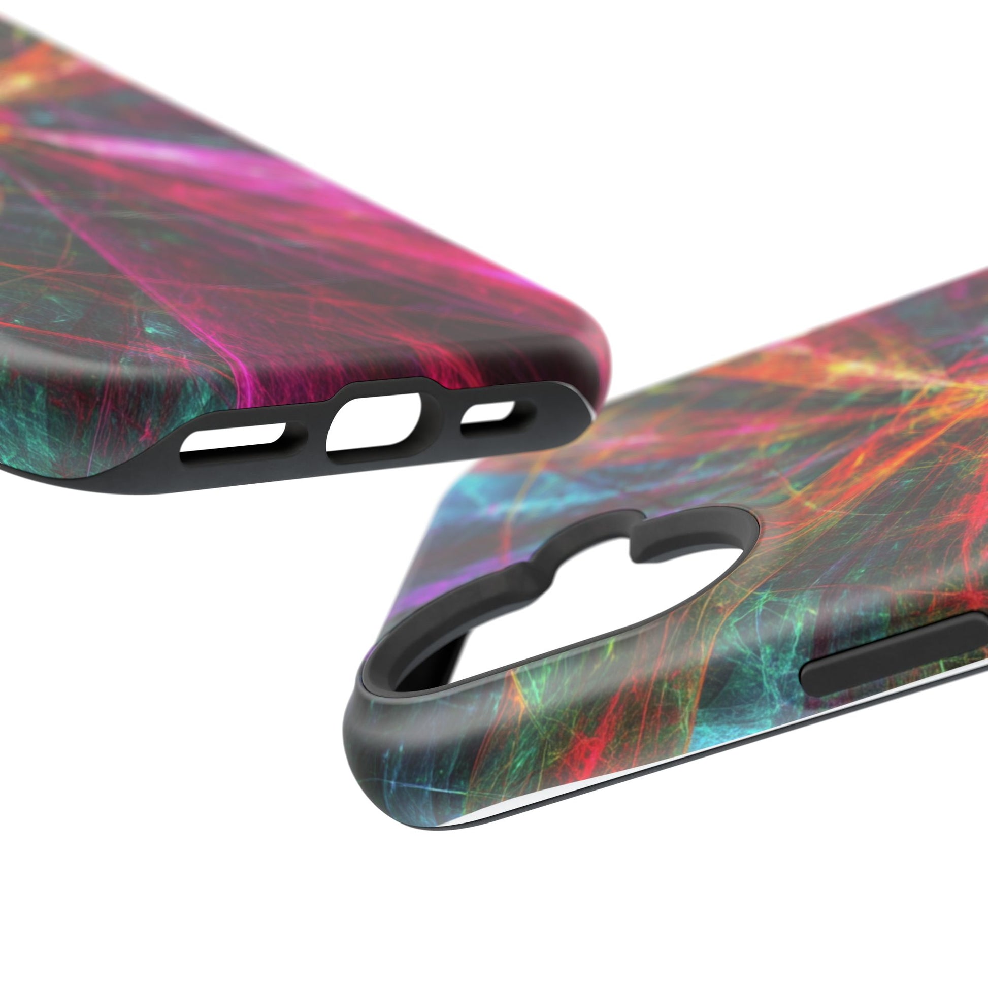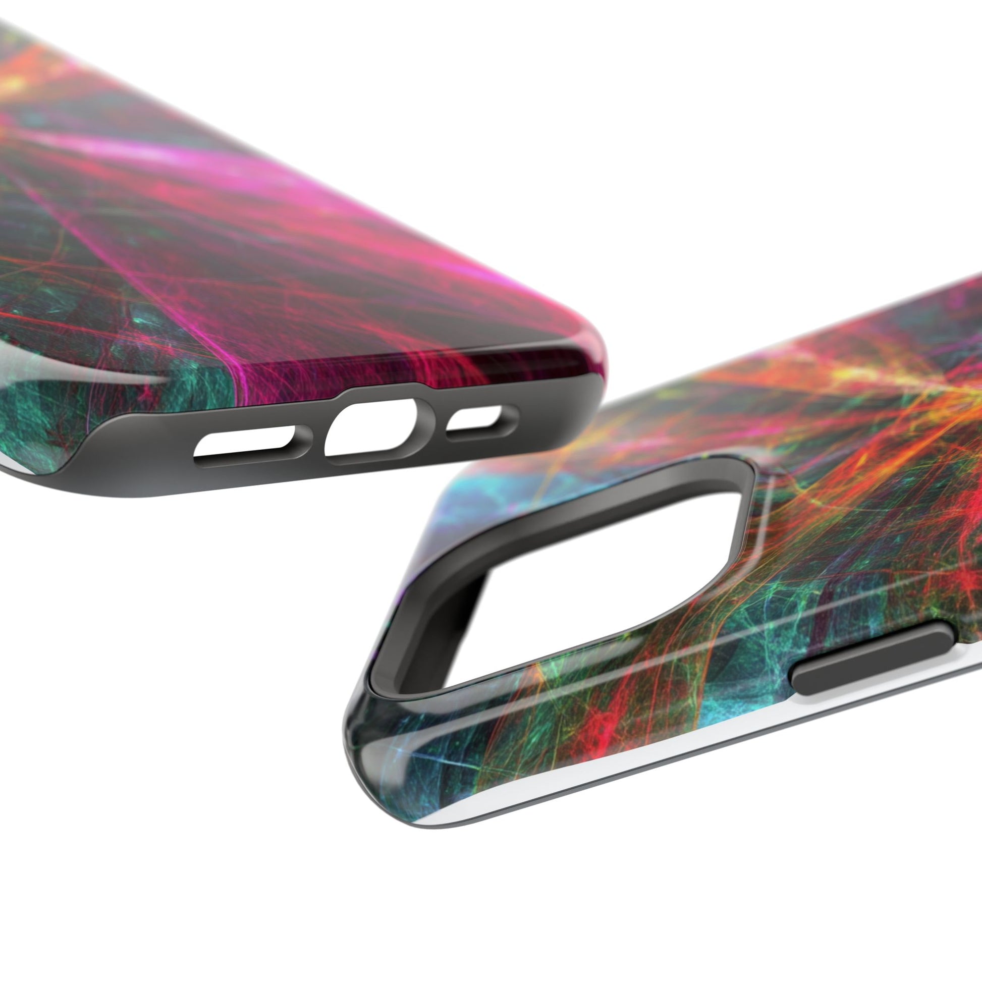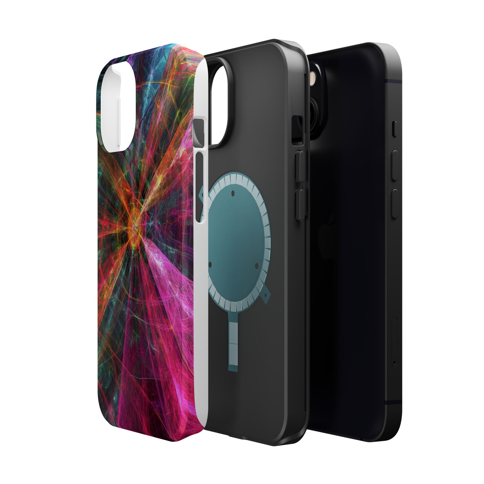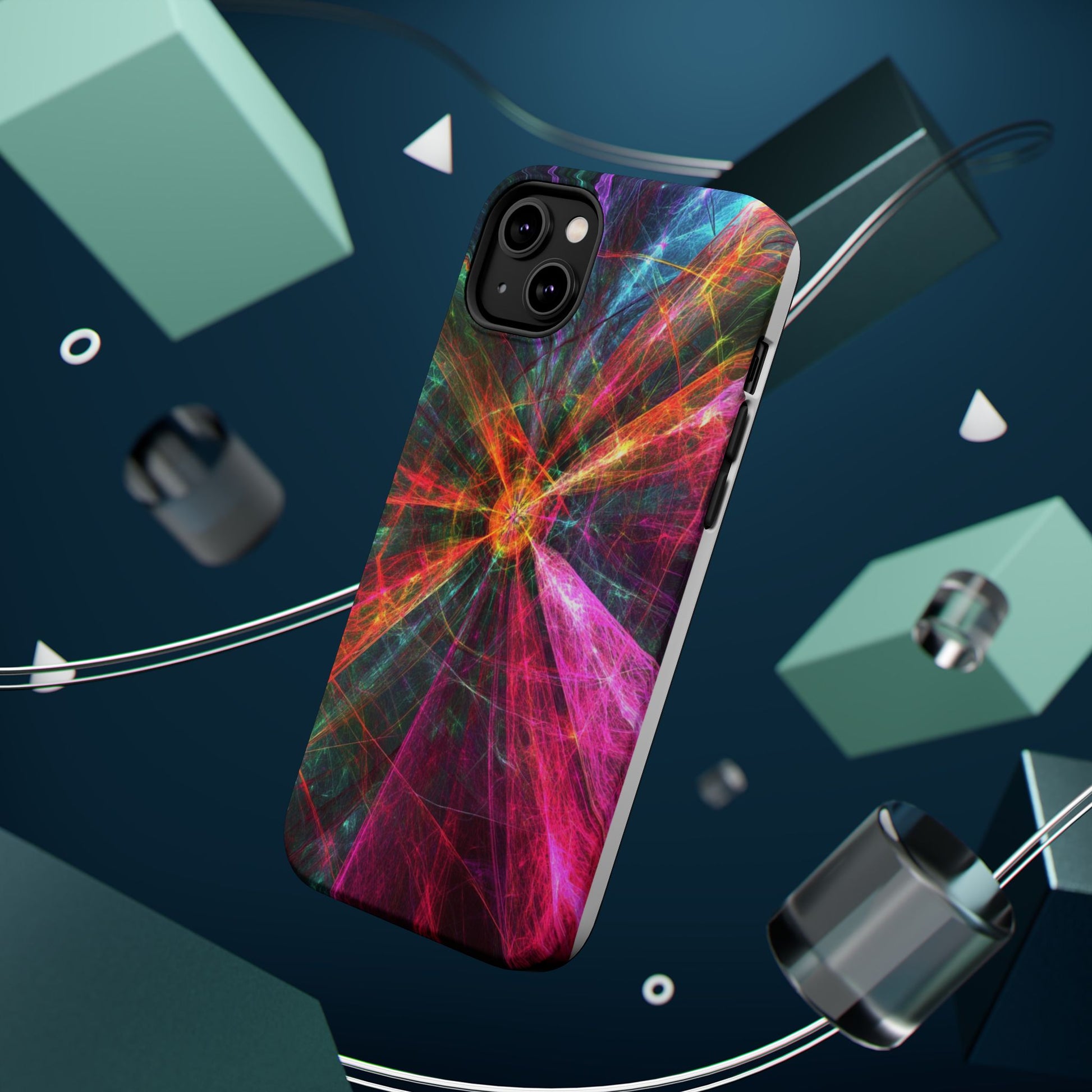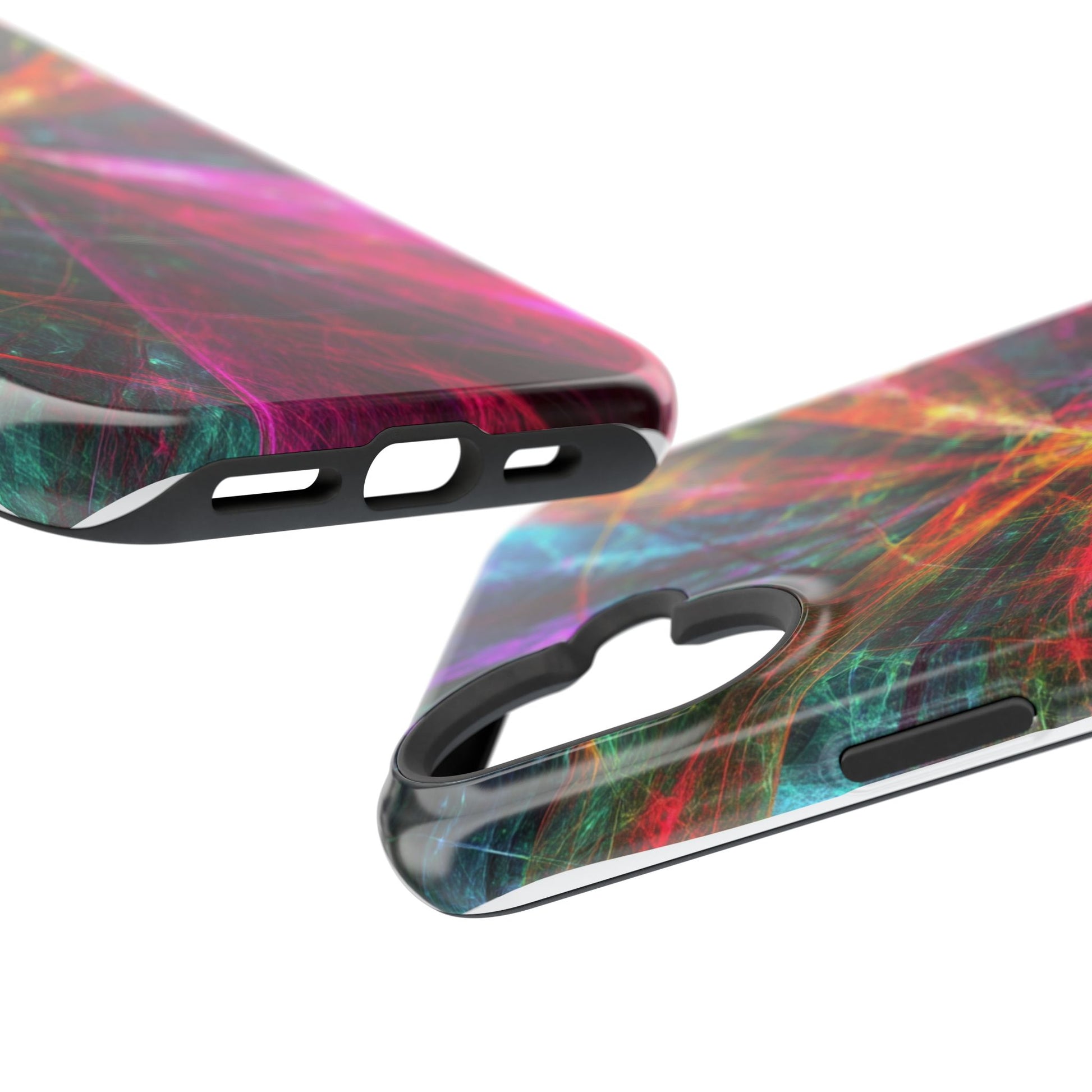 Elevate your phone protection with the Luxurious Magnetic Wireless Charging Tough iPhone Case, featuring a mesmerizing art piece by Moxie-Jay. The design showcases a vibrant starburst of trippy energy beams of light, paired with an additional artwork of a hand scratching a bright red record for a unique, artistic touch. This durable case combines style and functionality, offering: