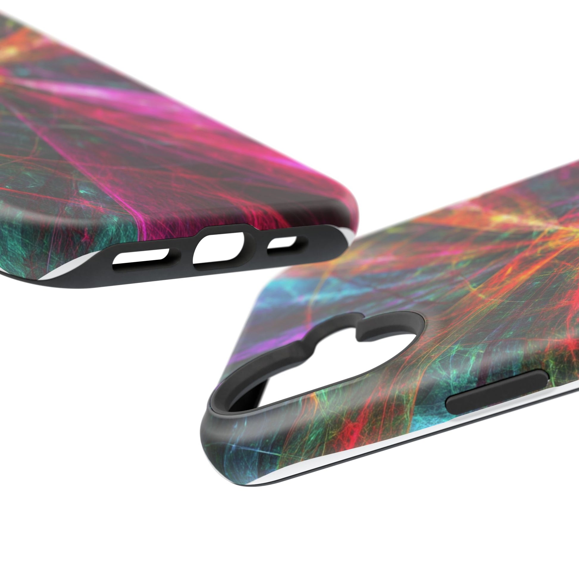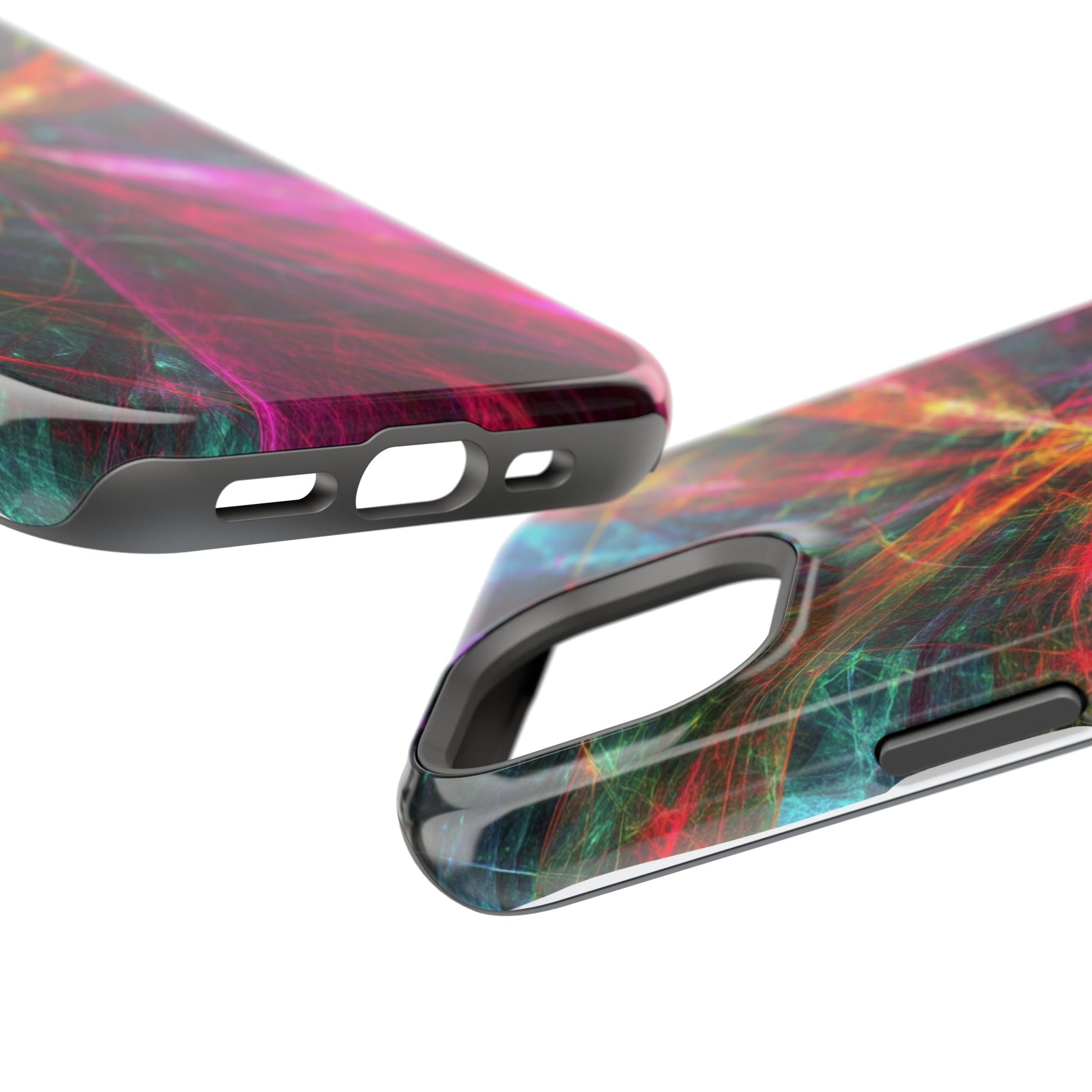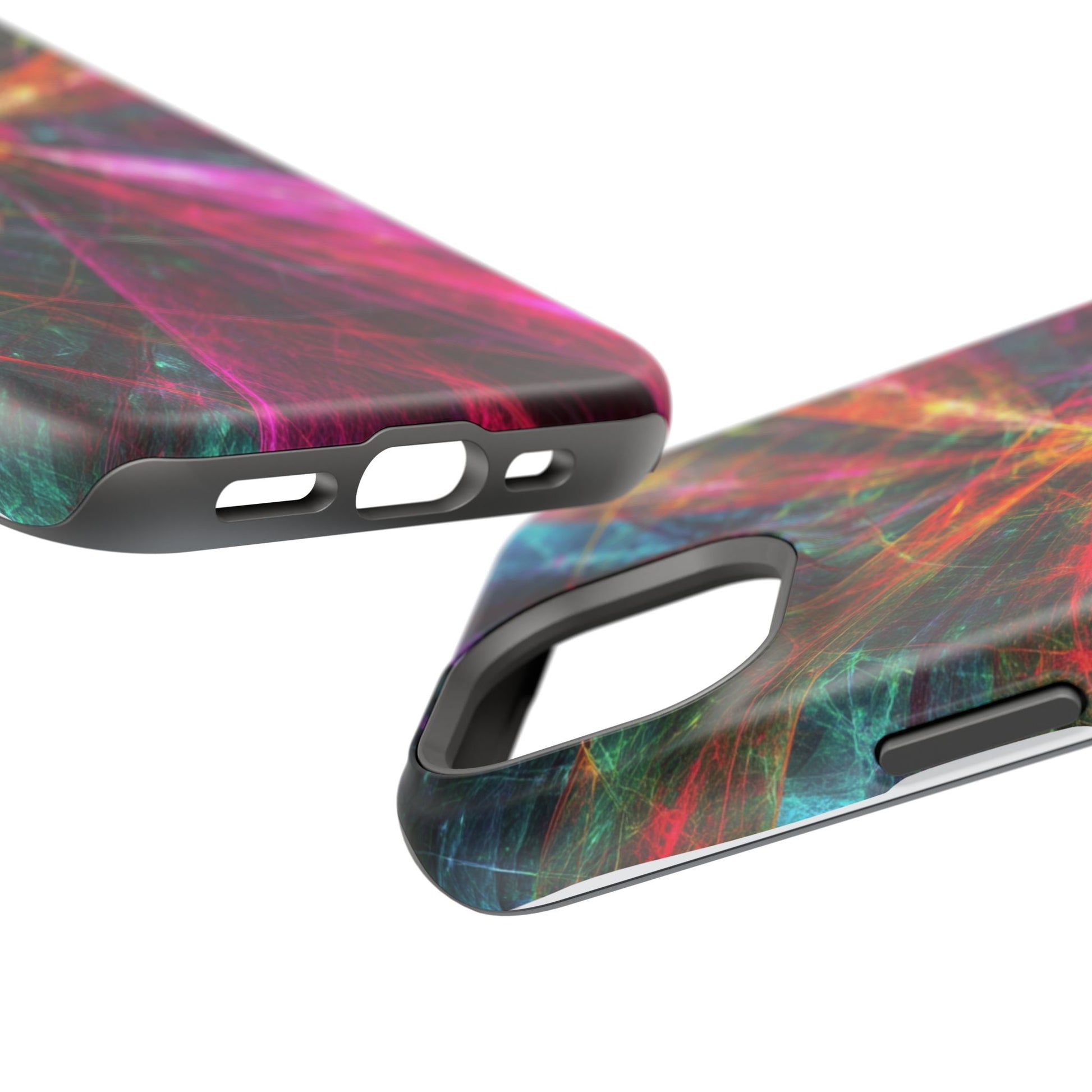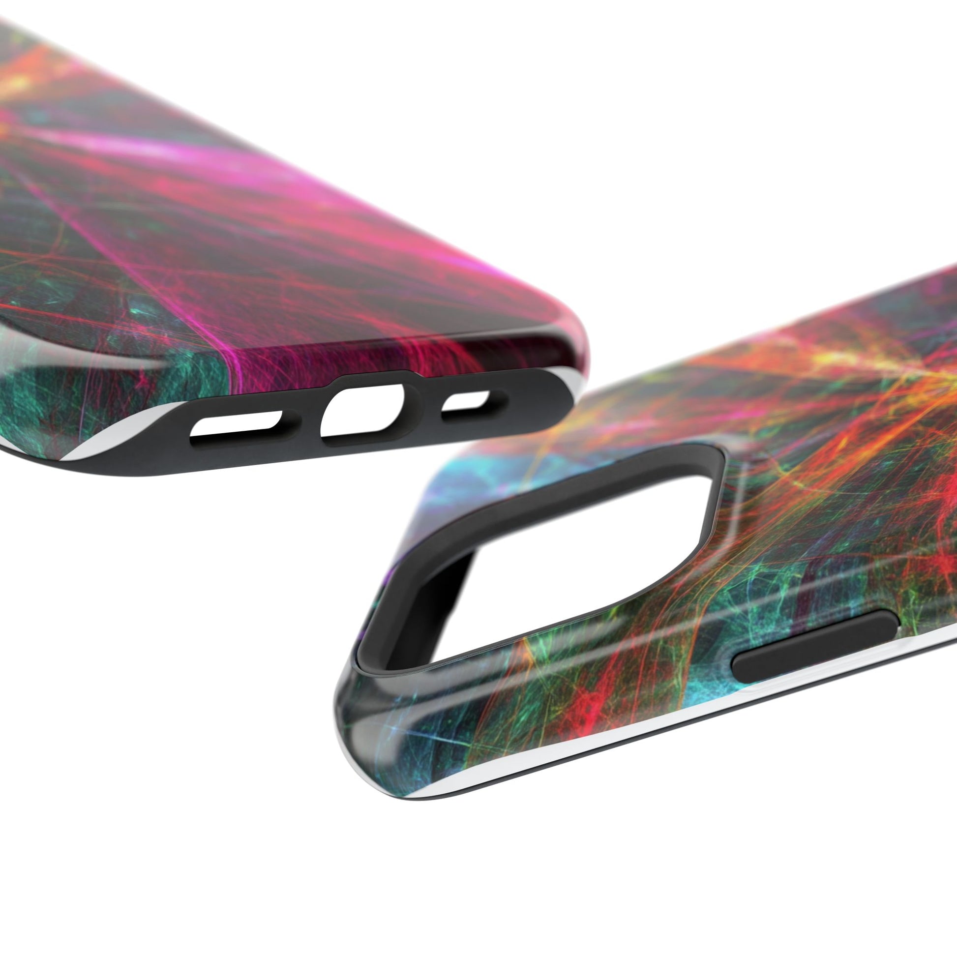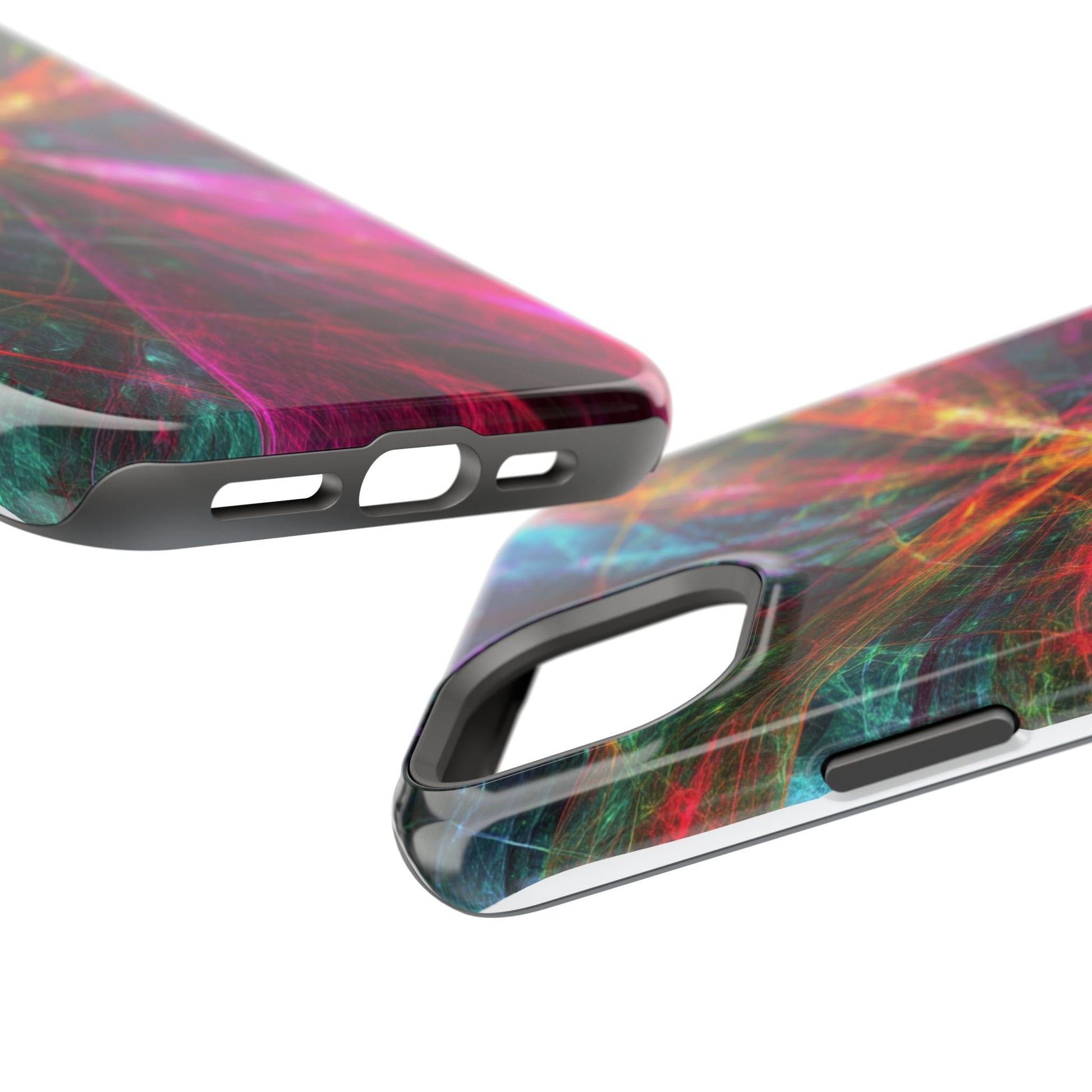 Elevate your phone protection with the Luxurious Magnetic Wireless Charging Tough iPhone Case, featuring a mesmerizing art piece by Moxie-Jay. The design showcases a vibrant starburst of trippy energy beams of light, paired with an additional artwork of a hand scratching a bright red record for a unique, artistic touch. This durable case combines style and functionality, offering: