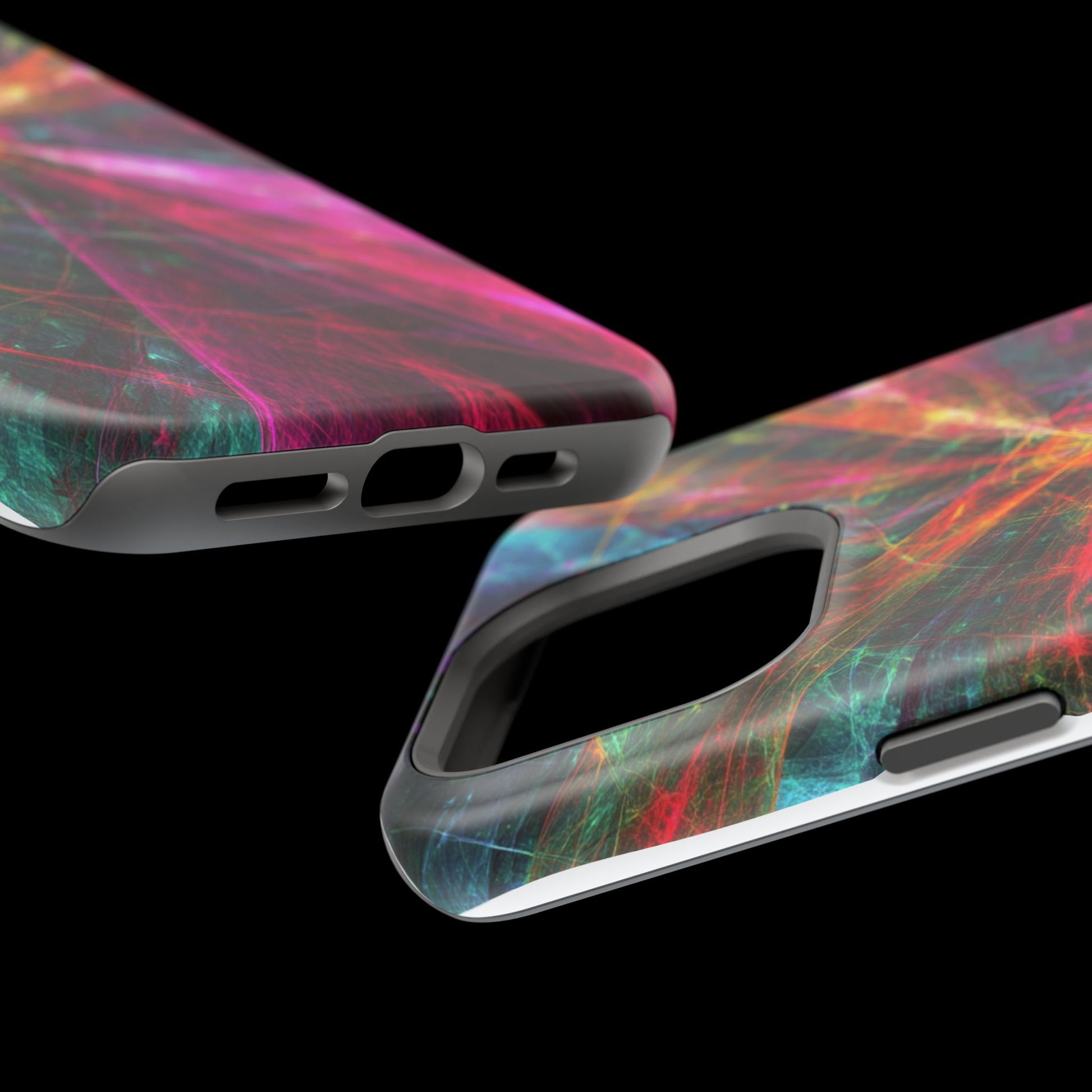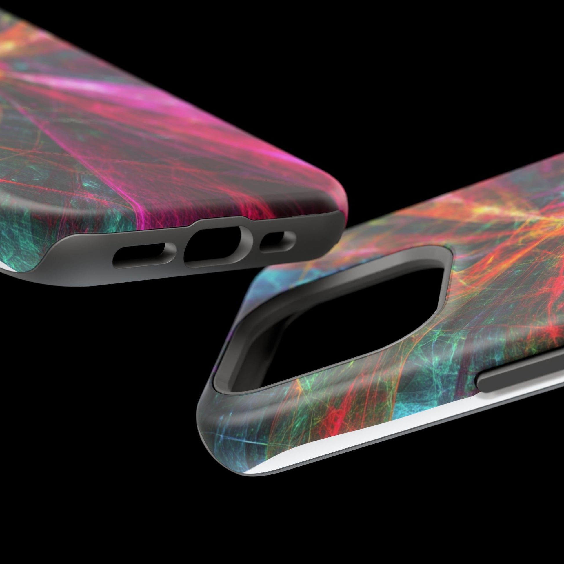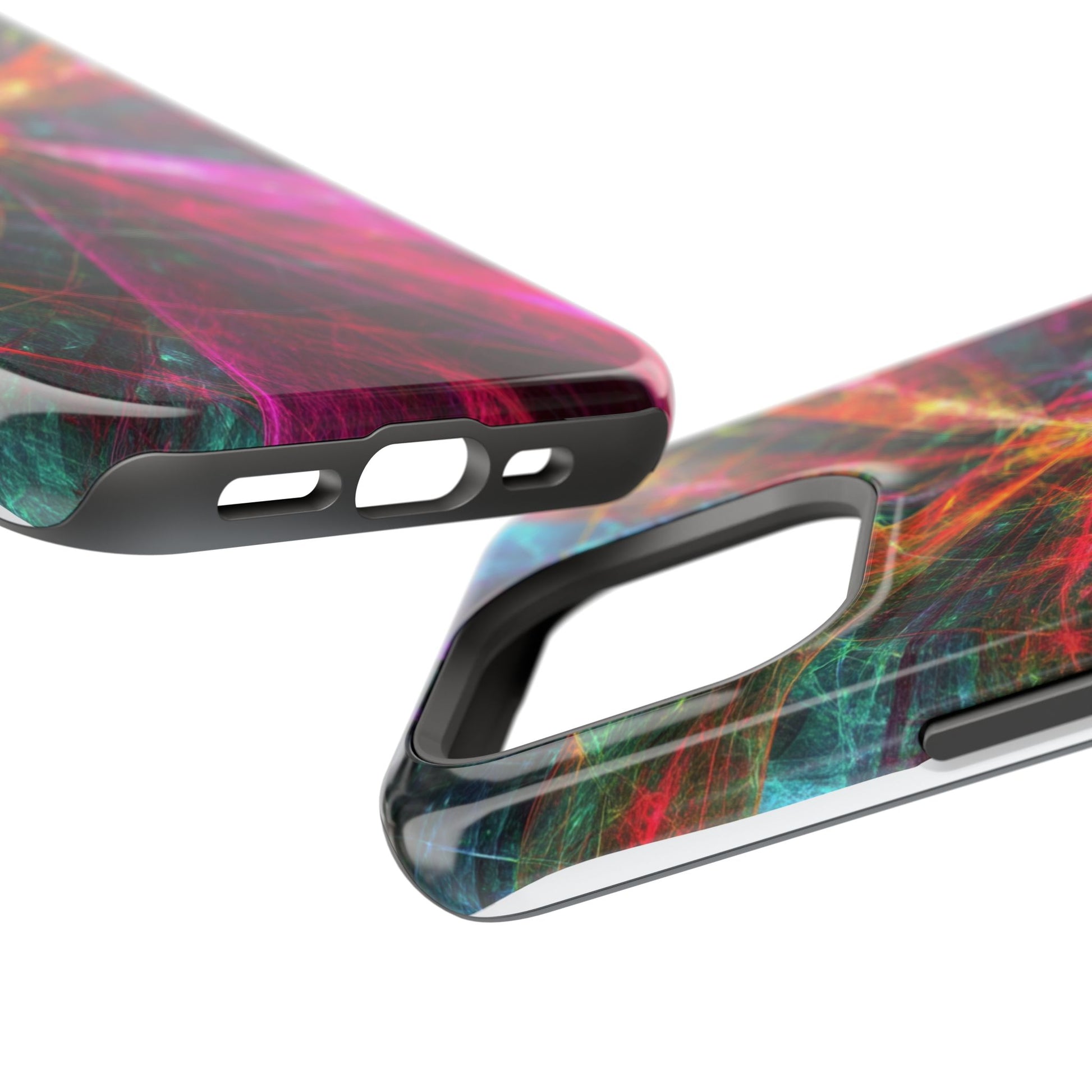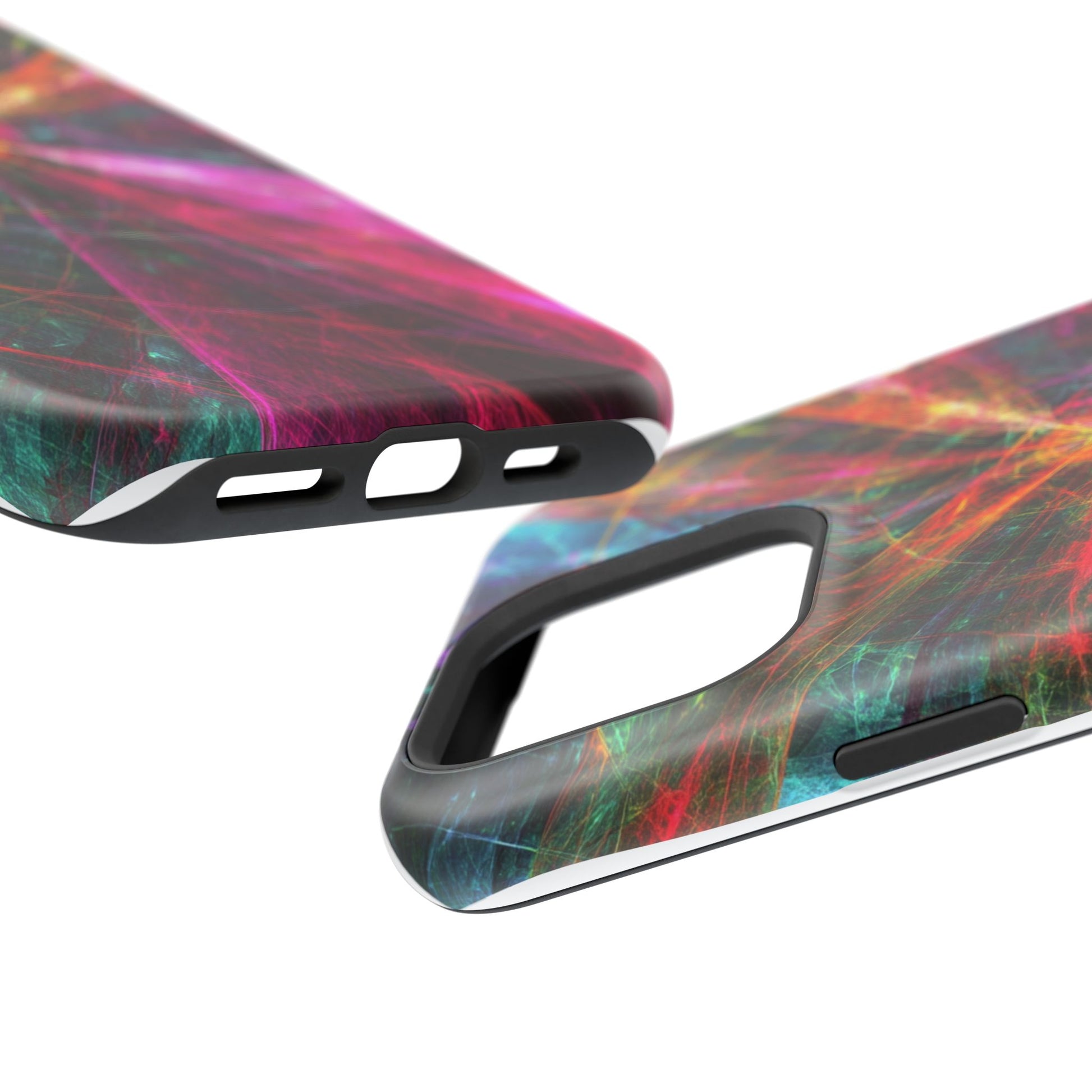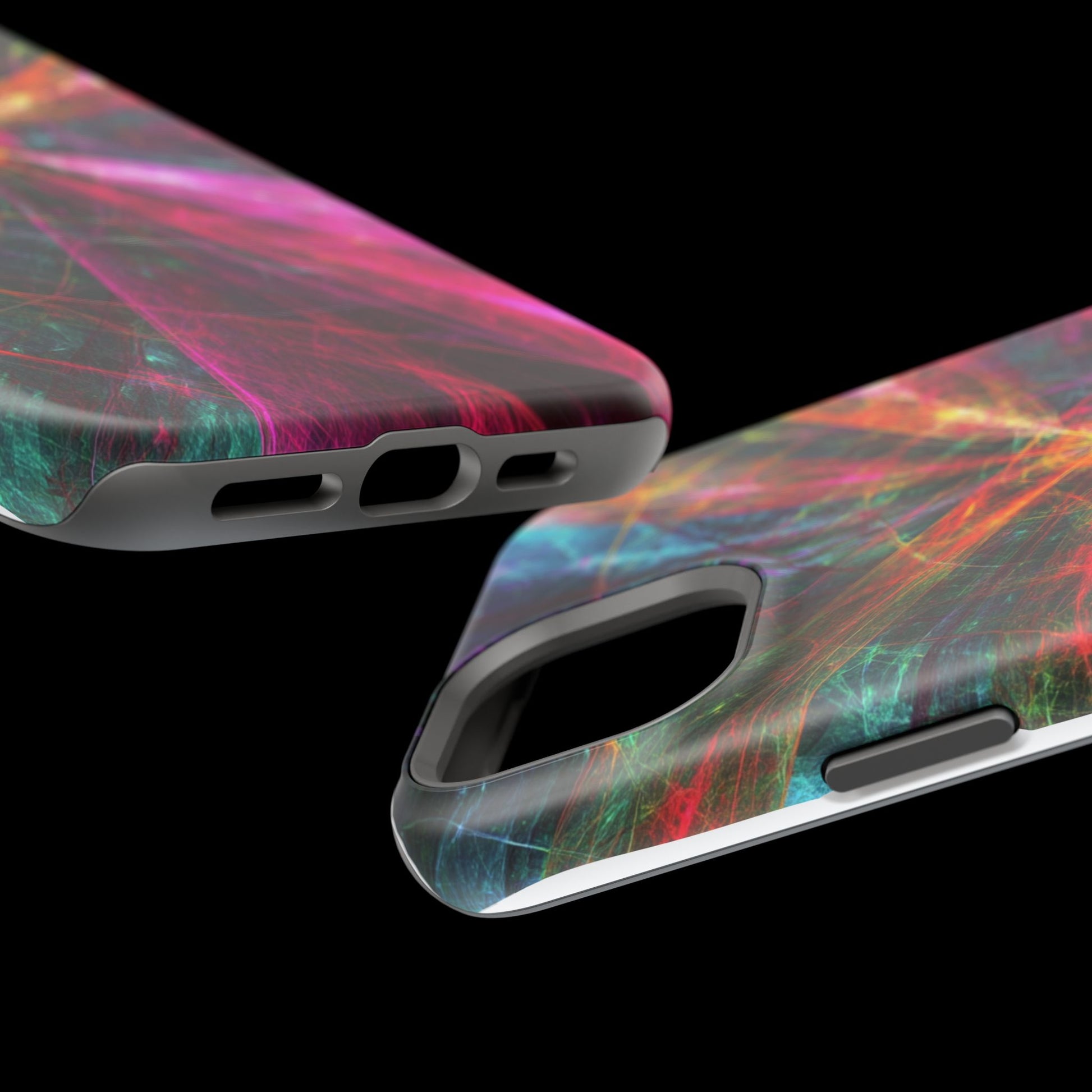 Elevate your phone protection with the Luxurious Magnetic Wireless Charging Tough iPhone Case, featuring a mesmerizing art piece by Moxie-Jay. The design showcases a vibrant starburst of trippy energy beams of light, paired with an additional artwork of a hand scratching a bright red record for a unique, artistic touch. This durable case combines style and functionality, offering: