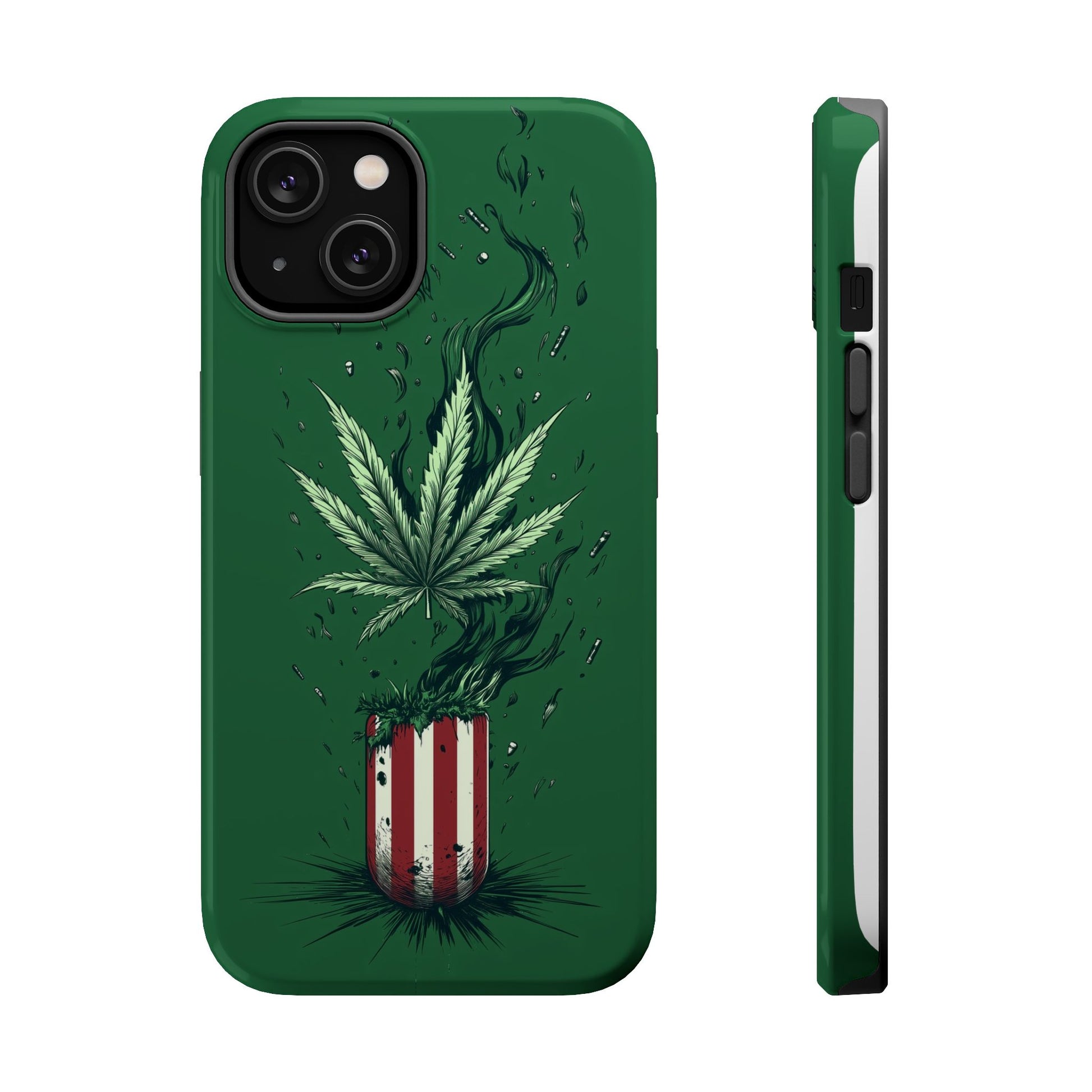 A tough magnetic phone case for wireless charging iPhones, featuring original artwork of a bomb draped in American colors with a marijuana leaf riding its back. Provides durable protection against scratches and minor bumps, with vibrant colors and a glossy or matte finish. Perfect for those looking for a unique and edgy phone case that is MagSafe® Compatible. Ideal for individuals who appreciate bold and unconventional designs. Relevant for celebrations like 4th of July and 420.