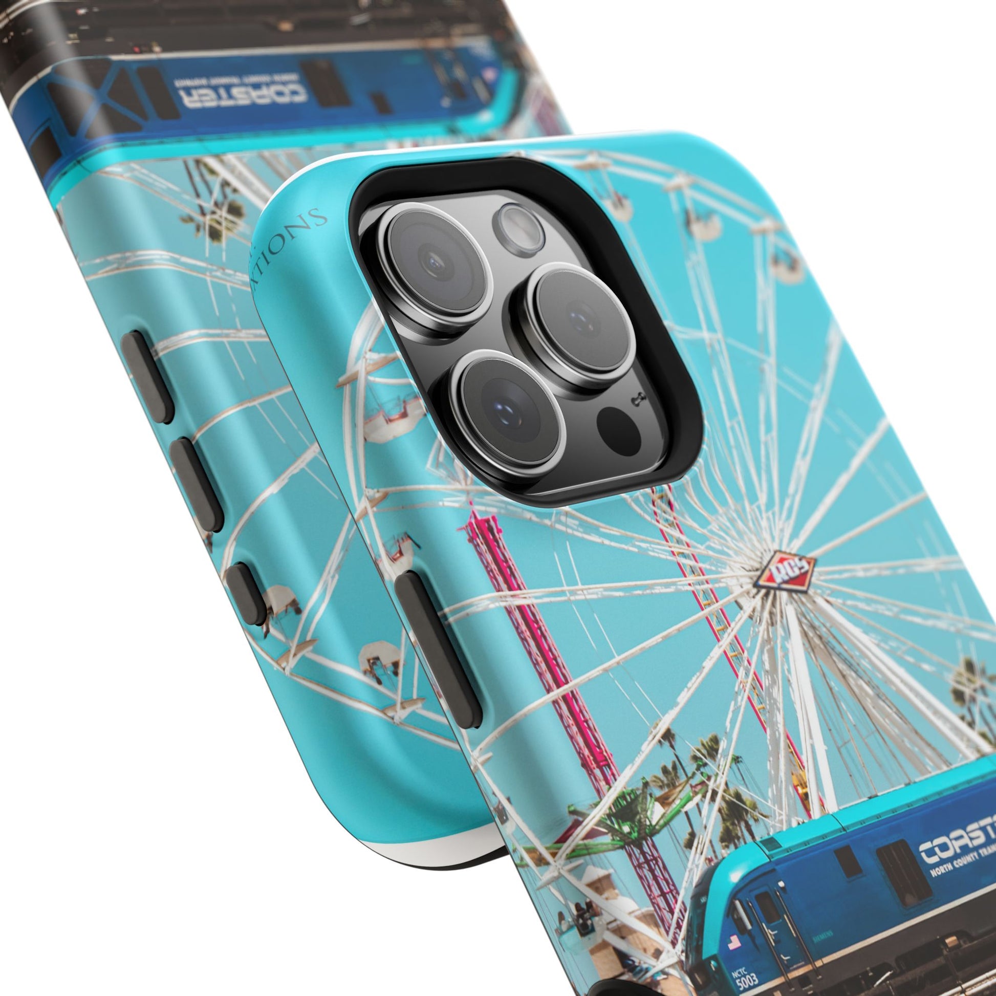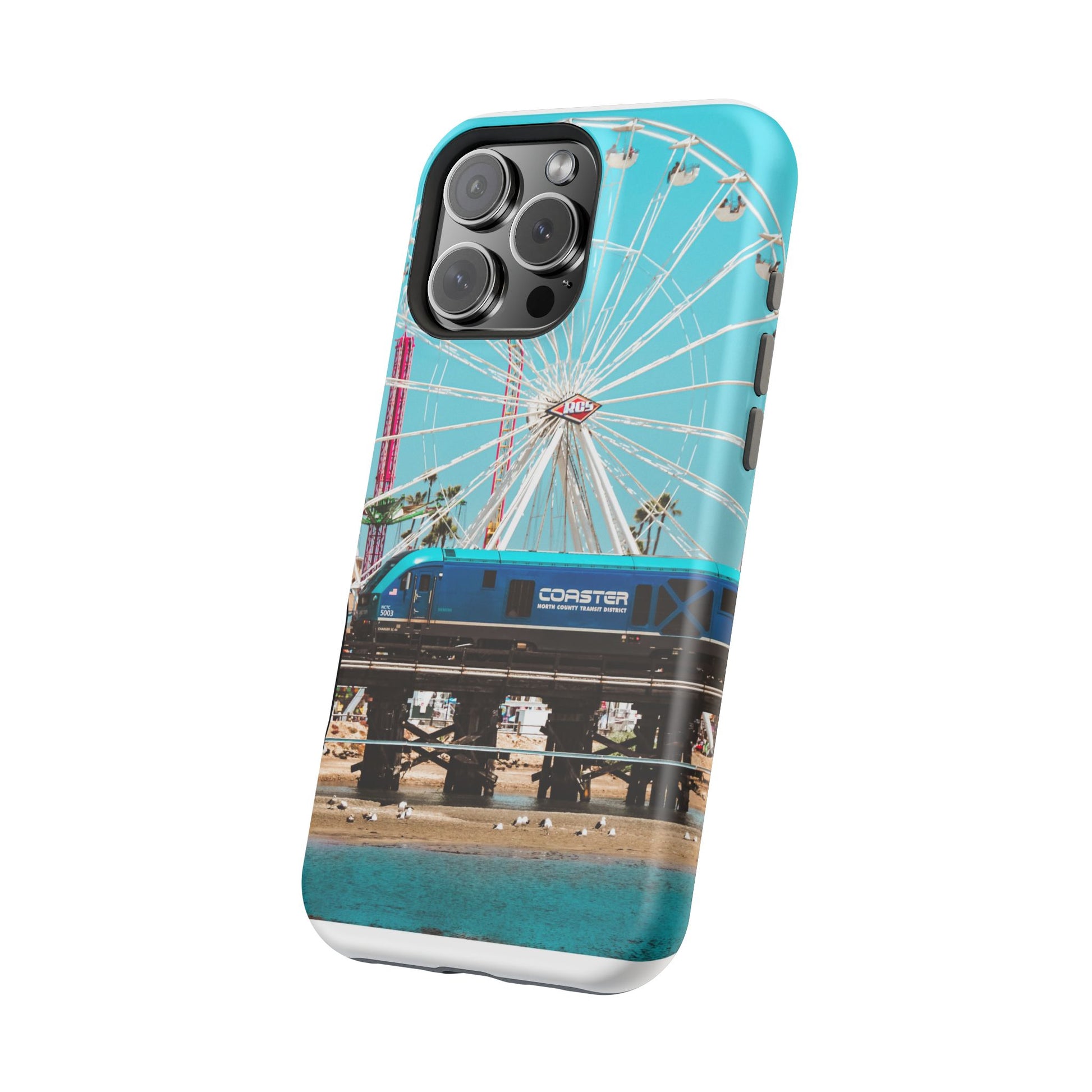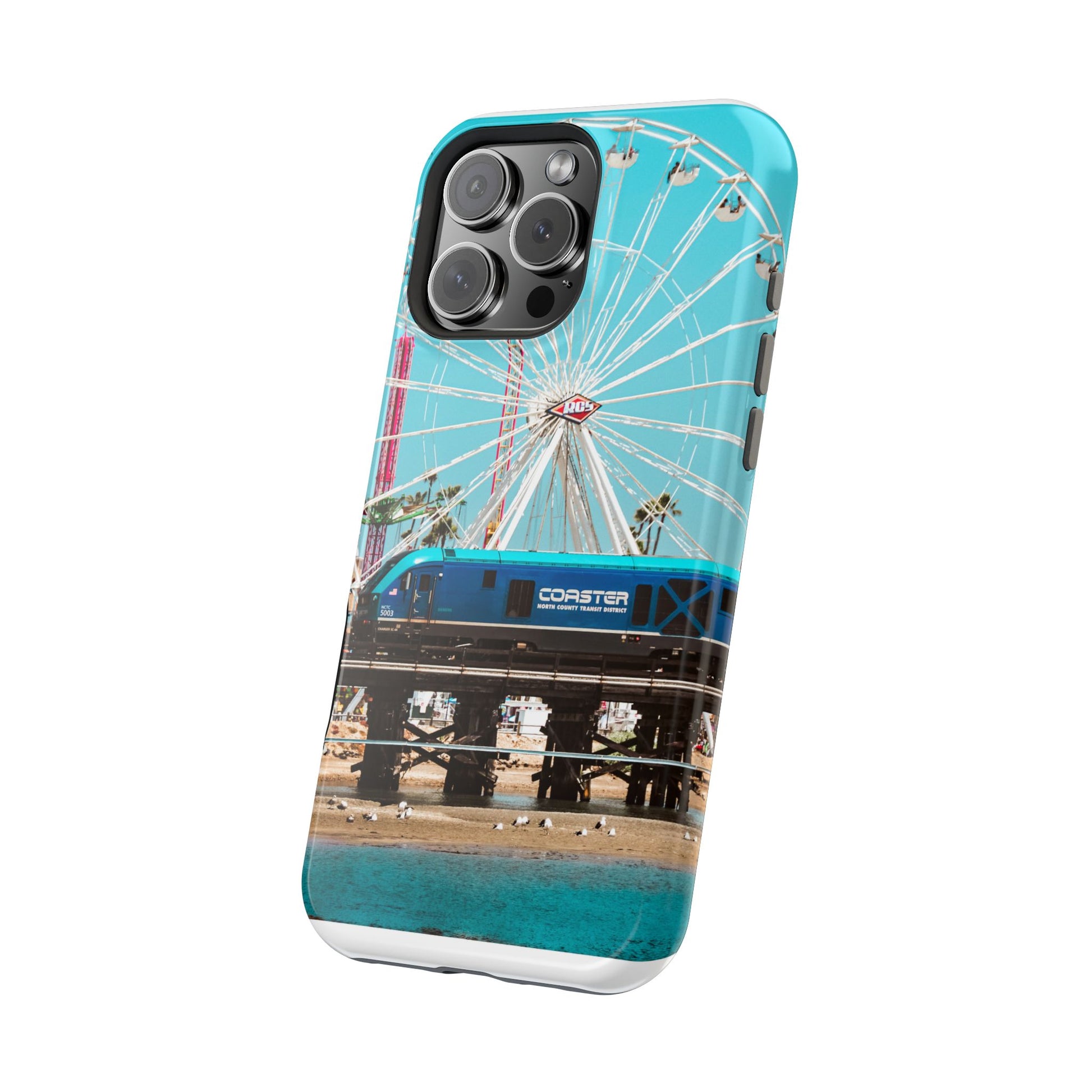 A luxurious Magnetic wireless charging Phone Case featuring an art piece by moxie-jay. The photograph captures the Coastline Coaster train passing by the carnival at the Del Mar fairgrounds, creating a vibrant and eye-catching design. Perfect for those who appreciate unique and artistic phone accessories. Relevant for holidays, celebrations, and occasions where a touch of creativity is desired.