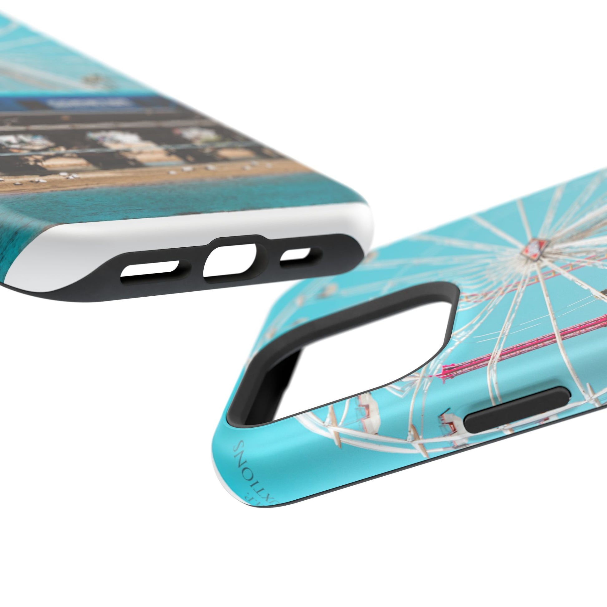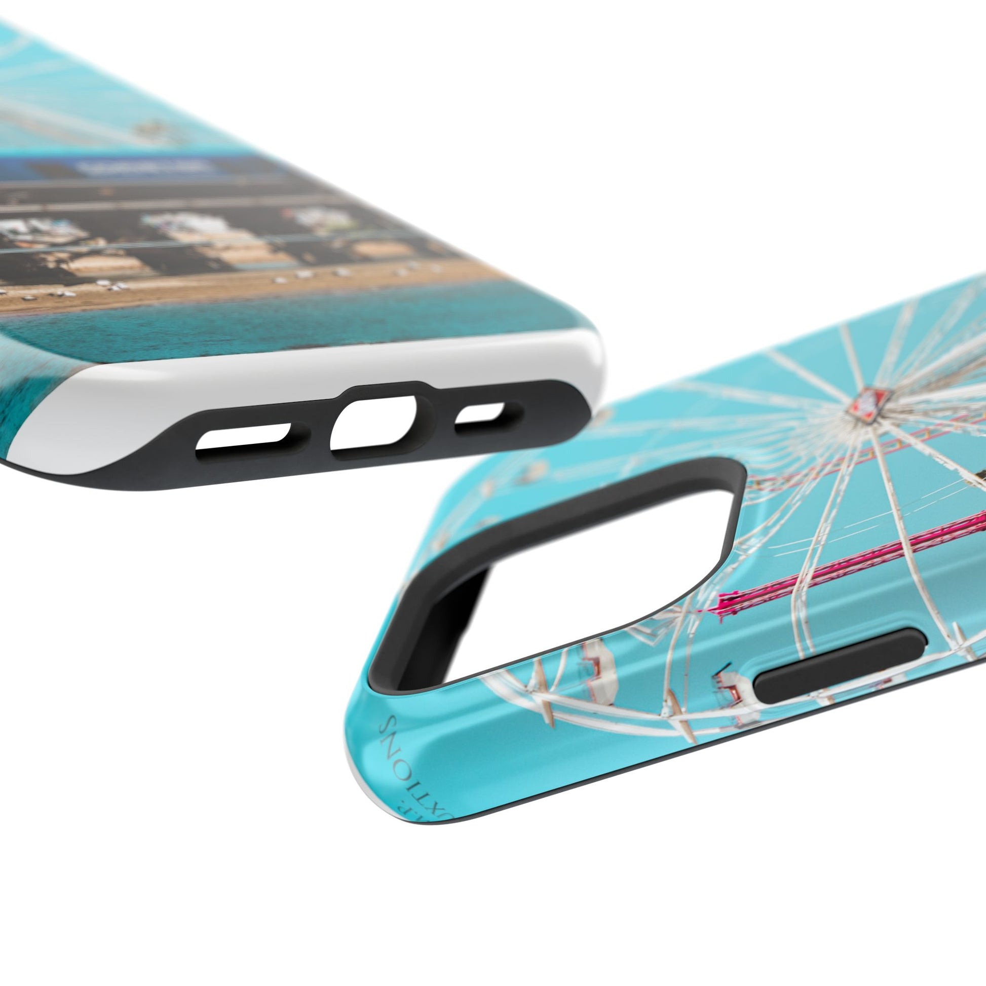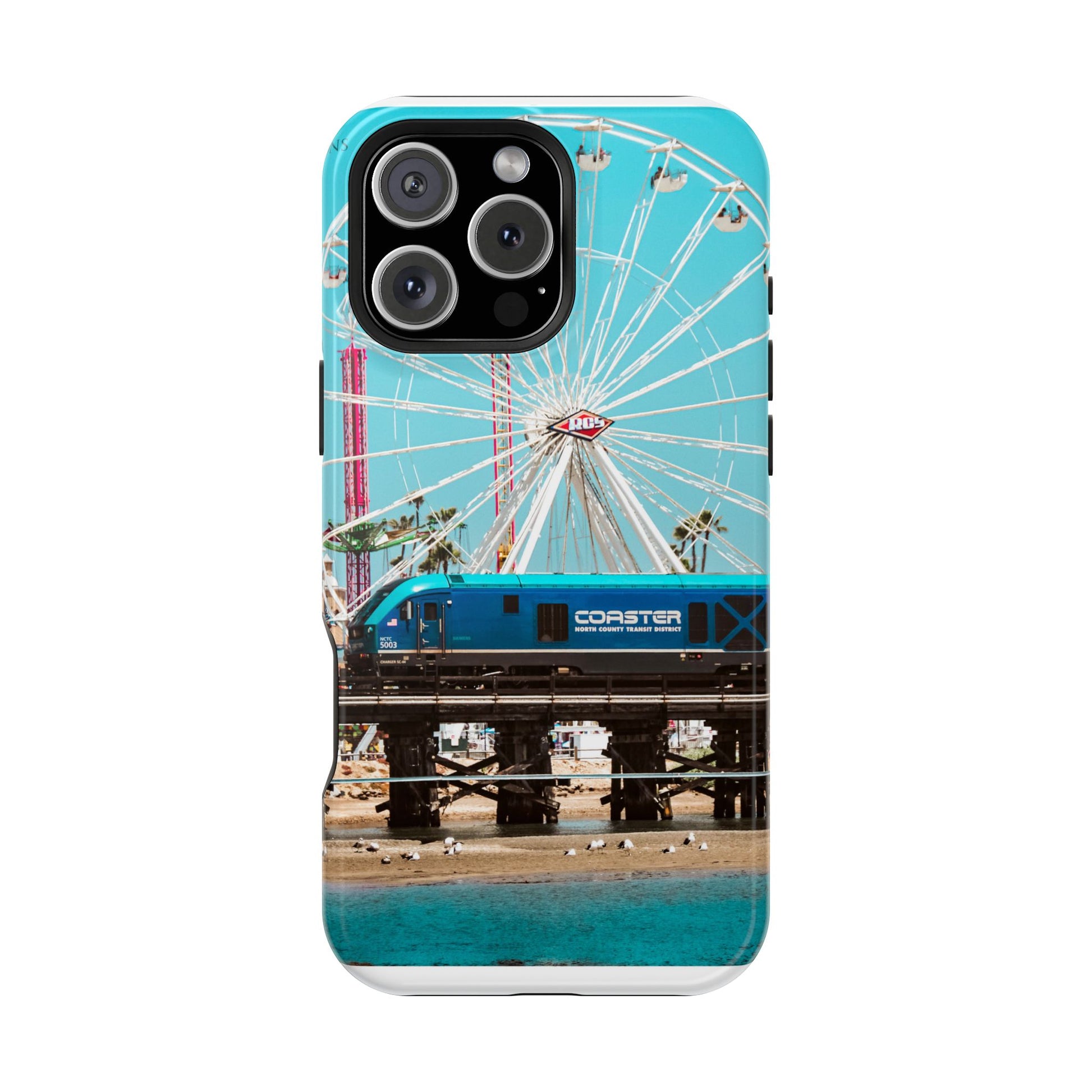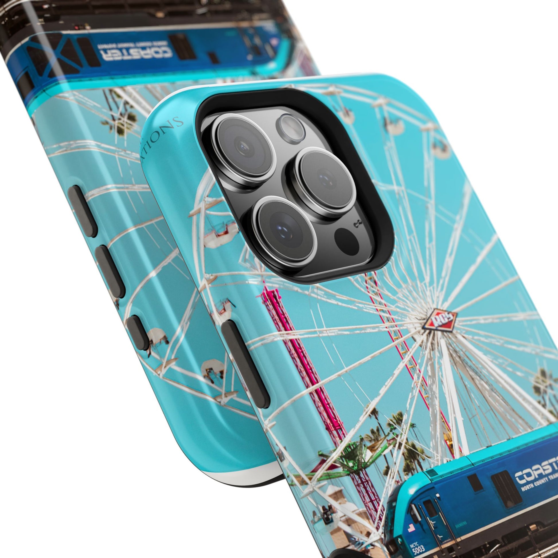 A luxurious Magnetic wireless charging Phone Case featuring an art piece by moxie-jay. The photograph captures the Coastline Coaster train passing by the carnival at the Del Mar fairgrounds, creating a vibrant and eye-catching design. Perfect for those who appreciate unique and artistic phone accessories. Relevant for holidays, celebrations, and occasions where a touch of creativity is desired.