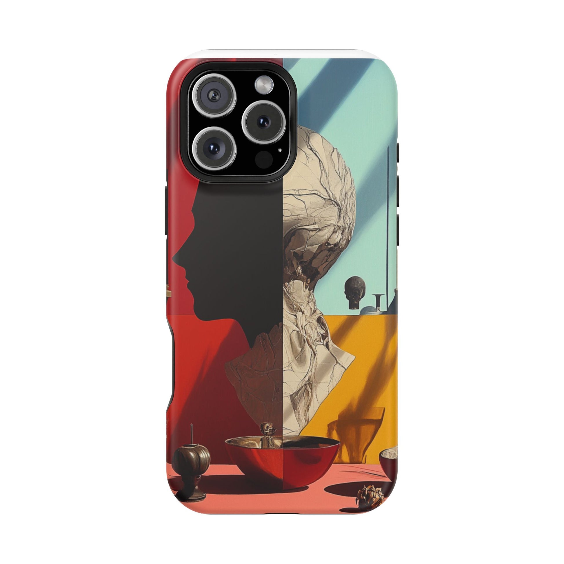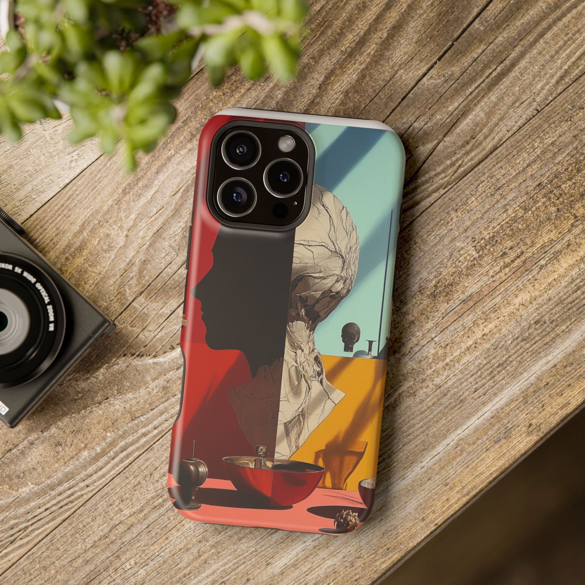 Elevate your iPhone's style with this stunning case featuring Moxie-Jay's captivating artwork "Vintage Silhouette." This luxurious case showcases a unique silhouette of a human head with contrasting colors and various shapes, reminiscent of vintage family photos. The durable polycarbonate construction provides superior protection against scratches and impacts, while the built-in magnets ensure seamless MagSafe® compatibility for effortless wireless charging.Product features: