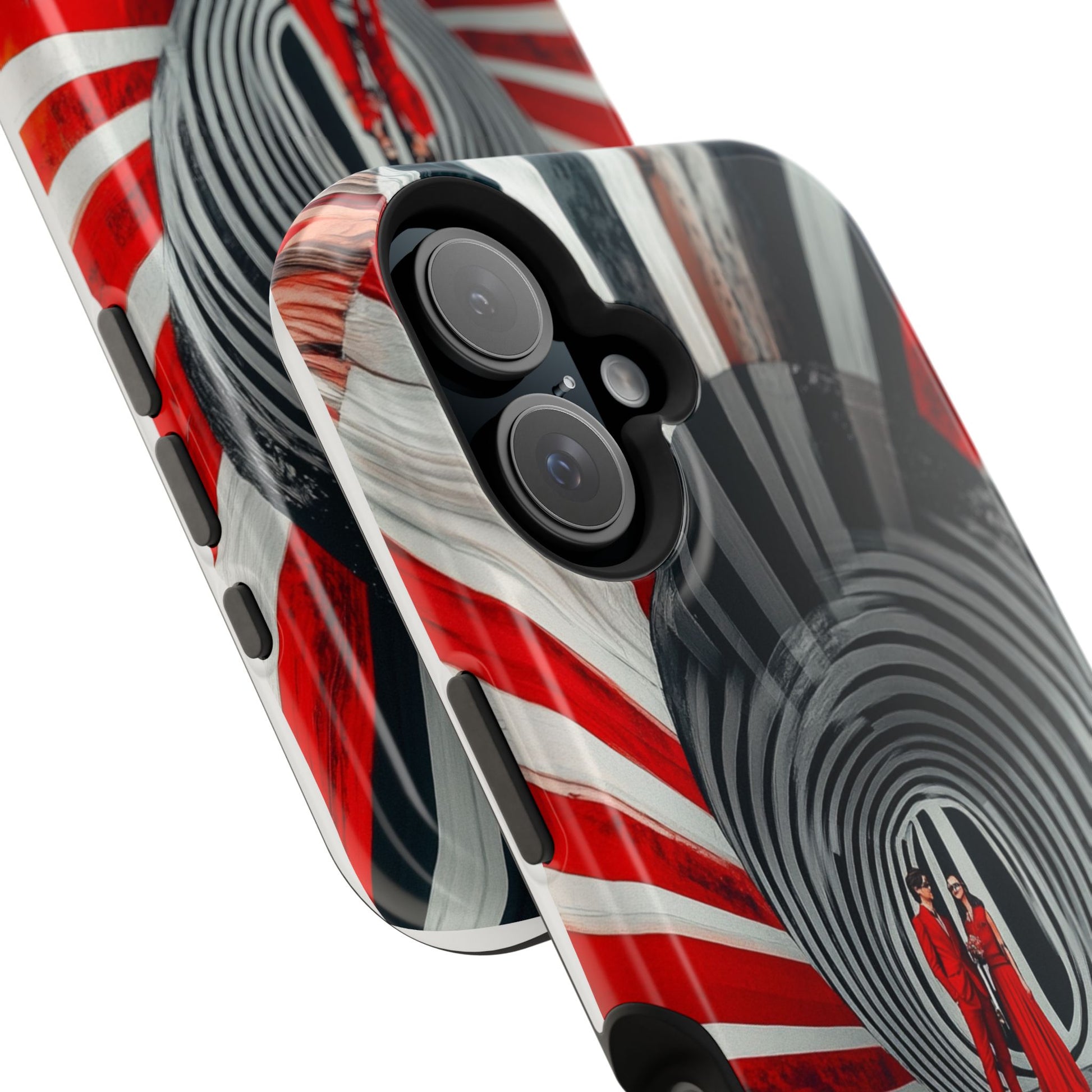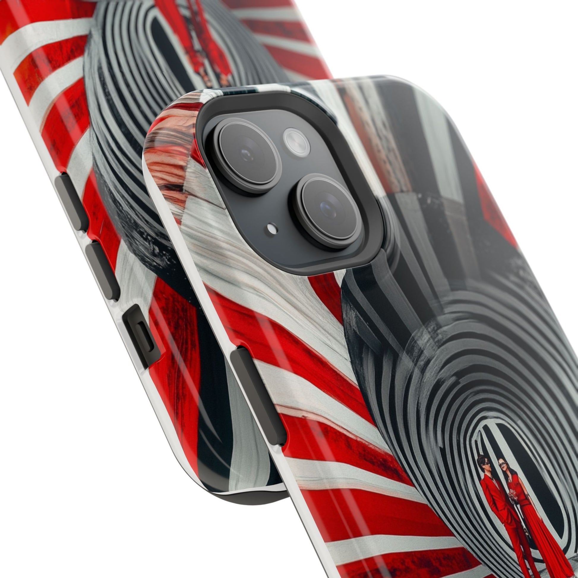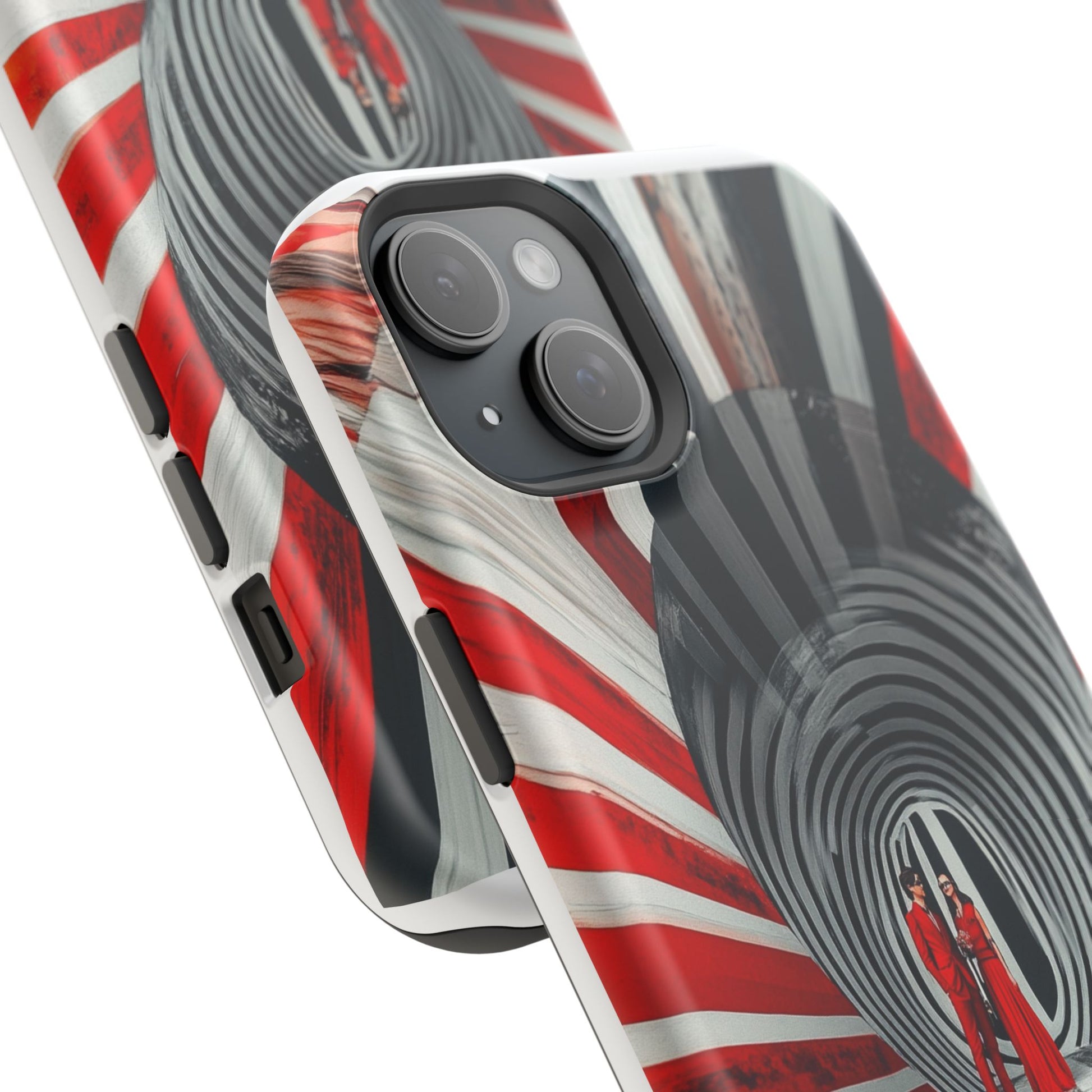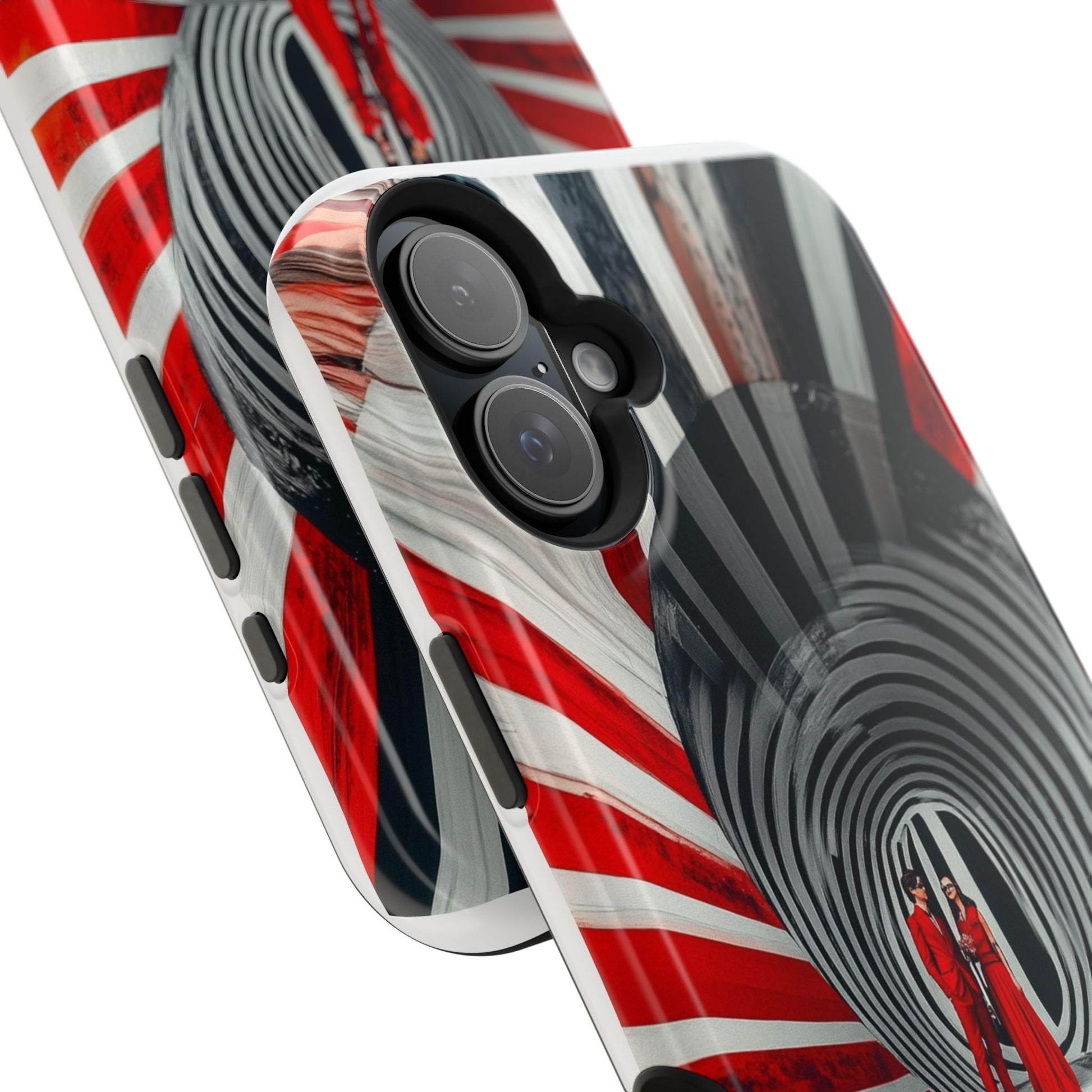 Immerse your iPhone in mesmerizing artistry with our "Cosmic Vortex" case, featuring a captivating piece by Moxie Jay. This luxurious case showcases a warped wormhole in striking black and white with bold red accents, creating a visually stunning and otherworldly effect.A luxurious Magnetic wireless charging Tough iPhone Case featuring a art piece by moxie-jay of a hand scratching a bright red record. This durable polycarbonate case offers extra protection against scratches and minor bumps, with vibrant colors and glossy or matte surface options. The interior magnets make it MagSafe® Compatible for easy charging with MagSafe® accessories.Product features: