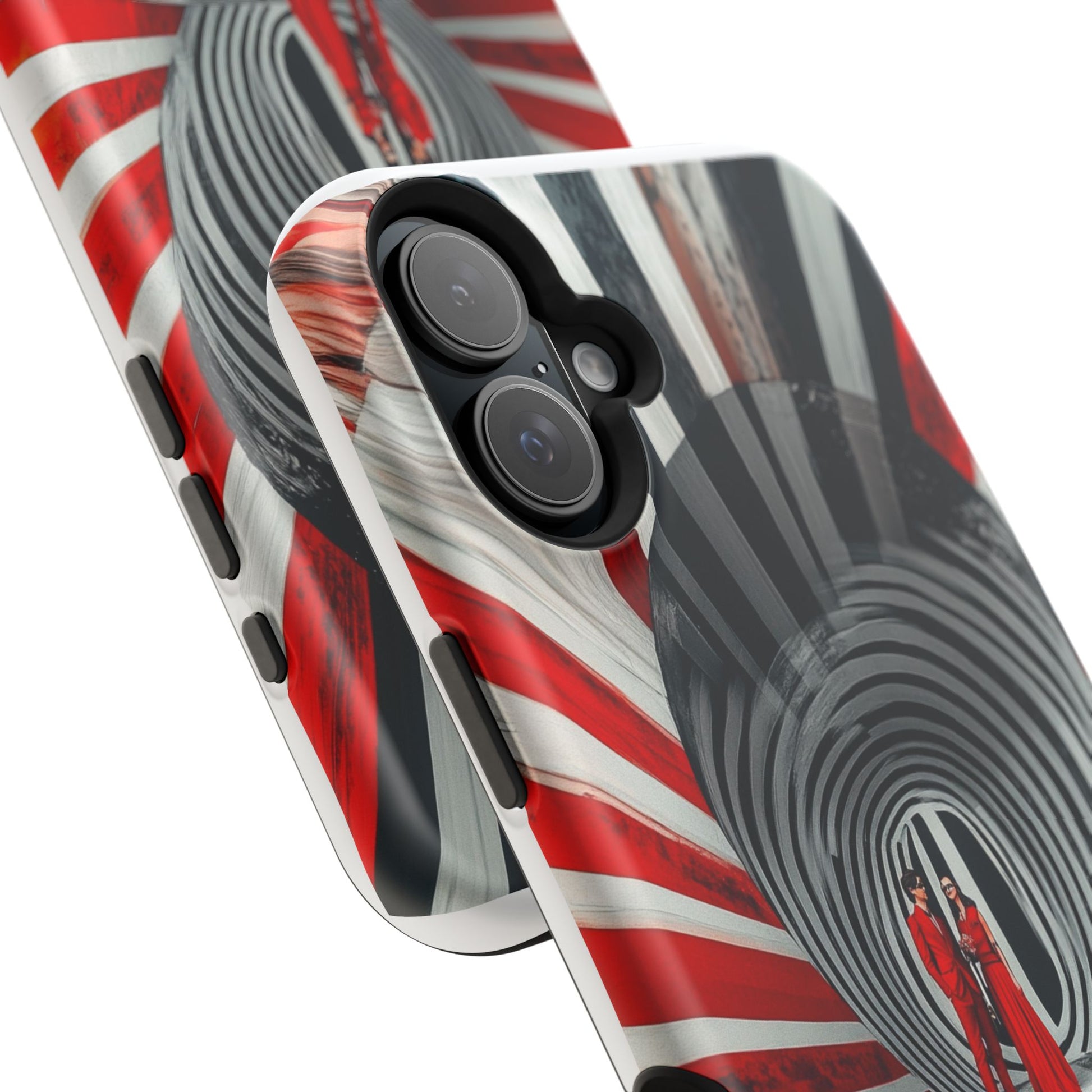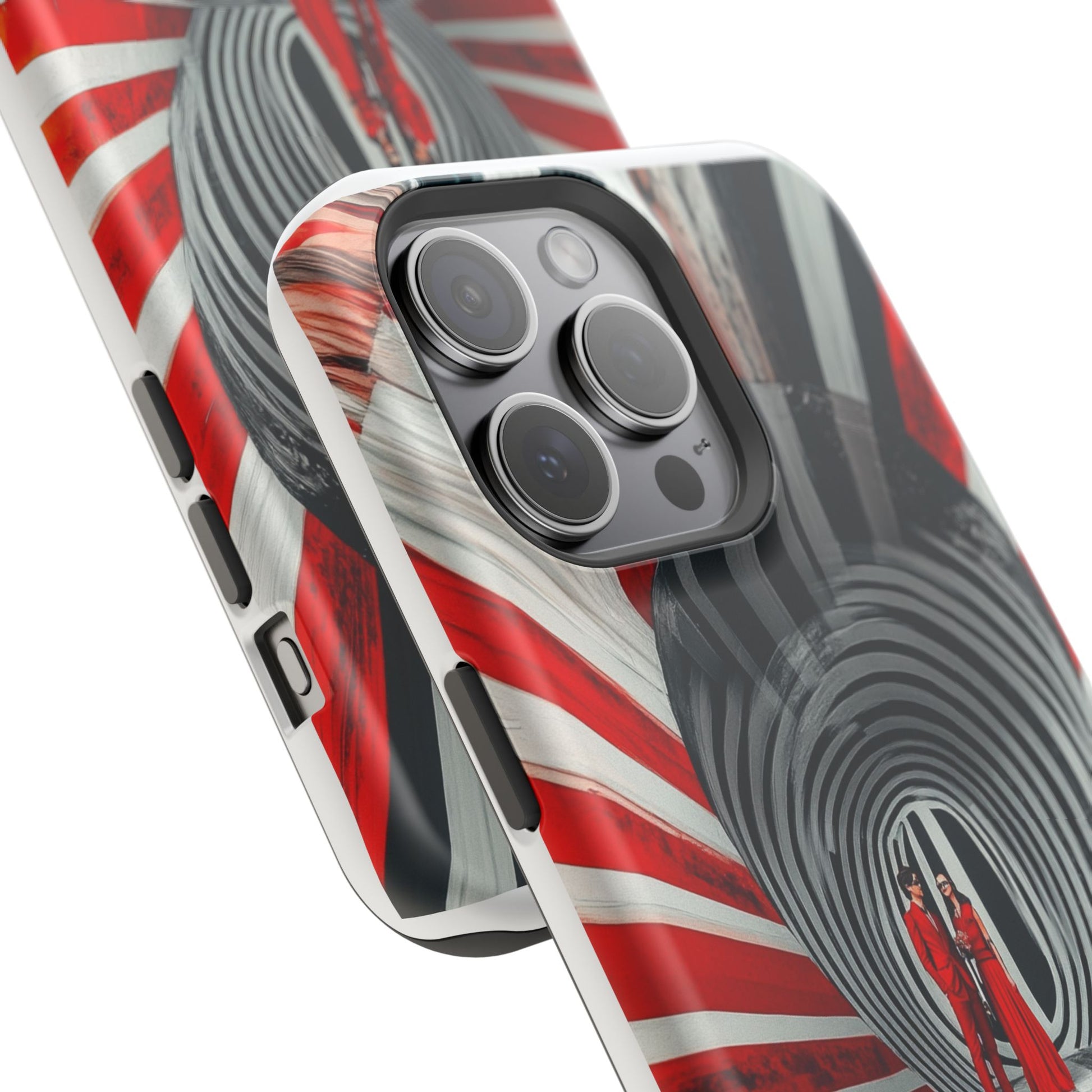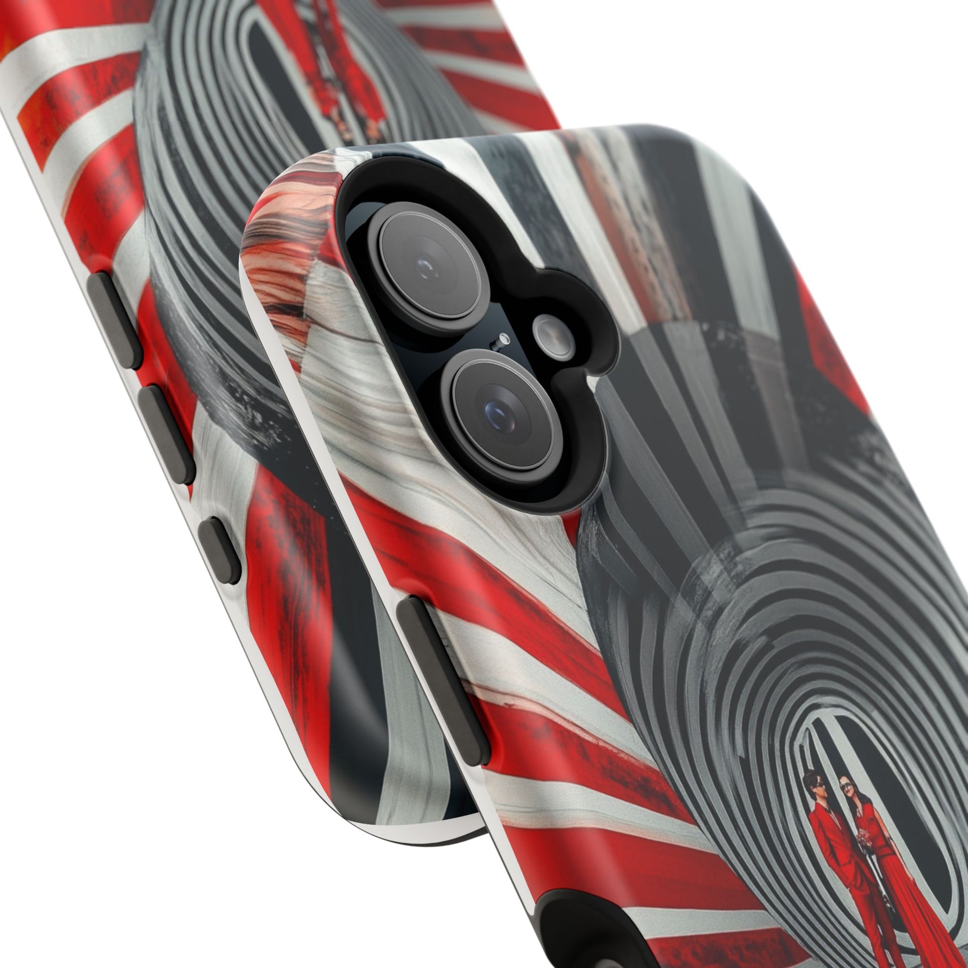 Immerse your iPhone in mesmerizing artistry with our "Cosmic Vortex" case, featuring a captivating piece by Moxie Jay. This luxurious case showcases a warped wormhole in striking black and white with bold red accents, creating a visually stunning and otherworldly effect.A luxurious Magnetic wireless charging Tough iPhone Case featuring a art piece by moxie-jay of a hand scratching a bright red record. This durable polycarbonate case offers extra protection against scratches and minor bumps, with vibrant colors and glossy or matte surface options. The interior magnets make it MagSafe® Compatible for easy charging with MagSafe® accessories.Product features: