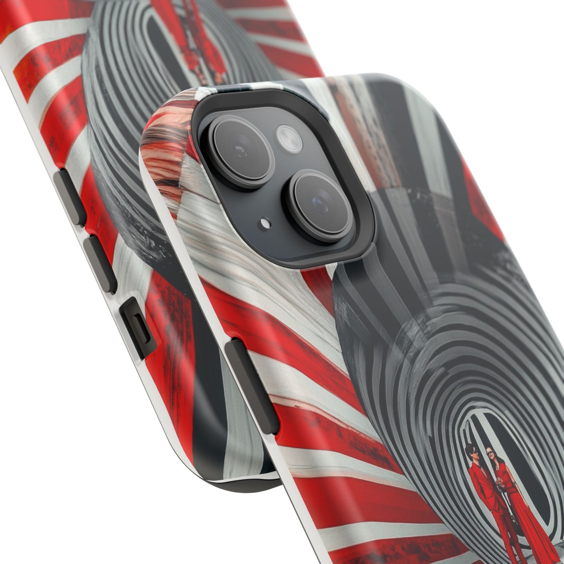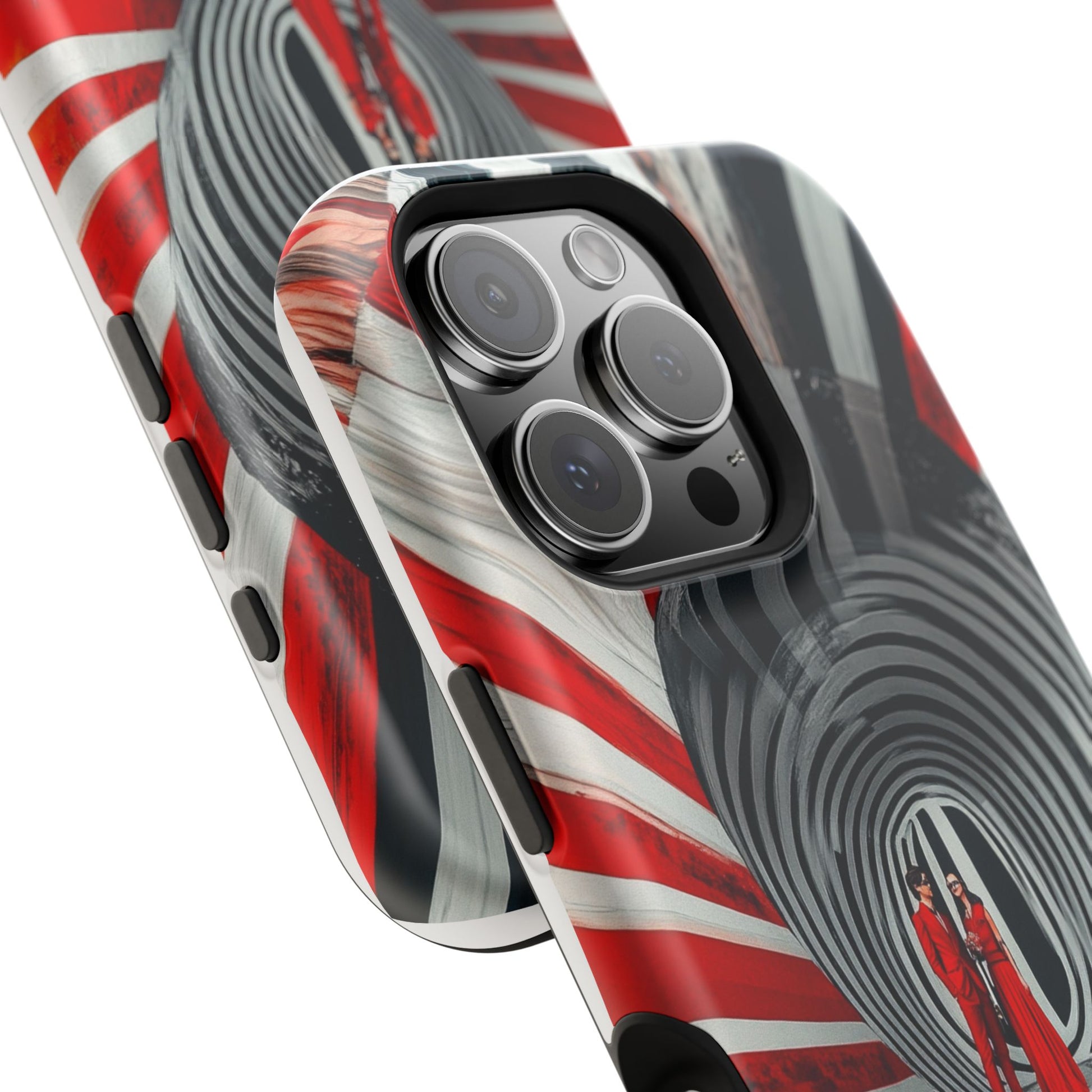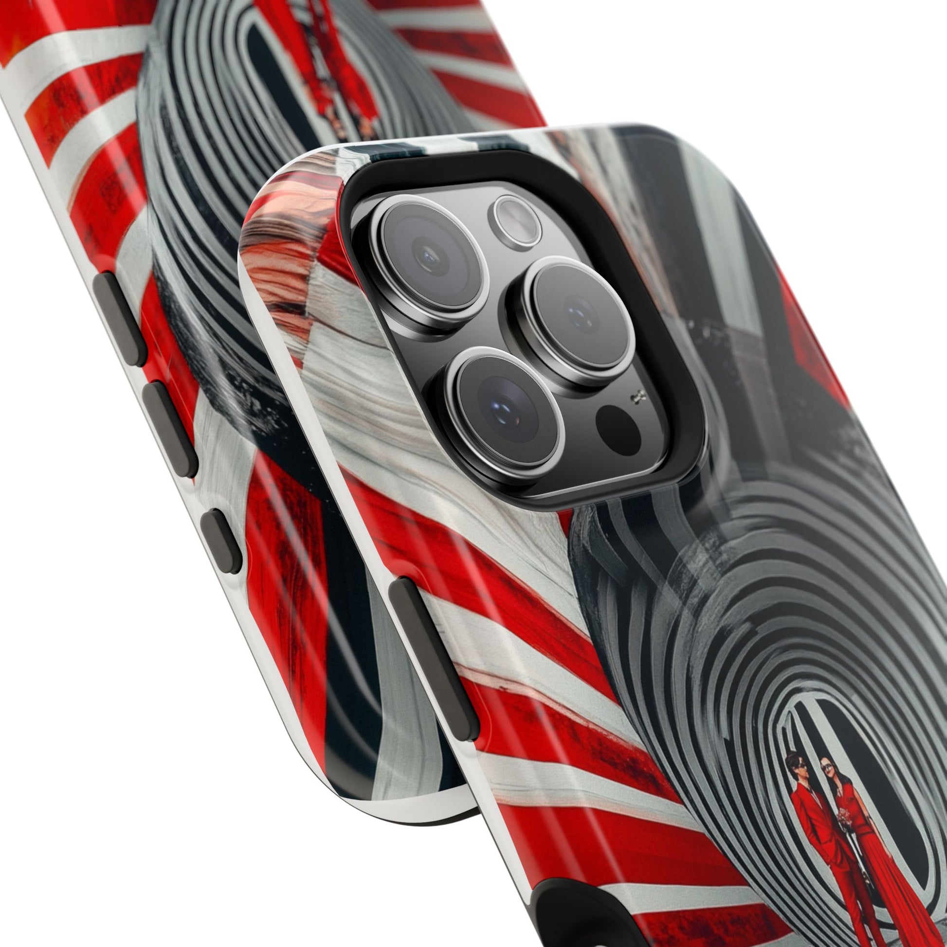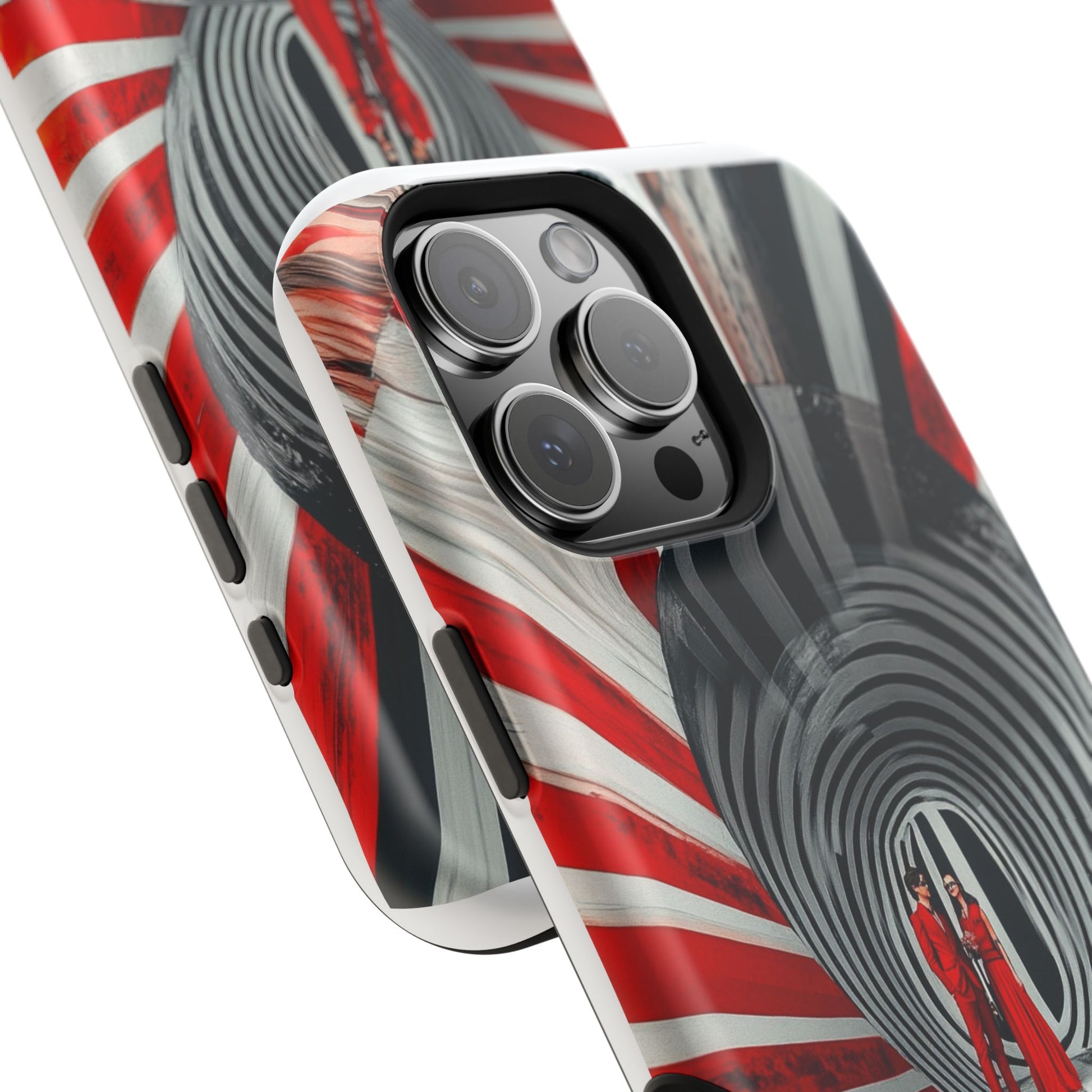 Immerse your iPhone in mesmerizing artistry with our "Cosmic Vortex" case, featuring a captivating piece by Moxie Jay. This luxurious case showcases a warped wormhole in striking black and white with bold red accents, creating a visually stunning and otherworldly effect.A luxurious Magnetic wireless charging Tough iPhone Case featuring a art piece by moxie-jay of a hand scratching a bright red record. This durable polycarbonate case offers extra protection against scratches and minor bumps, with vibrant colors and glossy or matte surface options. The interior magnets make it MagSafe® Compatible for easy charging with MagSafe® accessories.Product features:
