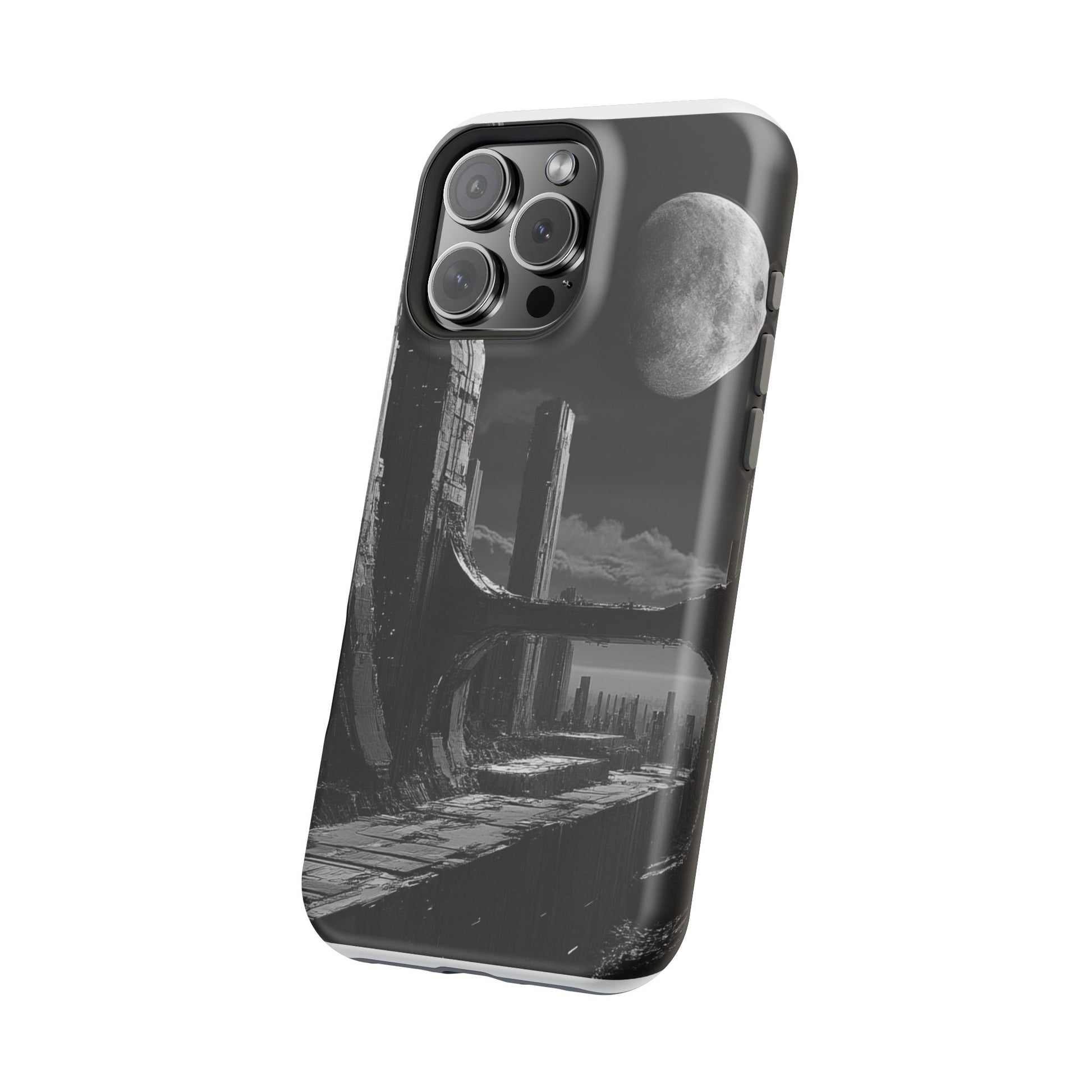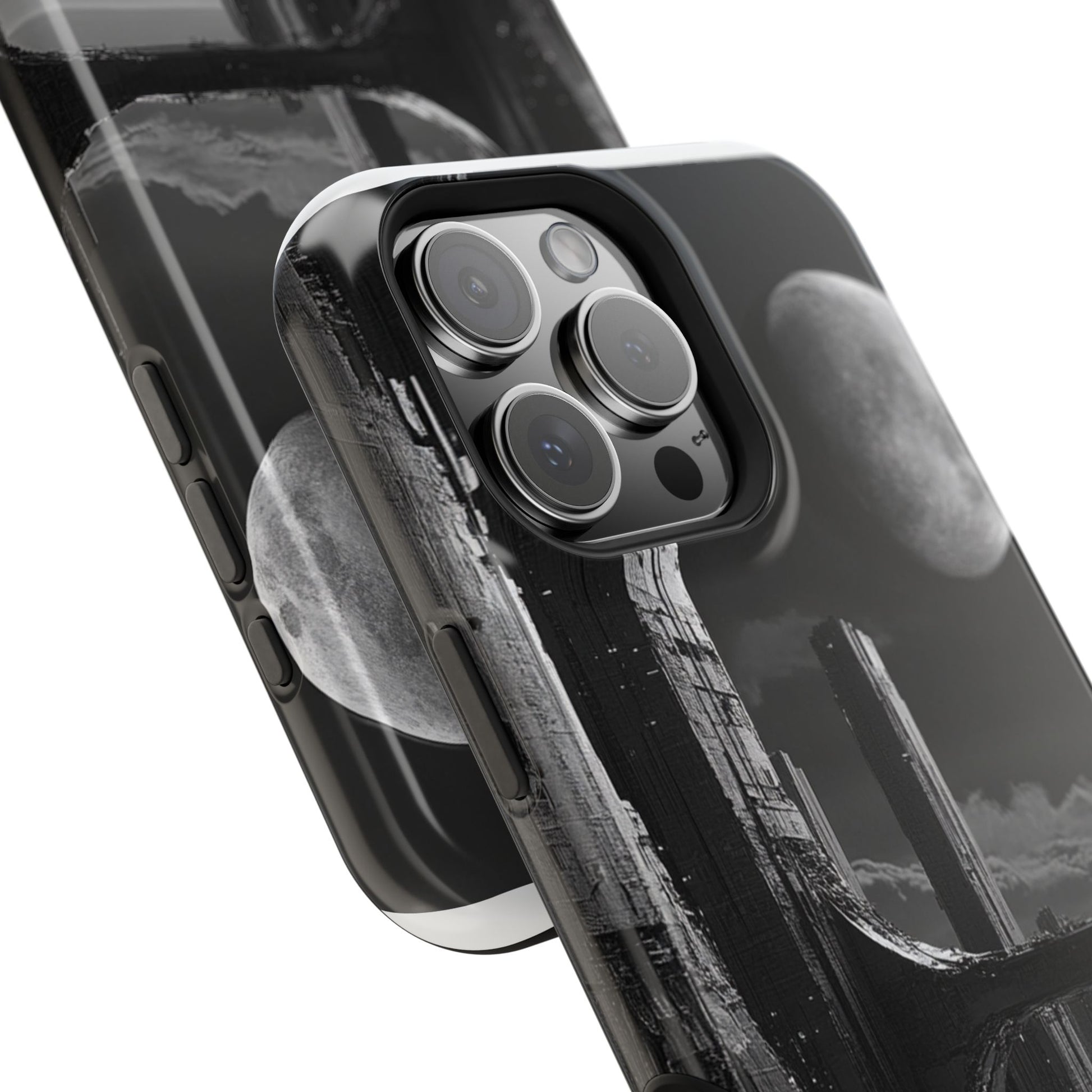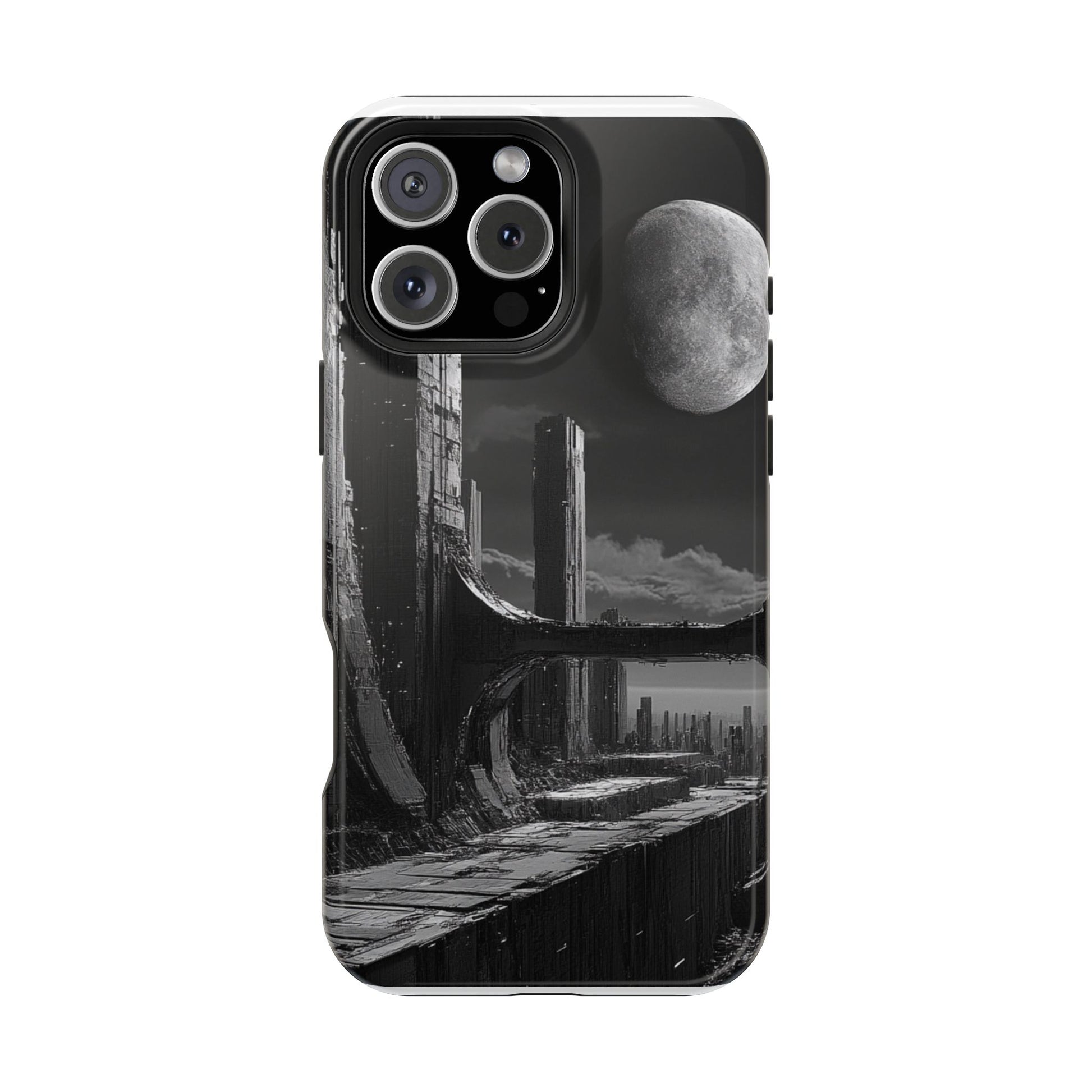 Elevate your iPhone with our luxurious Magnetic wireless charging Tough iPhone Case, featuring a captivating art piece by Moxie-Jay. This case showcases a striking black and white scene of a futuristic civilization on an alien planet, with an extra-large moon looming in the sky. The durable polycarbonate construction offers superior protection against scratches and minor impacts, while the interior magnets ensure MagSafe® compatibility for effortless charging14.Our case combines style and functionality with its vibrant 300+ DPI photo-realistic print quality, available in glossy or matte finishes. The dual-layer design provides impact resistance and flexibility, ensuring your iPhone stays safe and stylish5.Product Features: