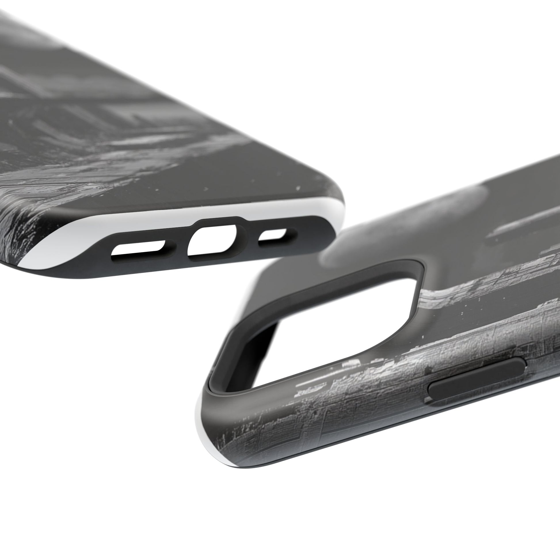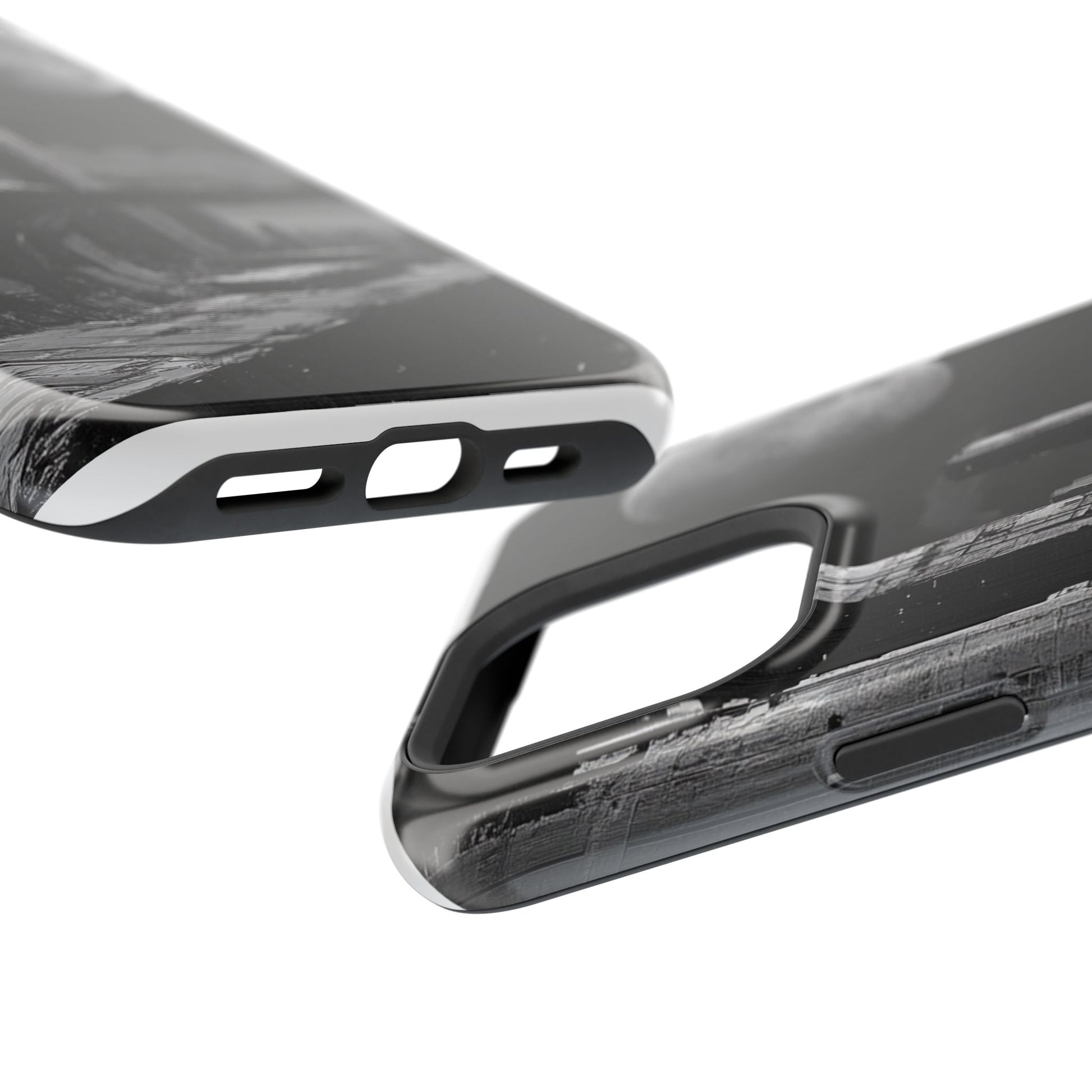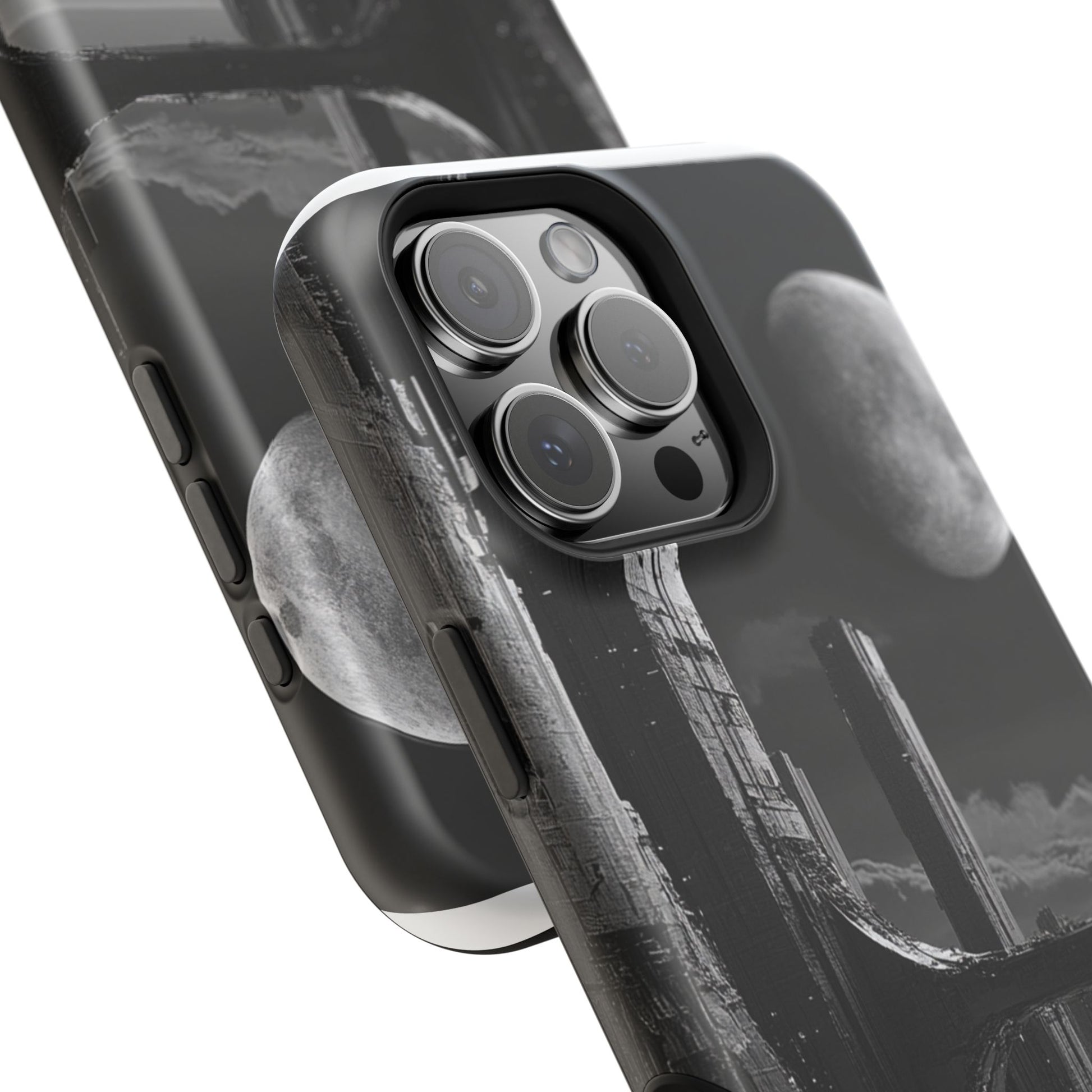 Elevate your iPhone with our luxurious Magnetic wireless charging Tough iPhone Case, featuring a captivating art piece by Moxie-Jay. This case showcases a striking black and white scene of a futuristic civilization on an alien planet, with an extra-large moon looming in the sky. The durable polycarbonate construction offers superior protection against scratches and minor impacts, while the interior magnets ensure MagSafe® compatibility for effortless charging14.Our case combines style and functionality with its vibrant 300+ DPI photo-realistic print quality, available in glossy or matte finishes. The dual-layer design provides impact resistance and flexibility, ensuring your iPhone stays safe and stylish5.Product Features: