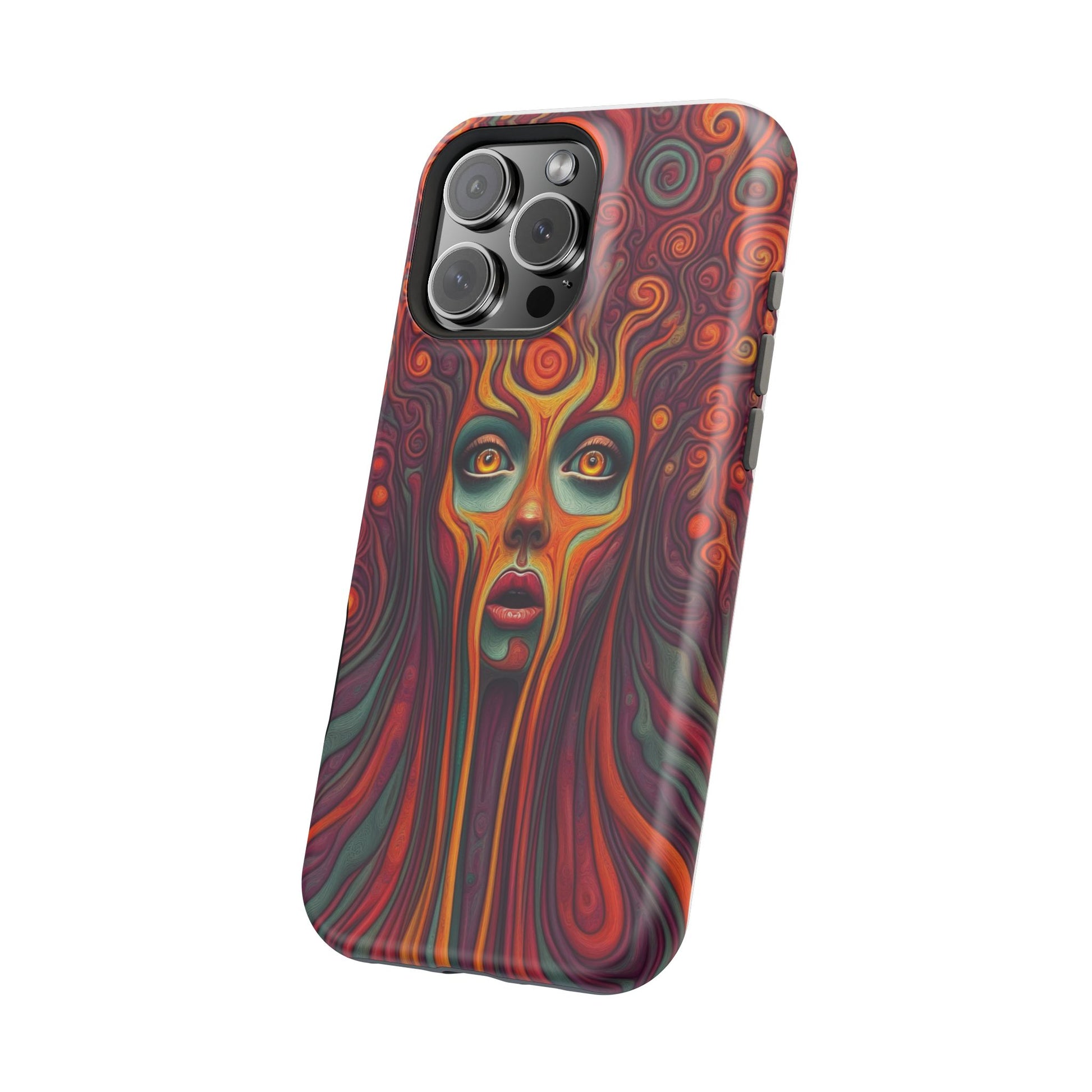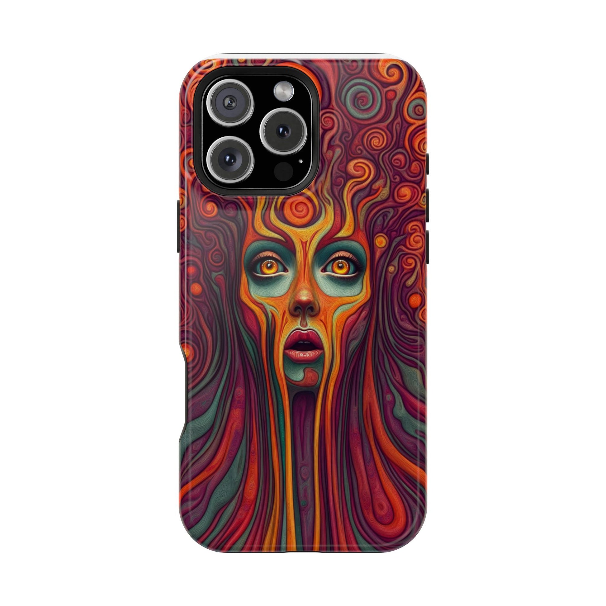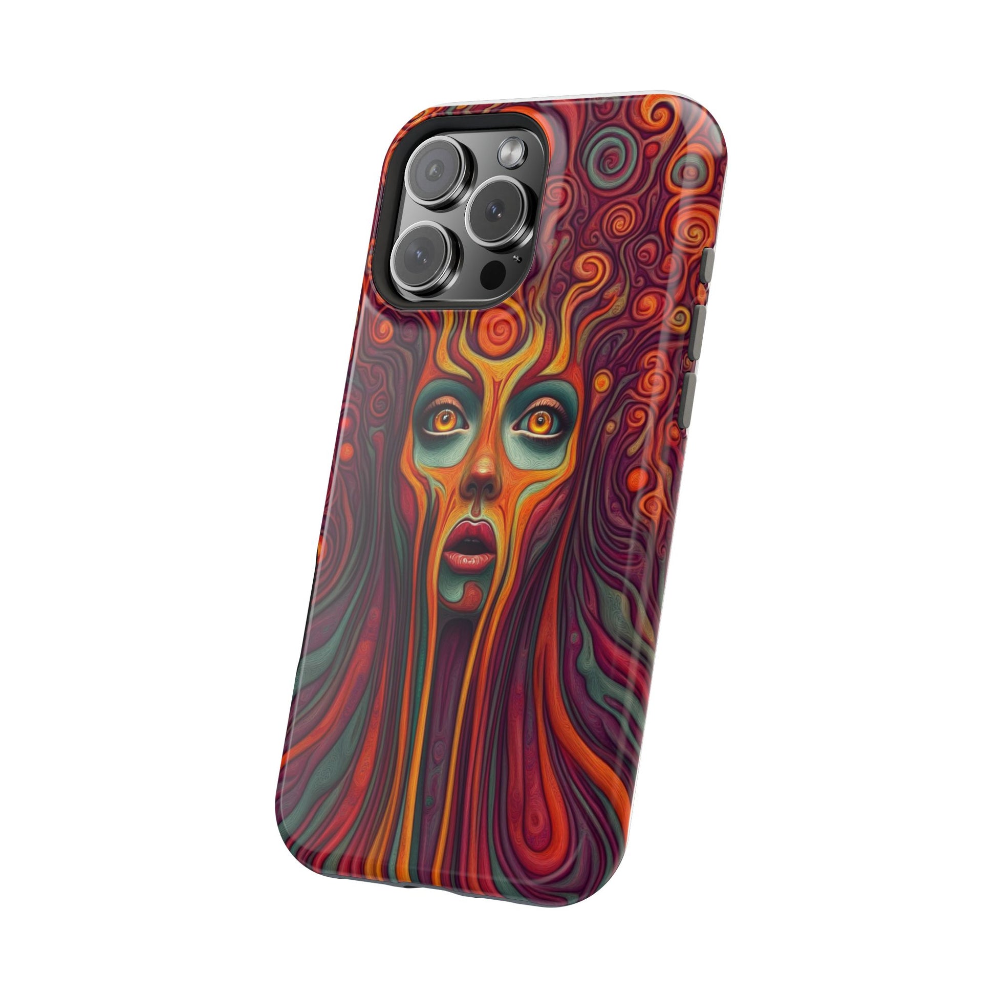 Elevate your iPhone's style with this stunning case featuring Moxie-Jay's captivating artwork "Cosmic Meltdown." This luxurious case showcases an alien-like face with vibrant nature colors, melting away in a fiery display. The durable polycarbonate construction provides superior protection against scratches and impacts, while the built-in magnets ensure seamless MagSafe® compatibility for effortless wireless charging.Product features: