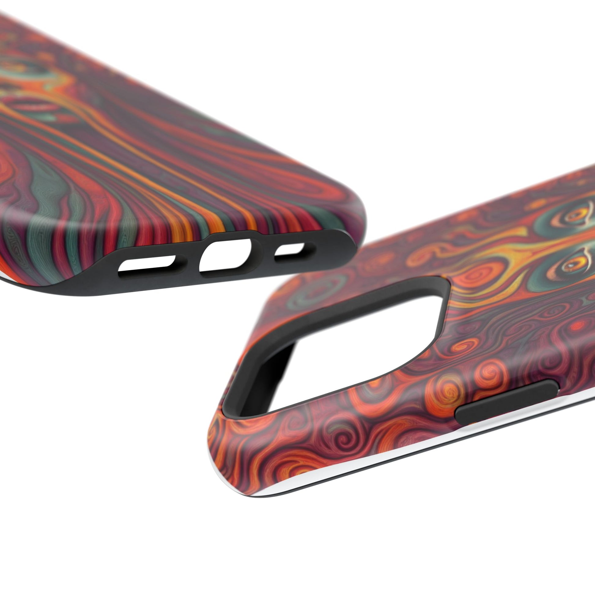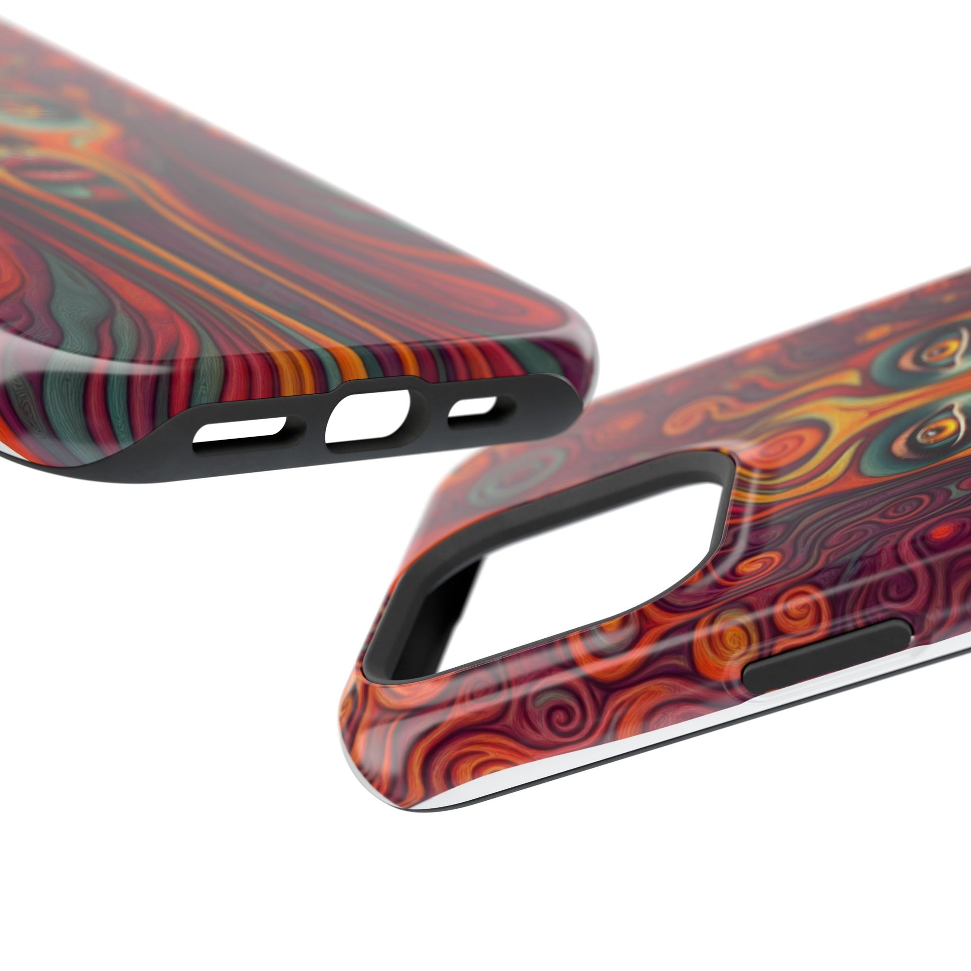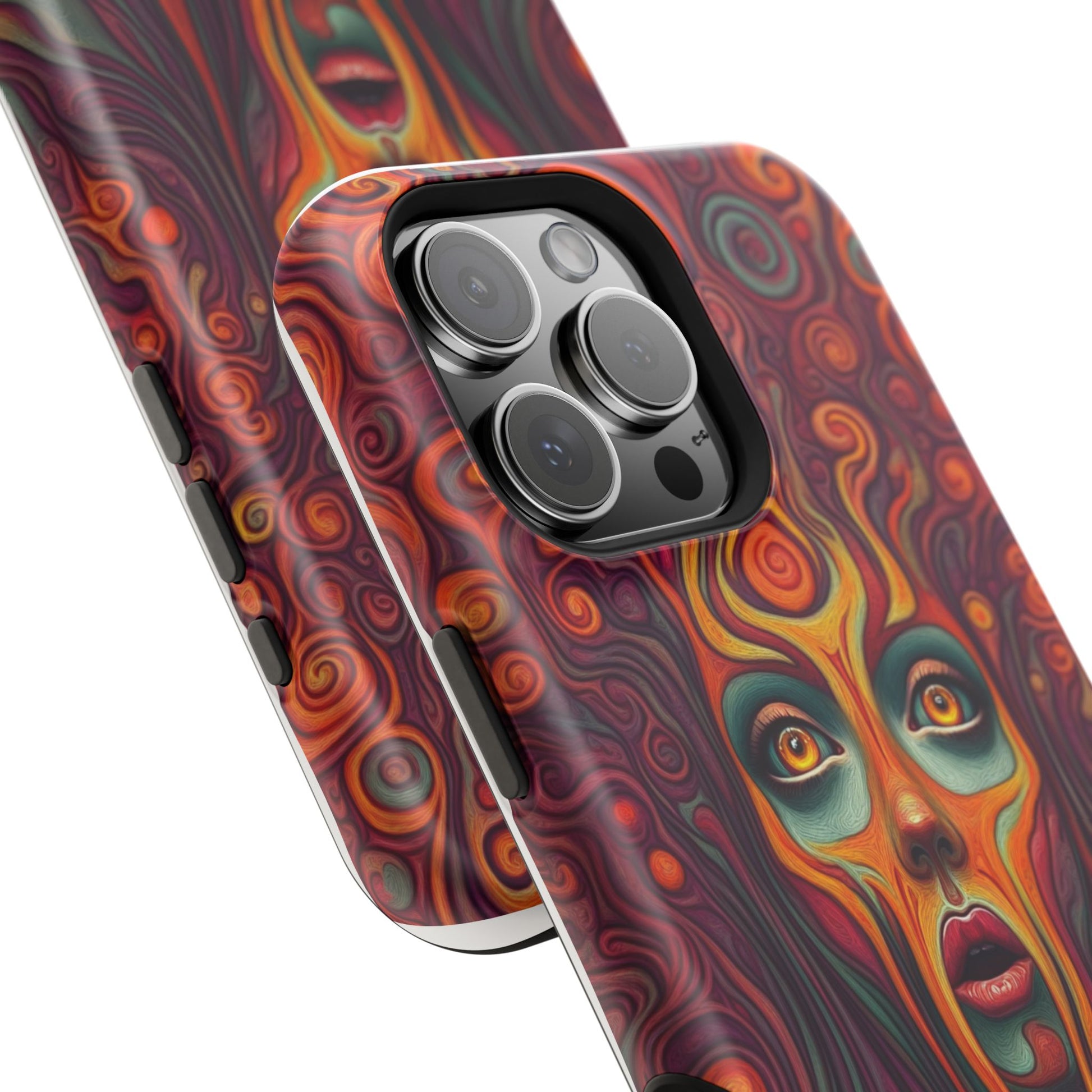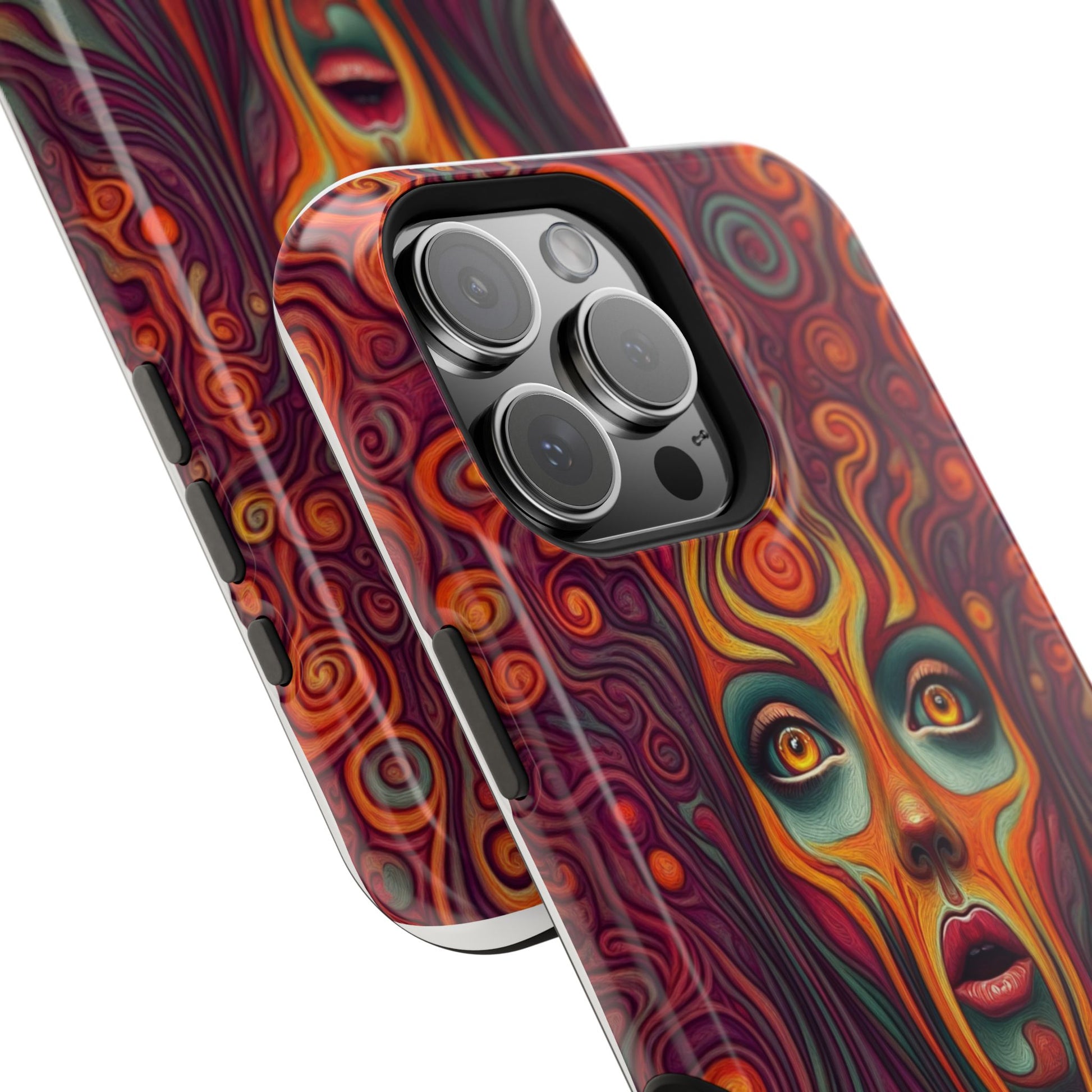 Elevate your iPhone's style with this stunning case featuring Moxie-Jay's captivating artwork "Cosmic Meltdown." This luxurious case showcases an alien-like face with vibrant nature colors, melting away in a fiery display. The durable polycarbonate construction provides superior protection against scratches and impacts, while the built-in magnets ensure seamless MagSafe® compatibility for effortless wireless charging.Product features: