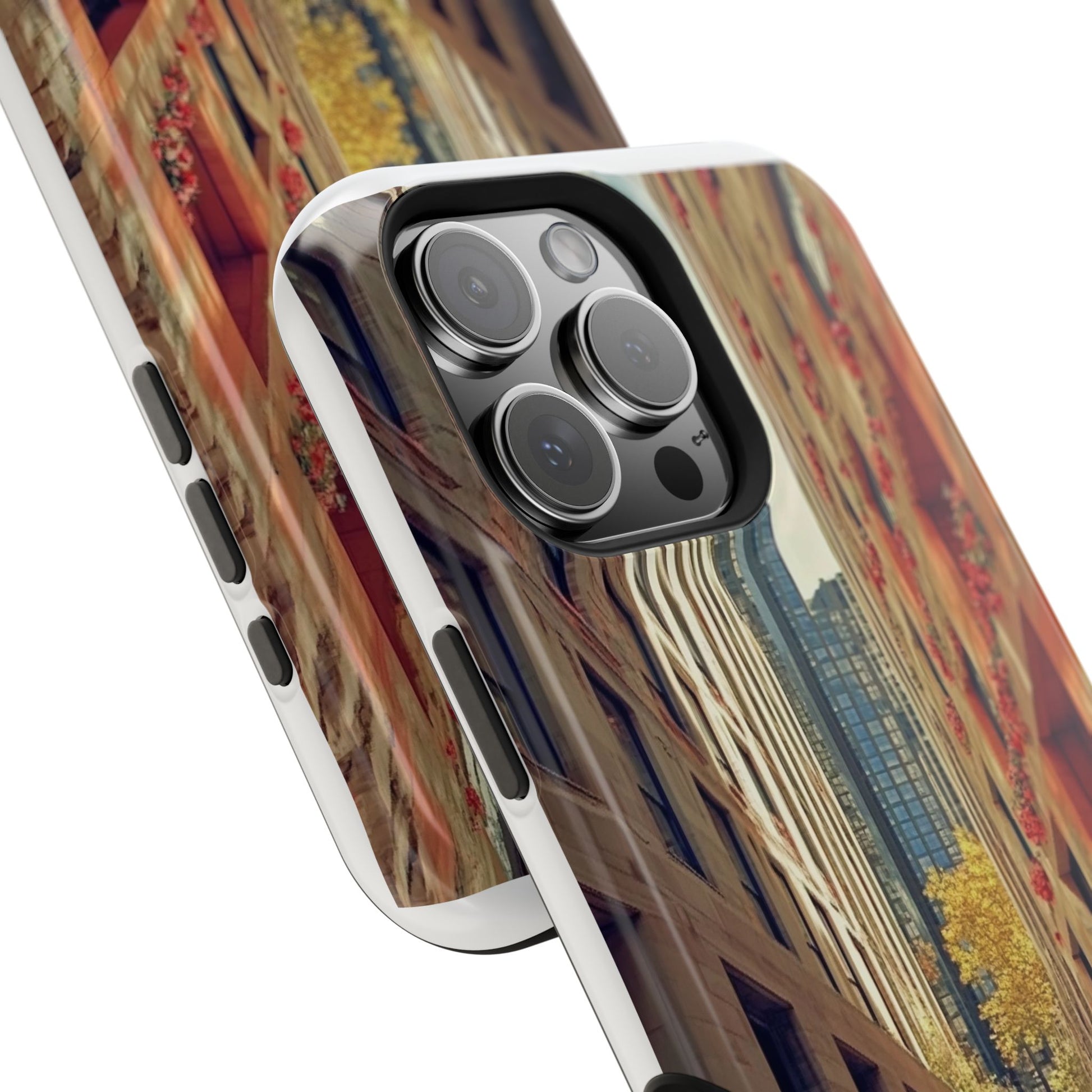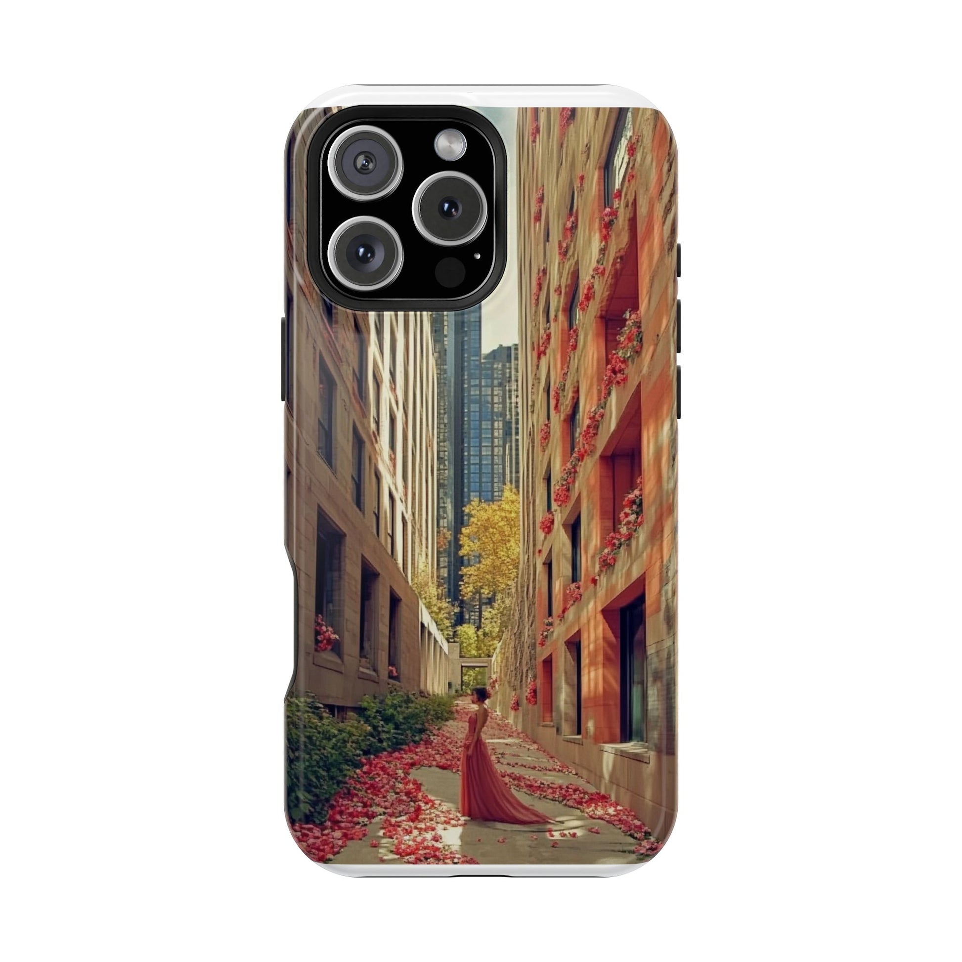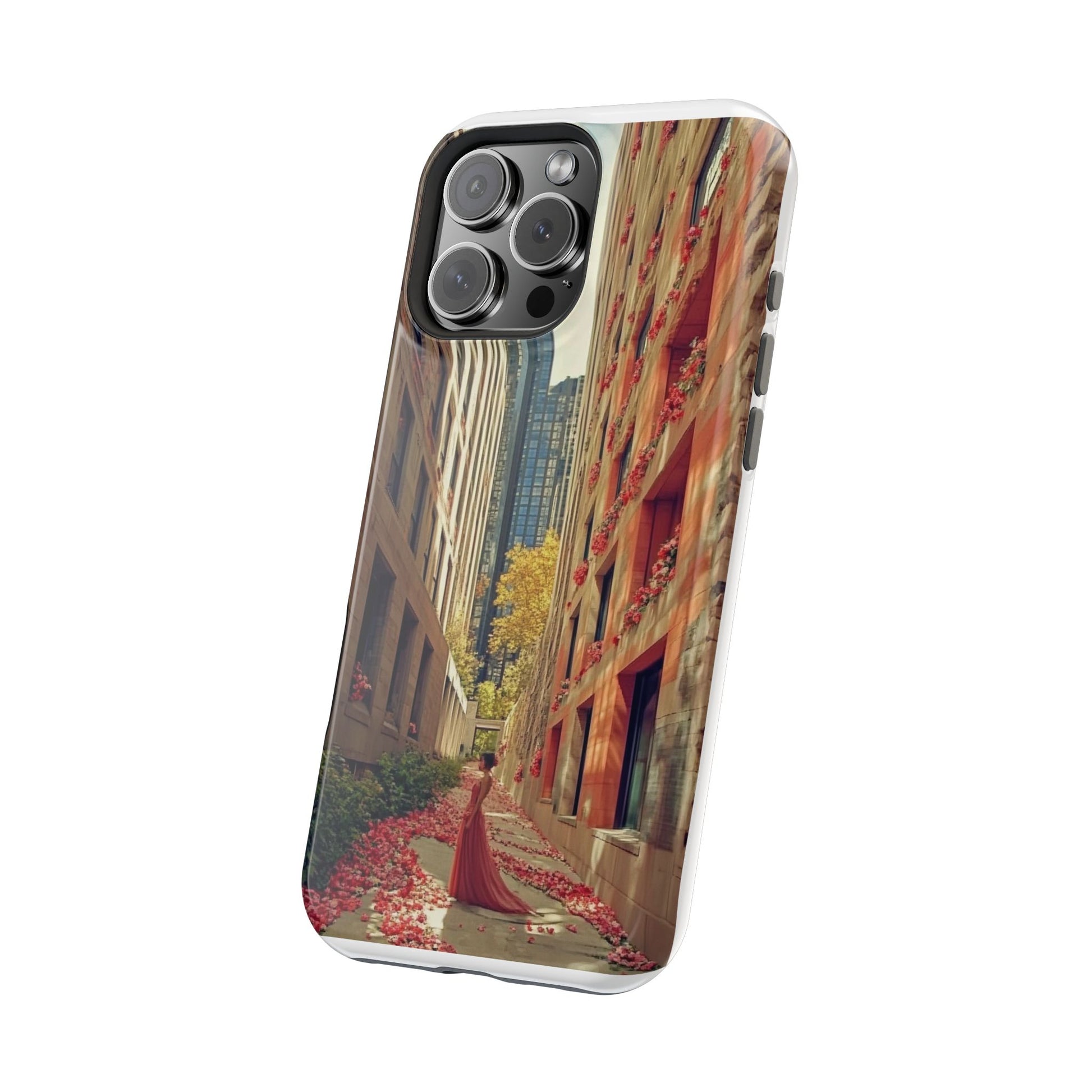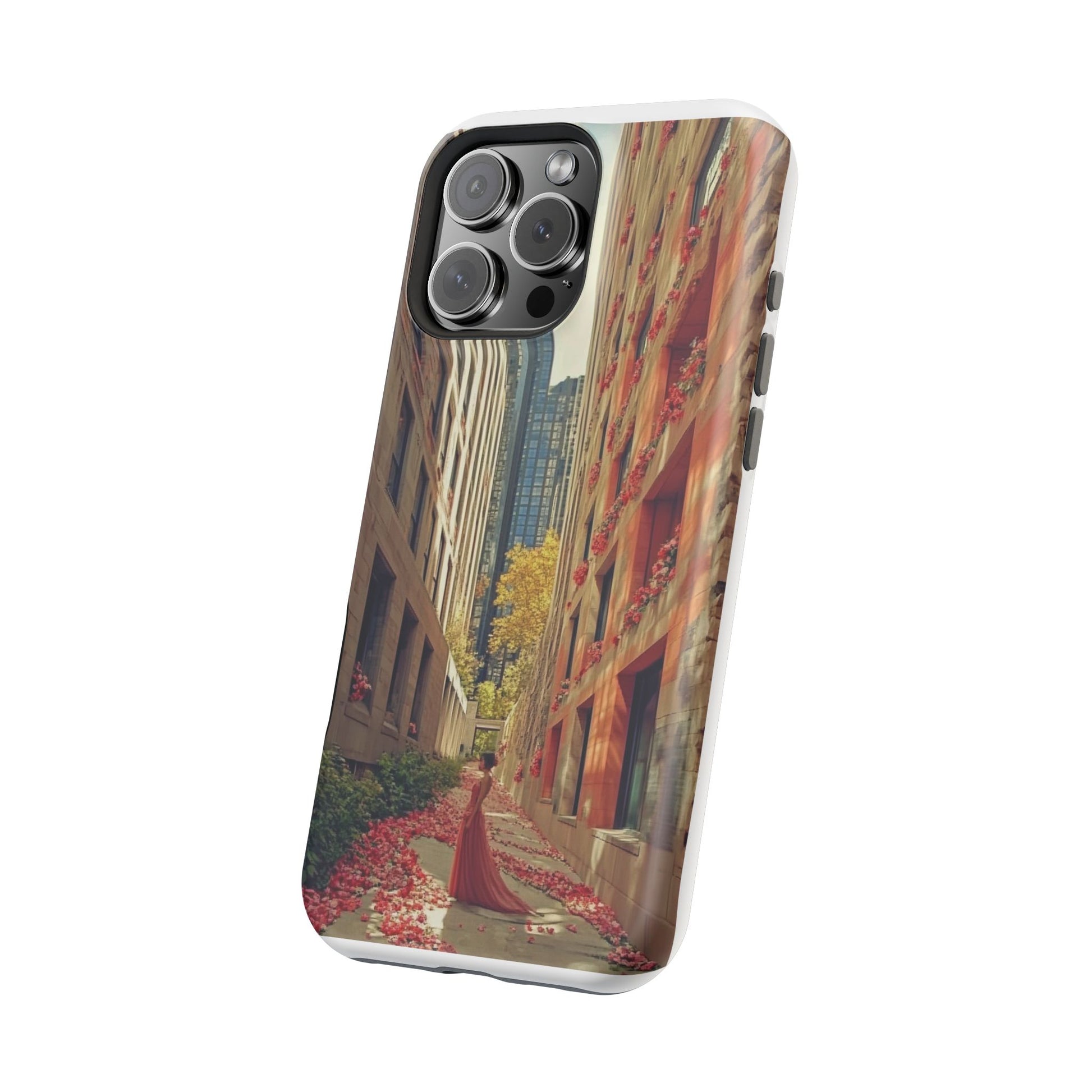 Luxury phone case featuring original art of a woman between skyscrapers, giving a chic and sophisticated vibe. Perfect for those who love unique and eye-catching accessories. Ideal for gift giving during birthdays, holidays, or as a treat for yourself.