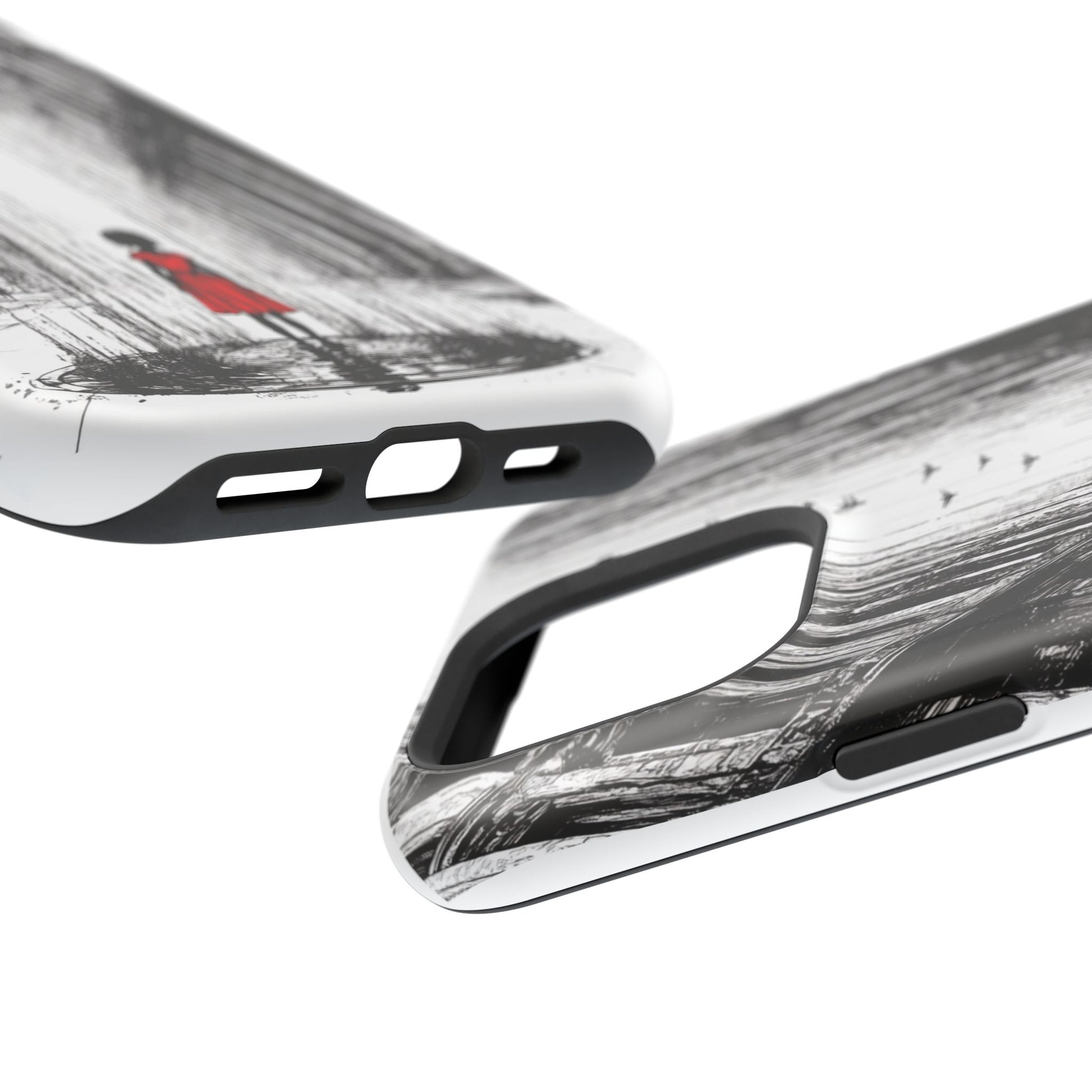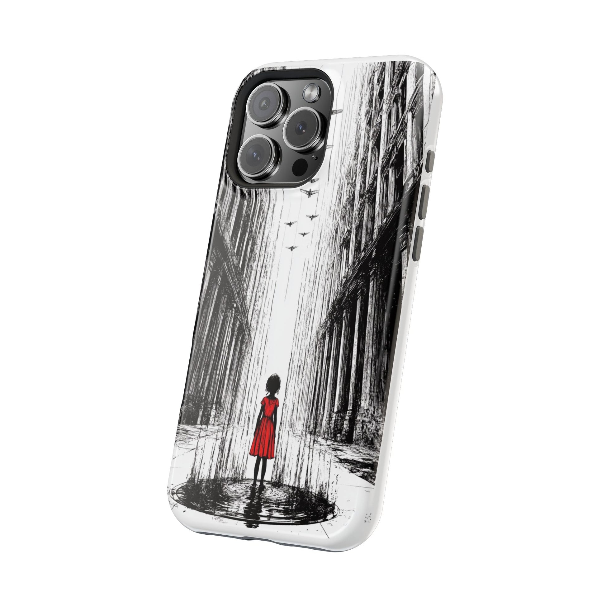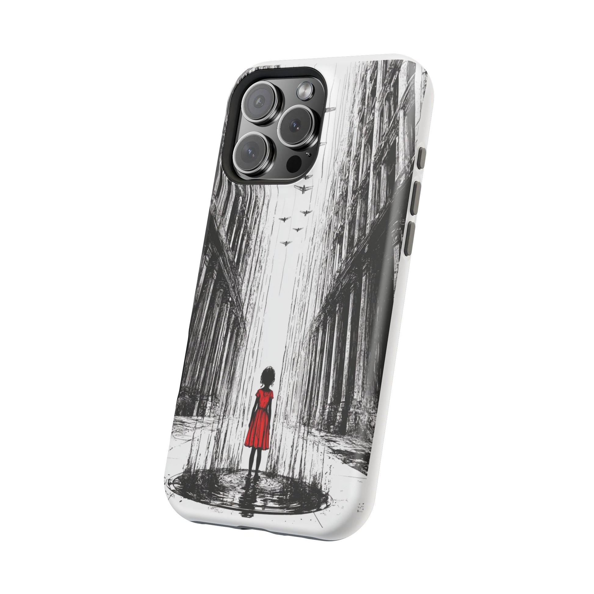 Luxury phone case with an original art piece by Moxie-Jay featuring a sketch of a girl in a red dress walking down a rainy city street. Gives off a sophisticated and artsy vibe, perfect for fashion-forward individuals looking for a unique phone accessory. Ideal for gifting on birthdays, holidays, or as a treat for yourself.