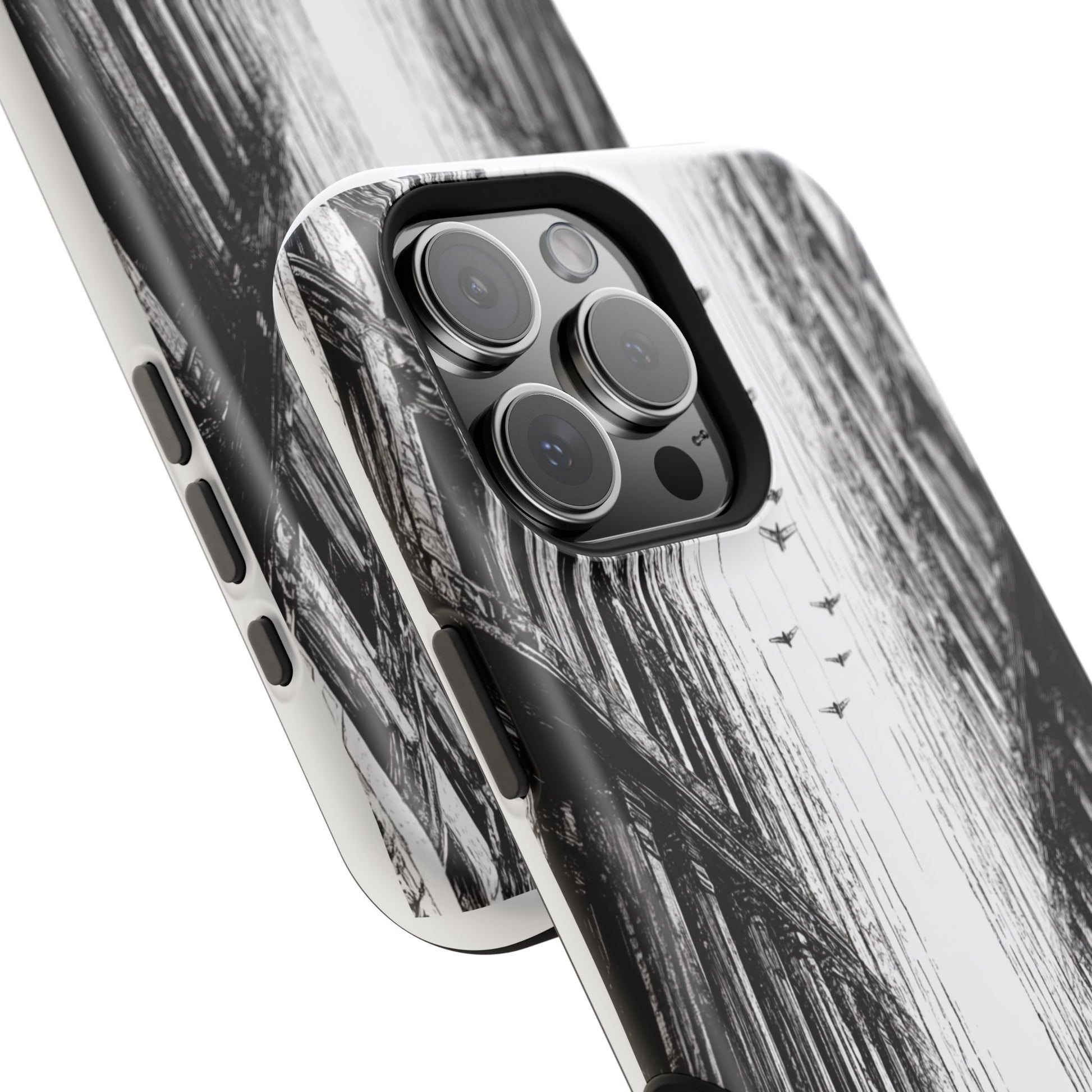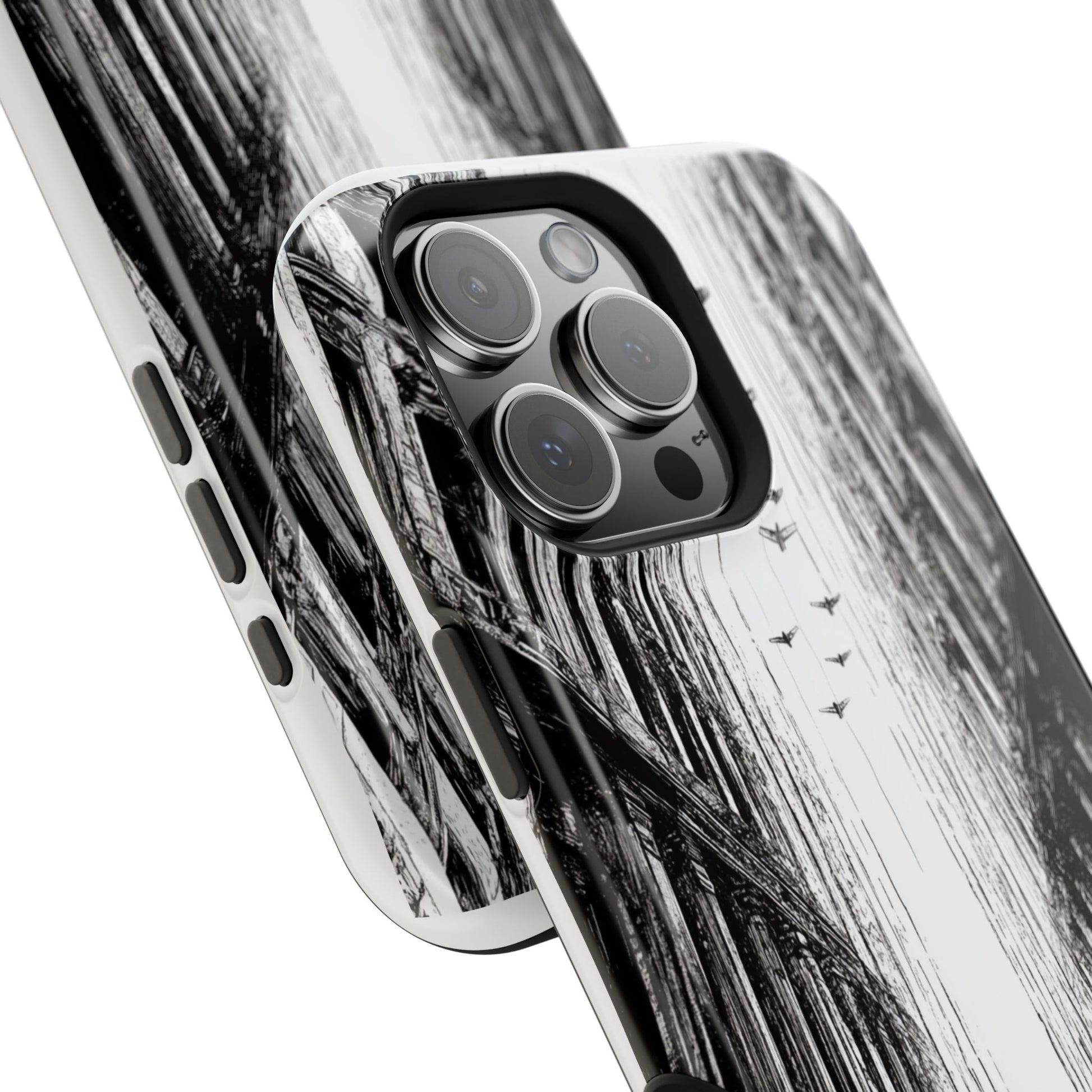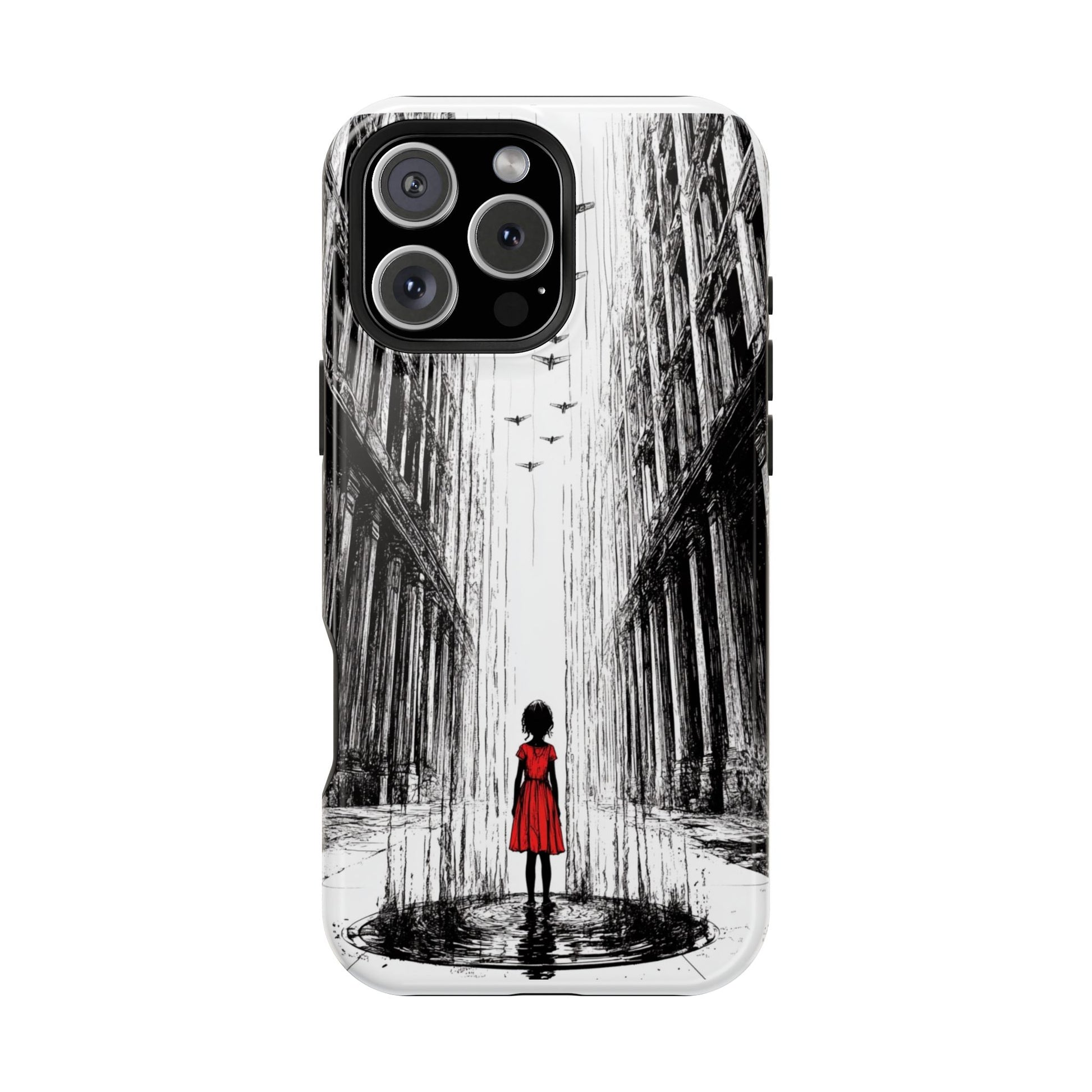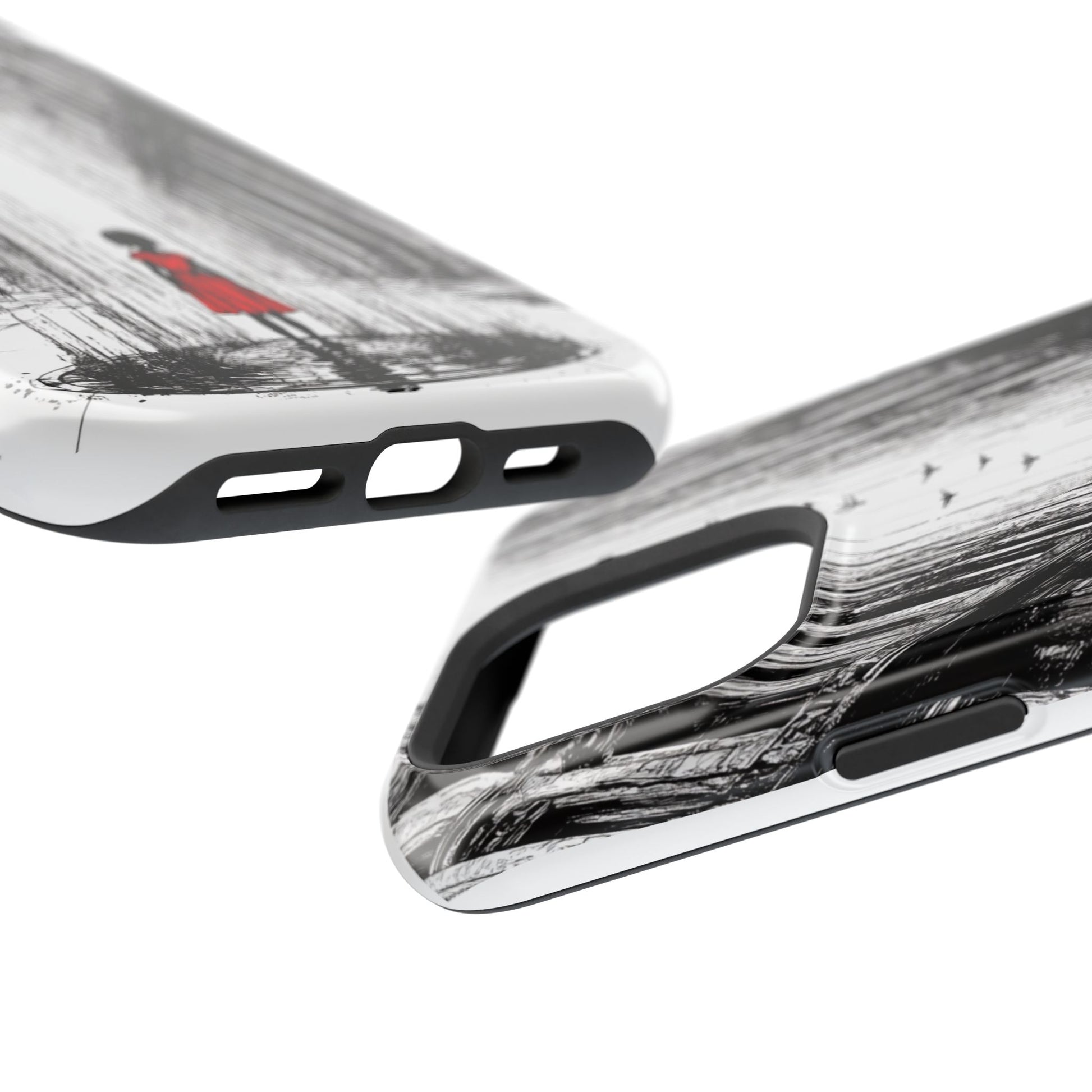 Luxury phone case with an original art piece by Moxie-Jay featuring a sketch of a girl in a red dress walking down a rainy city street. Gives off a sophisticated and artsy vibe, perfect for fashion-forward individuals looking for a unique phone accessory. Ideal for gifting on birthdays, holidays, or as a treat for yourself.