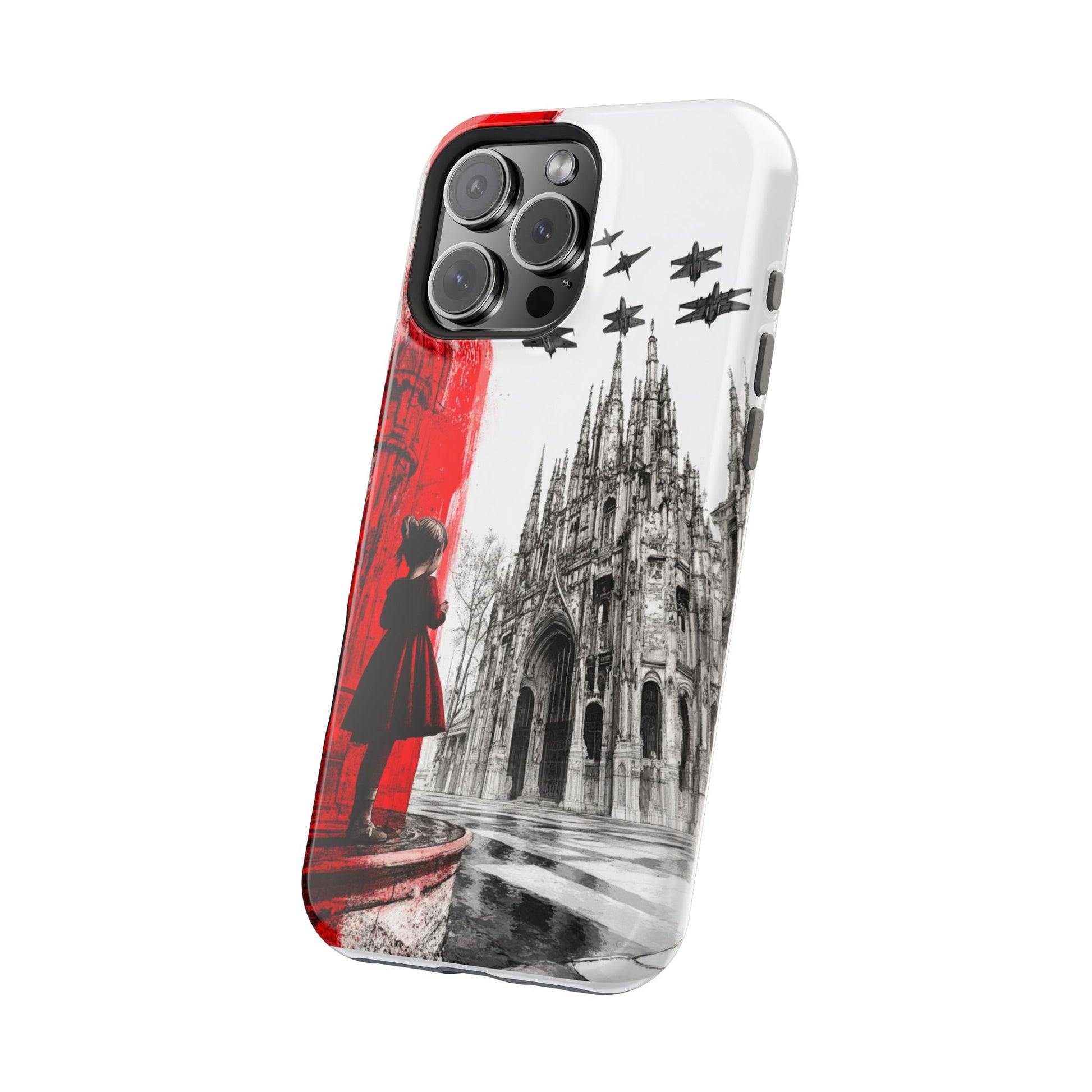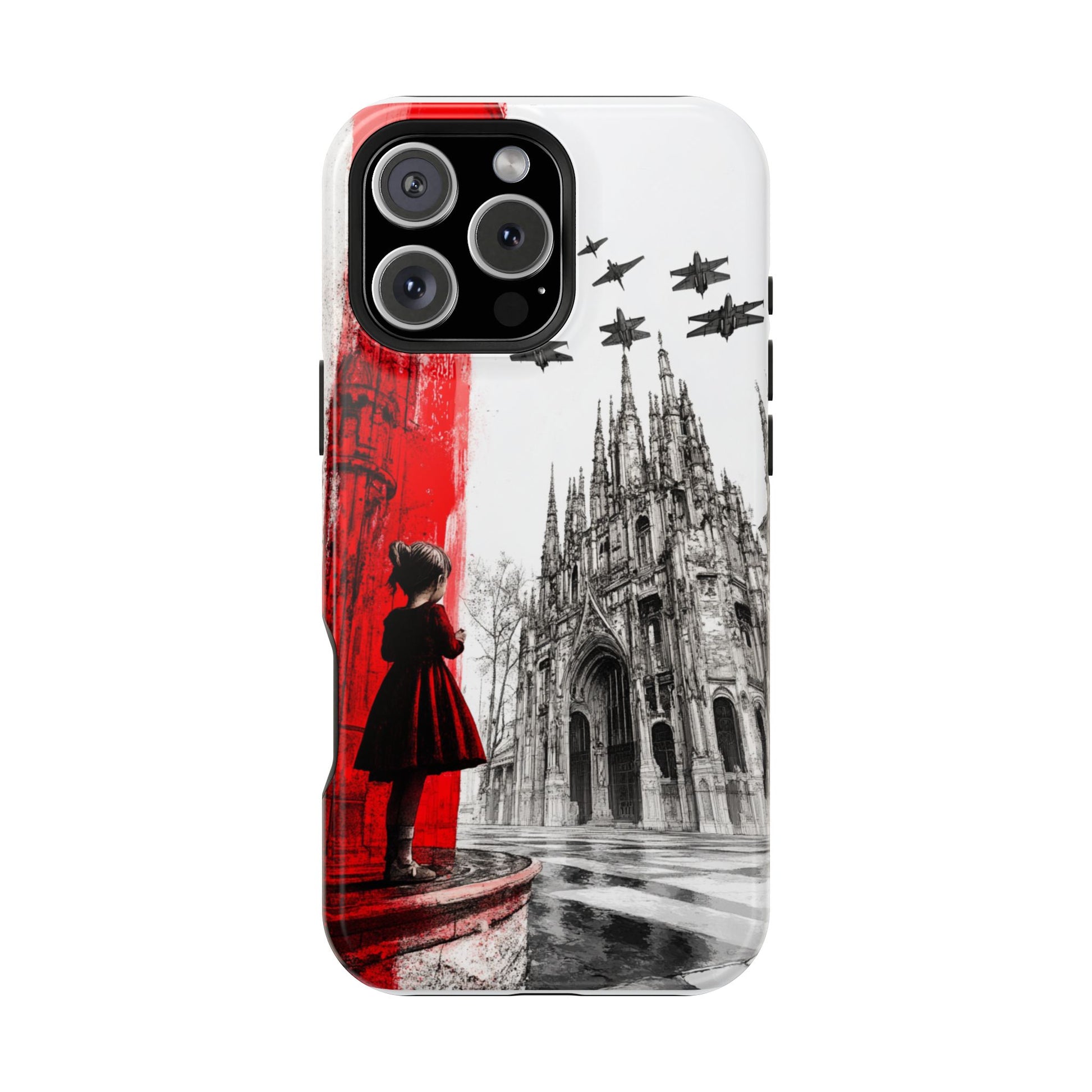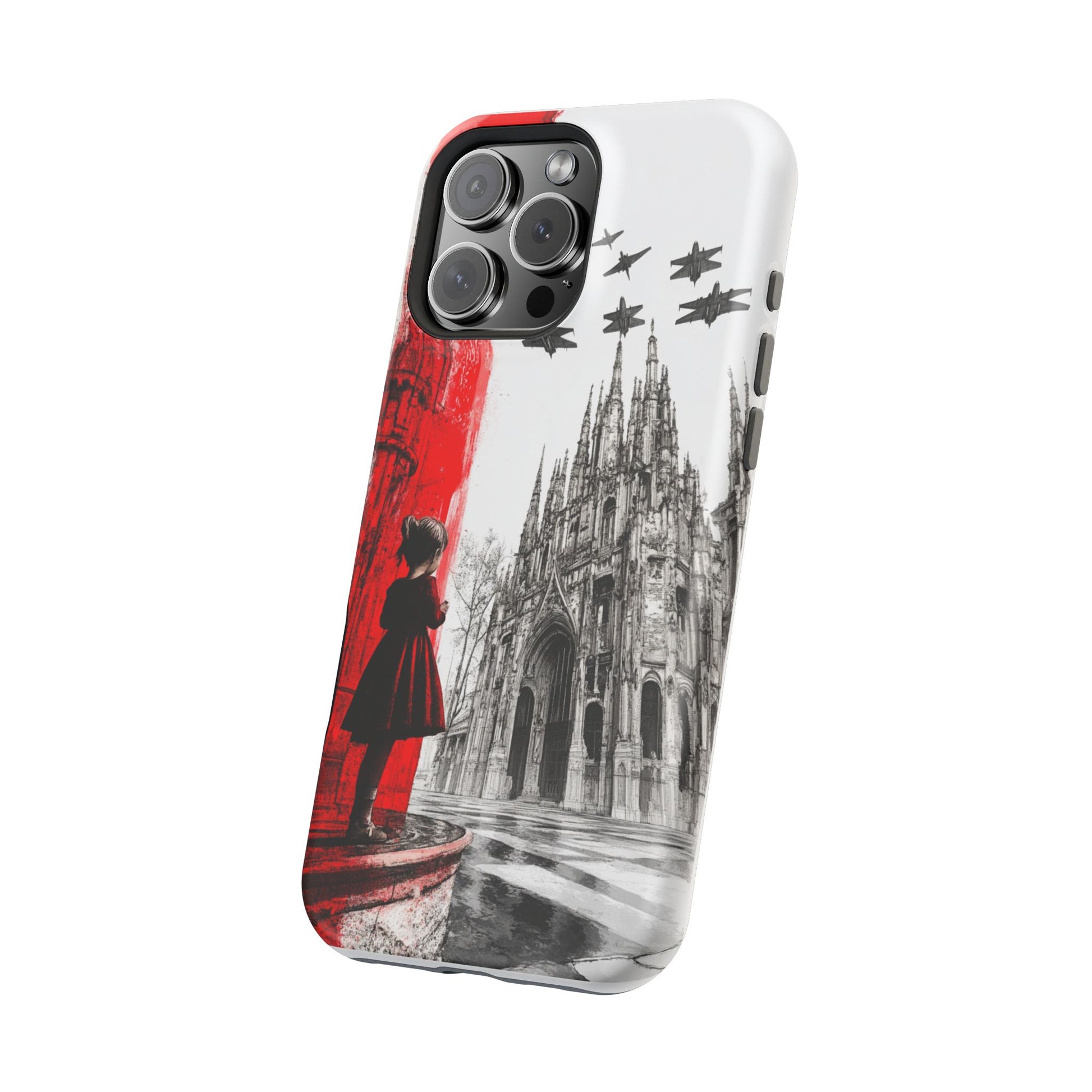 Luxurious iPhone protector with magnetic wireless charging featuring a Moxie-Jay piece. The design depicts a little girl standing on the top of her house, looking at a huge gothic chapel with Air Force planes flying around, ready to bomb the building. The case gives off a unique and artistic vibe, perfect for art enthusiasts and individuals who appreciate unconventional designs. Ideal for those looking for a statement piece for their phone during Halloween or gothic-themed events.