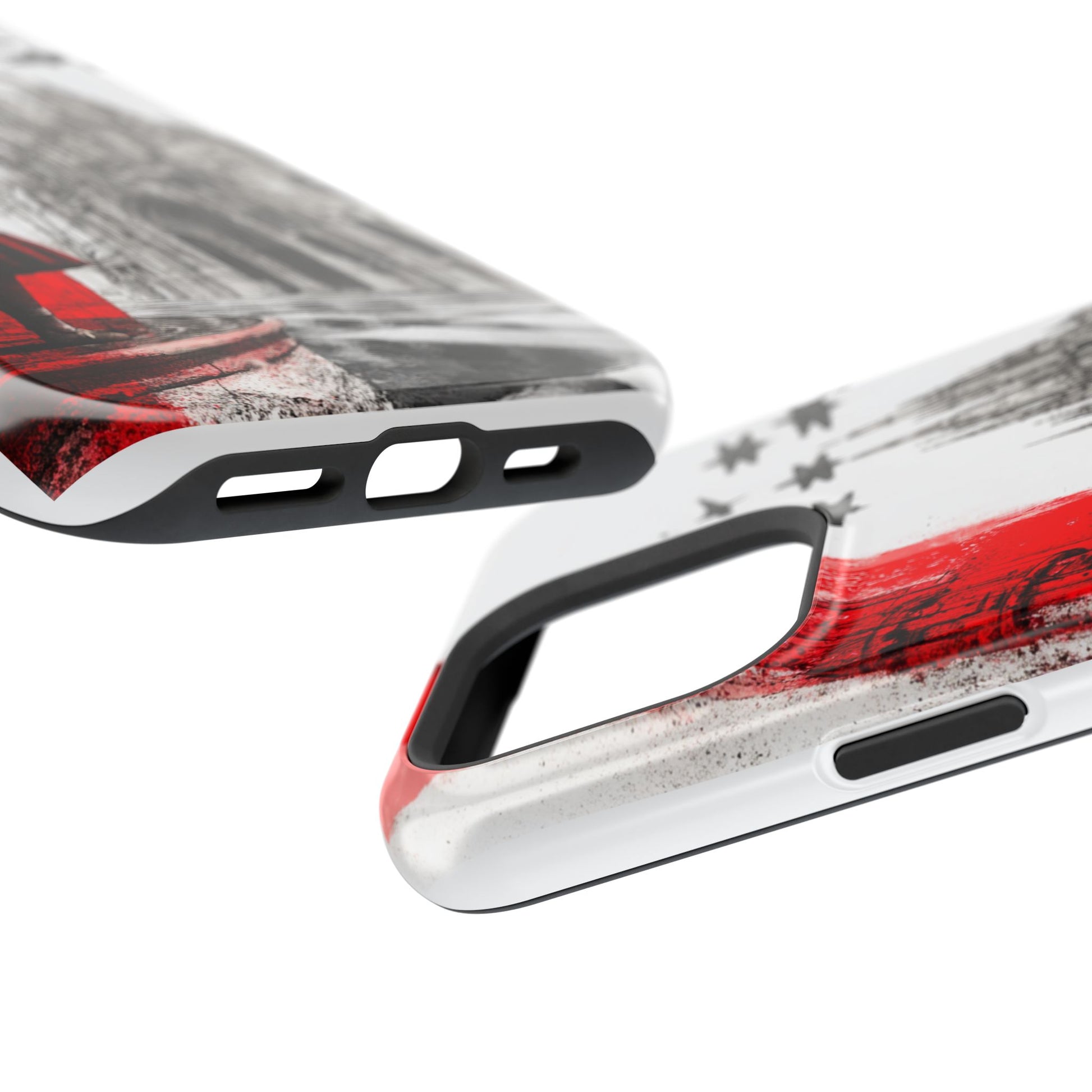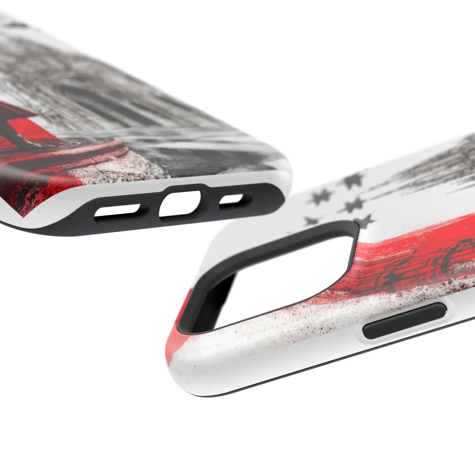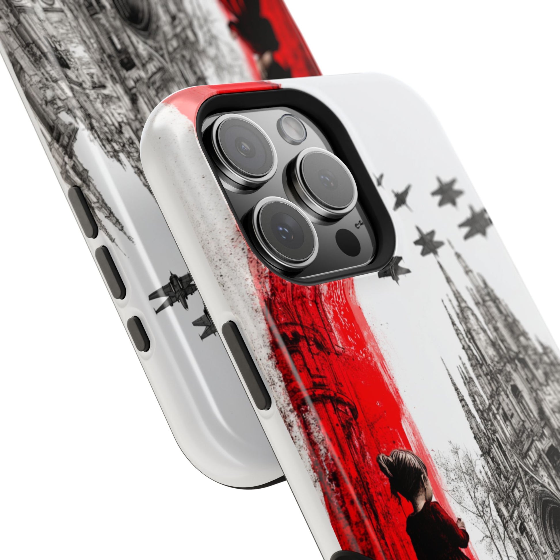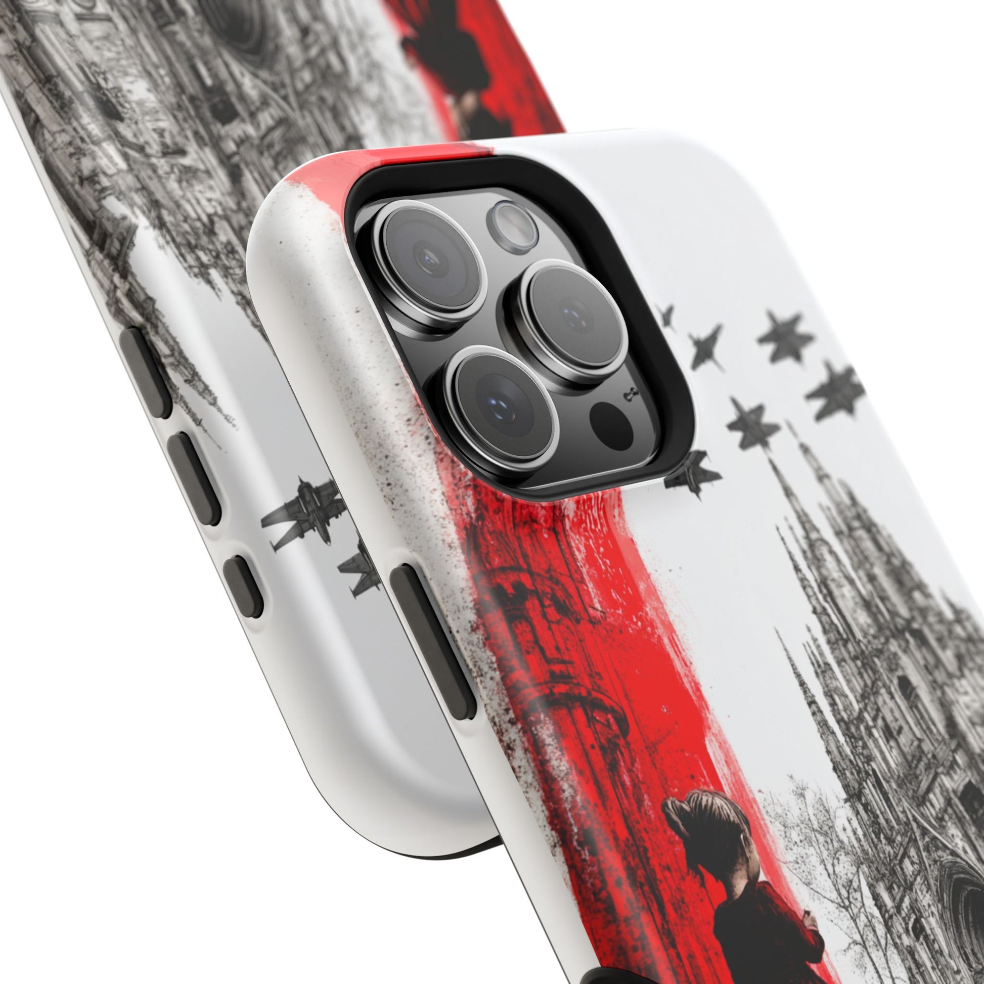 Luxurious iPhone protector with magnetic wireless charging featuring a Moxie-Jay piece. The design depicts a little girl standing on the top of her house, looking at a huge gothic chapel with Air Force planes flying around, ready to bomb the building. The case gives off a unique and artistic vibe, perfect for art enthusiasts and individuals who appreciate unconventional designs. Ideal for those looking for a statement piece for their phone during Halloween or gothic-themed events.