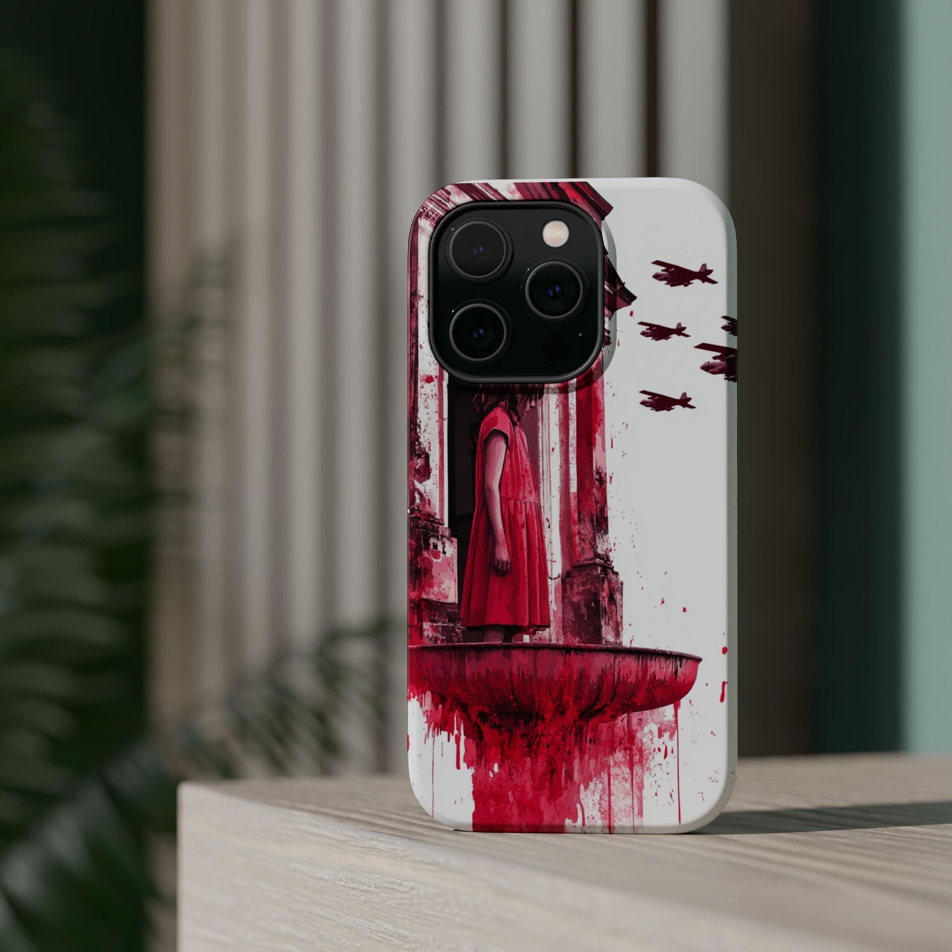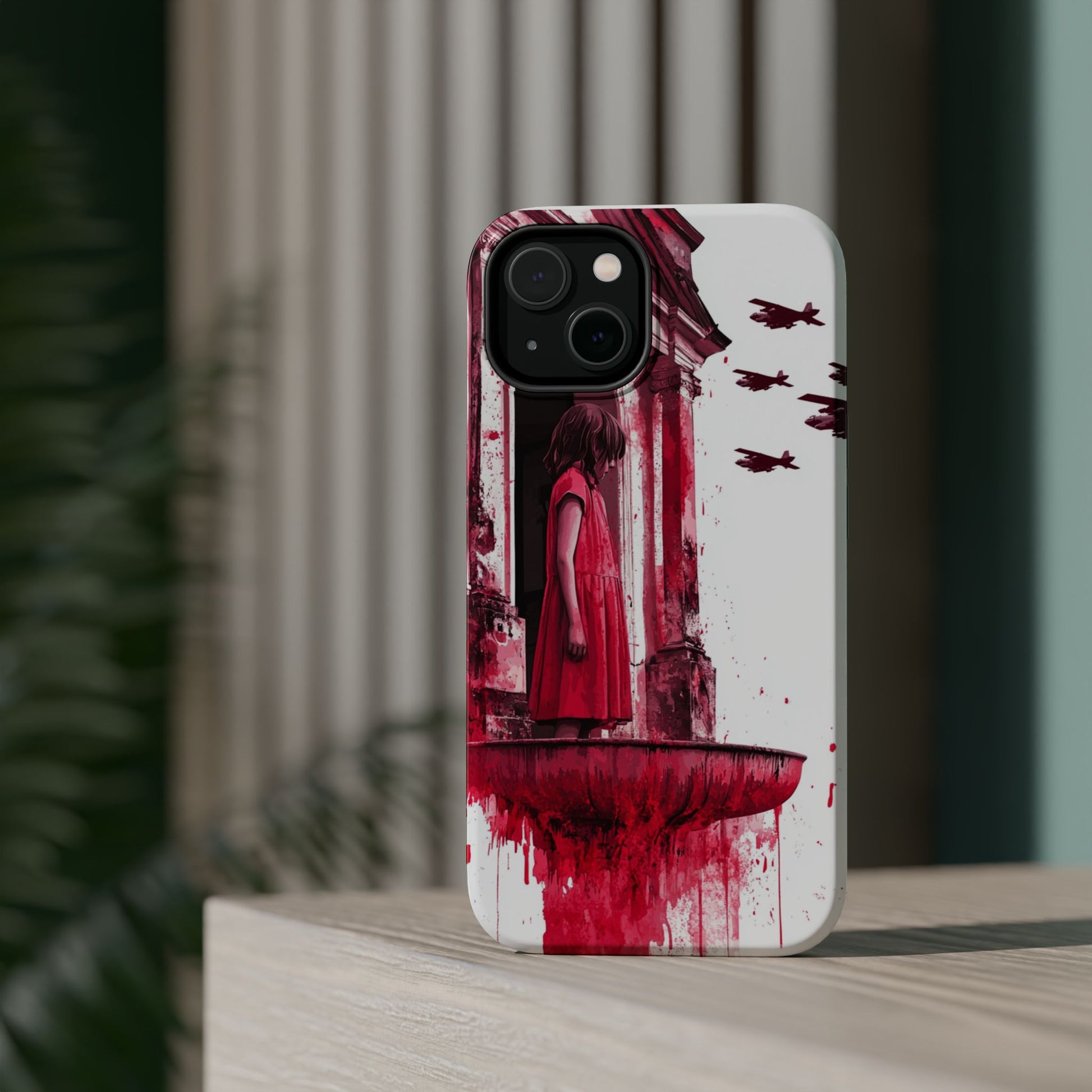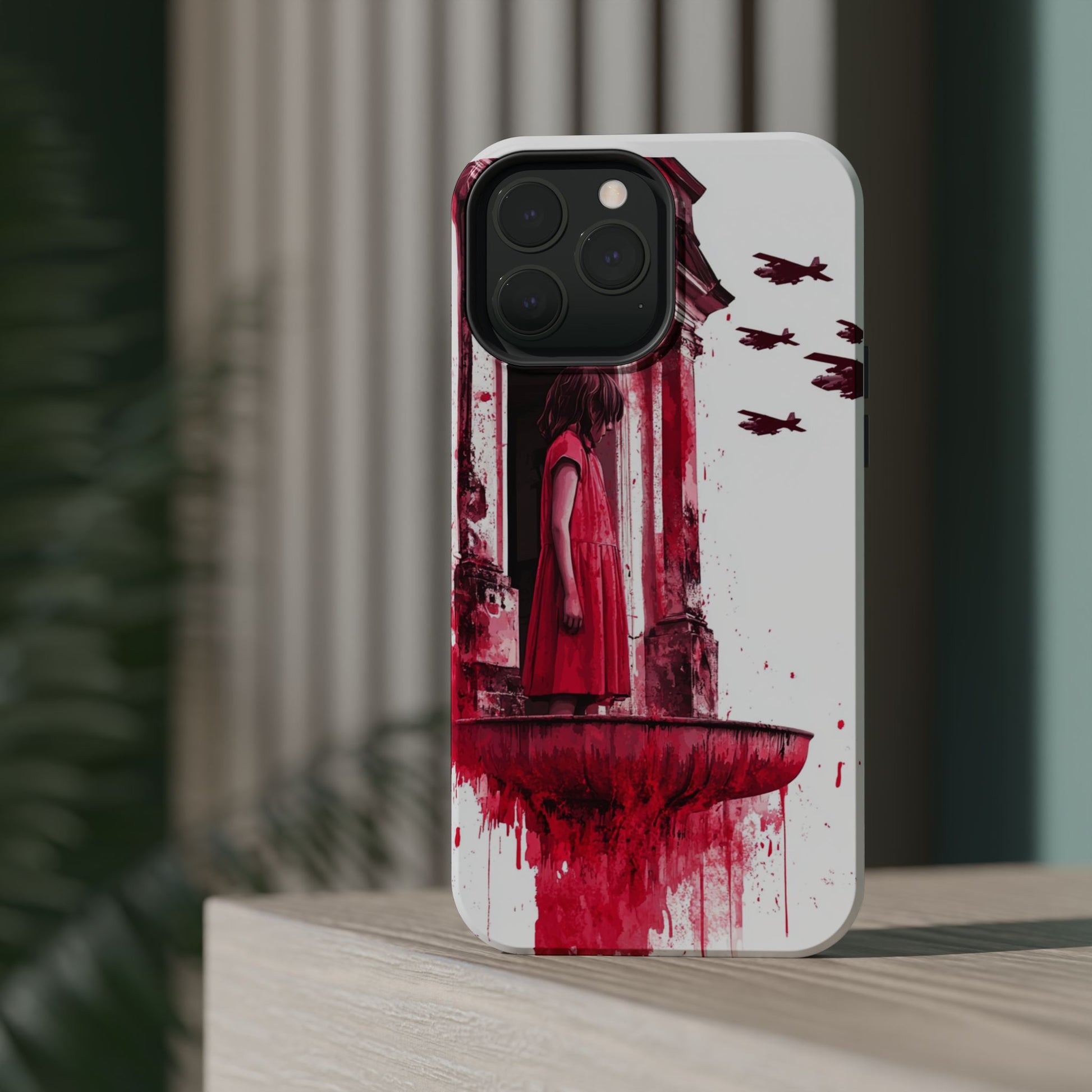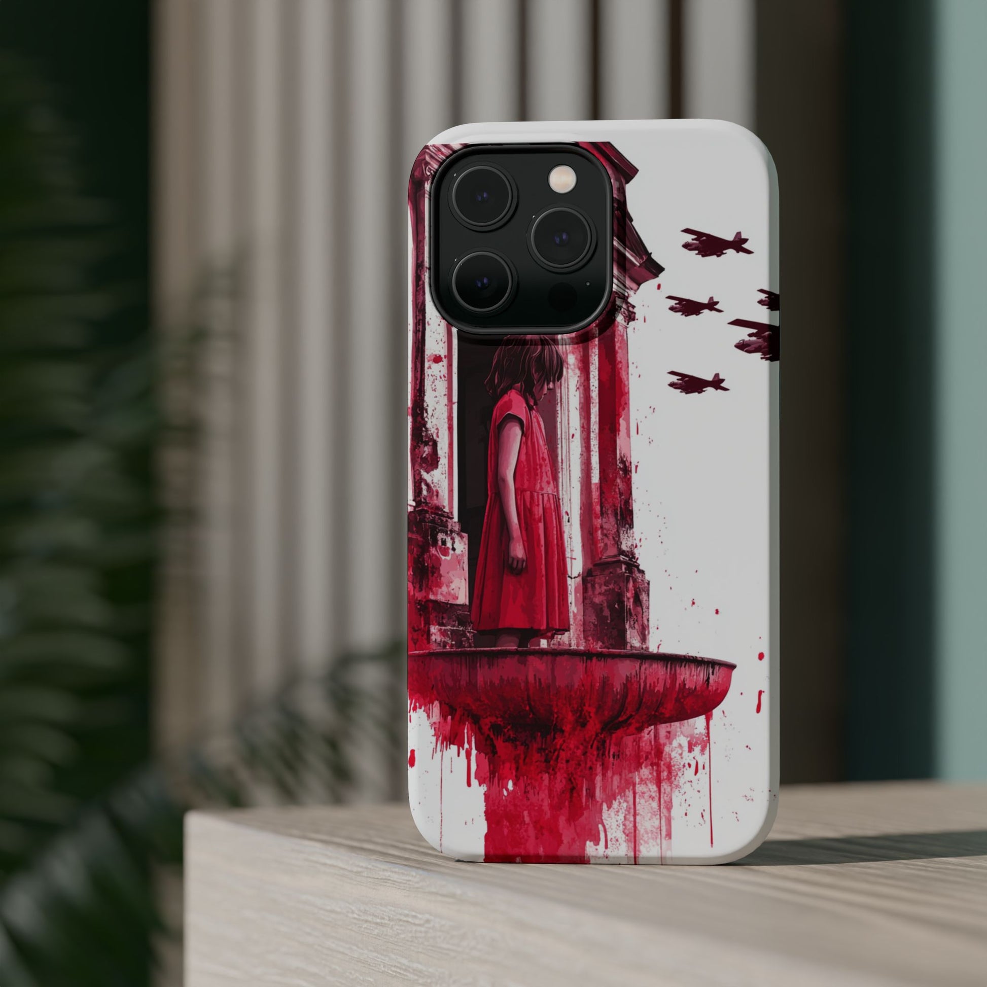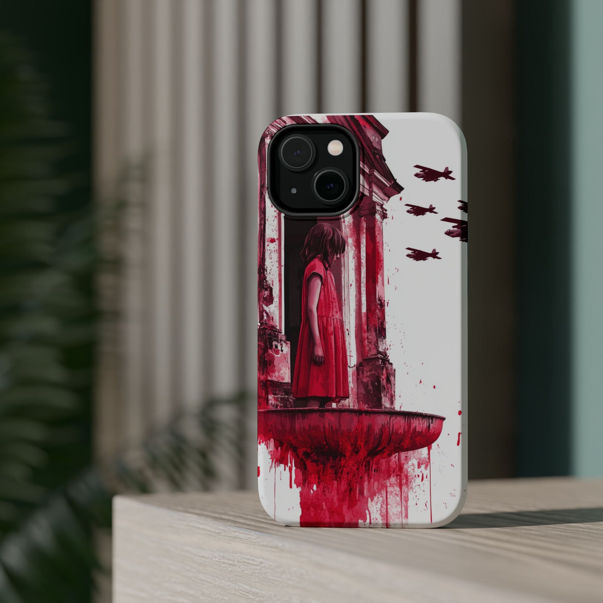 Protect your iPhone with this striking case featuring Moxie-Jay's powerful artwork "Resilience in Ruins." This luxurious case depicts a young girl standing on the ledge of a bombed-out building, her gaze fixed on bomber planes above. The durable polycarbonate construction shields your device from impacts and scratches, while built-in magnets ensure seamless MagSafe® compatibility for effortless wireless charging.Product features: