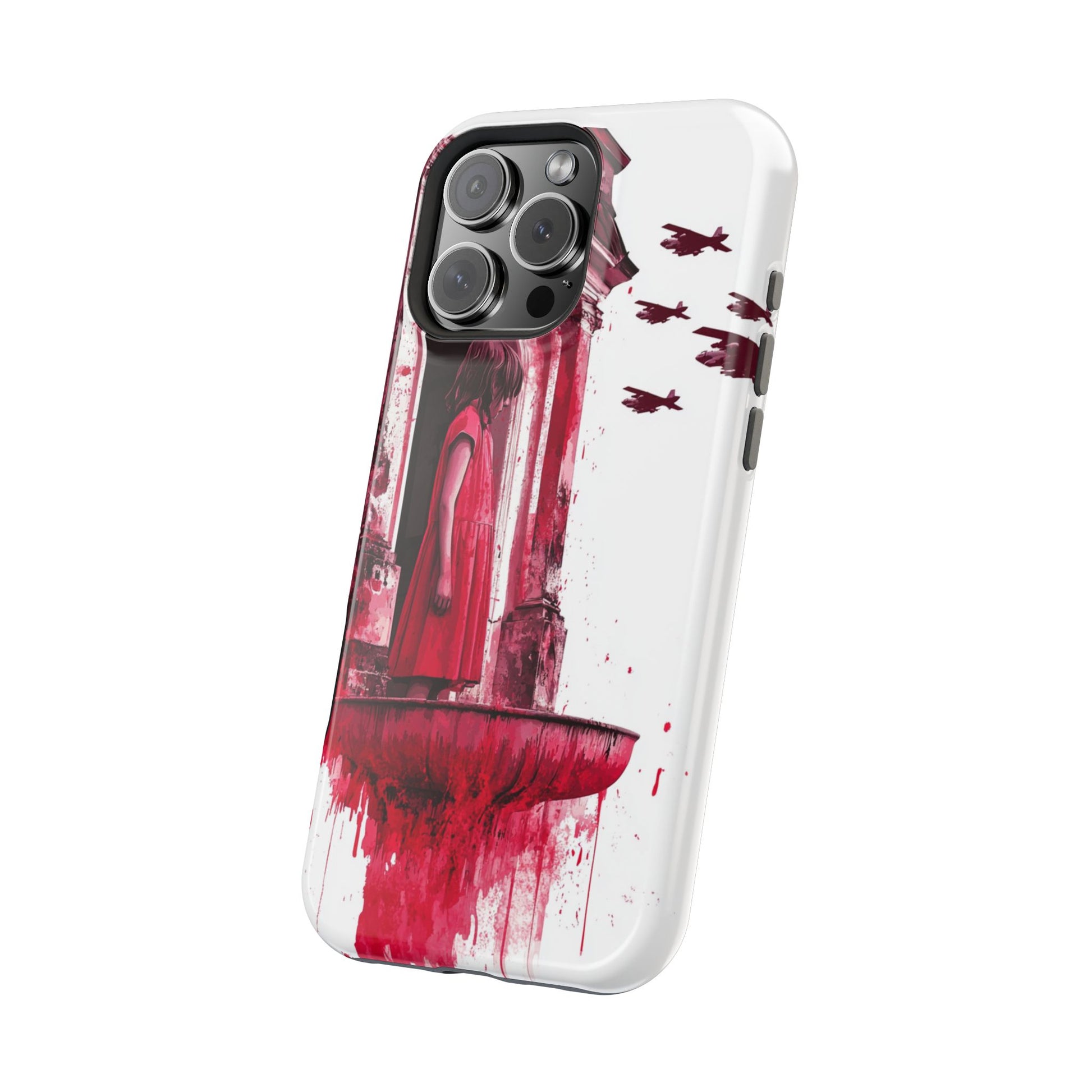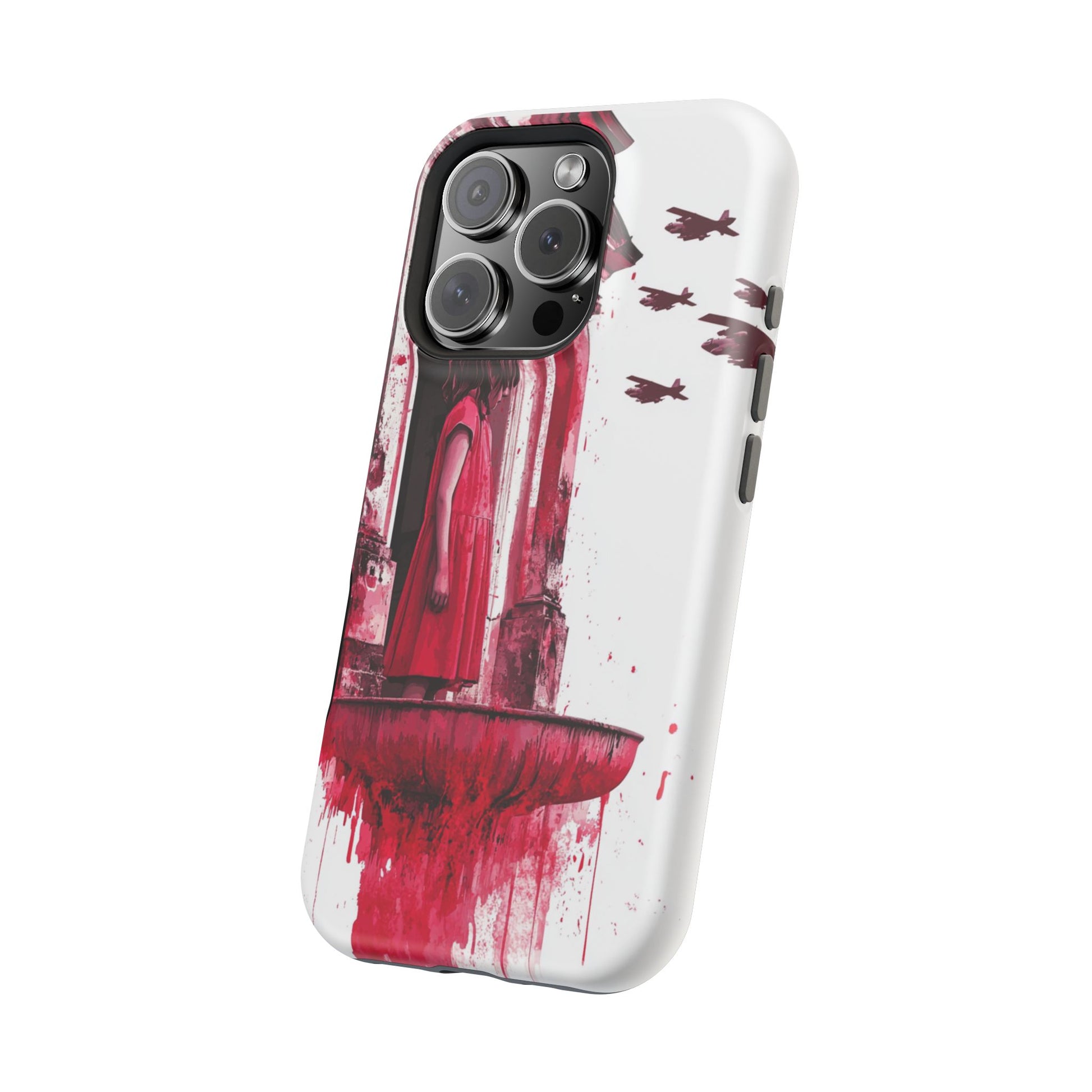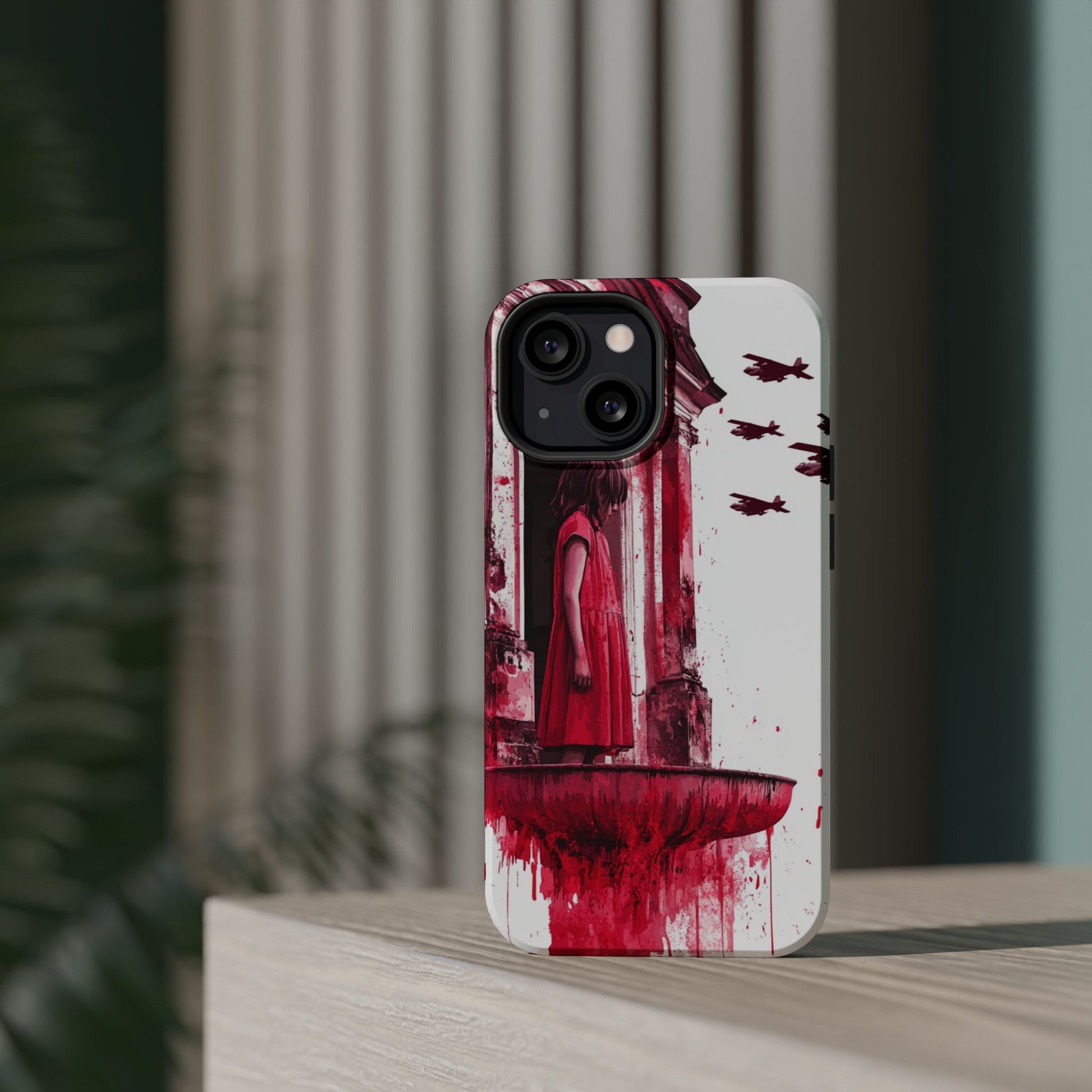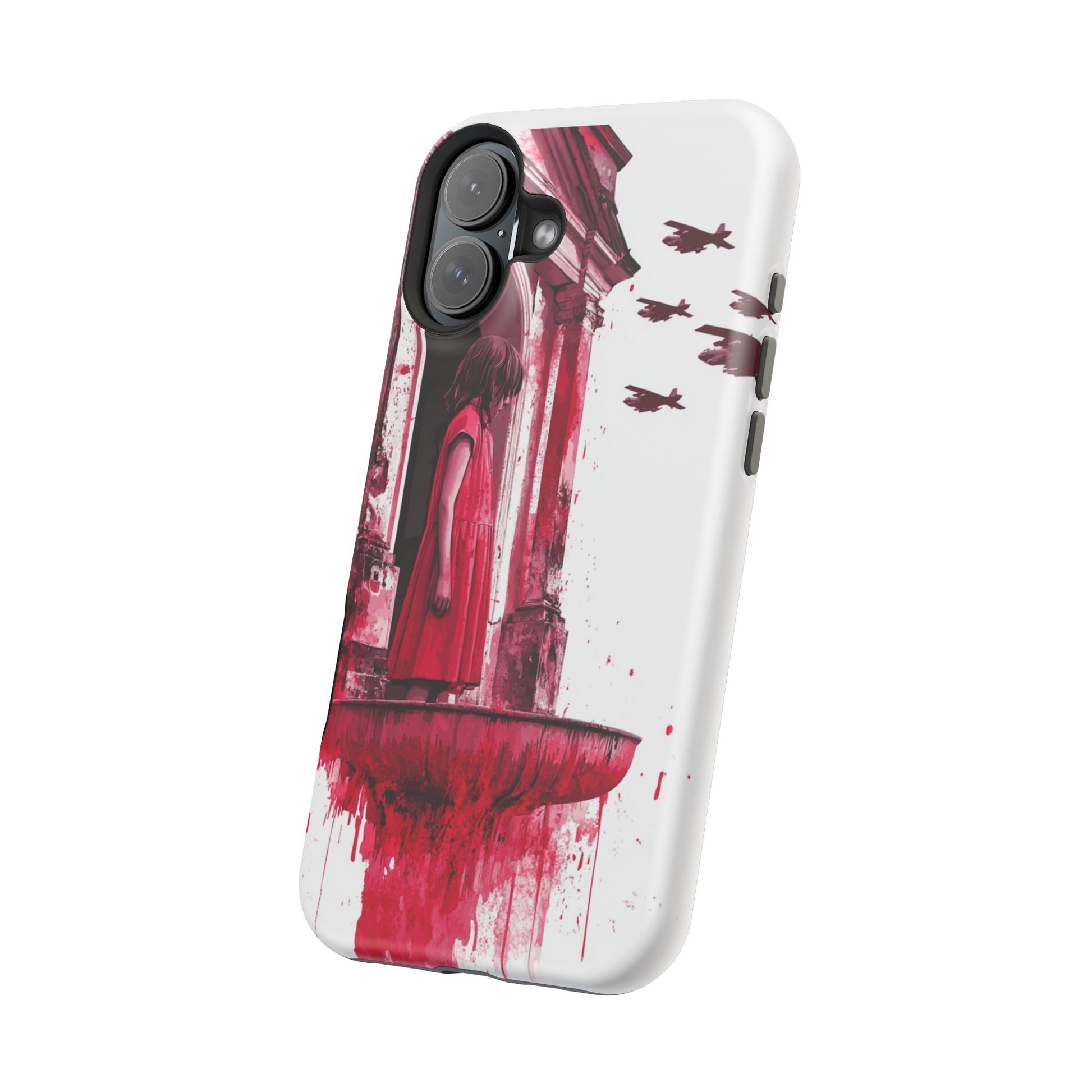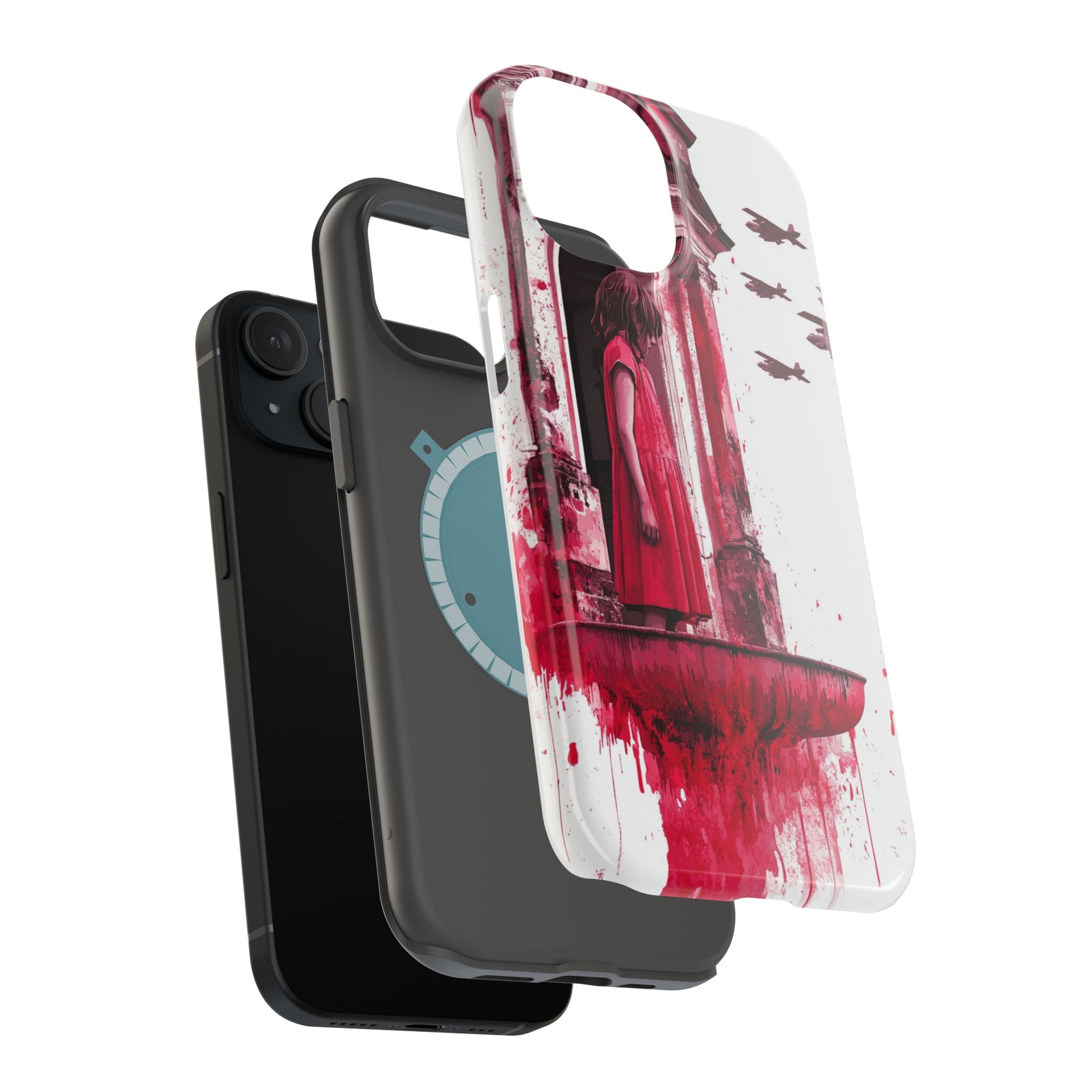 Protect your iPhone with this striking case featuring Moxie-Jay's powerful artwork "Resilience in Ruins." This luxurious case depicts a young girl standing on the ledge of a bombed-out building, her gaze fixed on bomber planes above. The durable polycarbonate construction shields your device from impacts and scratches, while built-in magnets ensure seamless MagSafe® compatibility for effortless wireless charging.Product features: