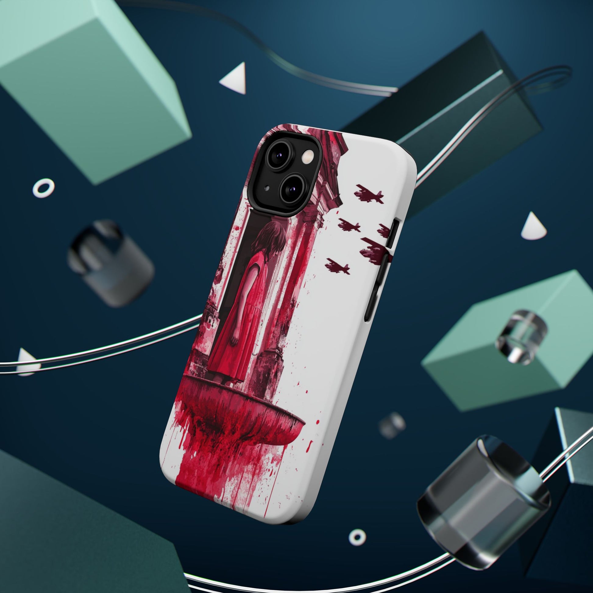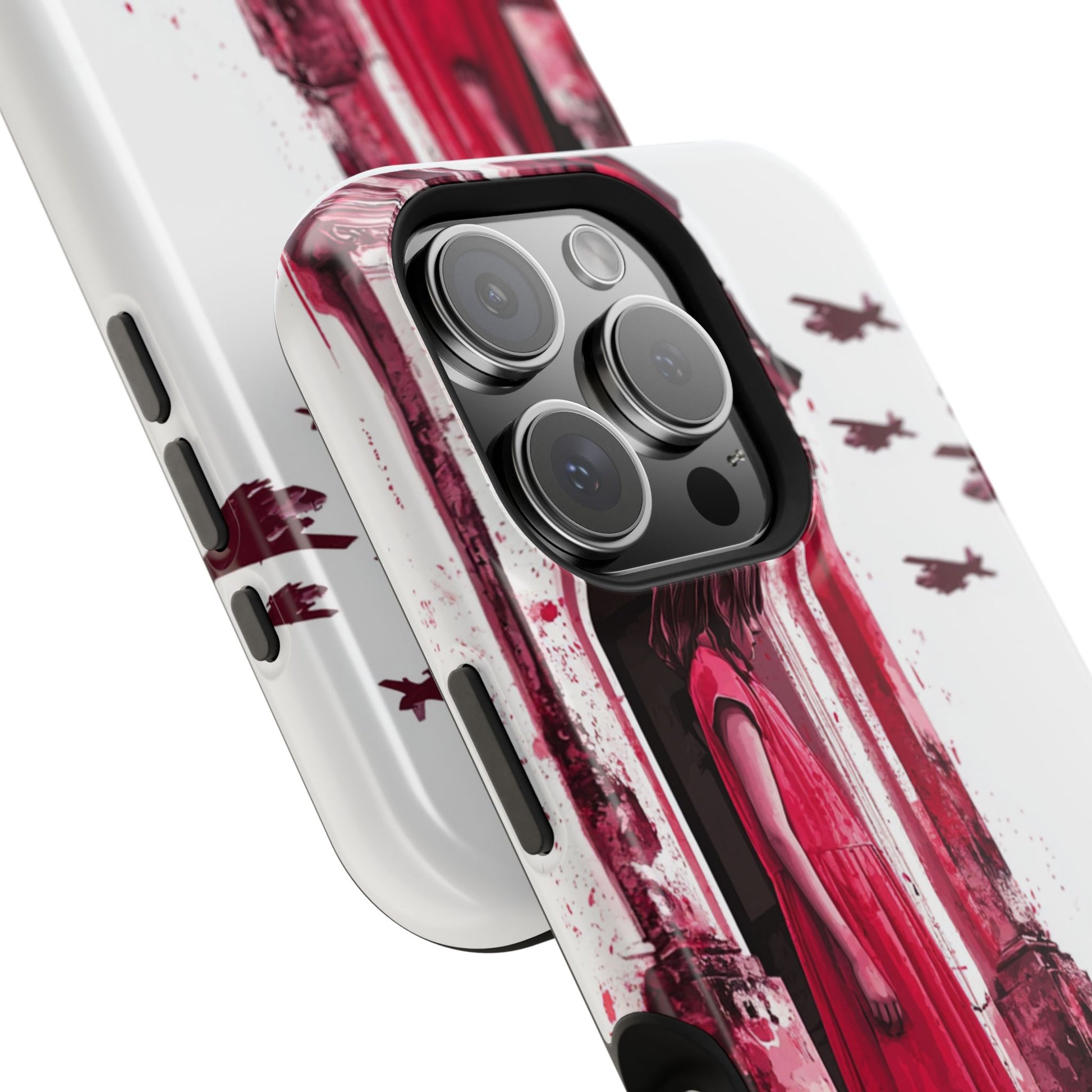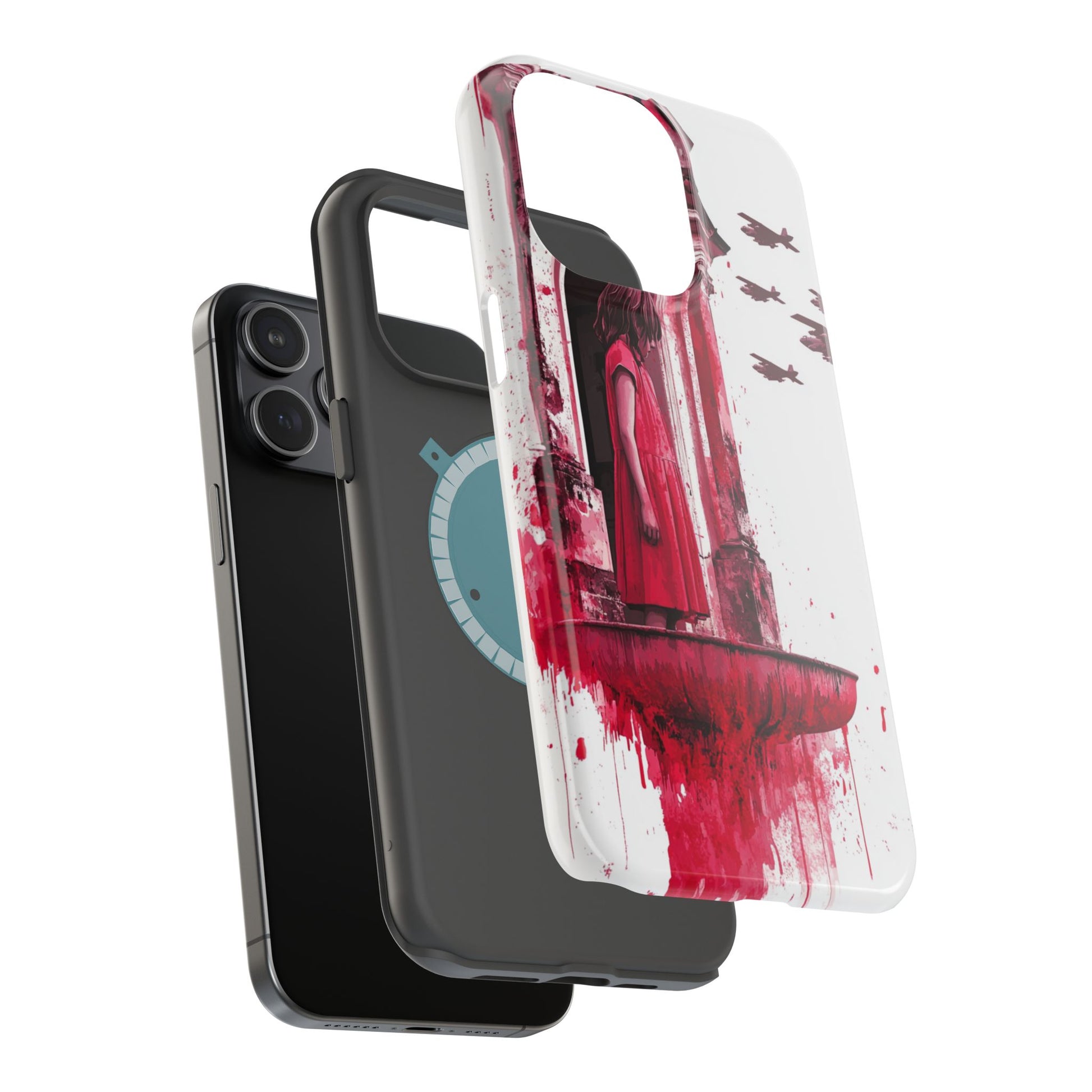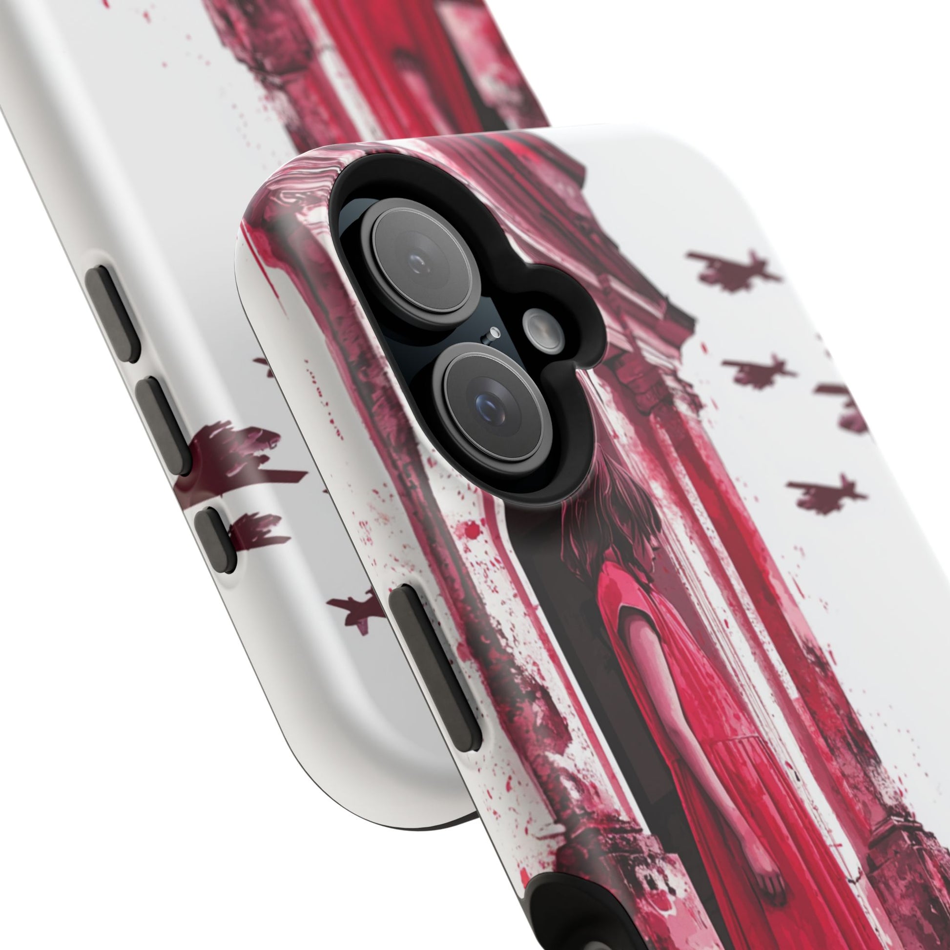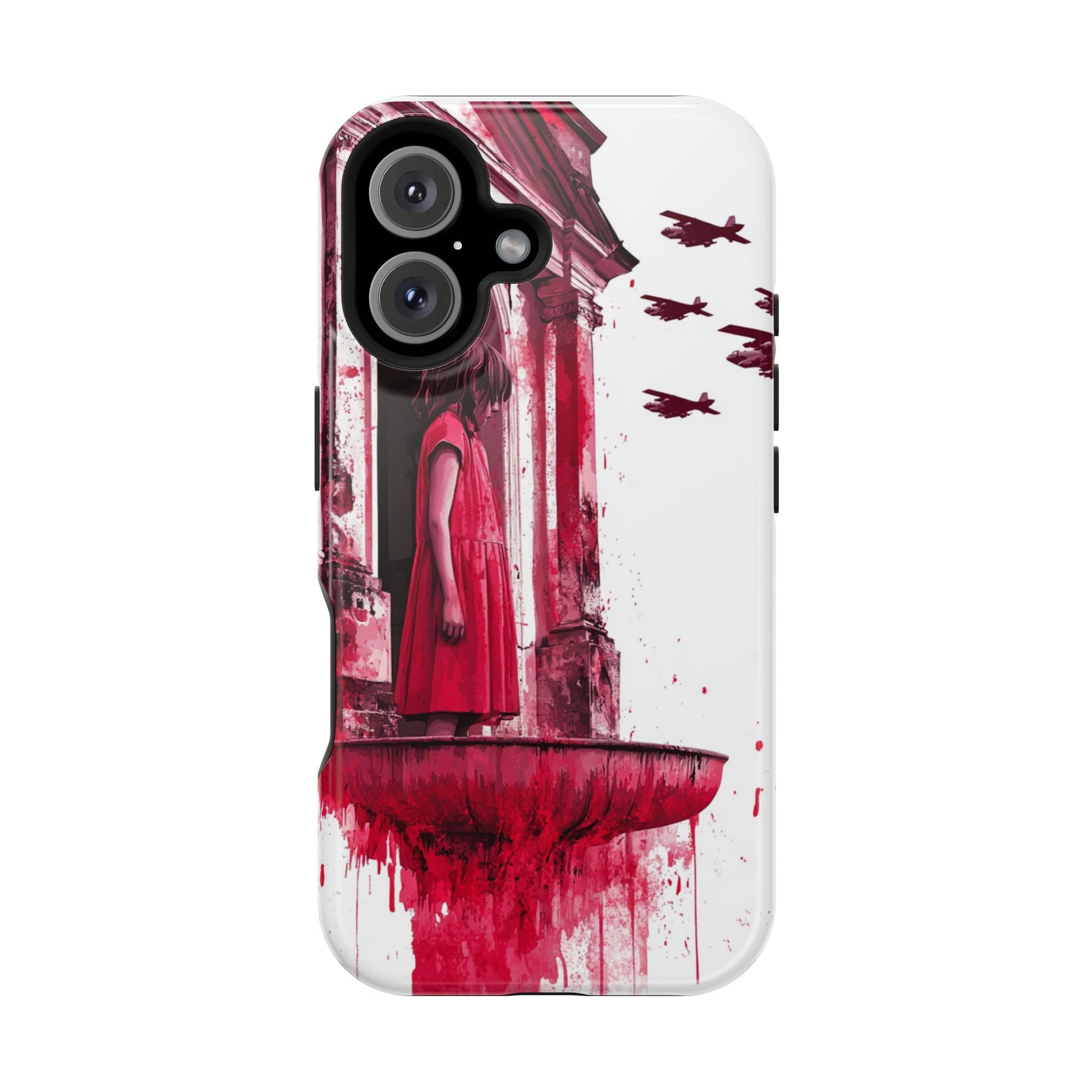 Protect your iPhone with this striking case featuring Moxie-Jay's powerful artwork "Resilience in Ruins." This luxurious case depicts a young girl standing on the ledge of a bombed-out building, her gaze fixed on bomber planes above. The durable polycarbonate construction shields your device from impacts and scratches, while built-in magnets ensure seamless MagSafe® compatibility for effortless wireless charging.Product features:
