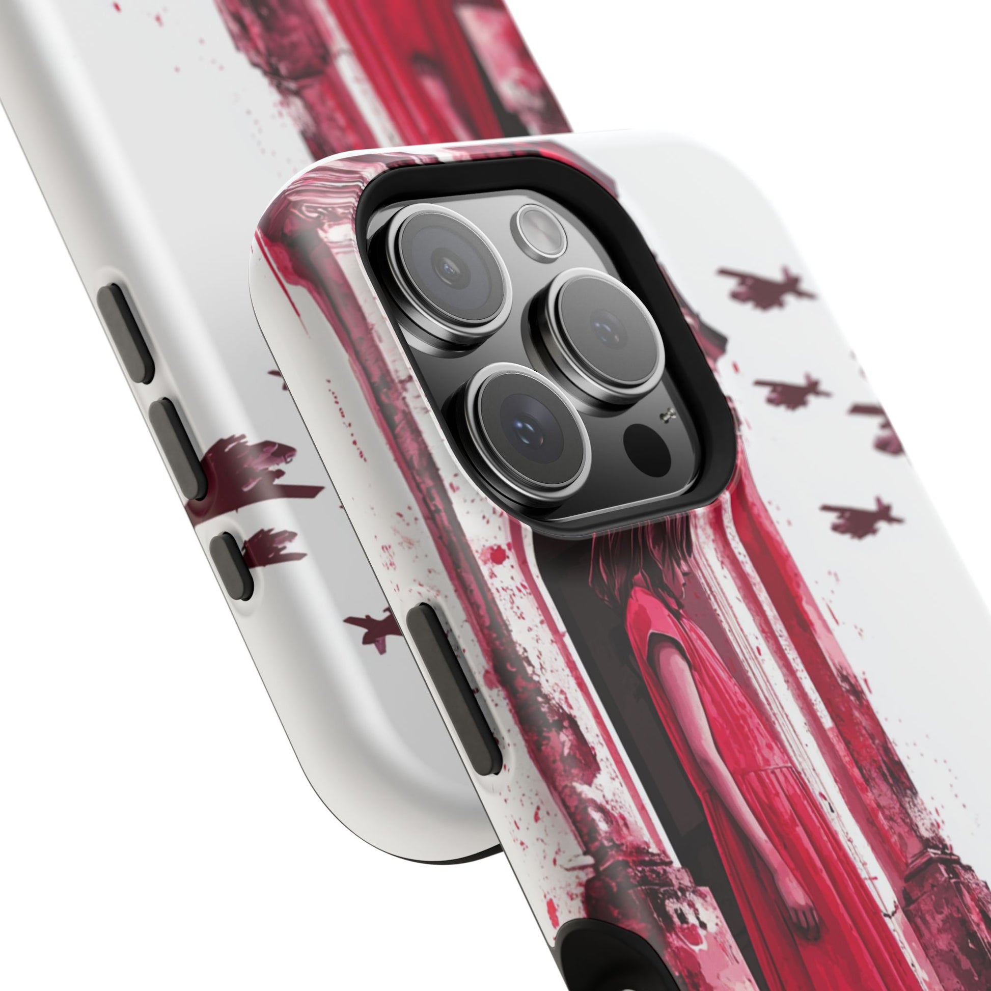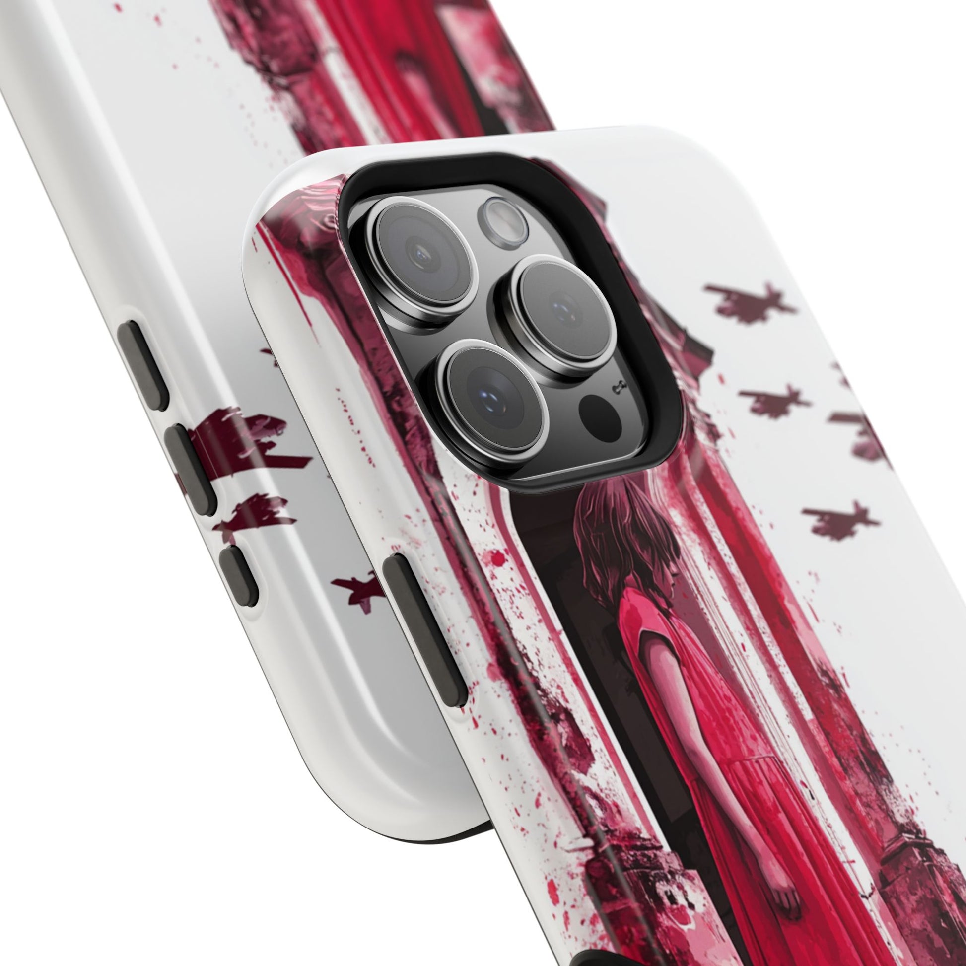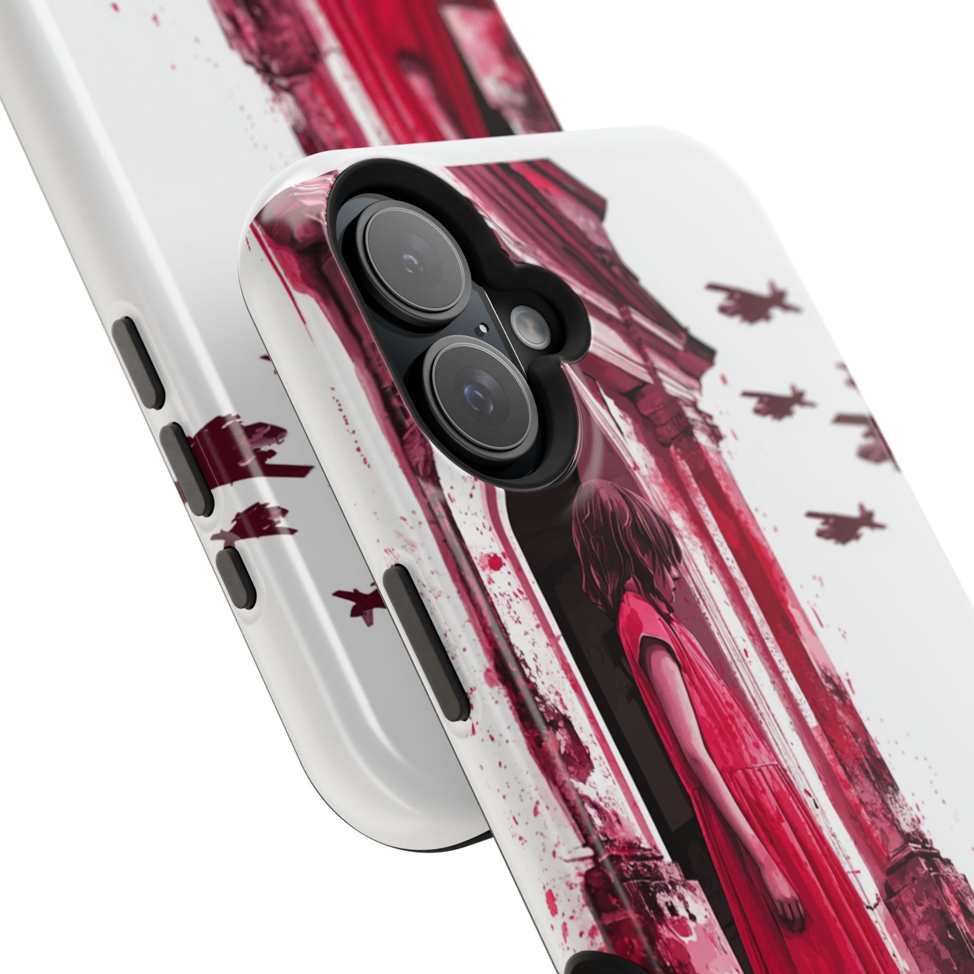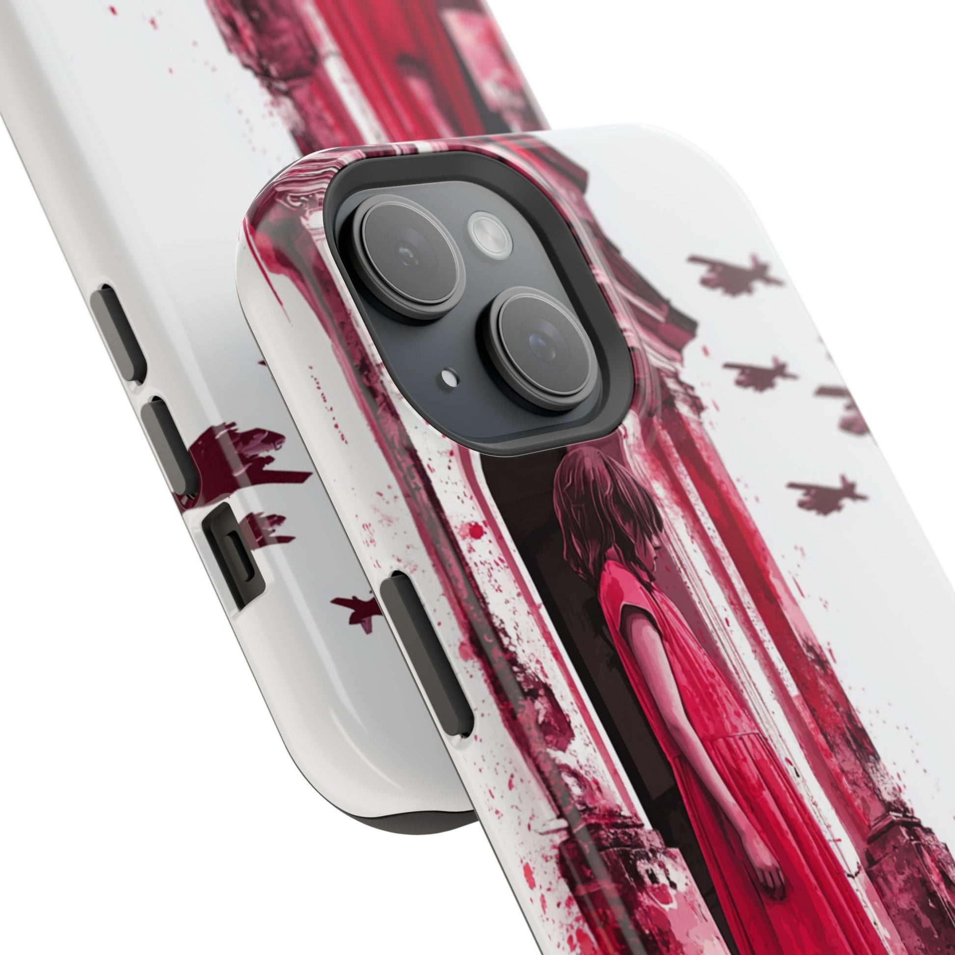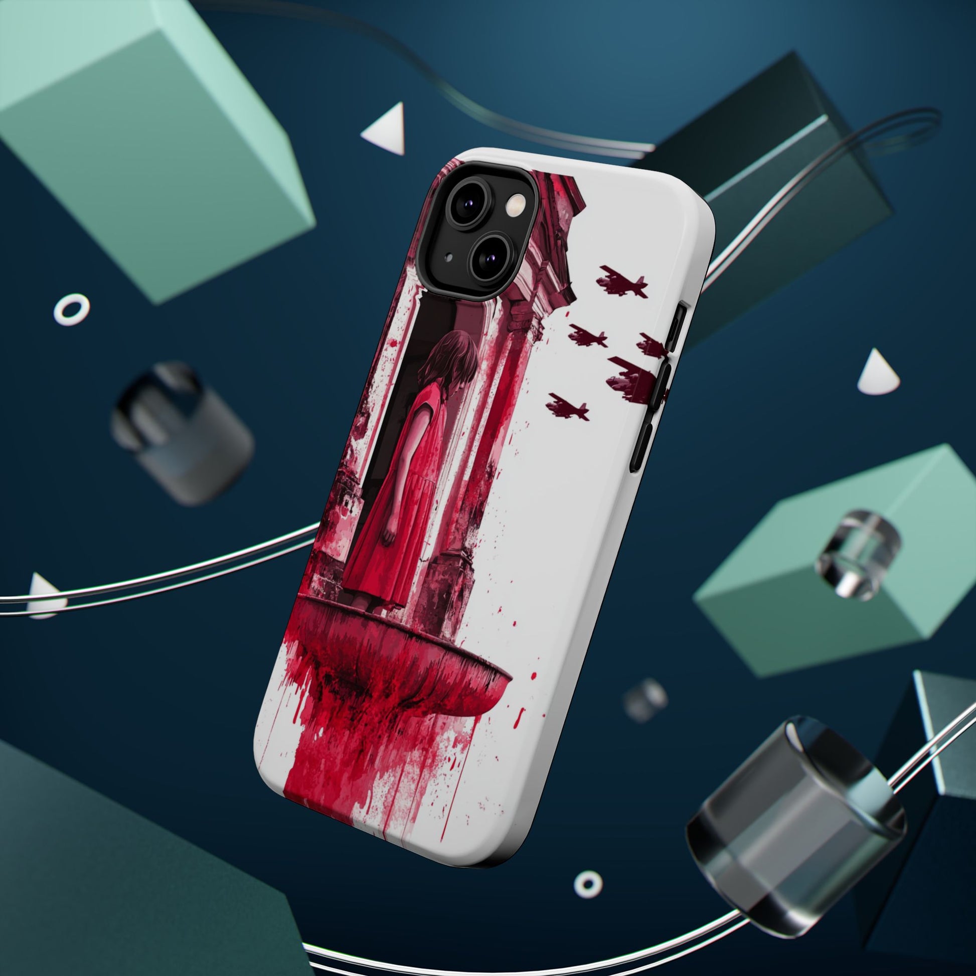 Protect your iPhone with this striking case featuring Moxie-Jay's powerful artwork "Resilience in Ruins." This luxurious case depicts a young girl standing on the ledge of a bombed-out building, her gaze fixed on bomber planes above. The durable polycarbonate construction shields your device from impacts and scratches, while built-in magnets ensure seamless MagSafe® compatibility for effortless wireless charging.Product features: