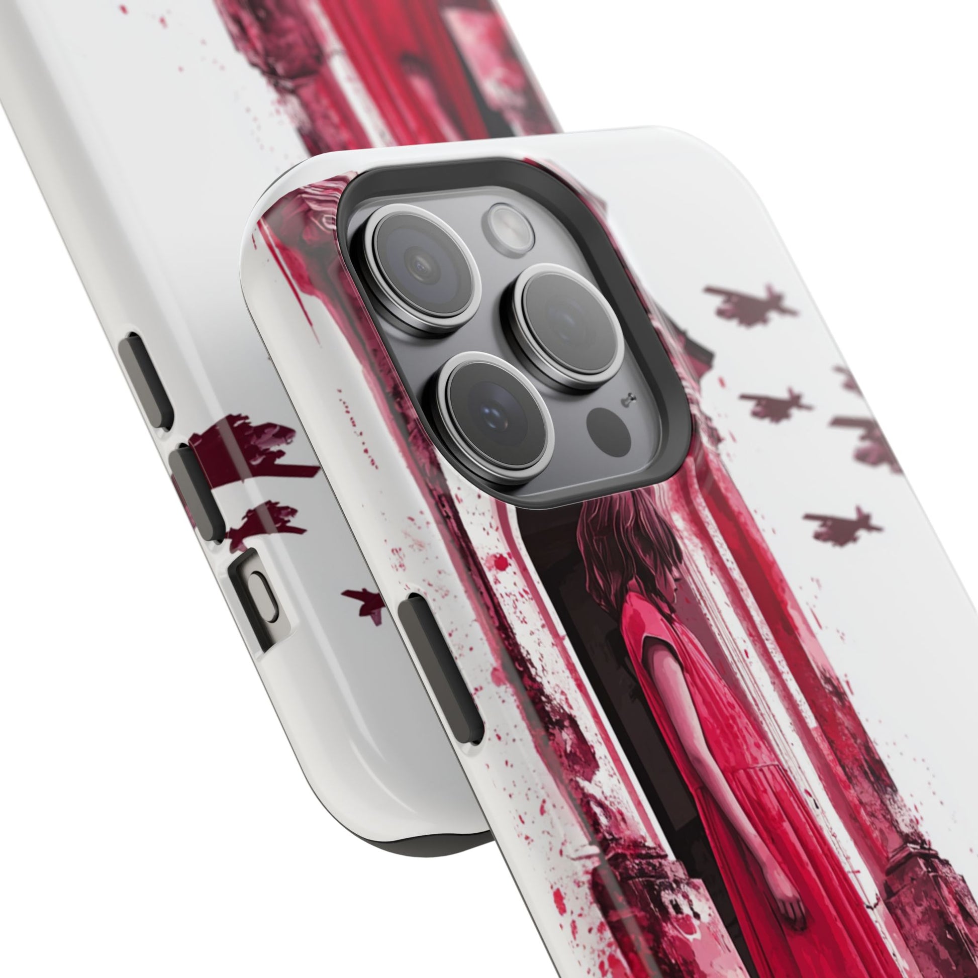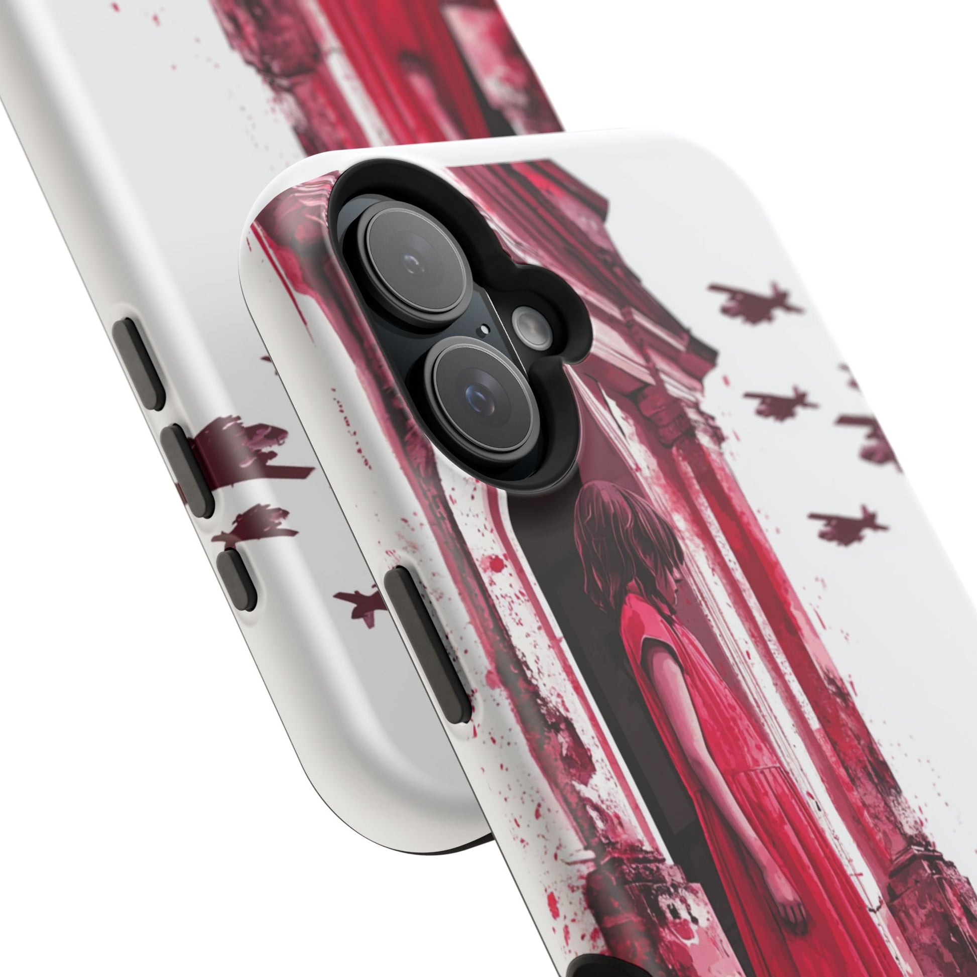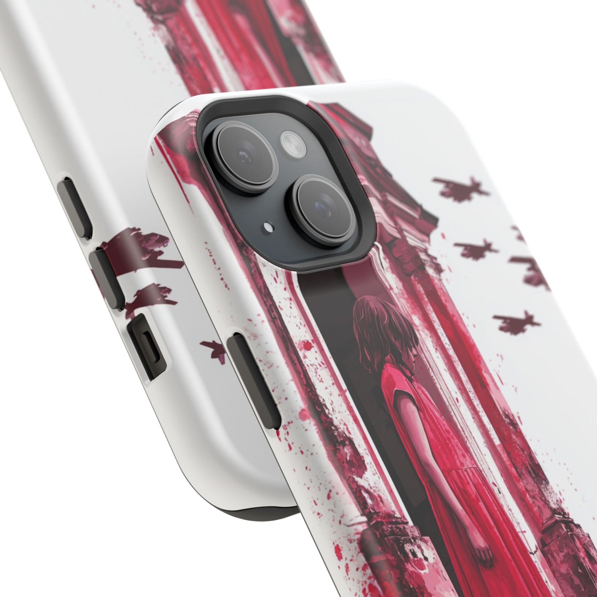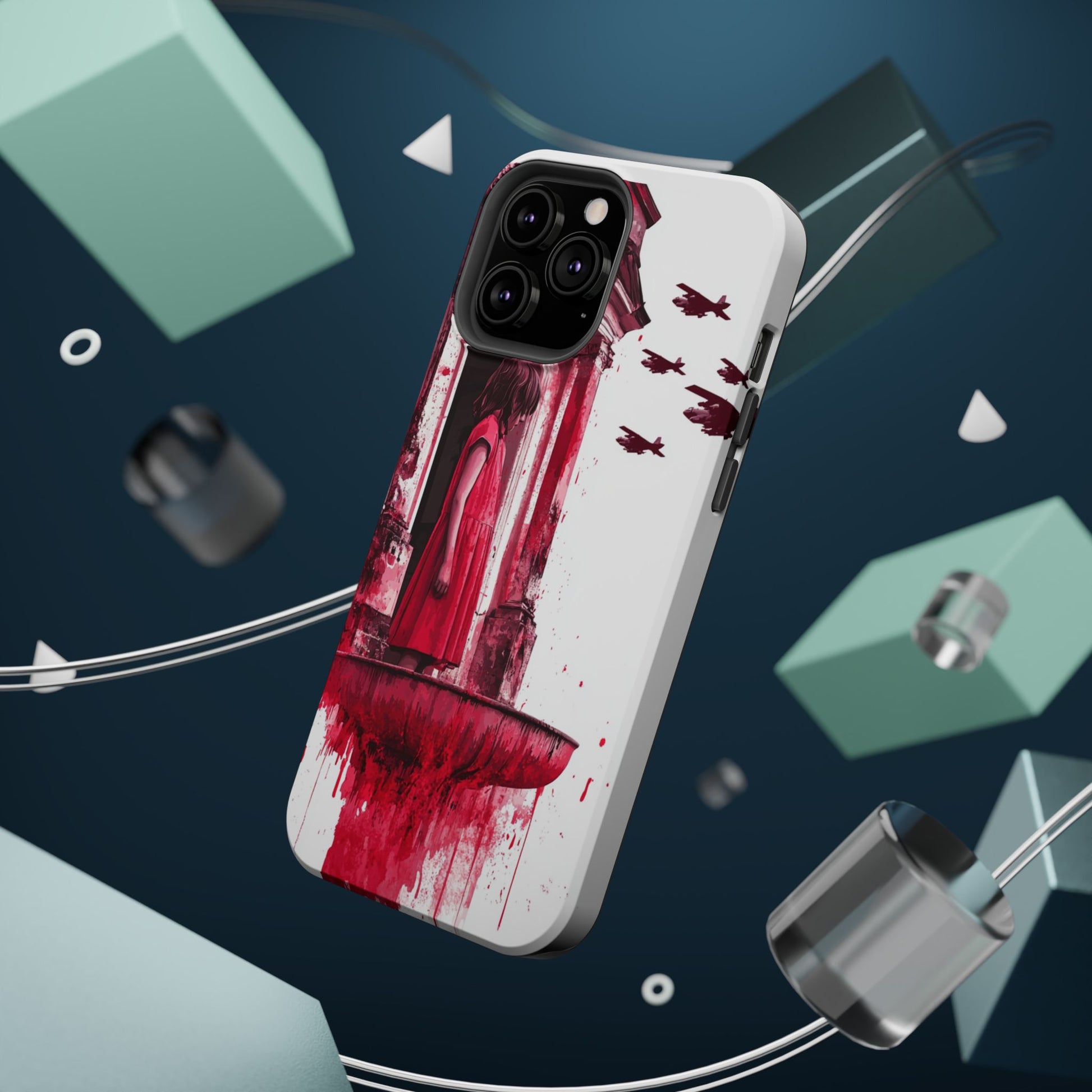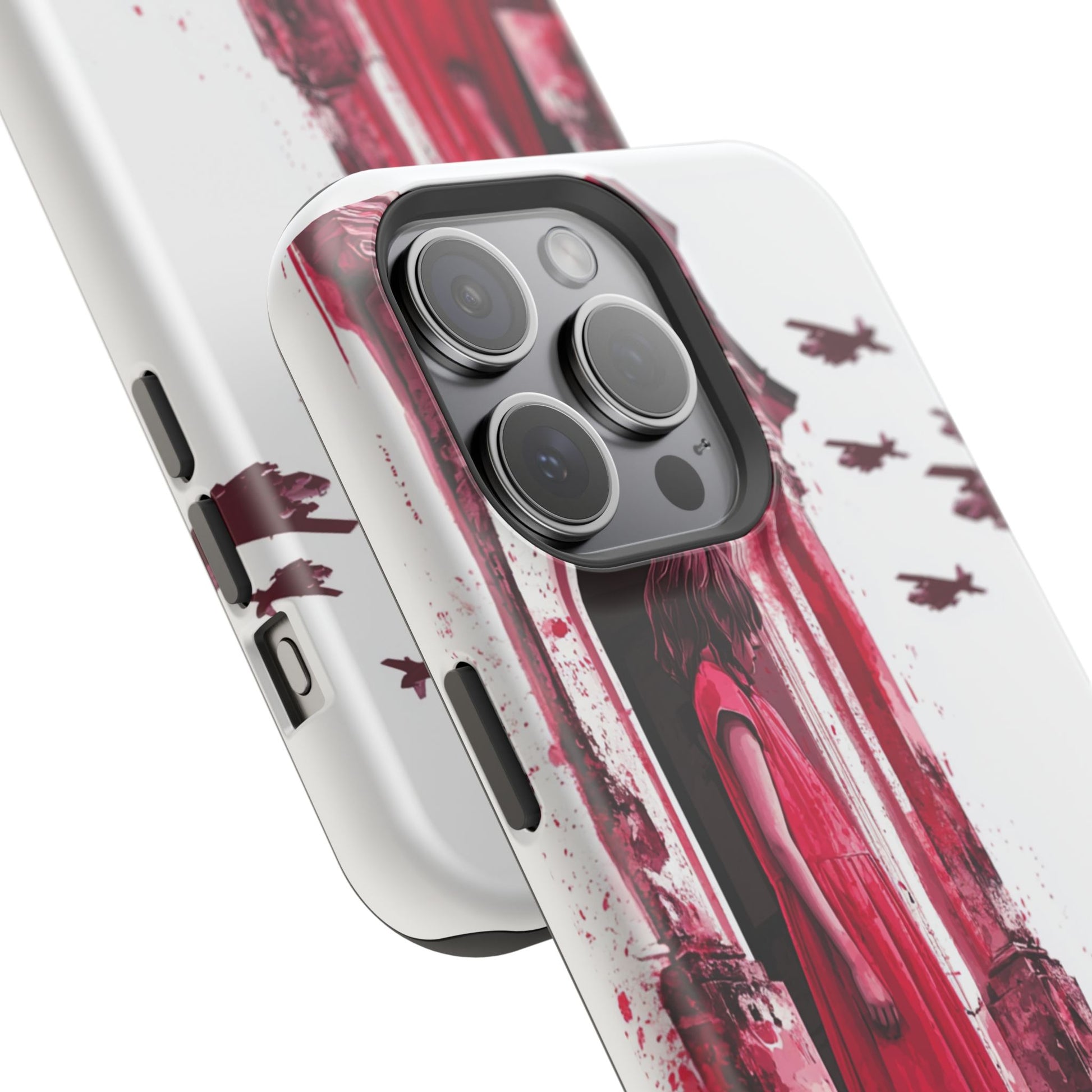 Protect your iPhone with this striking case featuring Moxie-Jay's powerful artwork "Resilience in Ruins." This luxurious case depicts a young girl standing on the ledge of a bombed-out building, her gaze fixed on bomber planes above. The durable polycarbonate construction shields your device from impacts and scratches, while built-in magnets ensure seamless MagSafe® compatibility for effortless wireless charging.Product features: