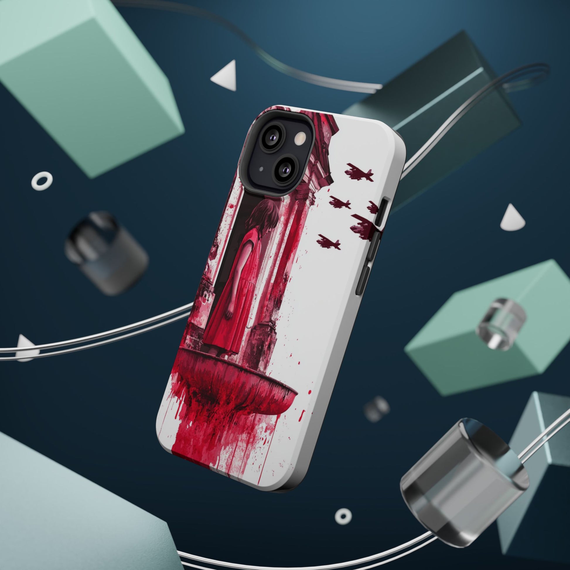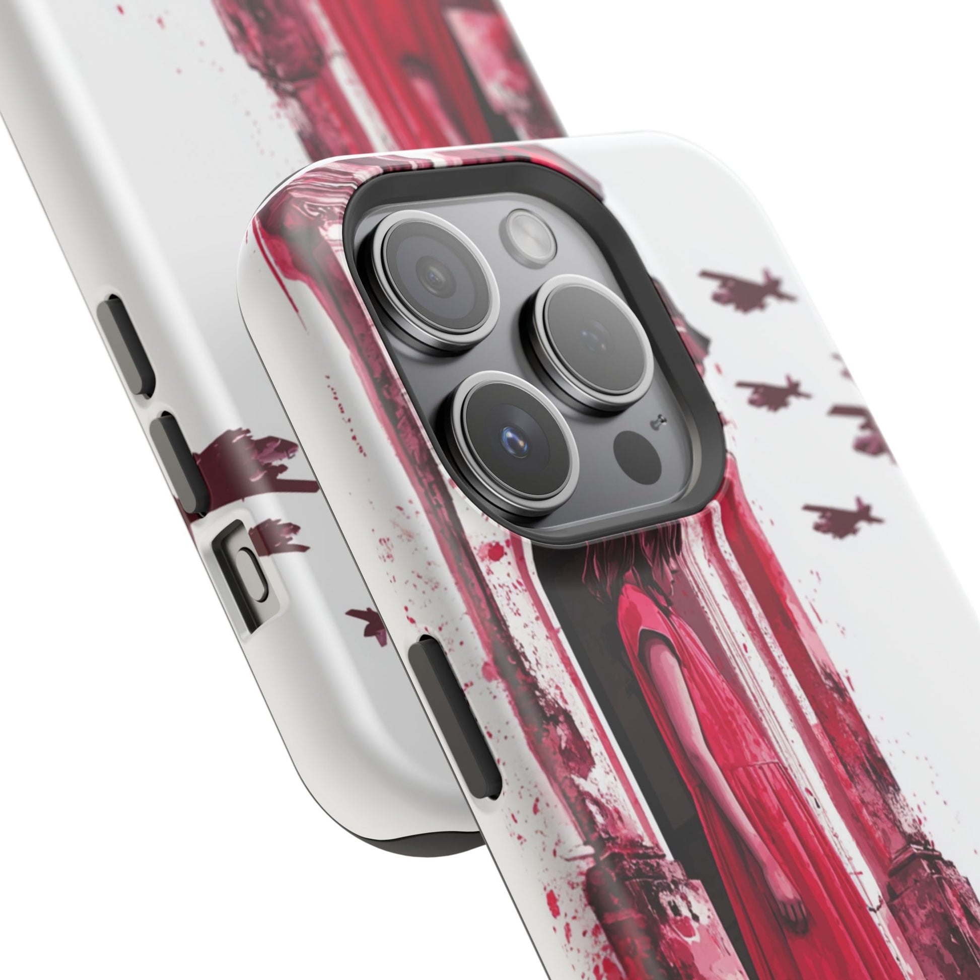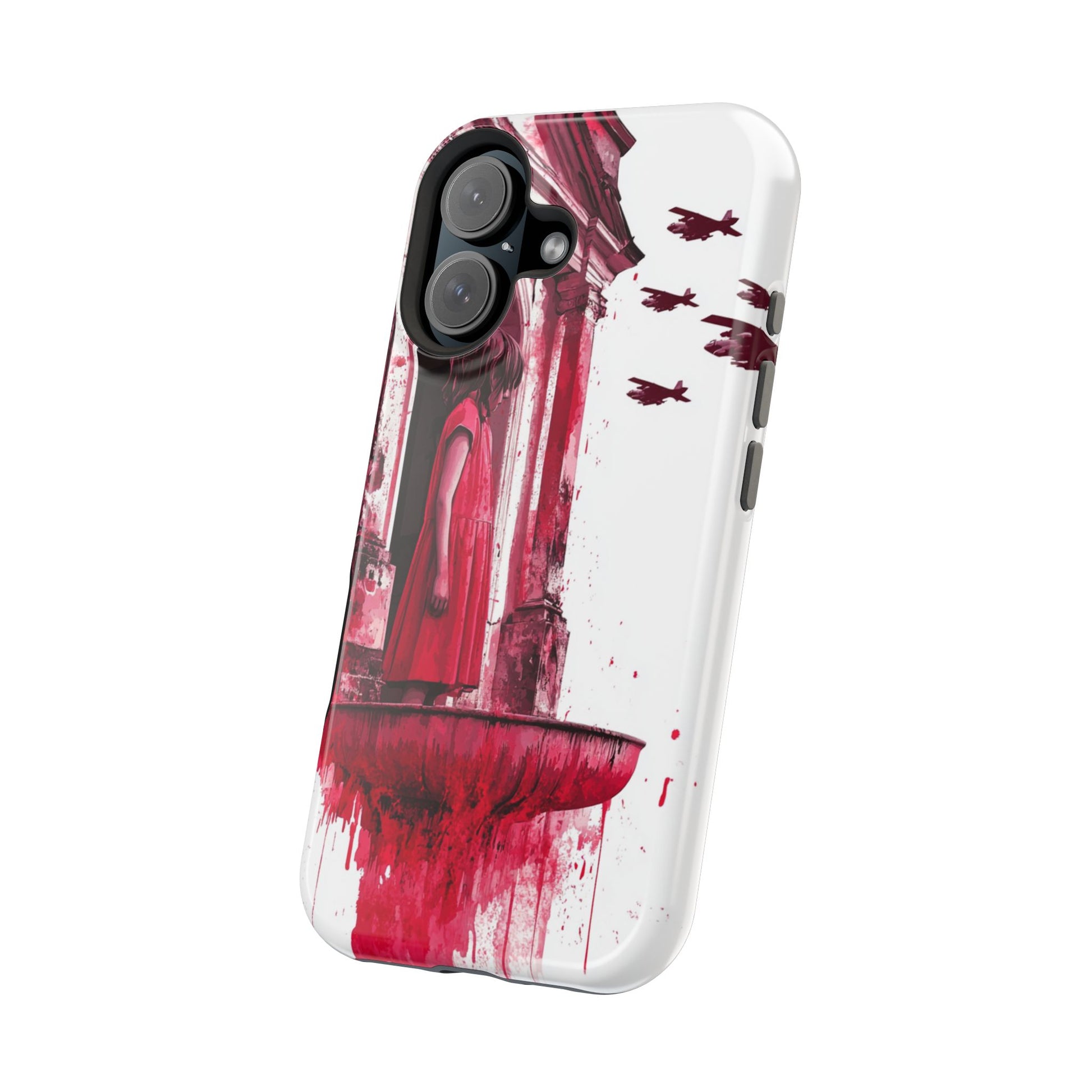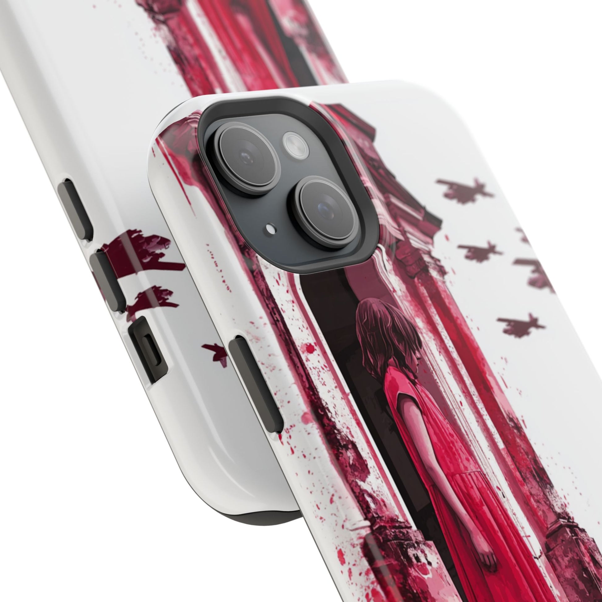 Protect your iPhone with this striking case featuring Moxie-Jay's powerful artwork "Resilience in Ruins." This luxurious case depicts a young girl standing on the ledge of a bombed-out building, her gaze fixed on bomber planes above. The durable polycarbonate construction shields your device from impacts and scratches, while built-in magnets ensure seamless MagSafe® compatibility for effortless wireless charging.Product features: