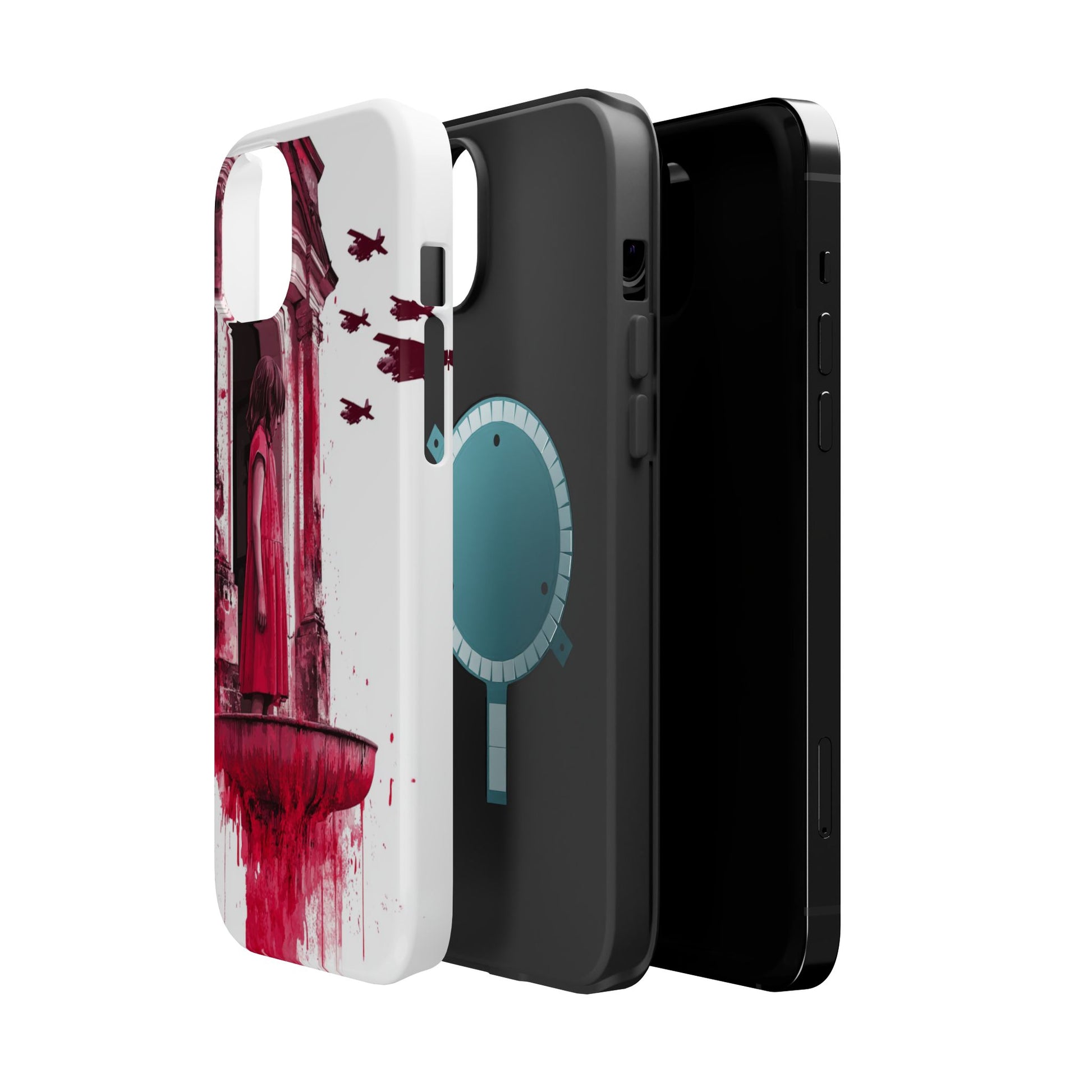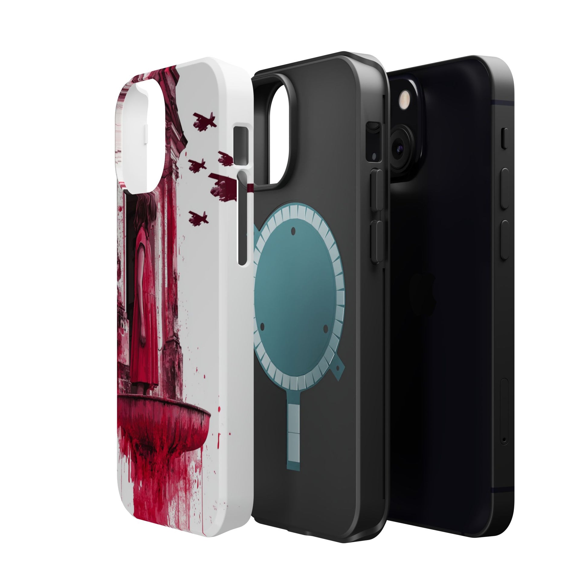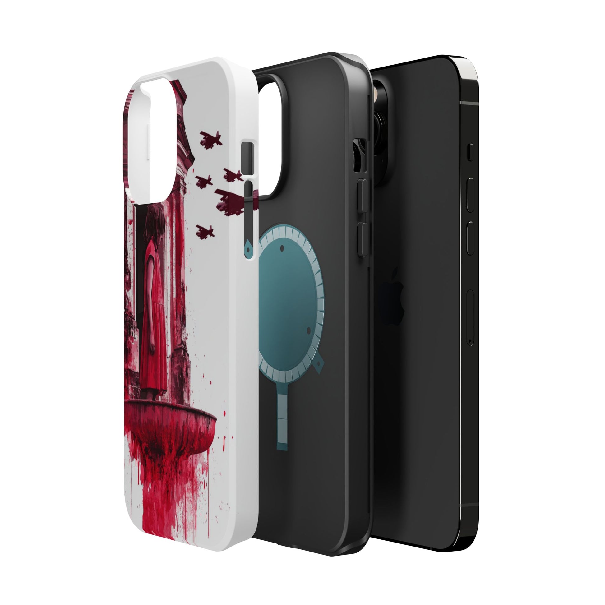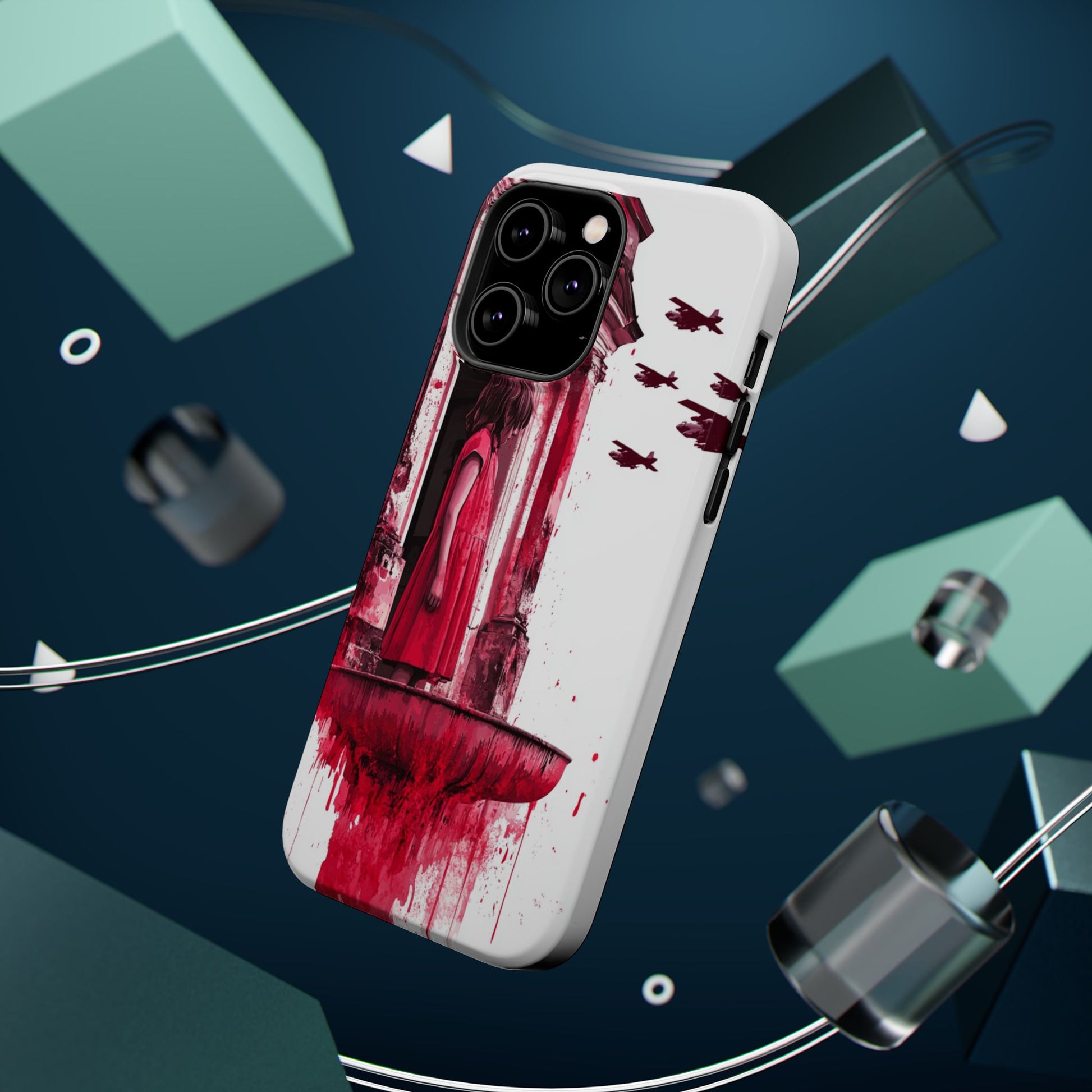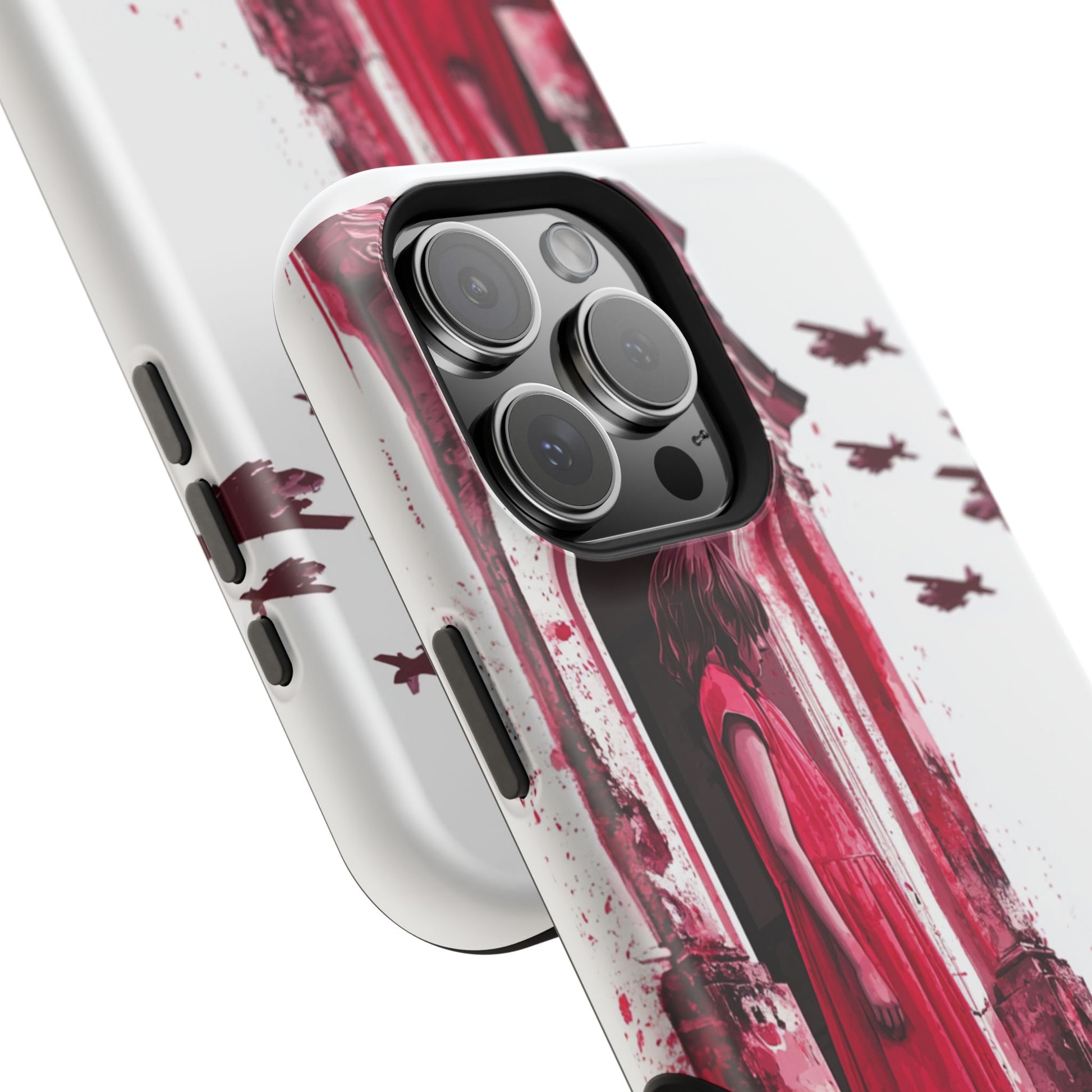 Protect your iPhone with this striking case featuring Moxie-Jay's powerful artwork "Resilience in Ruins." This luxurious case depicts a young girl standing on the ledge of a bombed-out building, her gaze fixed on bomber planes above. The durable polycarbonate construction shields your device from impacts and scratches, while built-in magnets ensure seamless MagSafe® compatibility for effortless wireless charging.Product features: