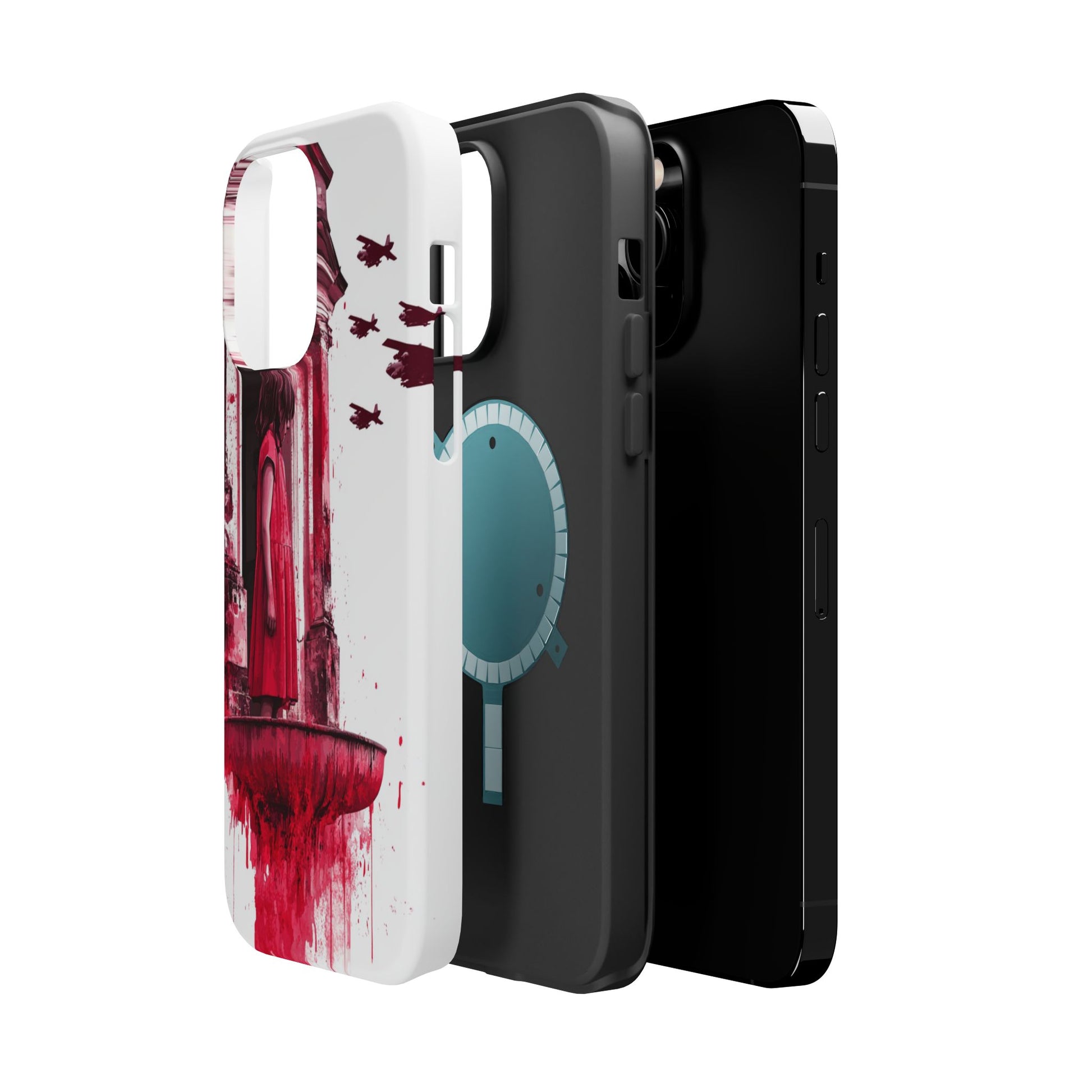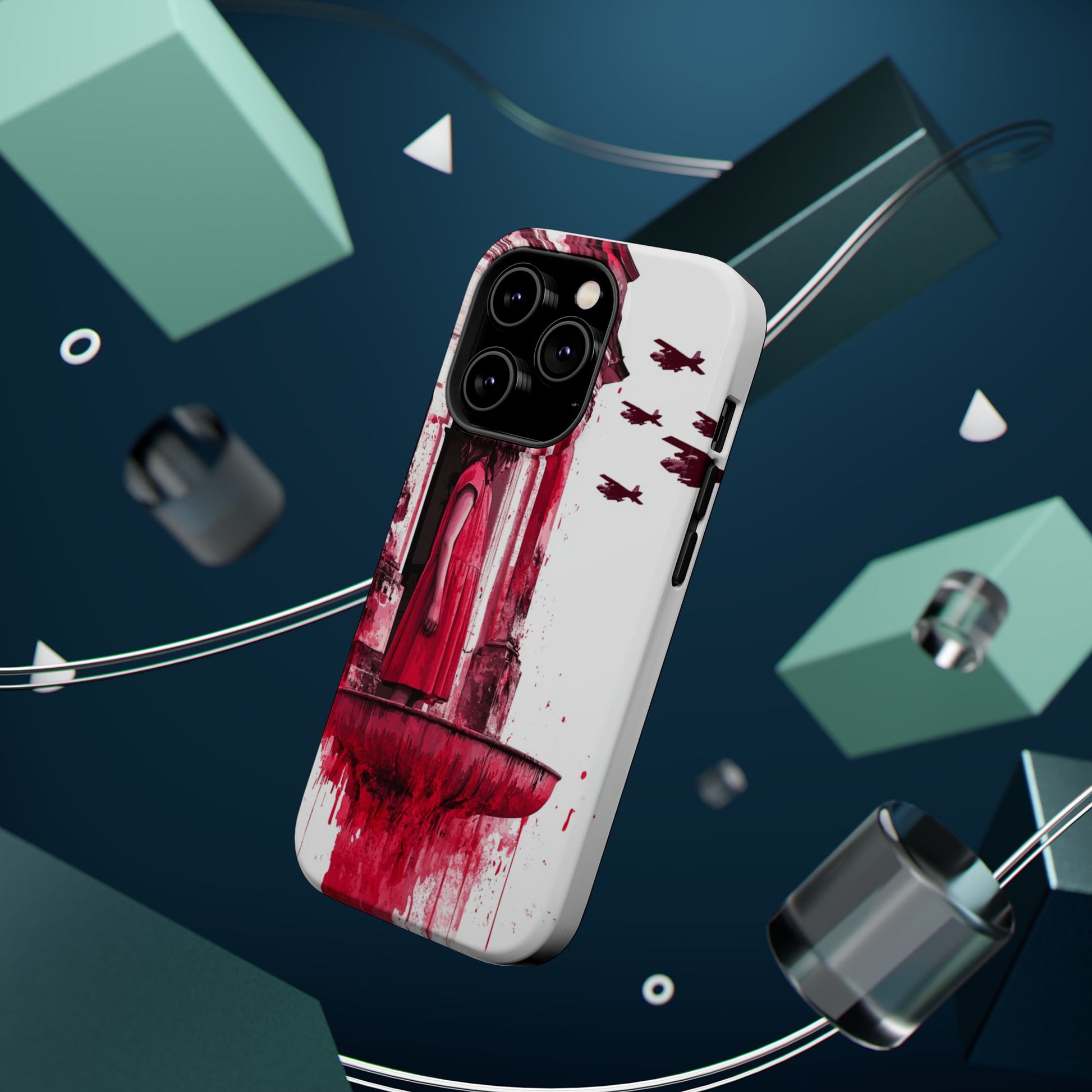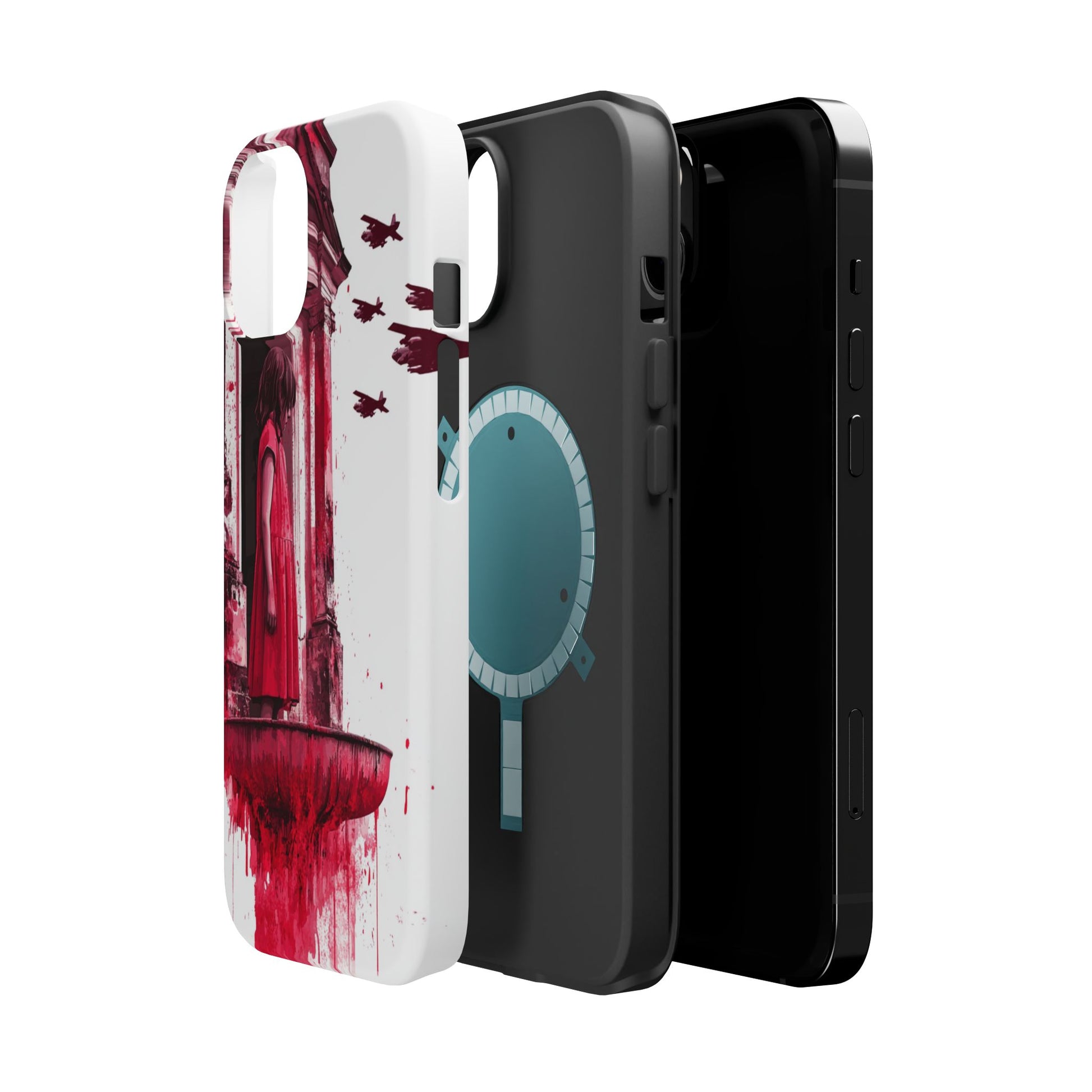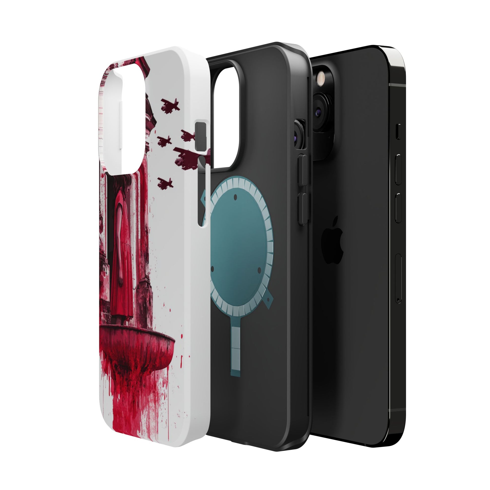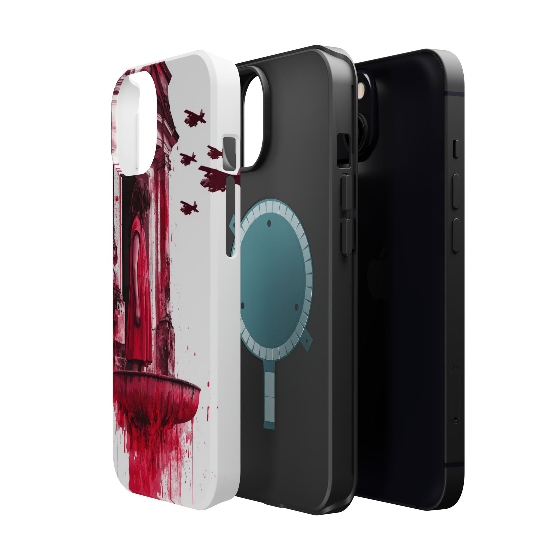 Protect your iPhone with this striking case featuring Moxie-Jay's powerful artwork "Resilience in Ruins." This luxurious case depicts a young girl standing on the ledge of a bombed-out building, her gaze fixed on bomber planes above. The durable polycarbonate construction shields your device from impacts and scratches, while built-in magnets ensure seamless MagSafe® compatibility for effortless wireless charging.Product features: