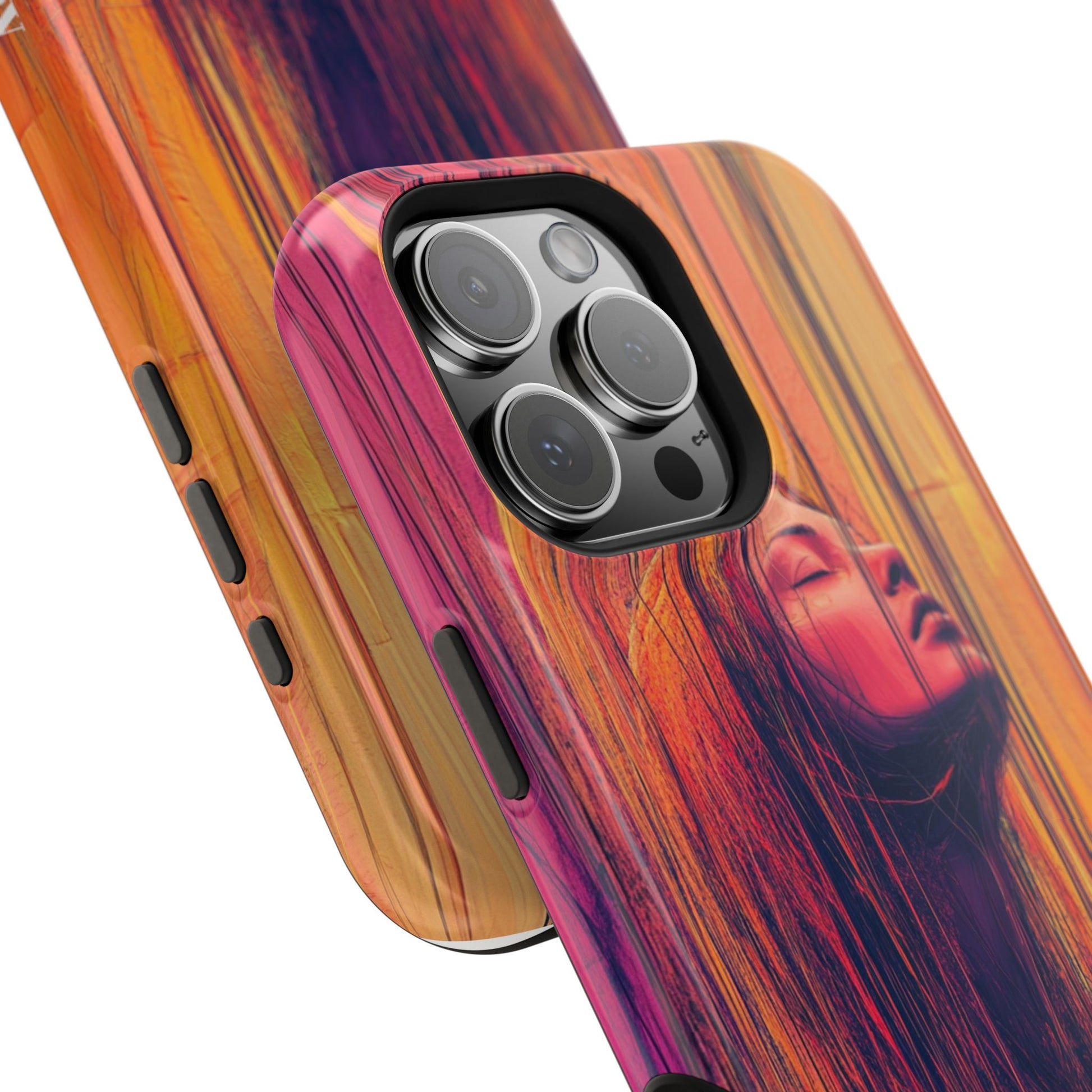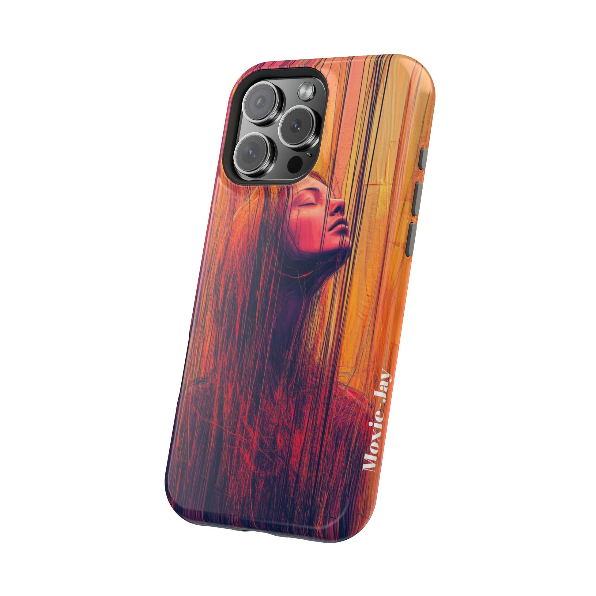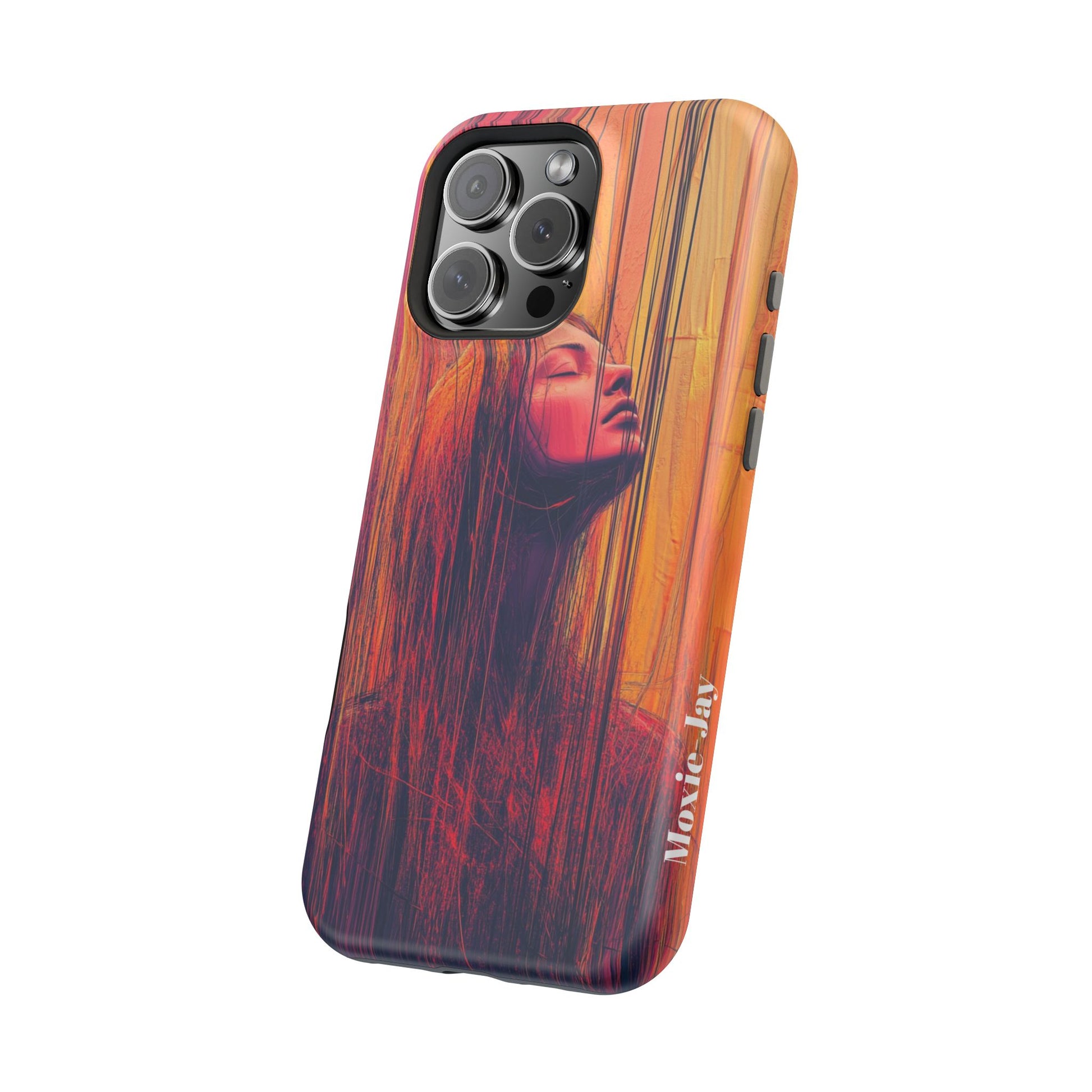 Immerse your iPhone in vibrant artistry with our "Crimson Cascade" case, featuring a mesmerizing piece by Moxie Jay. This luxurious case showcases a woman in a shower of reds and oranges, painted in a striking, contemporary style. This durable polycarbonate case offers extra protection against scratches and minor bumps, with vibrant colors and glossy or matte surface options. The interior magnets make it MagSafe® Compatible for easy charging with MagSafe® accessories.Product features: