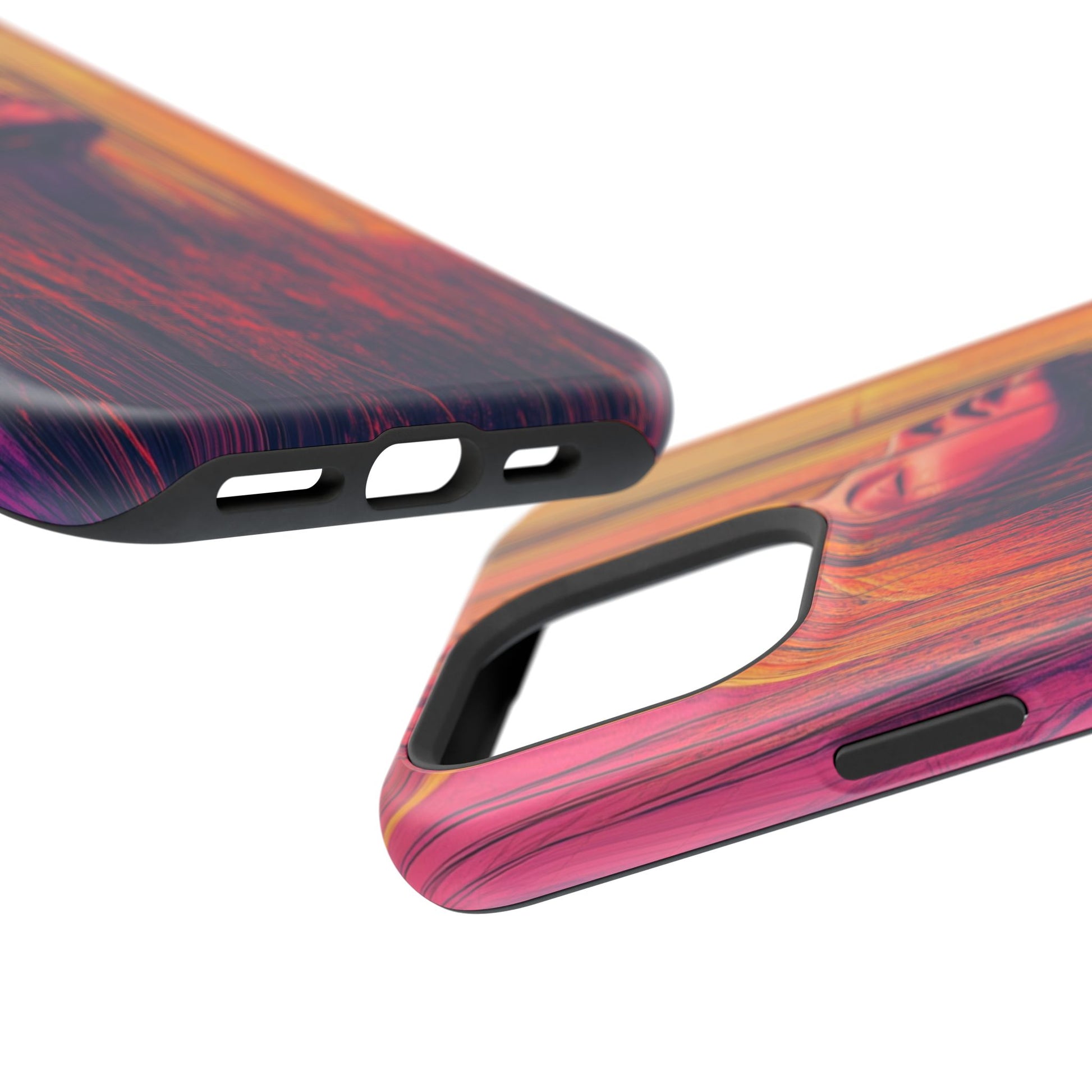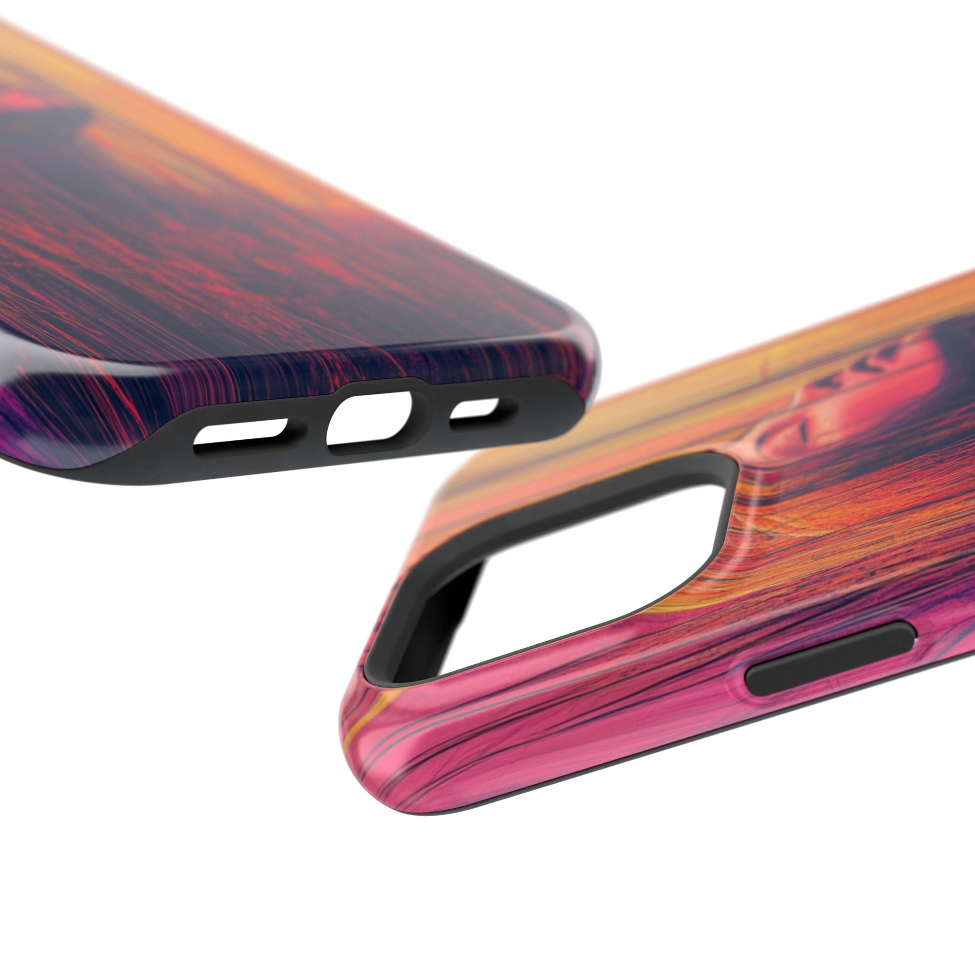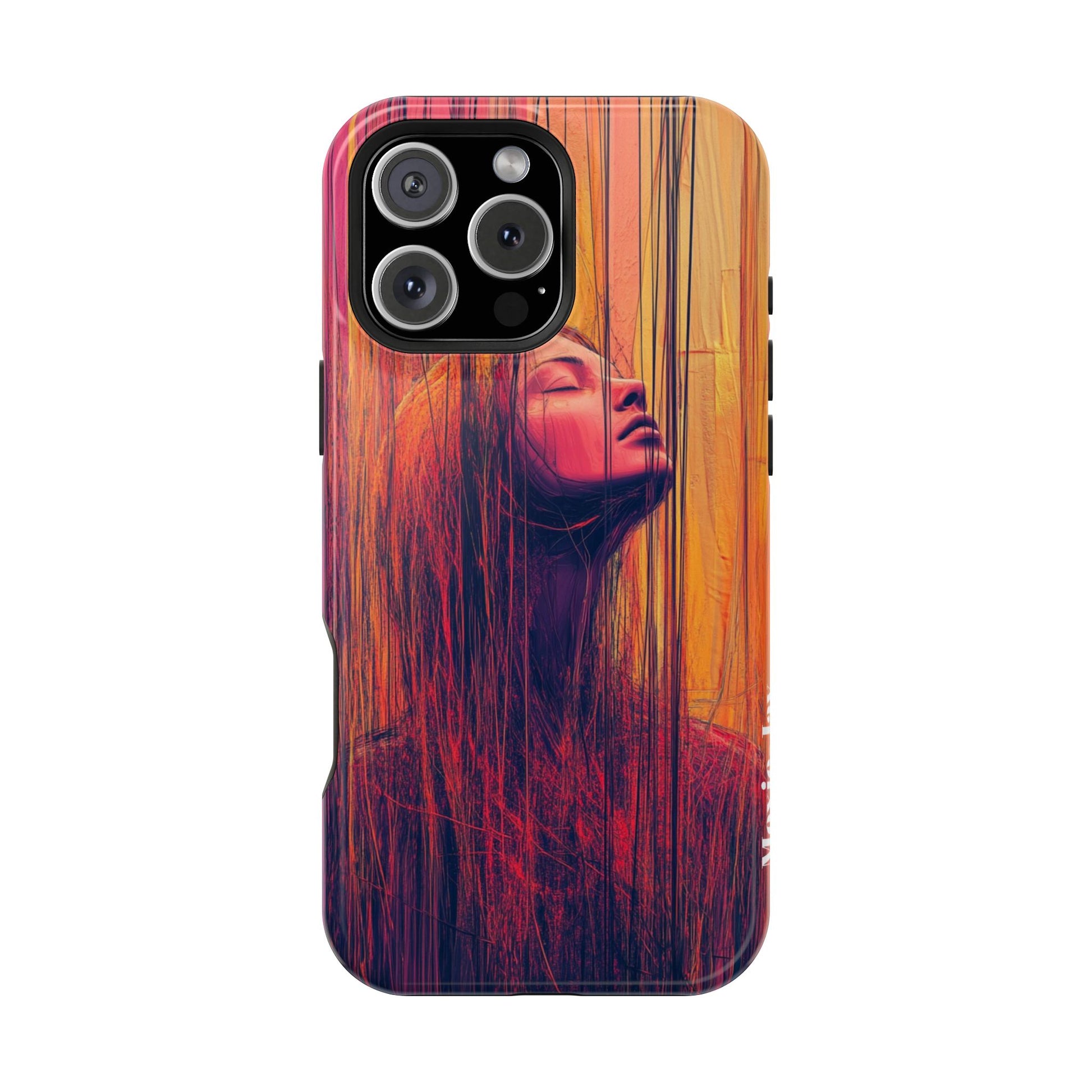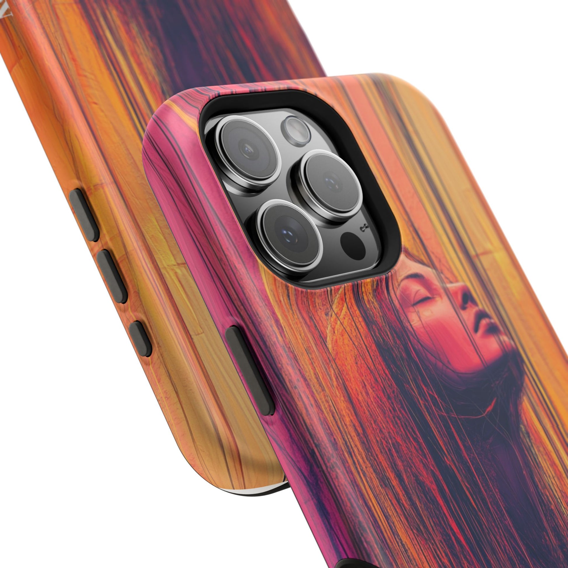 Immerse your iPhone in vibrant artistry with our "Crimson Cascade" case, featuring a mesmerizing piece by Moxie Jay. This luxurious case showcases a woman in a shower of reds and oranges, painted in a striking, contemporary style. This durable polycarbonate case offers extra protection against scratches and minor bumps, with vibrant colors and glossy or matte surface options. The interior magnets make it MagSafe® Compatible for easy charging with MagSafe® accessories.Product features: