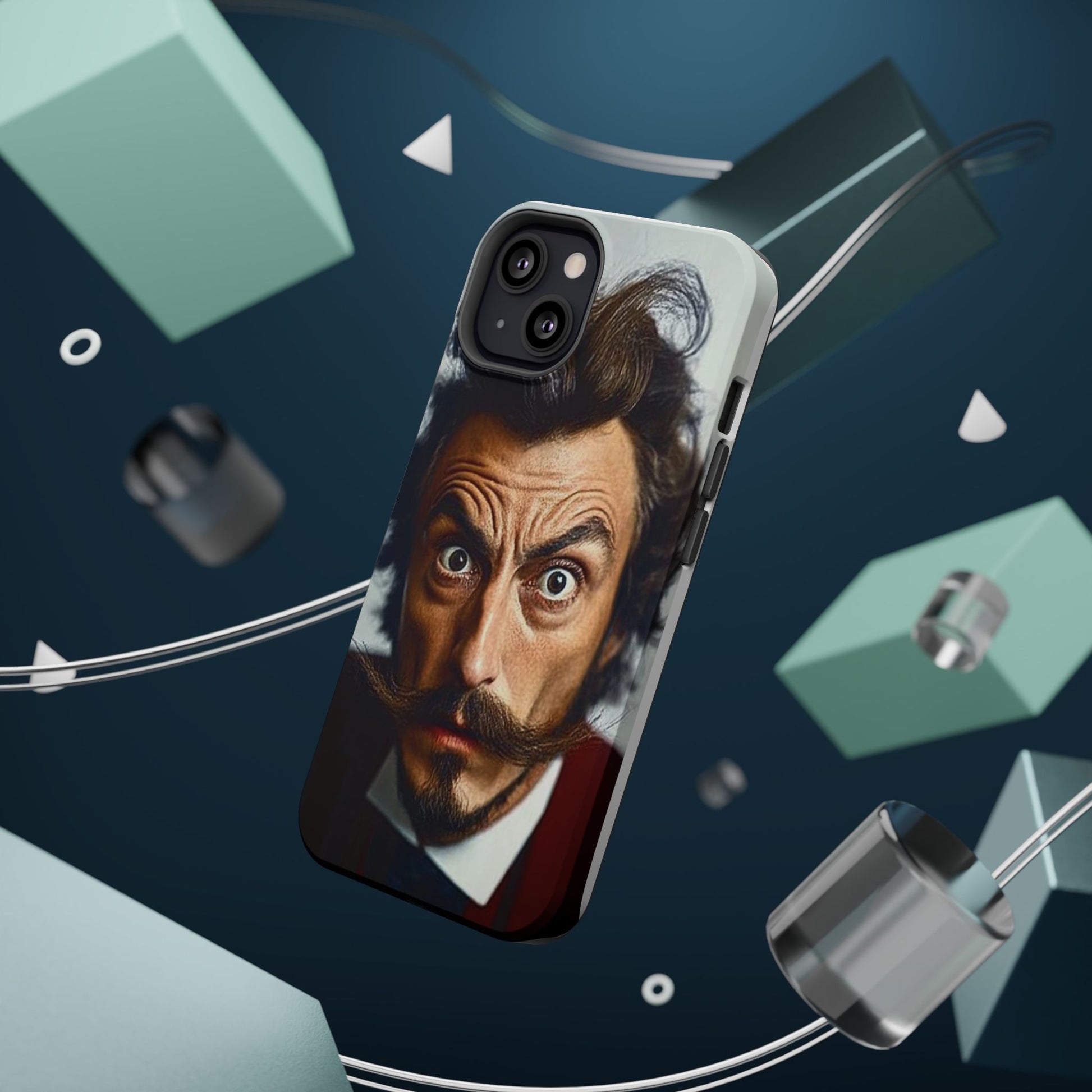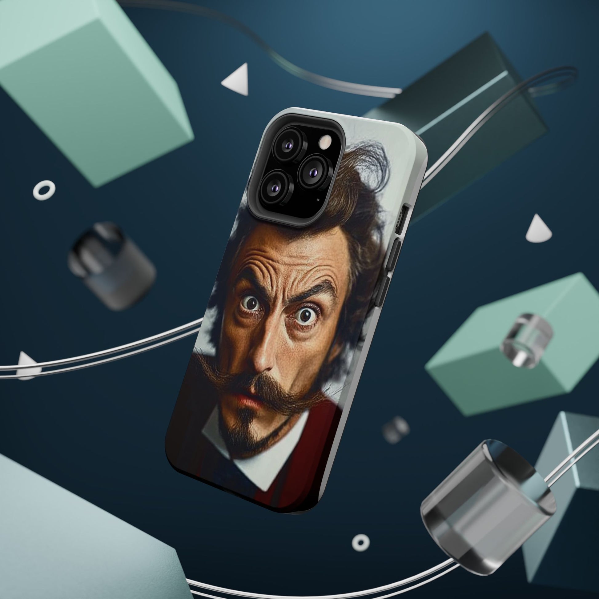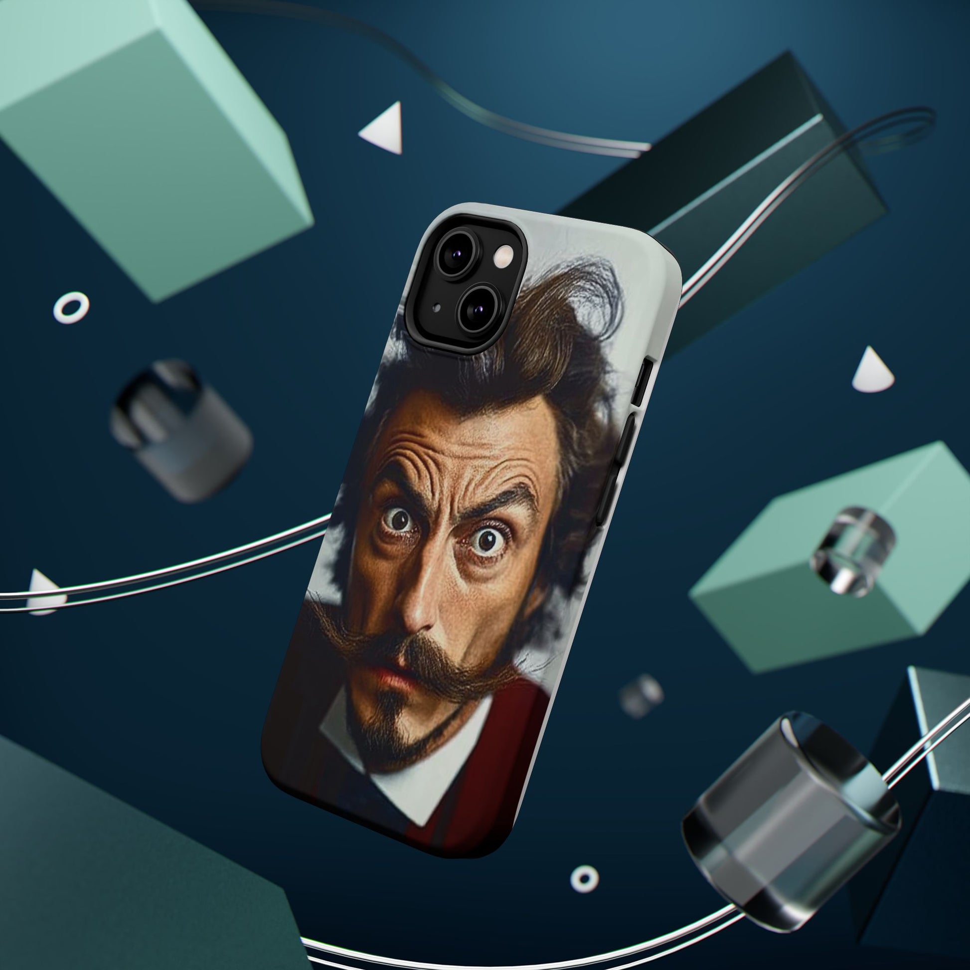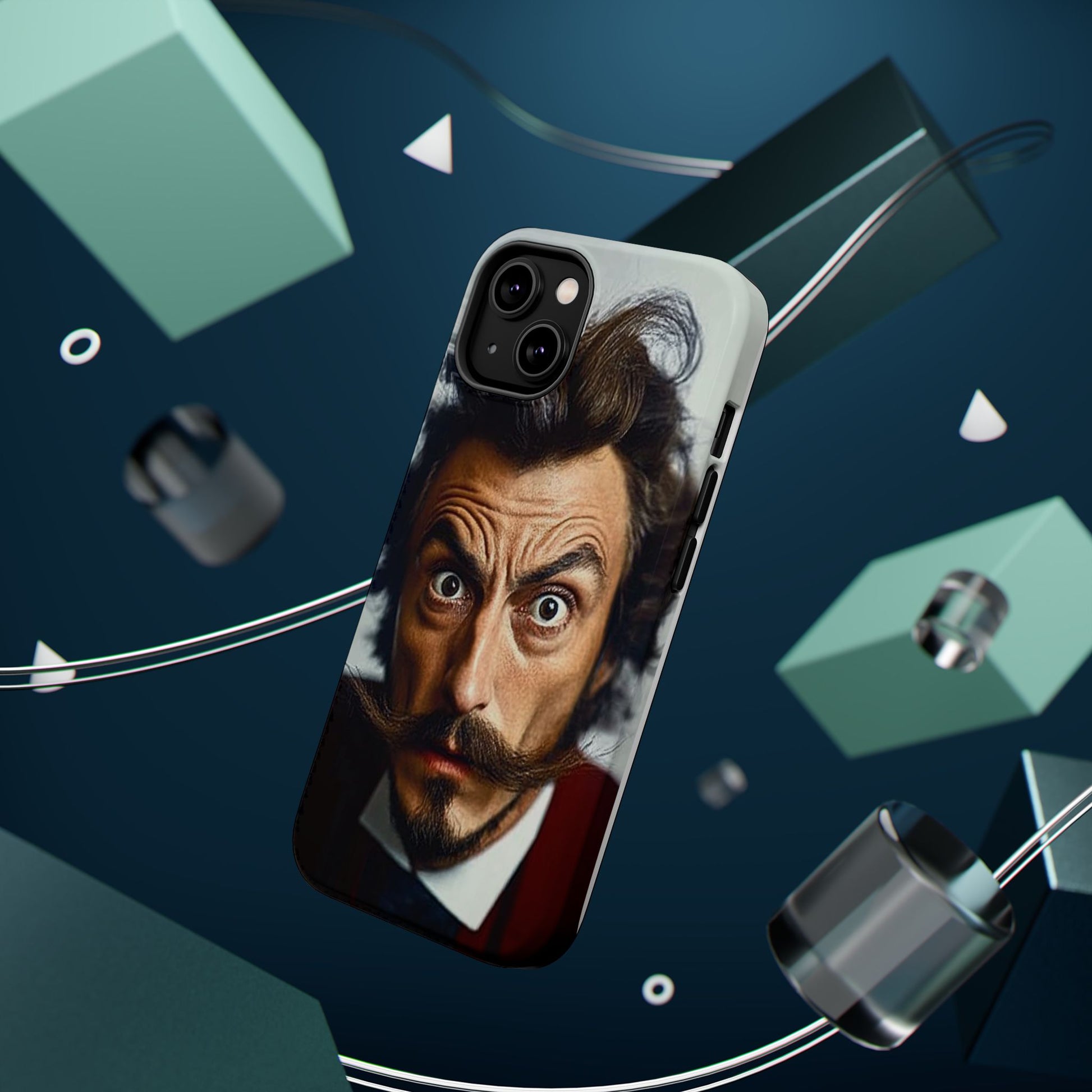 Protect your phone in style with the Luxurious Magnetic Wireless Charging Tough iPhone Case, featuring an exclusive artwork by Moxie-Jay. This design showcases a captivating close-up of Salvador Dali in a semi-circular composition, paired with an additional artistic touch of a hand scratching a bright red record. Combining art and functionality, this case is perfect for art enthusiasts and those seeking premium phone protection.