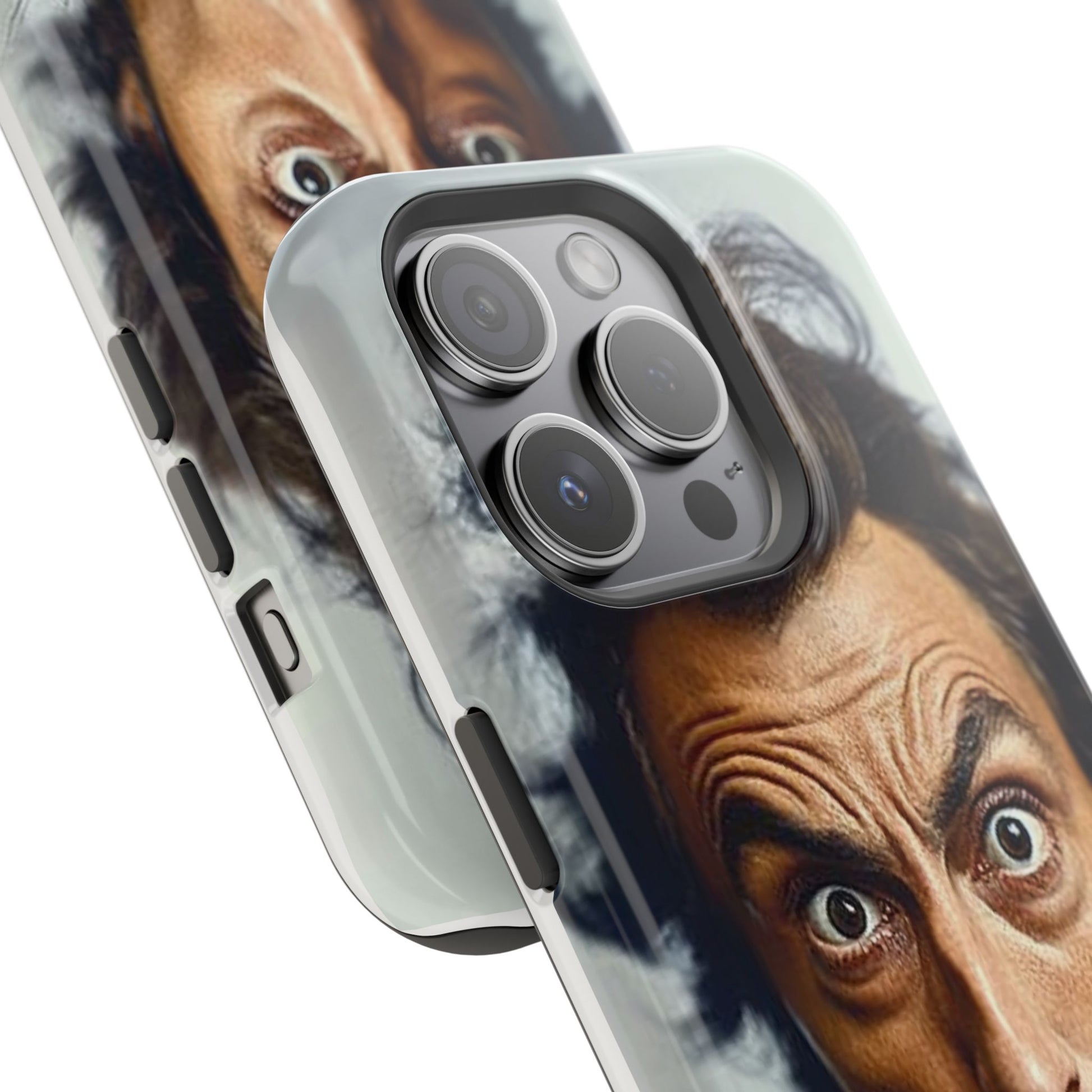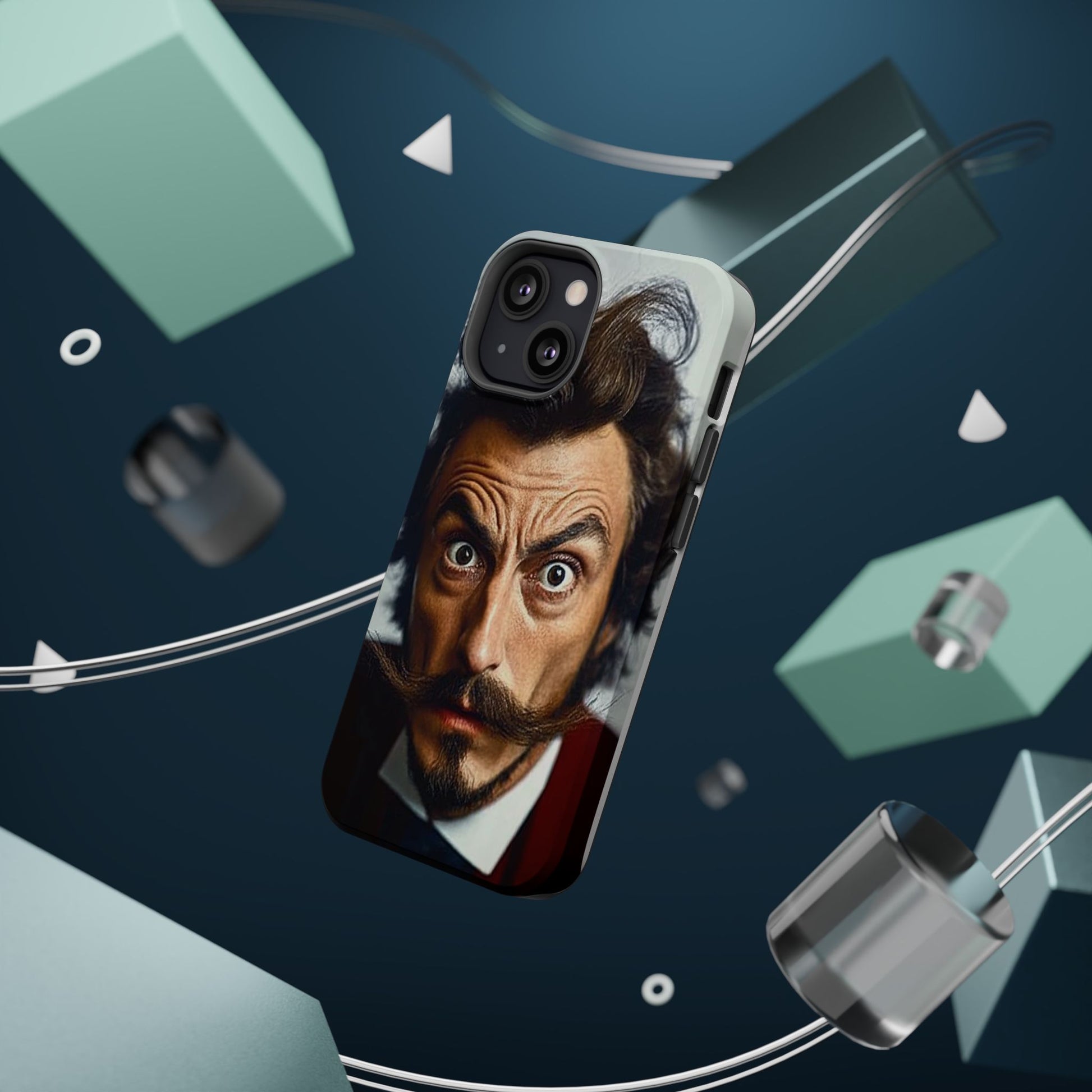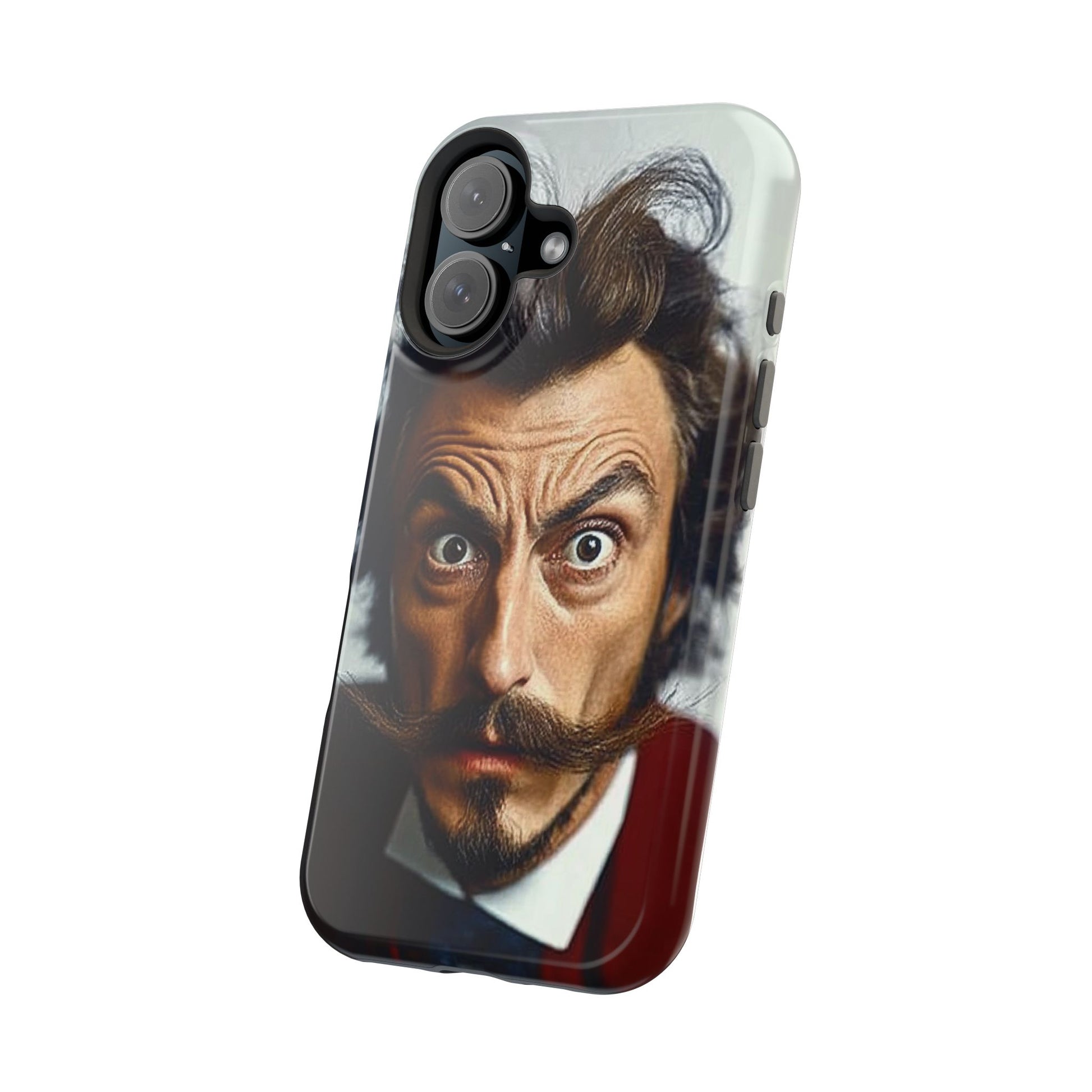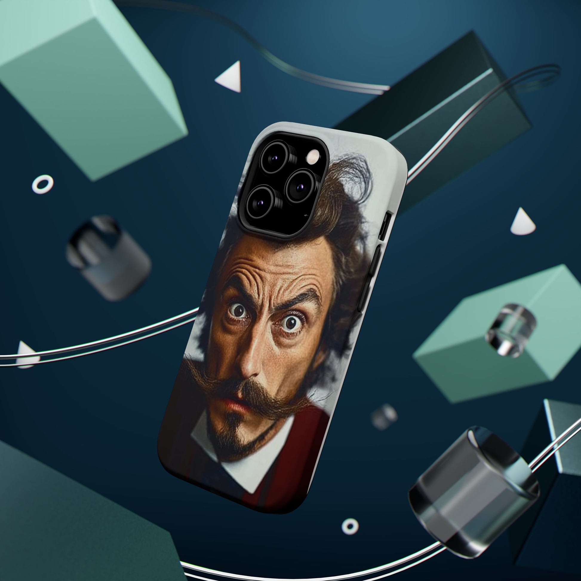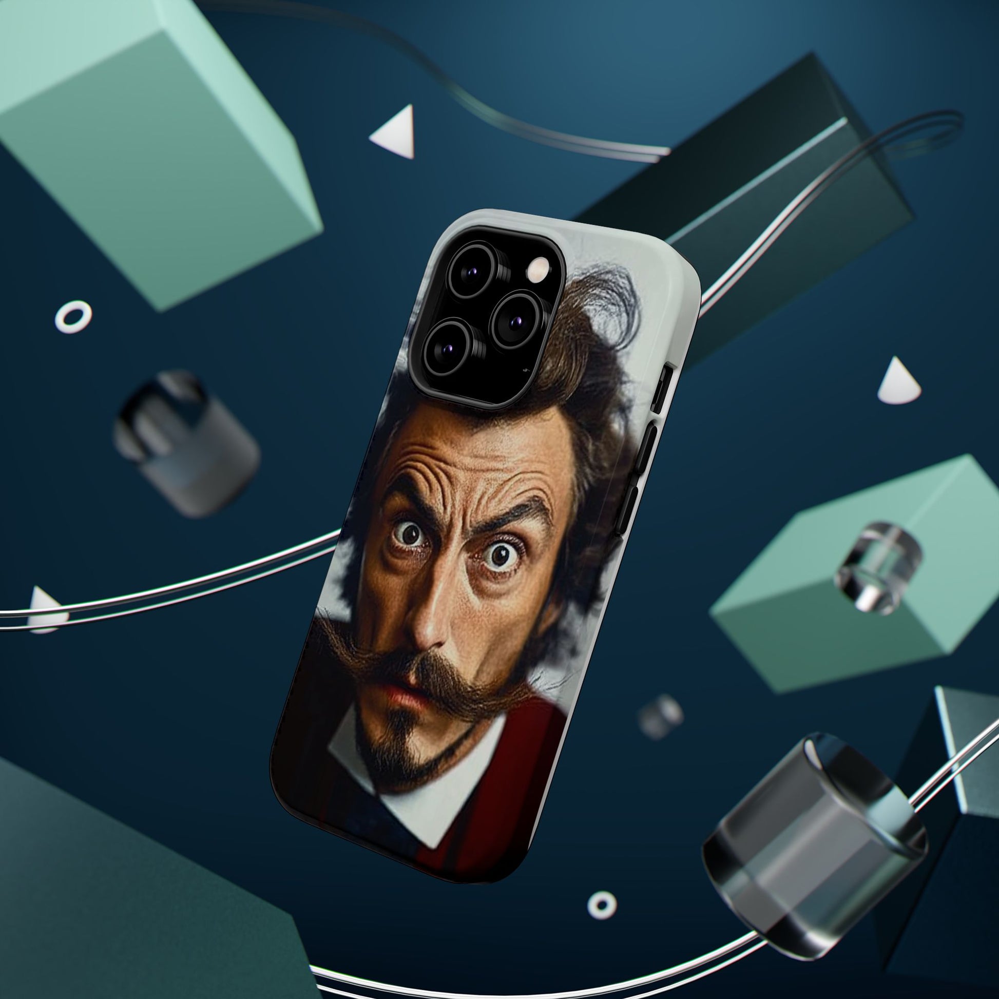 Protect your phone in style with the Luxurious Magnetic Wireless Charging Tough iPhone Case, featuring an exclusive artwork by Moxie-Jay. This design showcases a captivating close-up of Salvador Dali in a semi-circular composition, paired with an additional artistic touch of a hand scratching a bright red record. Combining art and functionality, this case is perfect for art enthusiasts and those seeking premium phone protection.