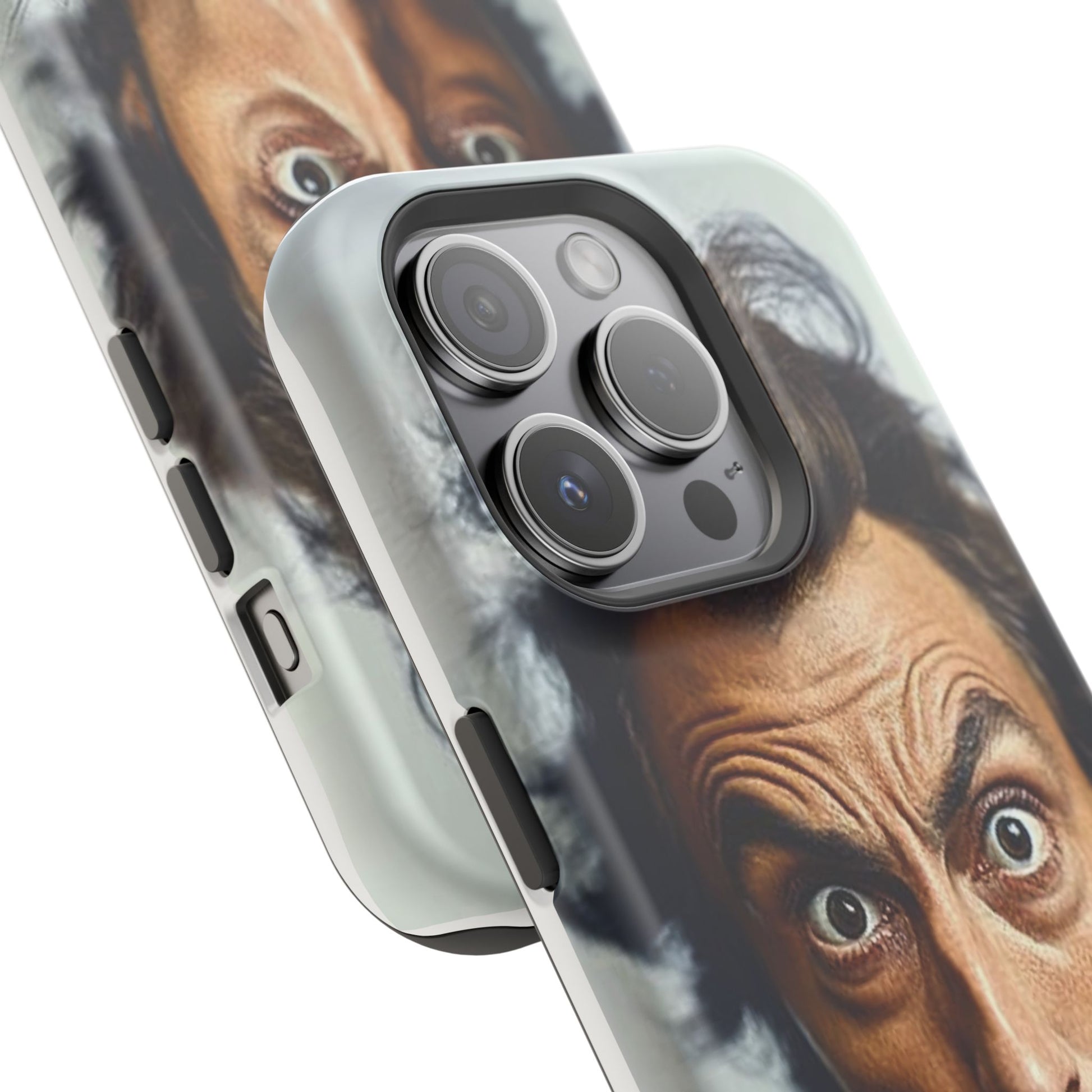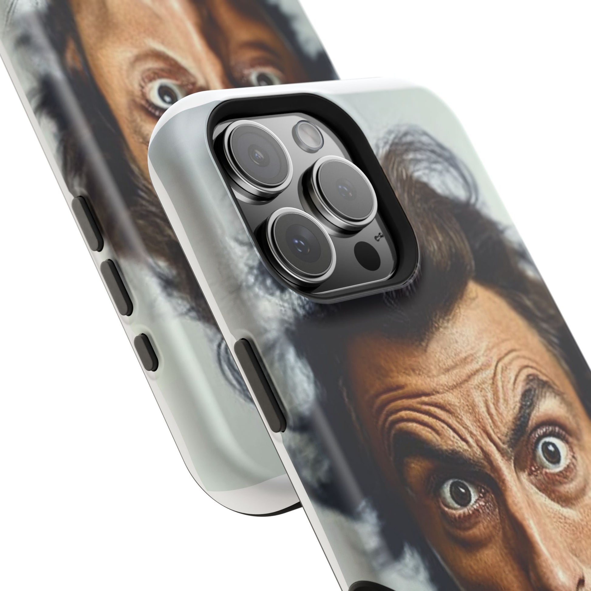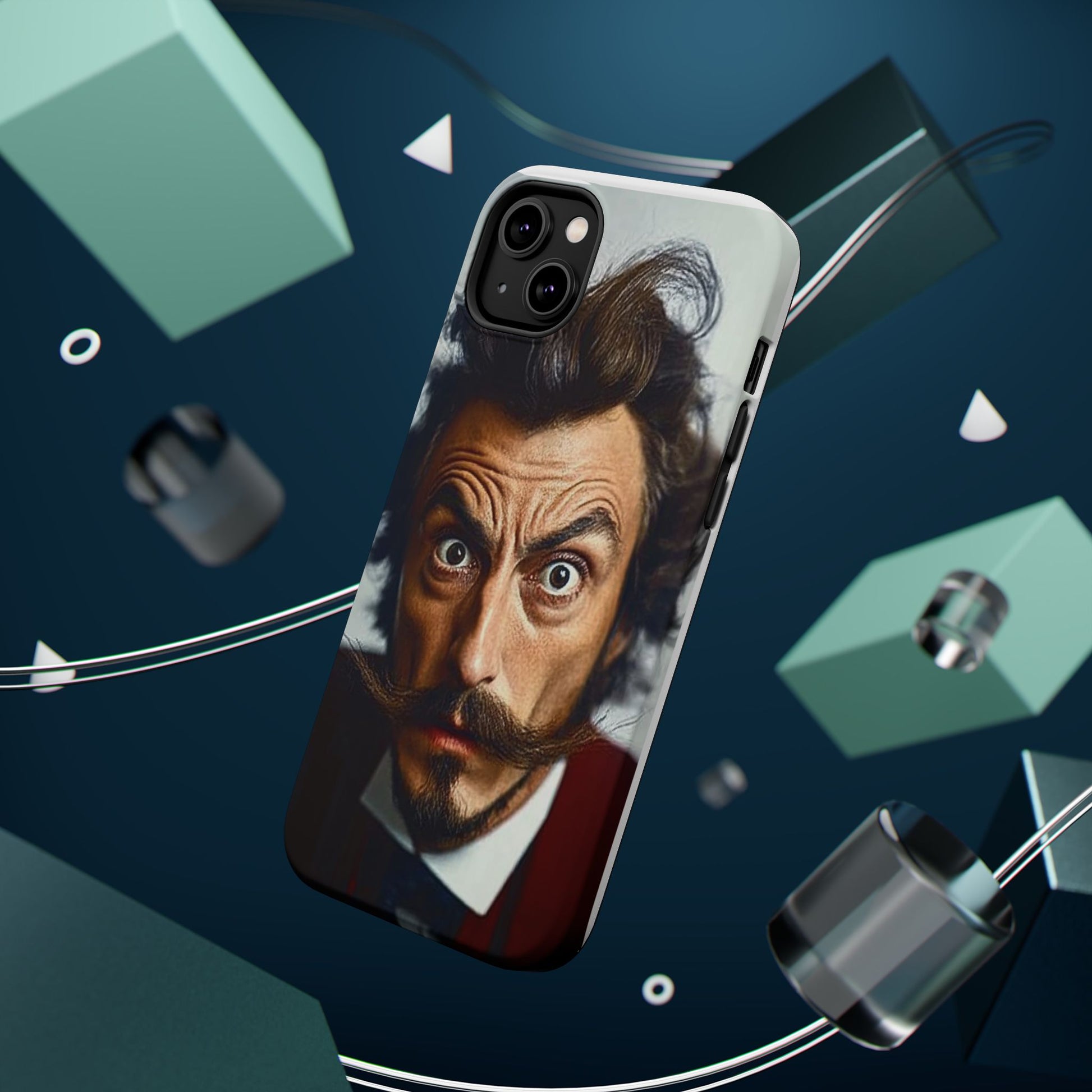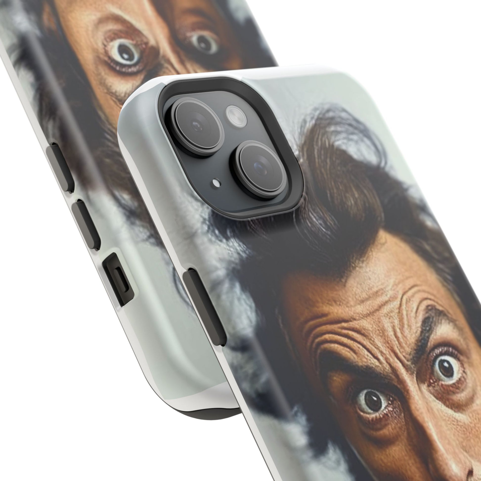 Protect your phone in style with the Luxurious Magnetic Wireless Charging Tough iPhone Case, featuring an exclusive artwork by Moxie-Jay. This design showcases a captivating close-up of Salvador Dali in a semi-circular composition, paired with an additional artistic touch of a hand scratching a bright red record. Combining art and functionality, this case is perfect for art enthusiasts and those seeking premium phone protection.