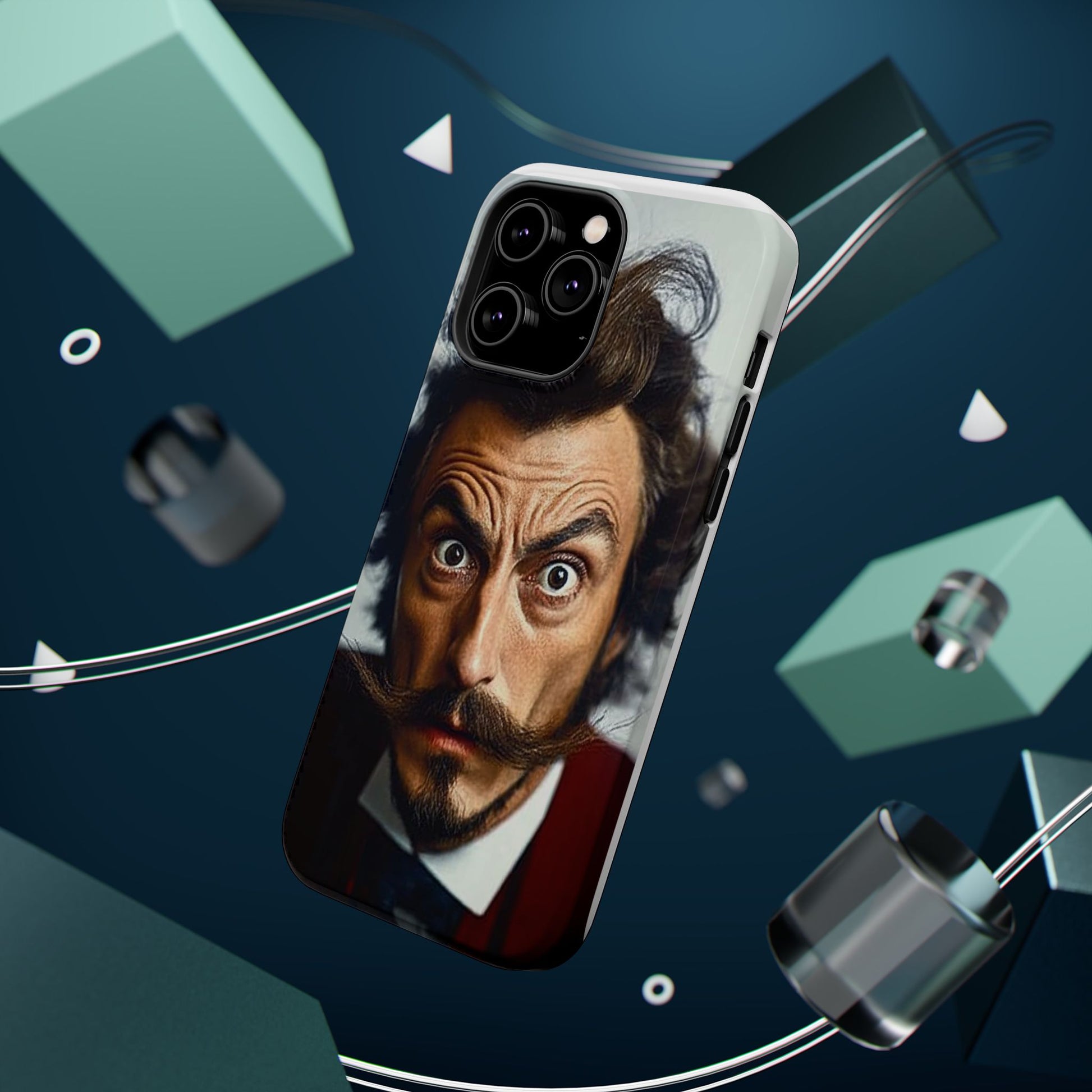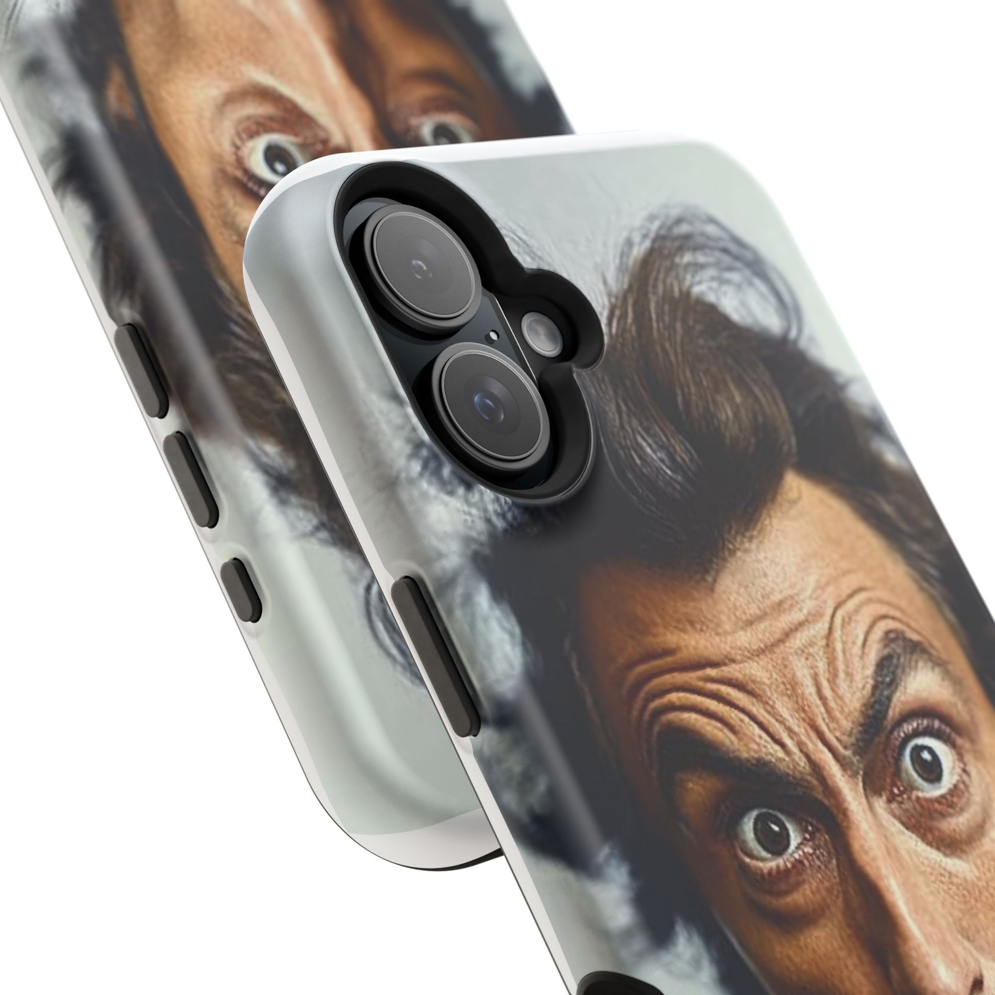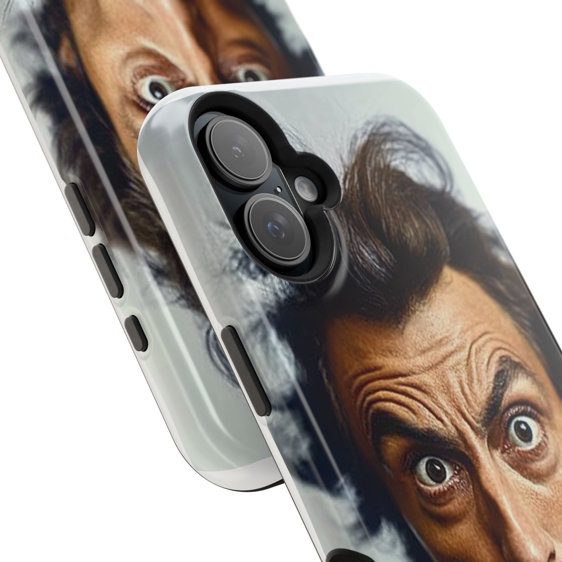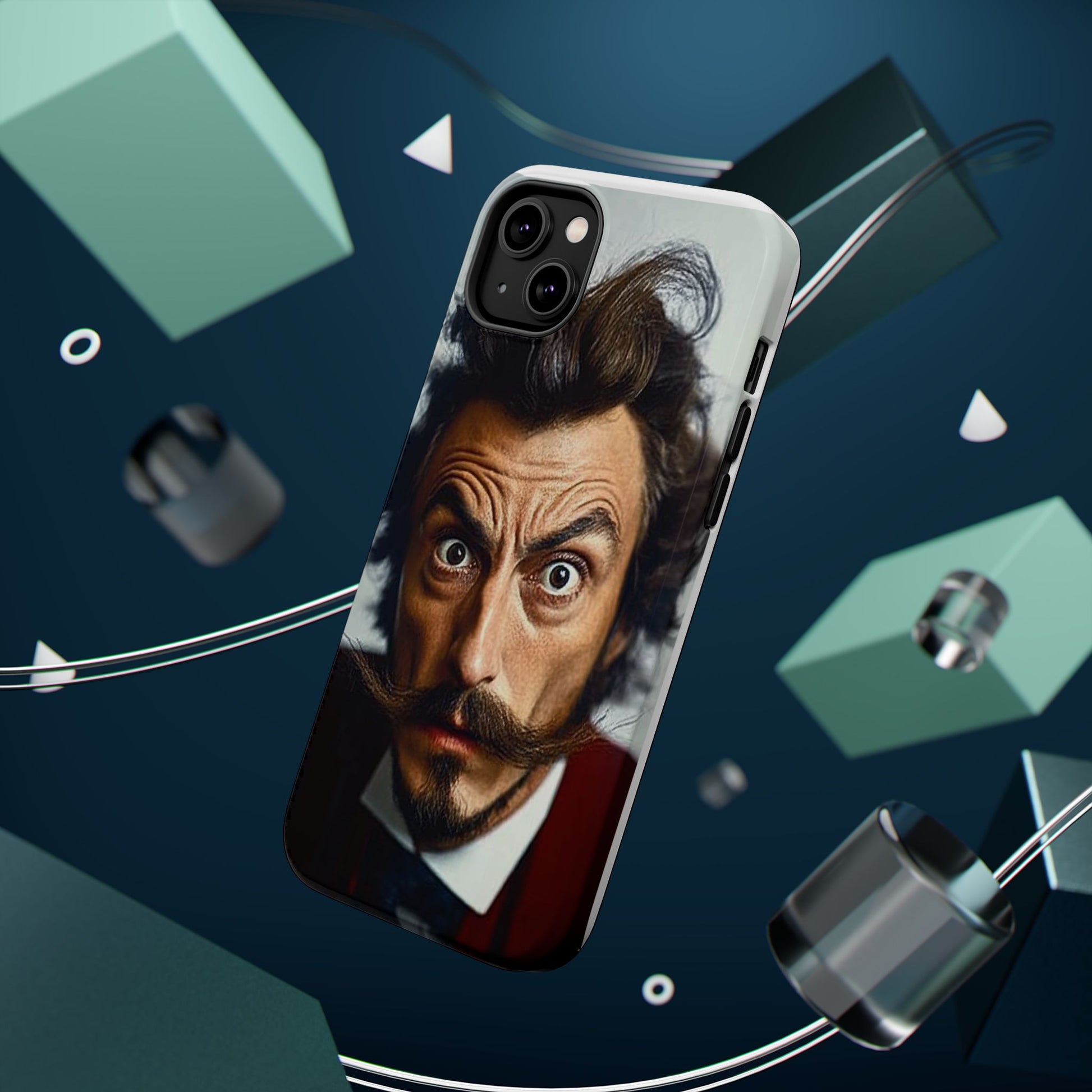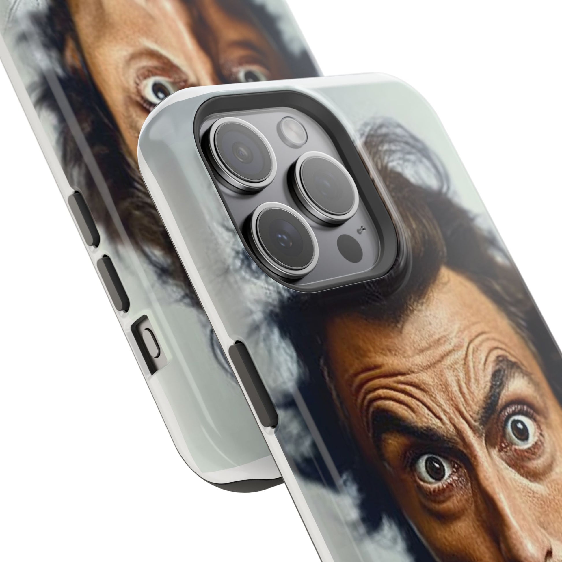 Protect your phone in style with the Luxurious Magnetic Wireless Charging Tough iPhone Case, featuring an exclusive artwork by Moxie-Jay. This design showcases a captivating close-up of Salvador Dali in a semi-circular composition, paired with an additional artistic touch of a hand scratching a bright red record. Combining art and functionality, this case is perfect for art enthusiasts and those seeking premium phone protection.