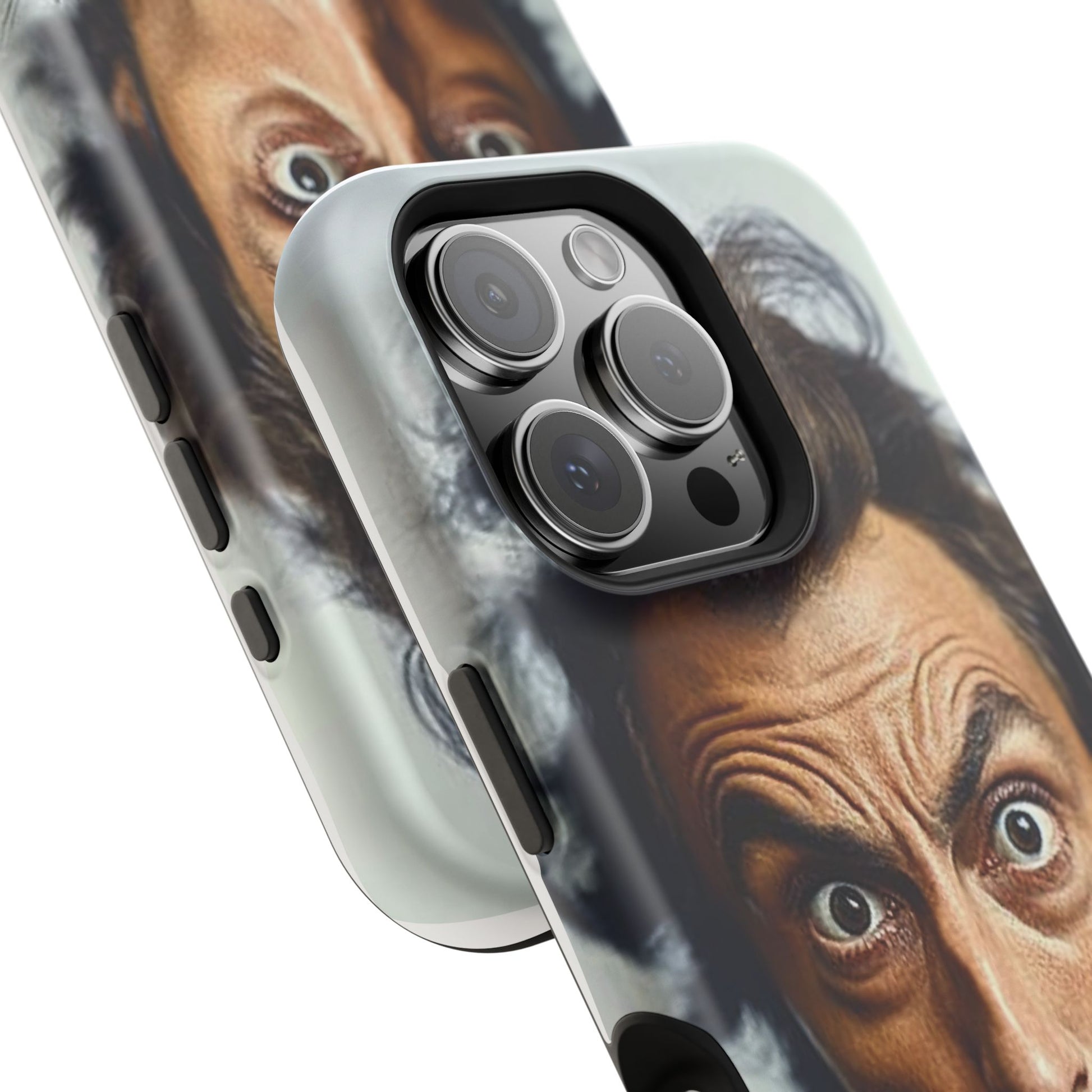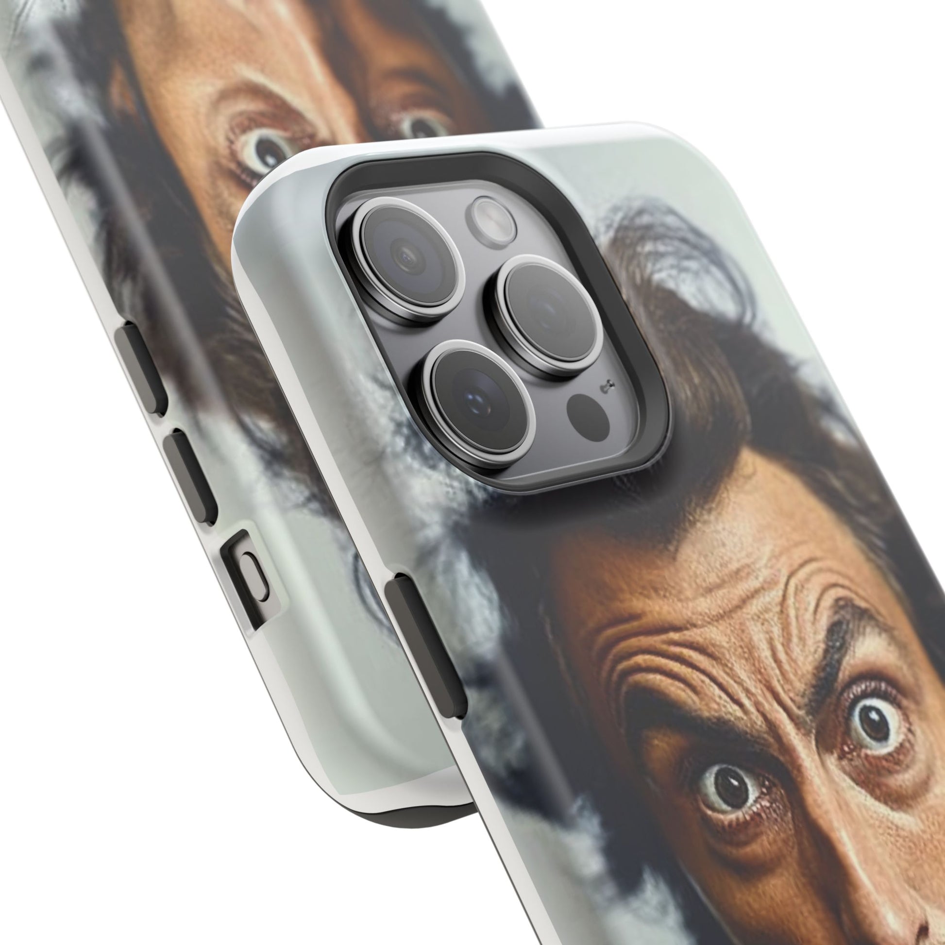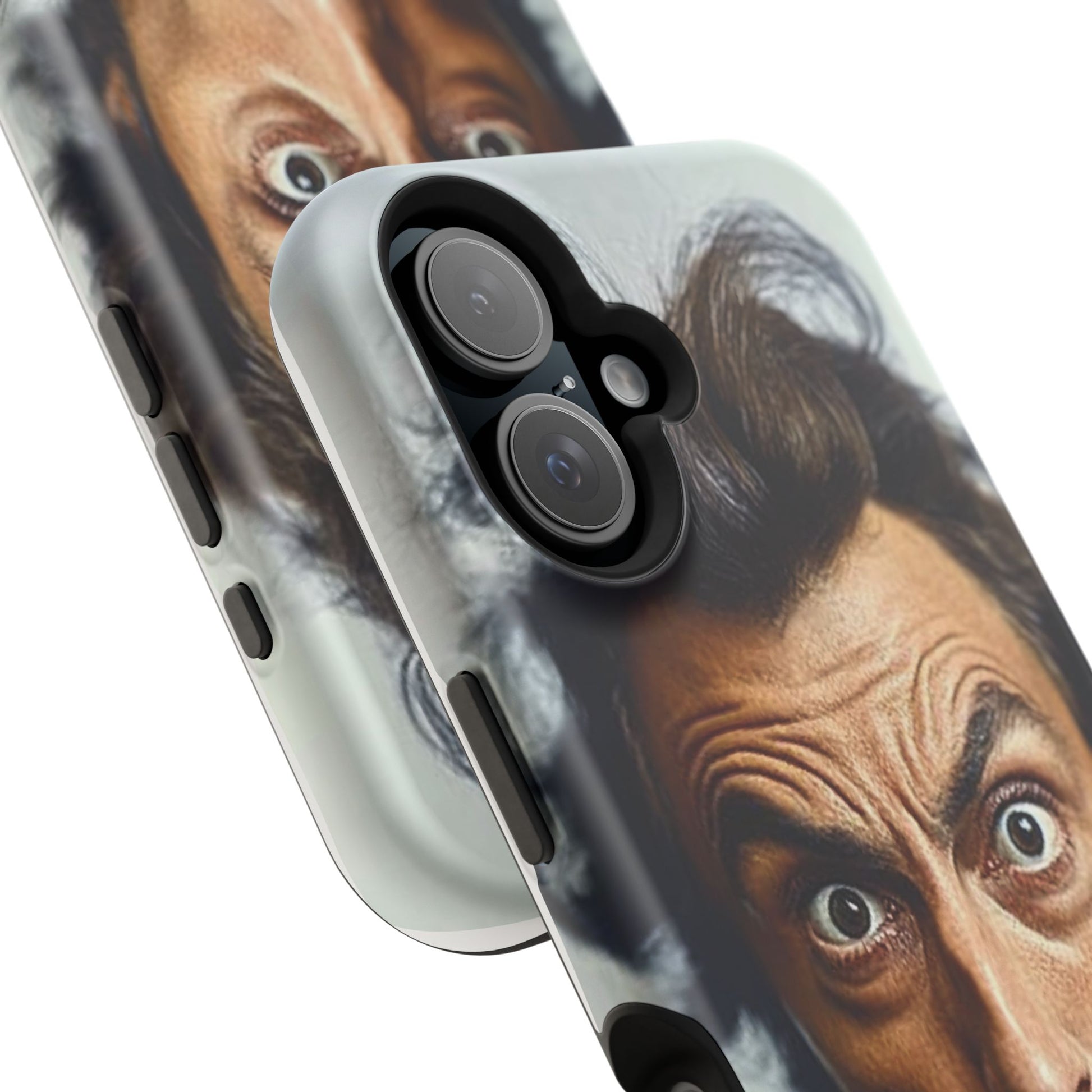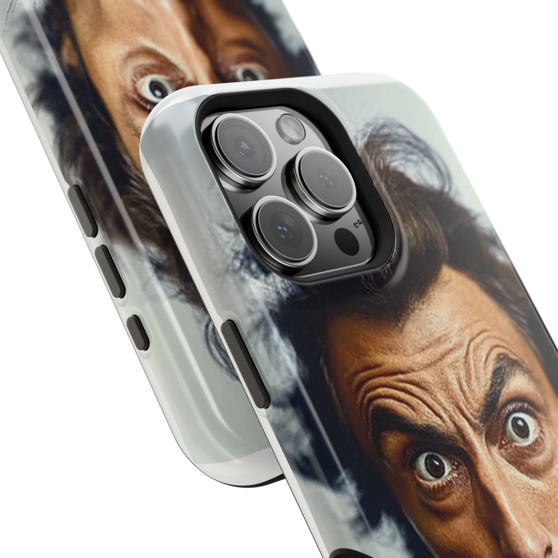 Protect your phone in style with the Luxurious Magnetic Wireless Charging Tough iPhone Case, featuring an exclusive artwork by Moxie-Jay. This design showcases a captivating close-up of Salvador Dali in a semi-circular composition, paired with an additional artistic touch of a hand scratching a bright red record. Combining art and functionality, this case is perfect for art enthusiasts and those seeking premium phone protection.