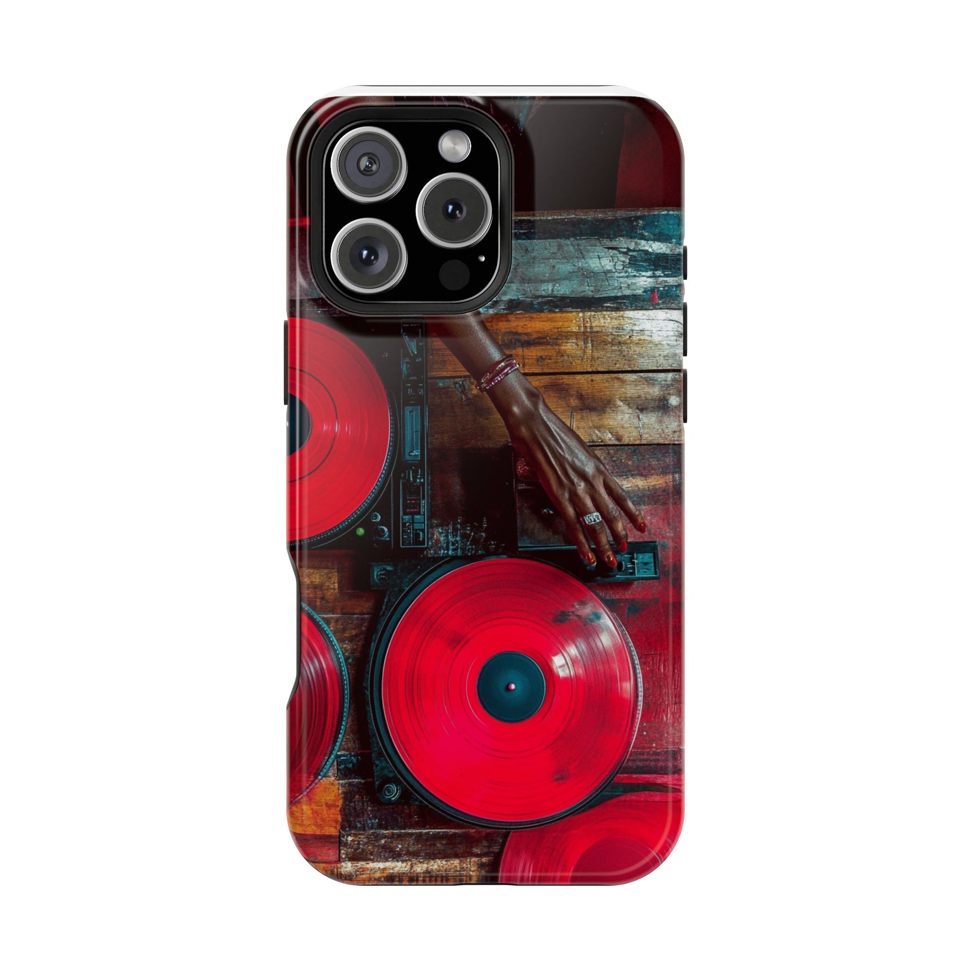 Elevate your iPhone with our "Vinyl Virtuoso" case, featuring a striking artwork by Moxie Jay. This luxurious case showcases a powerful image of a DJ's hand scratching a vibrant red vinyl record on a turntable, capturing the essence of music and artistry.A luxurious Magnetic wireless charging Tough iPhone Case featuring a art piece by moxie-jay of a hand scratching a bright red record. This durable polycarbonate case offers extra protection against scratches and minor bumps, with vibrant colors and glossy or matte surface options. The interior magnets make it MagSafe® Compatible for easy charging with MagSafe® accessories.Product features: