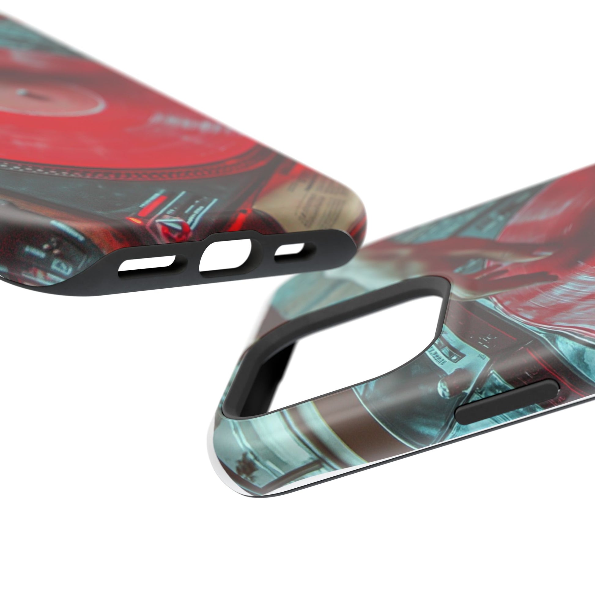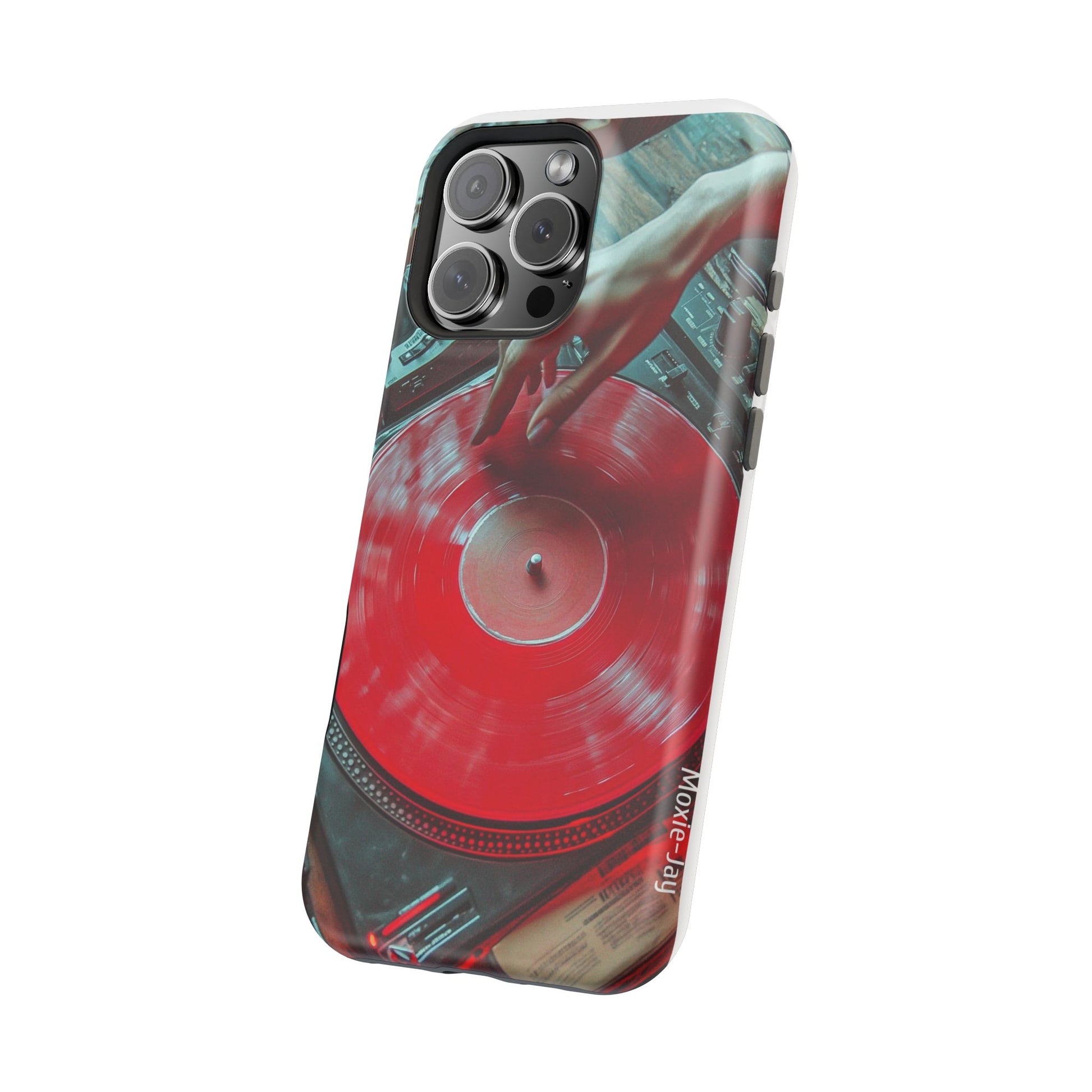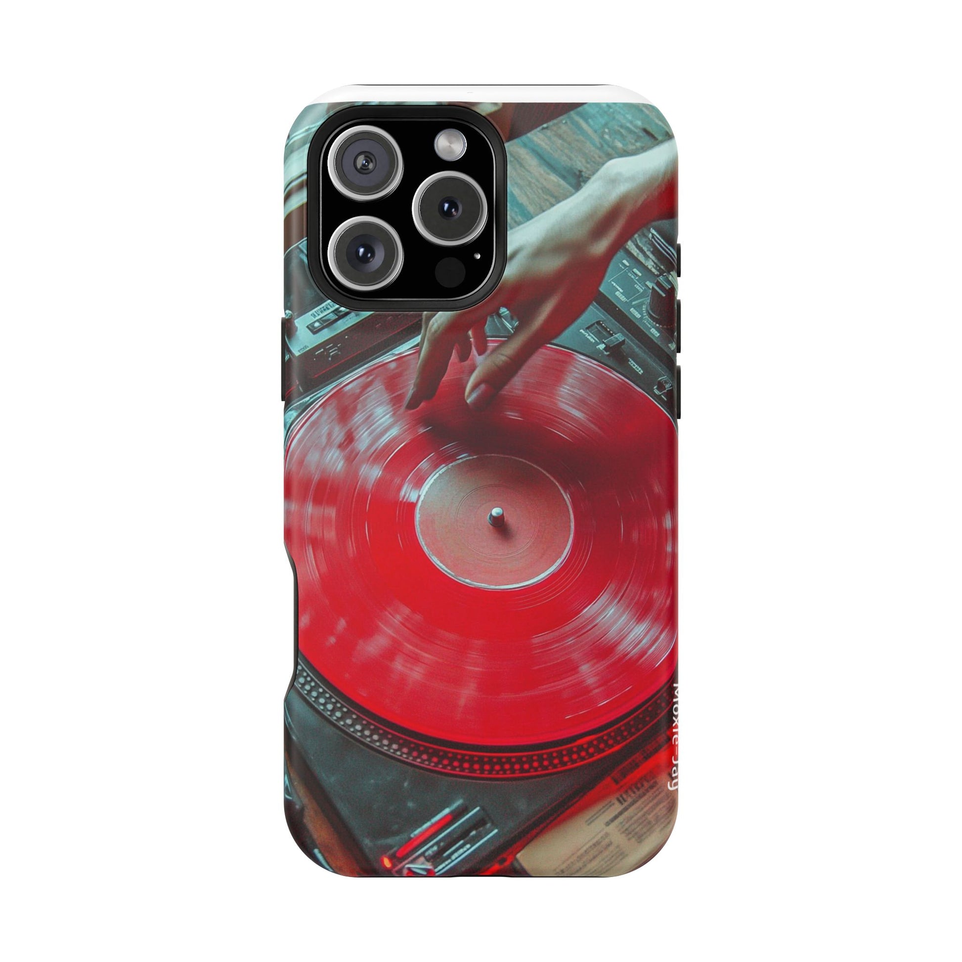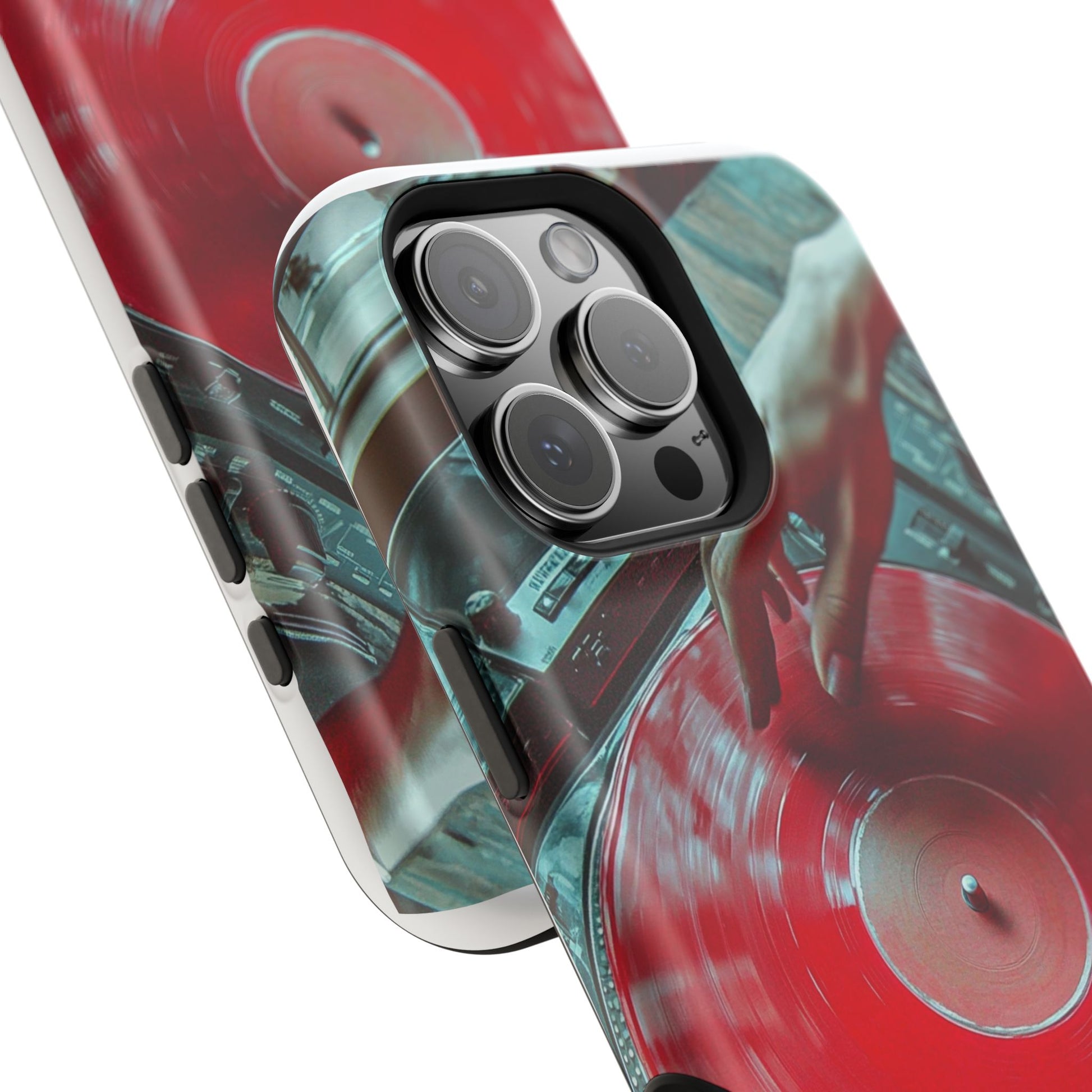 A luxurious Magnetic wireless charging Tough iPhone Case featuring a art piece by moxie-jay of a hand scratching a bright red record. This durable polycarbonate case offers extra protection against scratches and minor bumps, with vibrant colors and glossy or matte surface options. The interior magnets make it MagSafe® Compatible for easy charging with MagSafe® accessories.