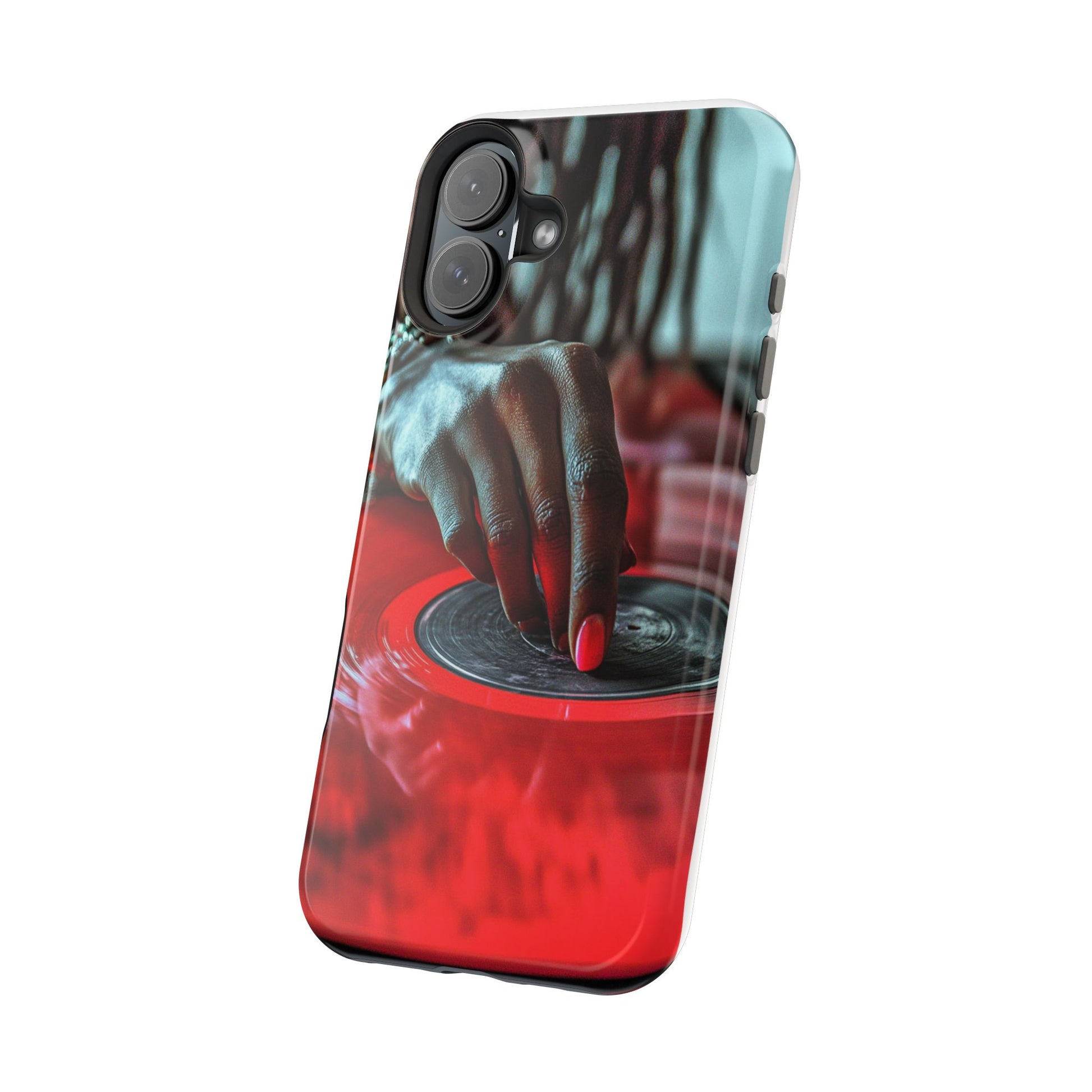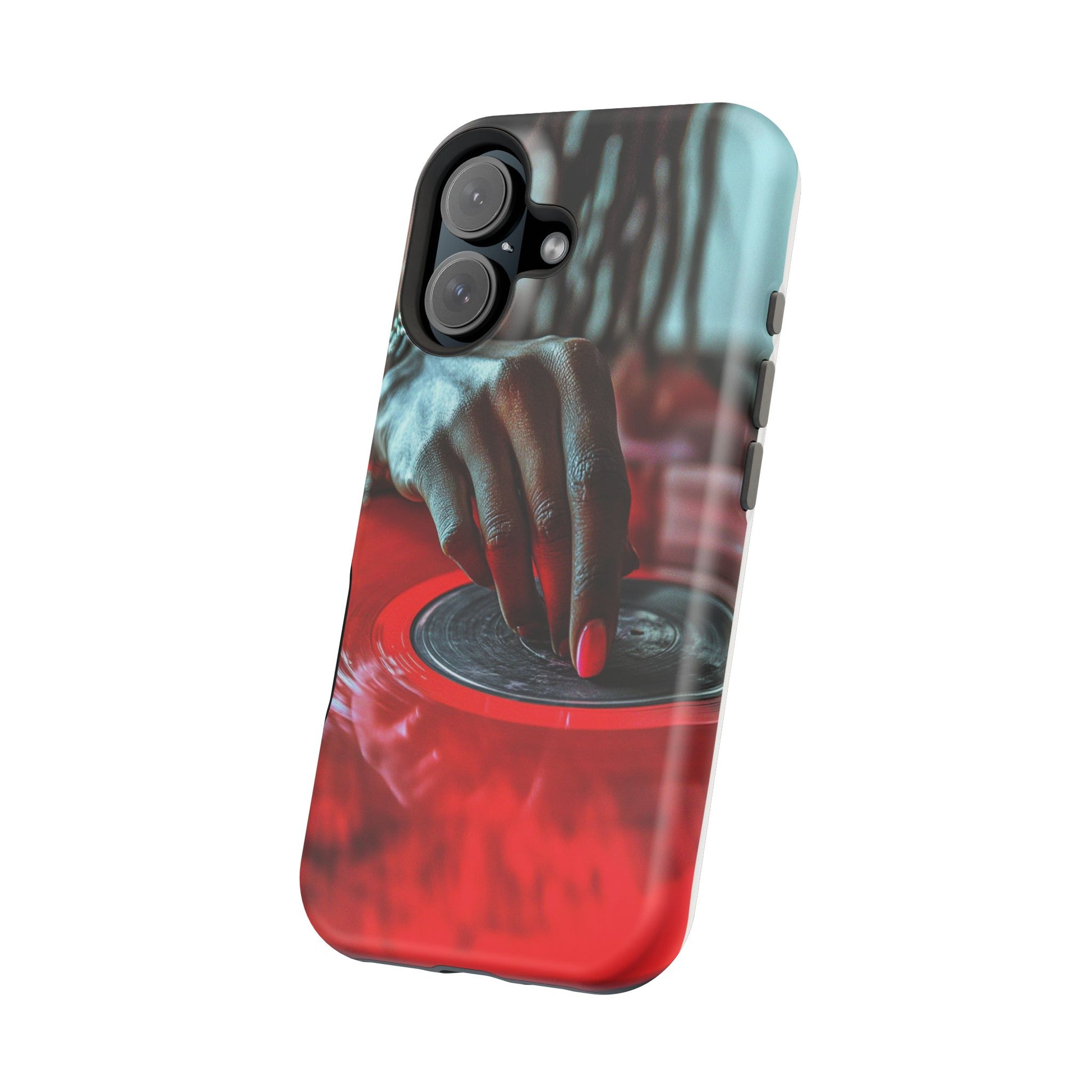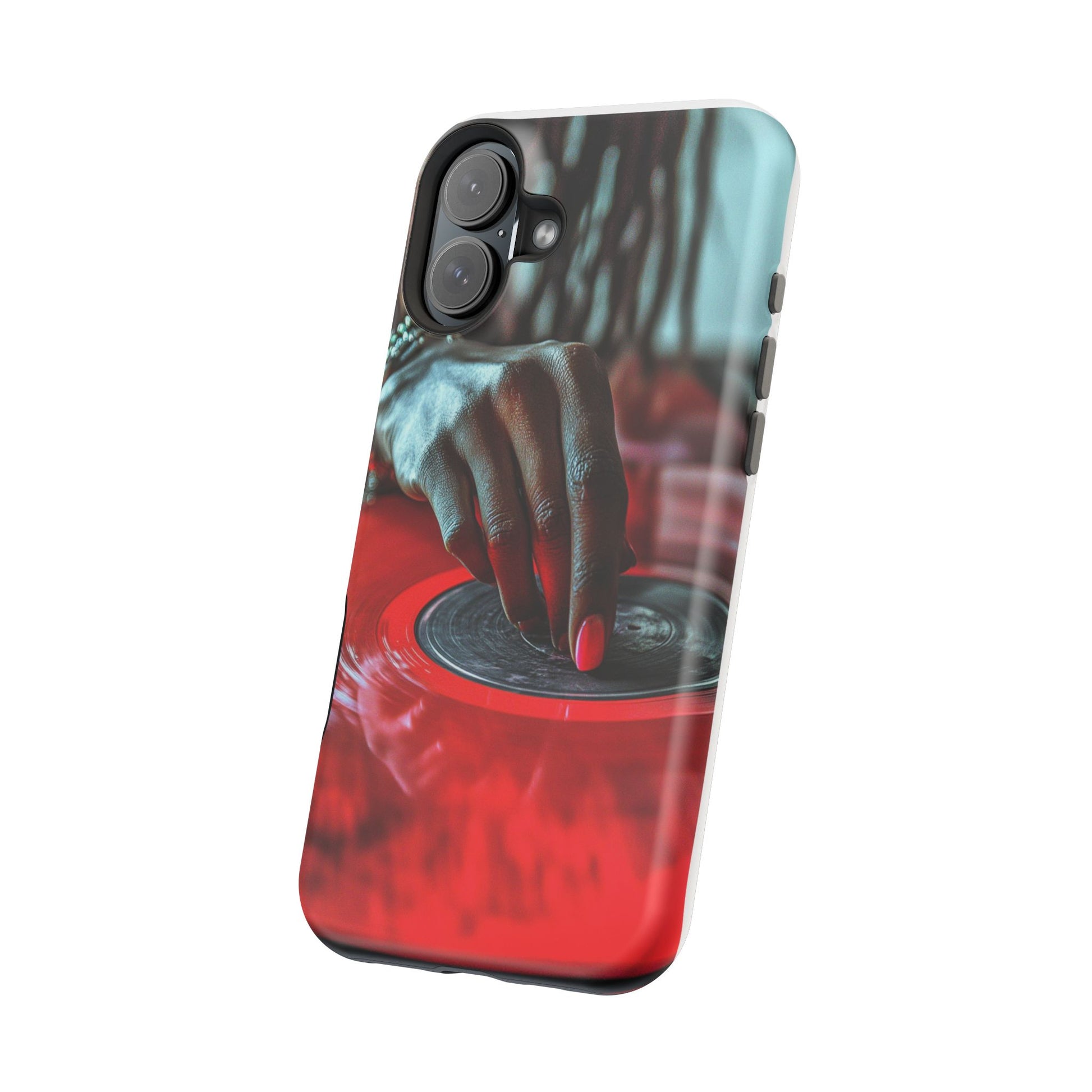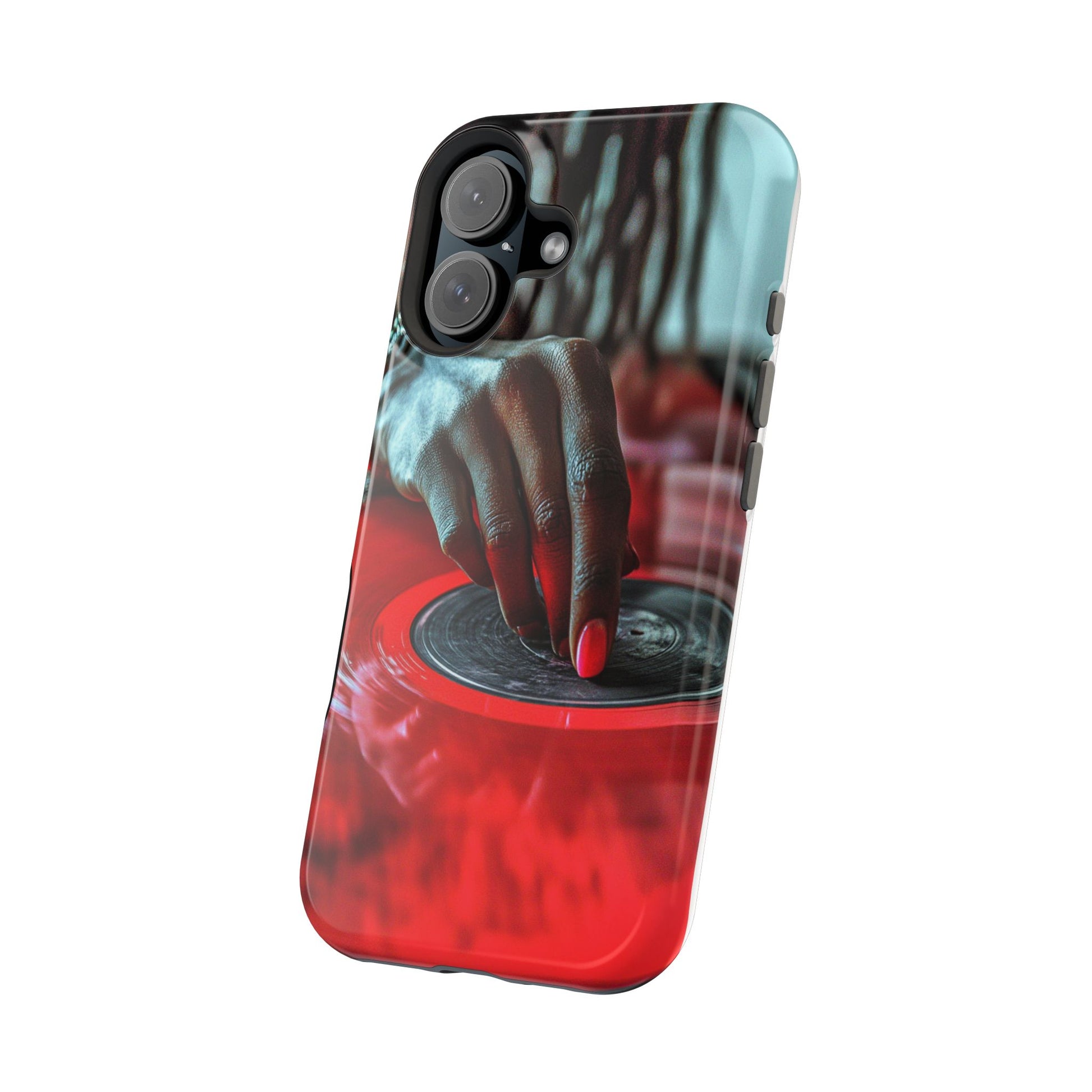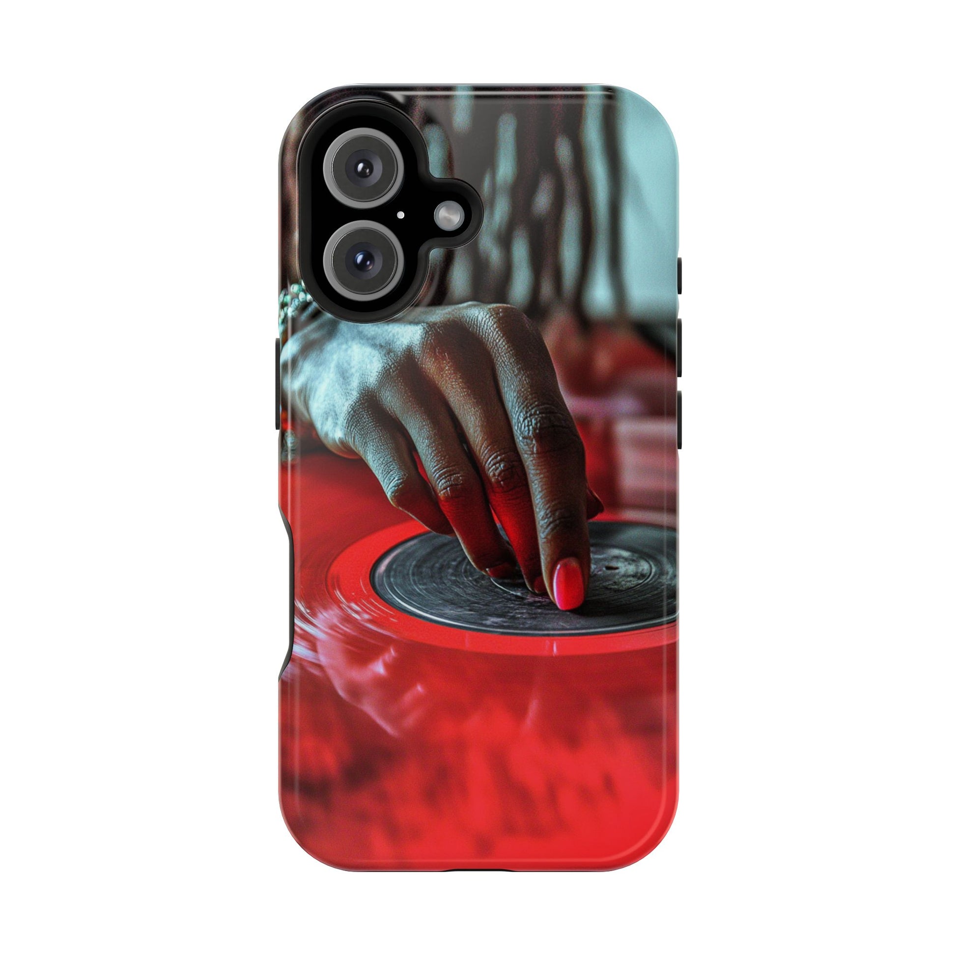 Elevate your iPhone's style with this stunning case featuring Moxie-Jay's captivating artwork "Vinyl Groove." This luxurious case showcases a close-up photograph of a woman's black hand scratching a vibrant red vinyl record, perfectly capturing the essence of music and artistry. The durable polycarbonate construction provides superior protection against scratches and impacts, while the built-in magnets ensure seamless MagSafe® compatibility for effortless wireless charging.This tough iPhone case offers:
