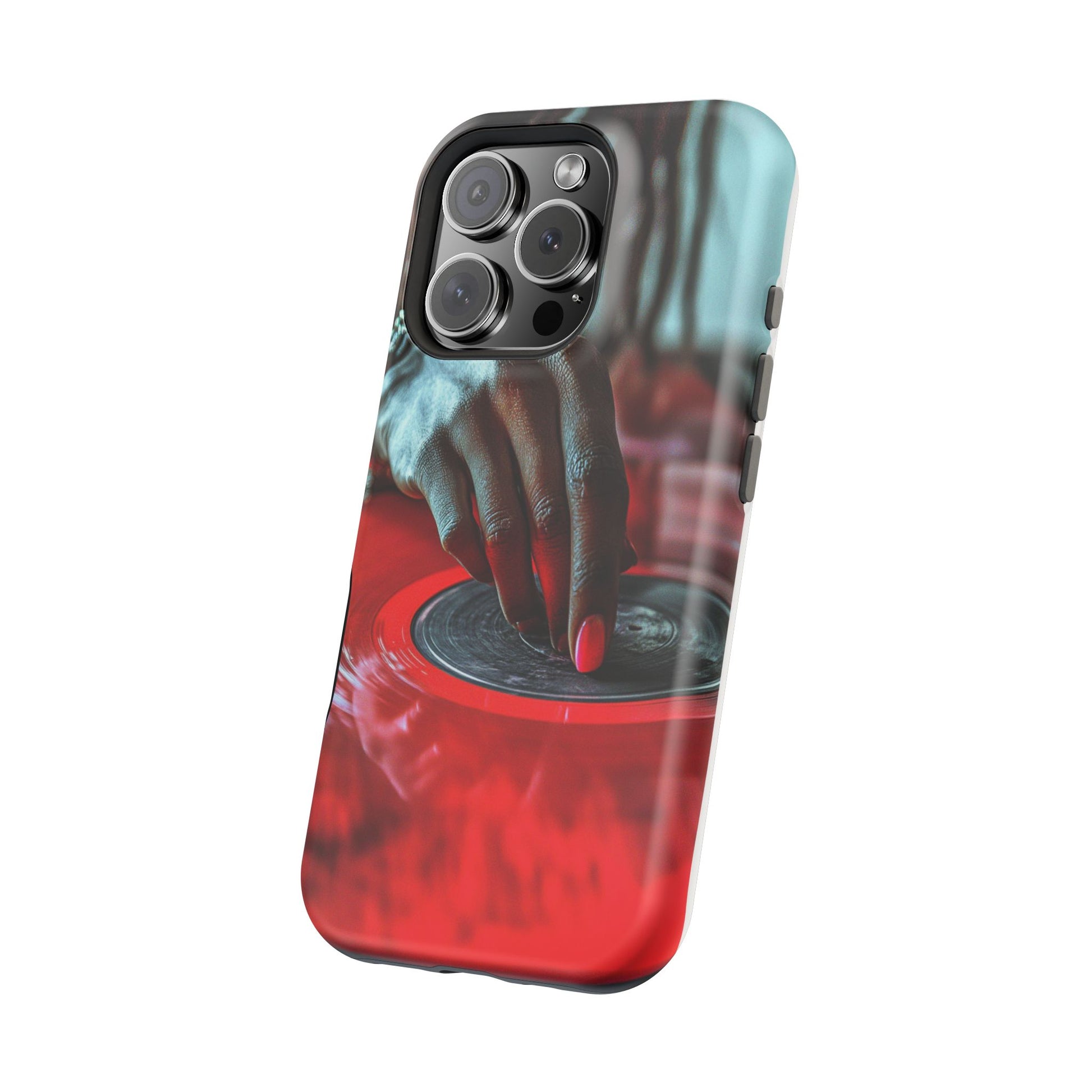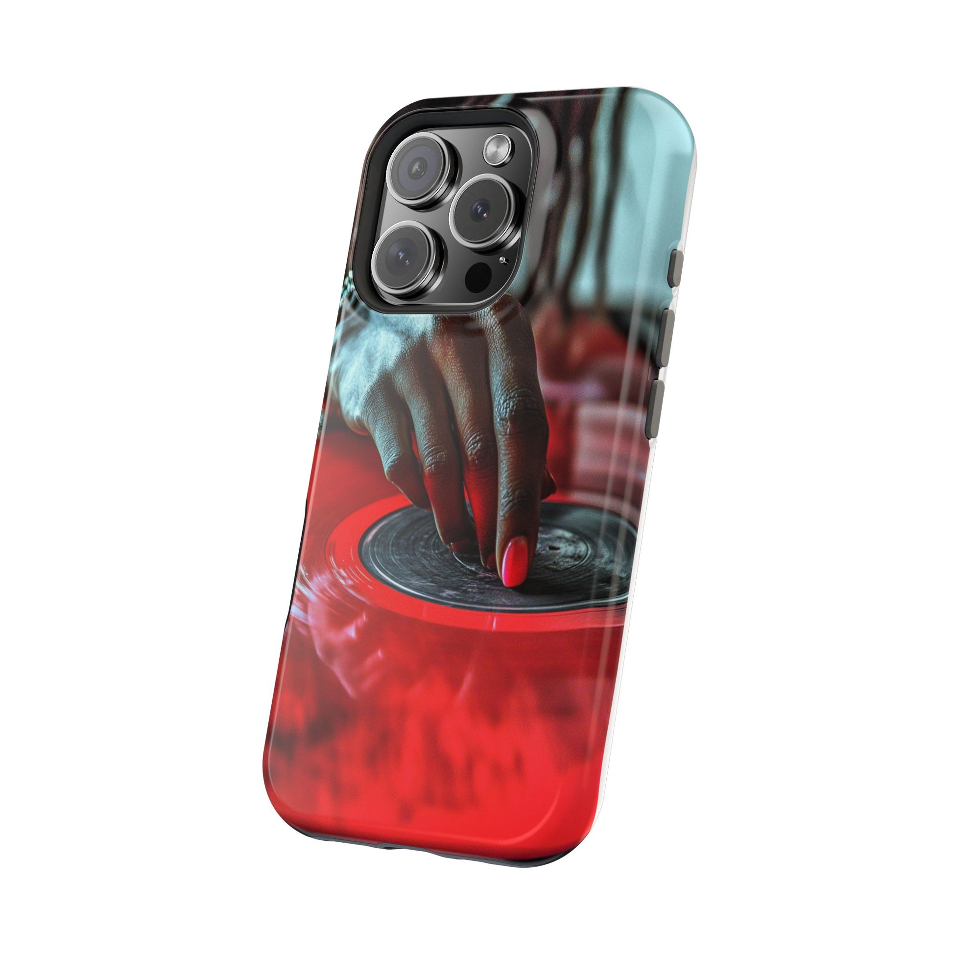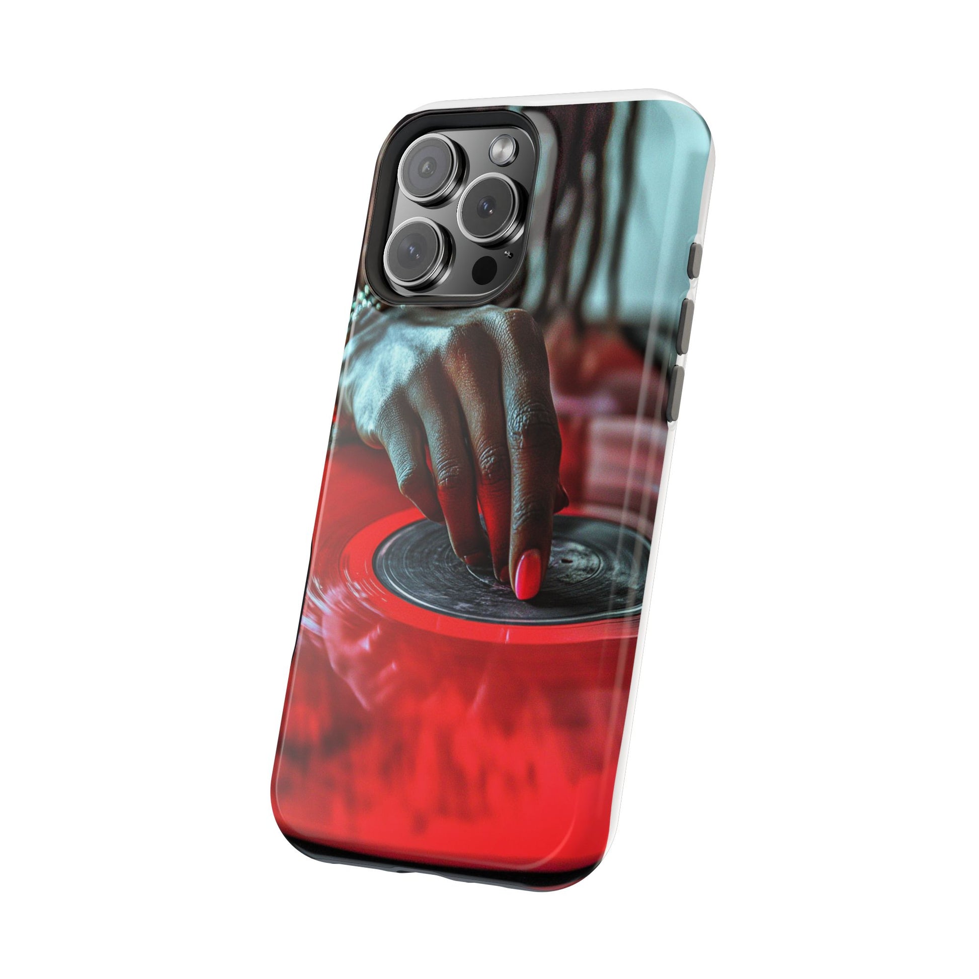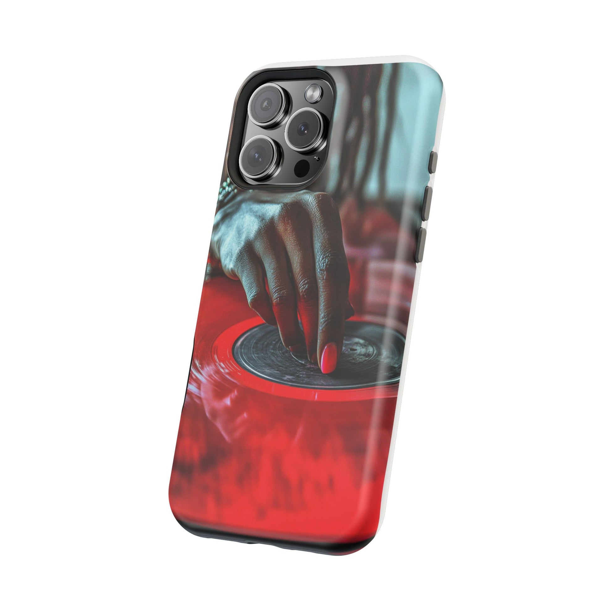 Elevate your iPhone's style with this stunning case featuring Moxie-Jay's captivating artwork "Vinyl Groove." This luxurious case showcases a close-up photograph of a woman's black hand scratching a vibrant red vinyl record, perfectly capturing the essence of music and artistry. The durable polycarbonate construction provides superior protection against scratches and impacts, while the built-in magnets ensure seamless MagSafe® compatibility for effortless wireless charging.This tough iPhone case offers: